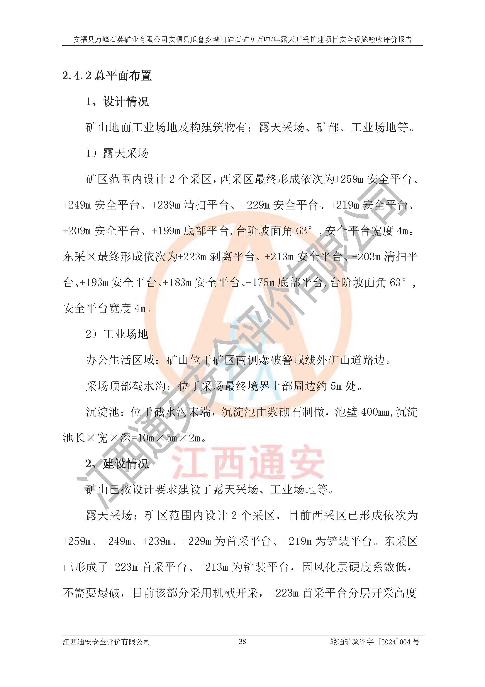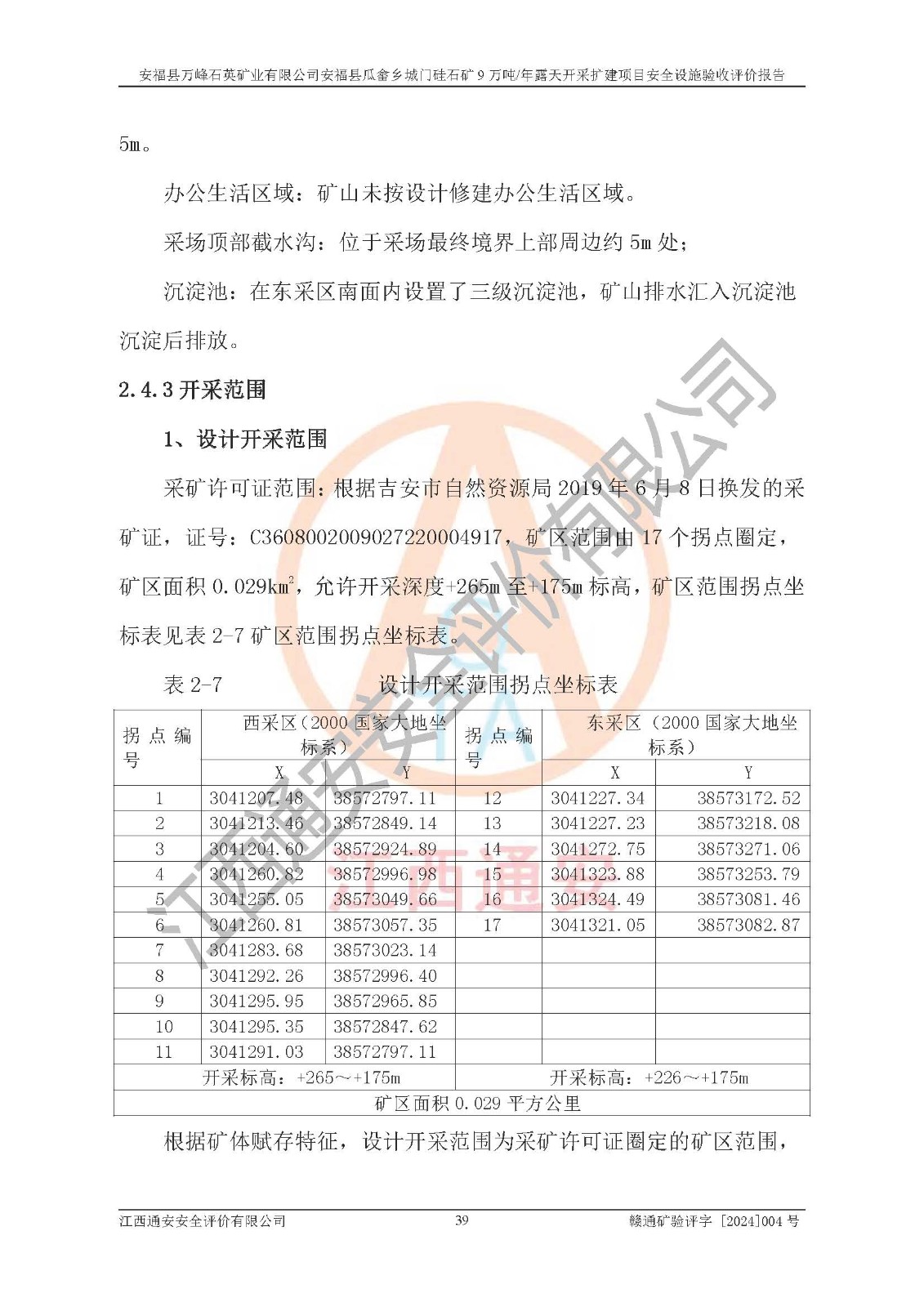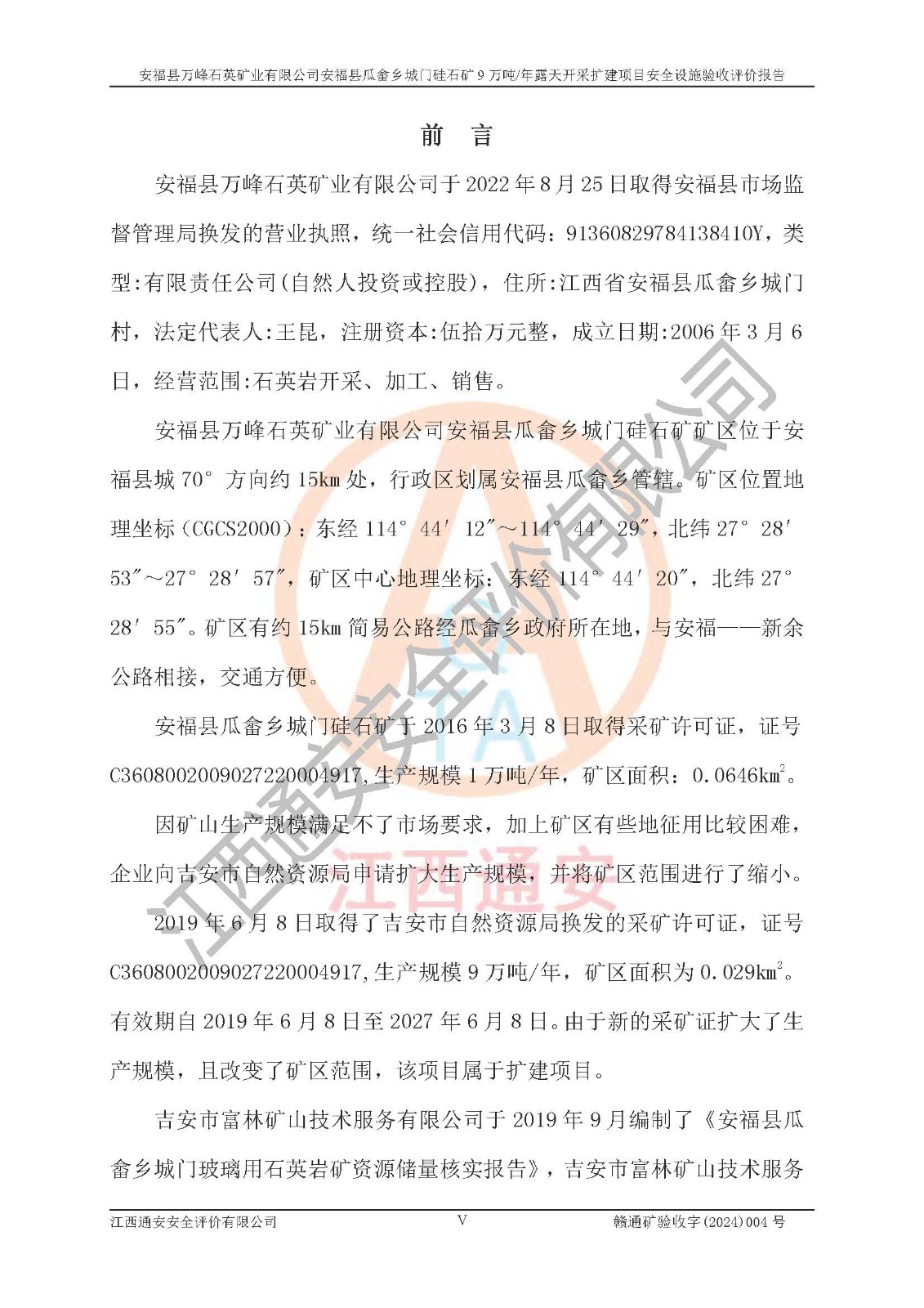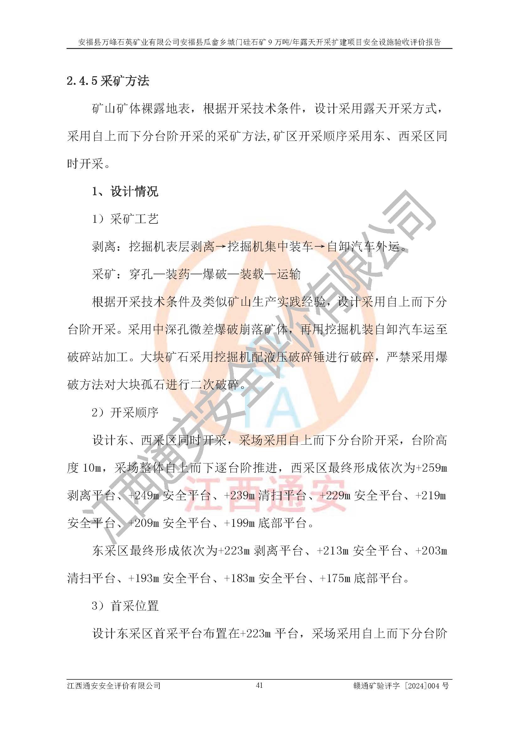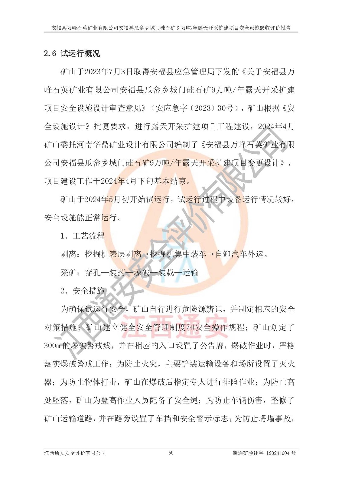 安??h萬(wàn)峰石英礦業(yè)有限公司安??h瓜畬鄉(xiāng)城門(mén)硅石礦礦區(qū)位于安??h城70°方向約15km處,行政區(qū)劃屬安福縣瓜畬鄉(xiāng)管轄。礦區(qū)位置地理坐標(biāo):東經(jīng)114°44′12"~114°44′29",北緯27°28′53"~27°28′57",礦區(qū)中心地理坐標(biāo):東經(jīng)114°44′20",北緯27°28′55"。礦區(qū)有約15km簡(jiǎn)易公路經(jīng)瓜畬鄉(xiāng)**所在地,與安?!掠喙废嘟?,交通方便。 安??h瓜畬鄉(xiāng)城門(mén)硅石礦于2016年3月8日取得采礦許可證,證號(hào)C3608002009027220004917,生產(chǎn)規(guī)模1萬(wàn)噸/年,礦區(qū)面積:0.0646km2。 因礦山生產(chǎn)規(guī)模滿足不了市場(chǎng)要求,加上礦區(qū)有些地征用比較困難,企業(yè)向吉安市自然資源局申請(qǐng)擴(kuò)大生產(chǎn)規(guī)模,并將礦區(qū)范圍進(jìn)行了縮小。 2019年6月8日取得了吉安市自然資源局換發(fā)的采礦許可證,證號(hào)C3608002009027220004917,生產(chǎn)規(guī)模9萬(wàn)噸/年,礦區(qū)面積為0.029km2。**期自2019年6月8日至2027年6月8日。由于新的采礦證擴(kuò)大了生產(chǎn)規(guī)模,且改變了礦區(qū)范圍,該項(xiàng)目屬于擴(kuò)建項(xiàng)目。 吉安市富林礦山技術(shù)服務(wù)有限公司于2019年9月編制了《安??h瓜畬鄉(xiāng)城門(mén)玻璃用石英巖礦資源儲(chǔ)量核實(shí)報(bào)告》,吉安市富林礦山技術(shù)服務(wù)有限公司于2020年4月編制了《安??h瓜畬鄉(xiāng)城門(mén)玻璃用石英巖礦礦產(chǎn)資源開(kāi)發(fā)利用、地質(zhì)環(huán)境恢復(fù)治理與土地復(fù)墾方案》,貴州匯和安全評(píng)價(jià)有限公司于2023年4月編制了《安??h萬(wàn)峰石英礦業(yè)有限公司安??h瓜畬鄉(xiāng)城門(mén)硅石礦9萬(wàn)噸/年露天開(kāi)采擴(kuò)建項(xiàng)目安全預(yù)評(píng)價(jià)報(bào)告》,河南華鼎礦業(yè)設(shè)計(jì)有限公司于2023年6月編制了《安??h萬(wàn)峰石英礦業(yè)有限公司安??h瓜畬鄉(xiāng)城門(mén)硅石礦9萬(wàn)噸/年露天開(kāi)采擴(kuò)建項(xiàng)目初步設(shè)計(jì)》和《安??h萬(wàn)峰石英礦業(yè)有限公司安福縣瓜畬鄉(xiāng)城門(mén)硅石礦9萬(wàn)噸/年露天開(kāi)采擴(kuò)建項(xiàng)目安全設(shè)施設(shè)計(jì)》;2023年7月3日安??h應(yīng)急管理局下發(fā)了《關(guān)于安福縣萬(wàn)峰石英礦業(yè)有限公司安??h瓜畬鄉(xiāng)城門(mén)硅石礦9萬(wàn)噸/年露天開(kāi)采擴(kuò)建項(xiàng)目安全設(shè)施設(shè)計(jì)審查意見(jiàn)》(安應(yīng)急字〔2023〕30號(hào))。 2023年7月安??h萬(wàn)峰石英礦業(yè)有限公司根據(jù)《中華人民共和國(guó)安全生產(chǎn)法》、《安全生產(chǎn)許可證條例》等有關(guān)法律、法規(guī)、部門(mén)規(guī)章的規(guī)定,嚴(yán)格按照《安全設(shè)施設(shè)計(jì)》進(jìn)行基建,該礦山分東、西兩個(gè)采區(qū),西采區(qū)設(shè)計(jì)+259m平臺(tái)為采剝平臺(tái)、+249m平臺(tái)為鏟裝平臺(tái),開(kāi)拓運(yùn)輸?shù)缆分?249m平臺(tái),在基建過(guò)程中,剝離表土?xí)r因表土層發(fā)生變化,+259m采剝平臺(tái)無(wú)硅石資源可采,因此首采平臺(tái)及其鏟裝平臺(tái)、開(kāi)拓運(yùn)輸?shù)缆?*進(jìn)行變更。 2024年4月礦山委托原設(shè)計(jì)單位河南華鼎礦業(yè)設(shè)計(jì)有限公司編制了《安??h萬(wàn)峰石英礦業(yè)有限公司安??h瓜畬鄉(xiāng)城門(mén)硅石礦9萬(wàn)噸/年露天開(kāi)采擴(kuò)建項(xiàng)目變更設(shè)計(jì)》,根據(jù)礦山西采區(qū)+259m、+249m、+239m平臺(tái)均無(wú)硅石資源的實(shí)際情況,對(duì)設(shè)計(jì)的西采區(qū)+259m平臺(tái)為采剝平臺(tái)、+249m平臺(tái)為鏟裝平臺(tái),開(kāi)拓運(yùn)輸?shù)缆分?249m平臺(tái)進(jìn)行變更,將+259m平臺(tái)、+249m平臺(tái)變更為安全平臺(tái),+239m平臺(tái)仍為清掃平臺(tái),首采平臺(tái)變更為+229m平臺(tái)、鏟裝平臺(tái)變更為+219m平臺(tái),開(kāi)拓運(yùn)輸?shù)缆分?219m平臺(tái)、簡(jiǎn)易道路至+229m平臺(tái);東采區(qū)安全設(shè)施設(shè)計(jì)不變,根據(jù)《**礦山監(jiān)察局關(guān)于印發(fā)非煤礦山建設(shè)項(xiàng)目安全設(shè)施重大變更范圍的通知》之規(guī)定,上述變更不屬于重大變更。 安??h萬(wàn)峰石英礦業(yè)有限公司安??h瓜畬鄉(xiāng)城門(mén)硅石礦9萬(wàn)噸/年露天開(kāi)采擴(kuò)建項(xiàng)目基建已完成,本次安全設(shè)施驗(yàn)收評(píng)價(jià)未涉及凹陷露天開(kāi)采。 |