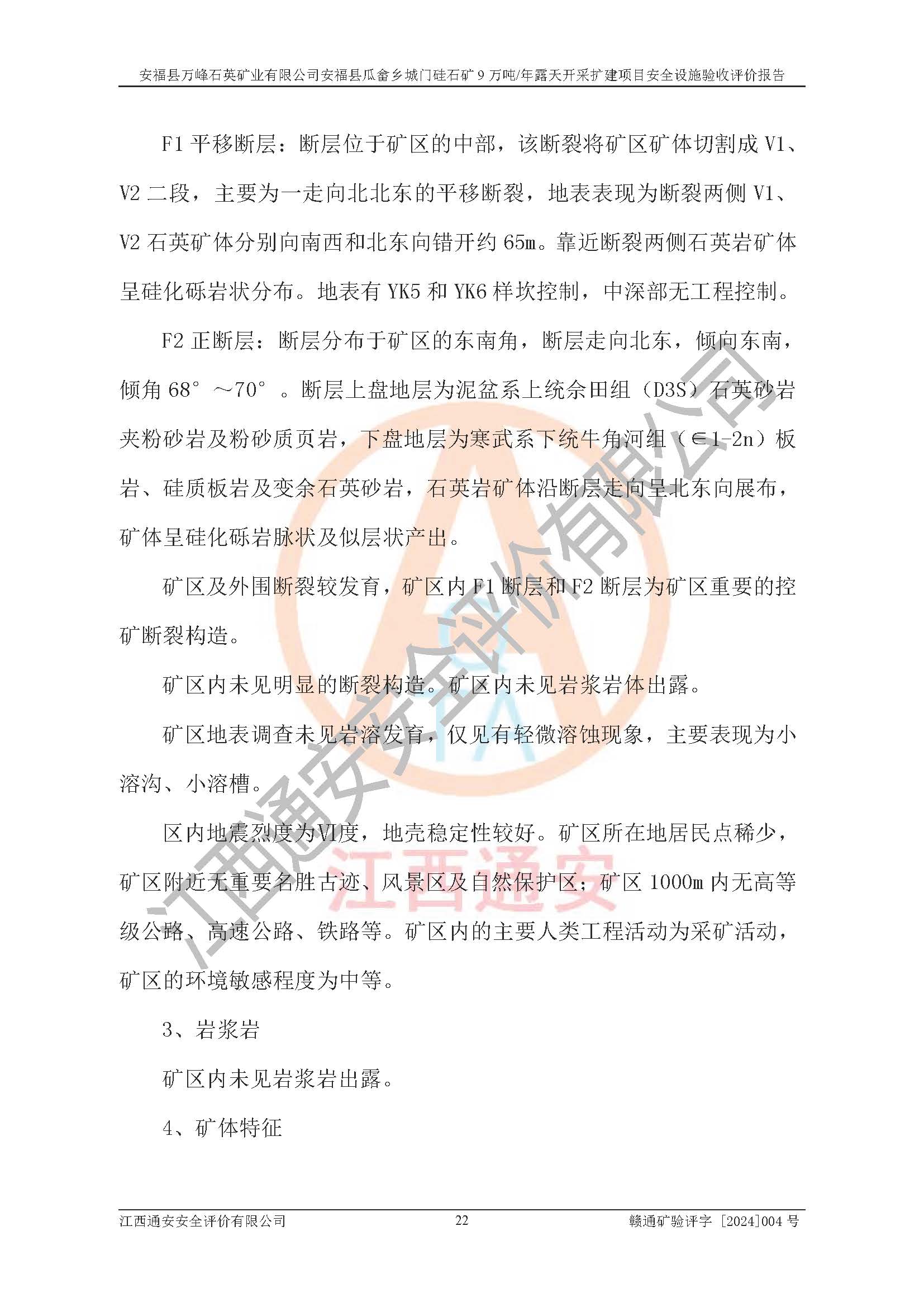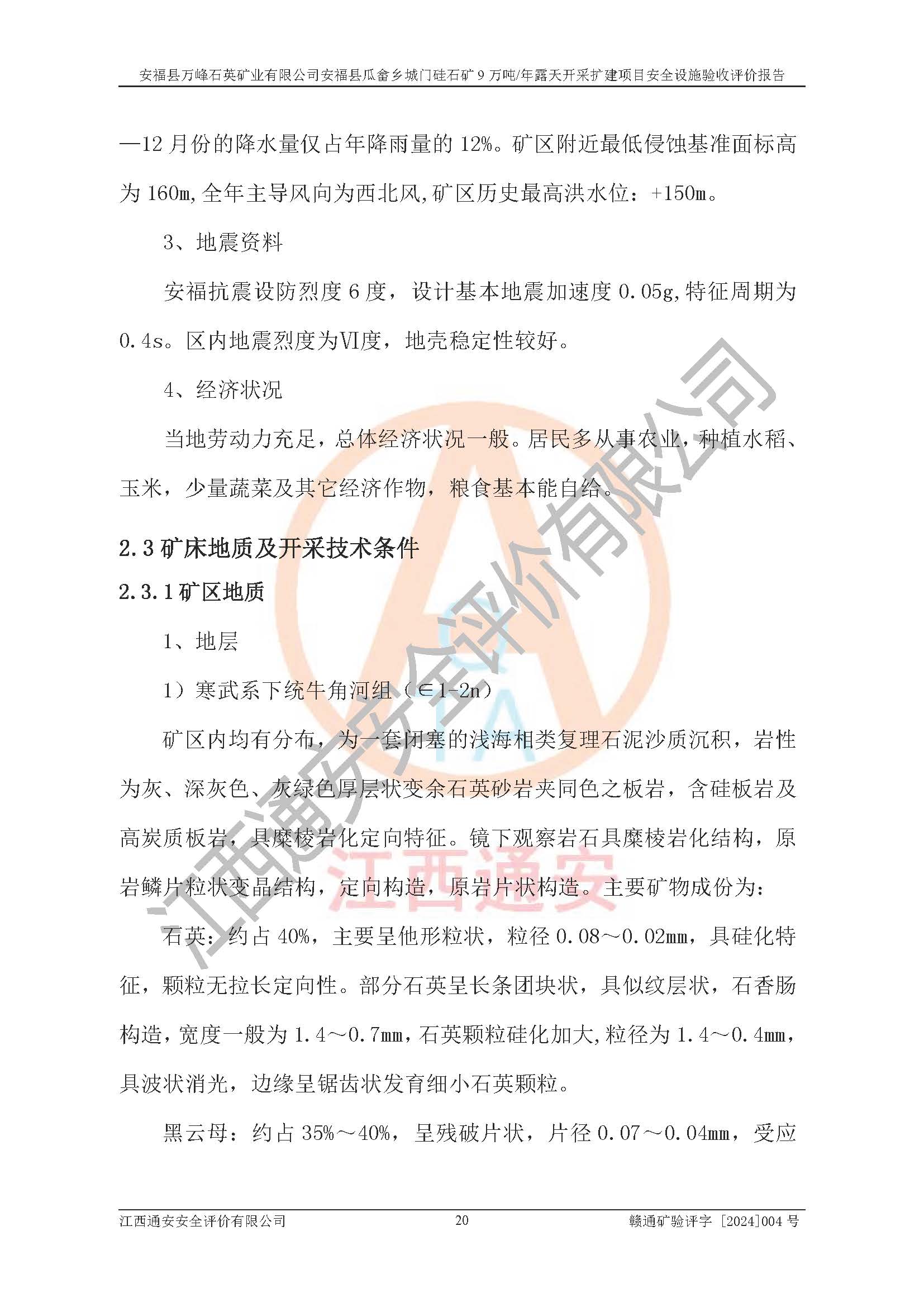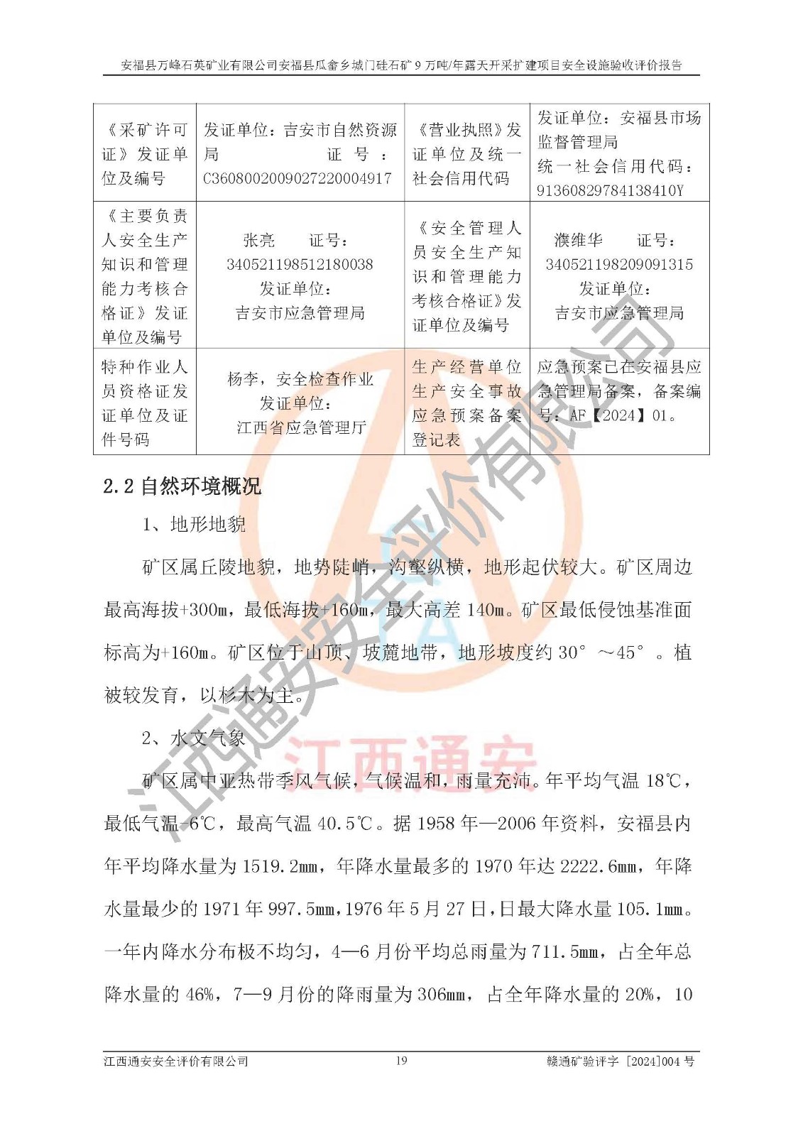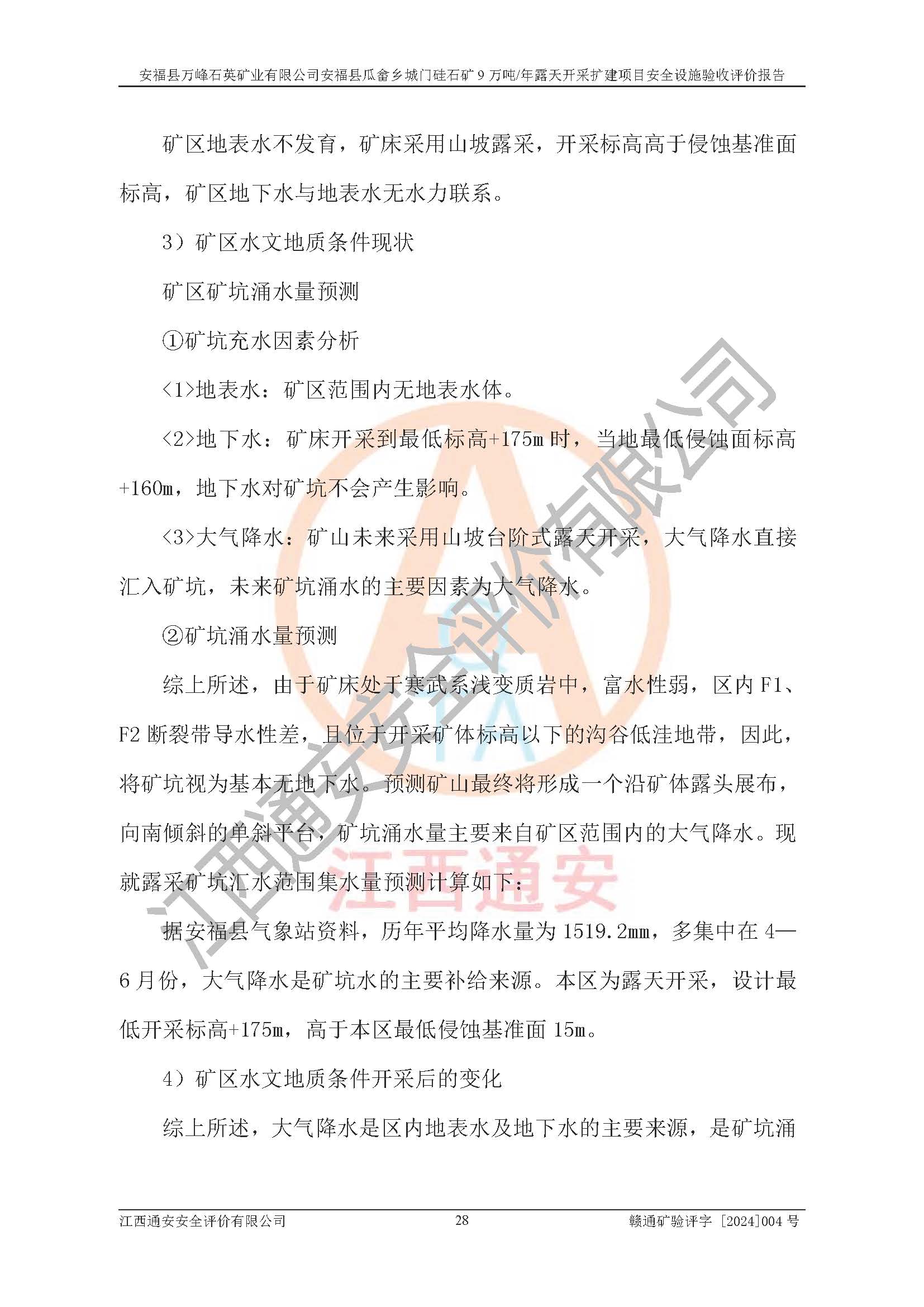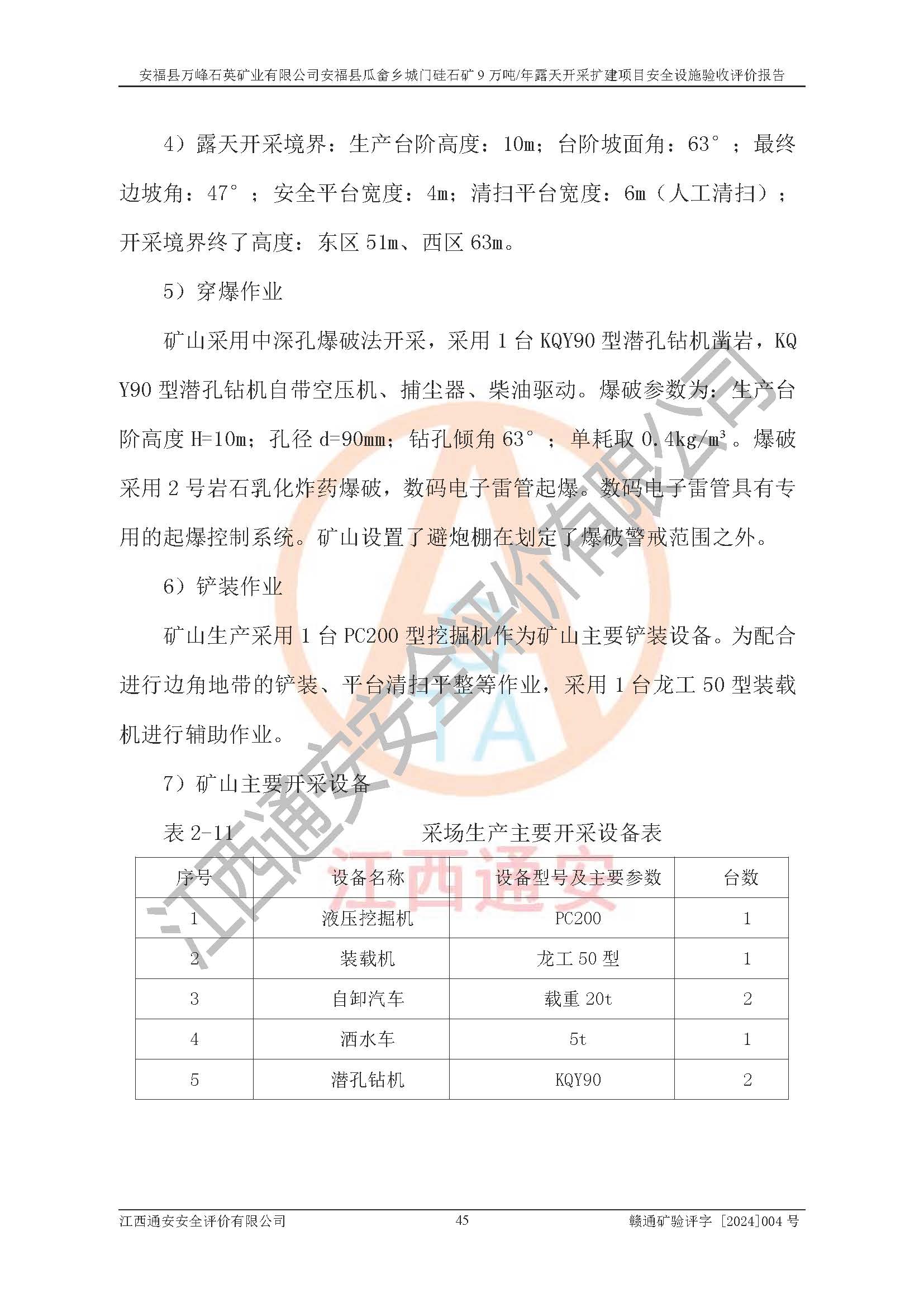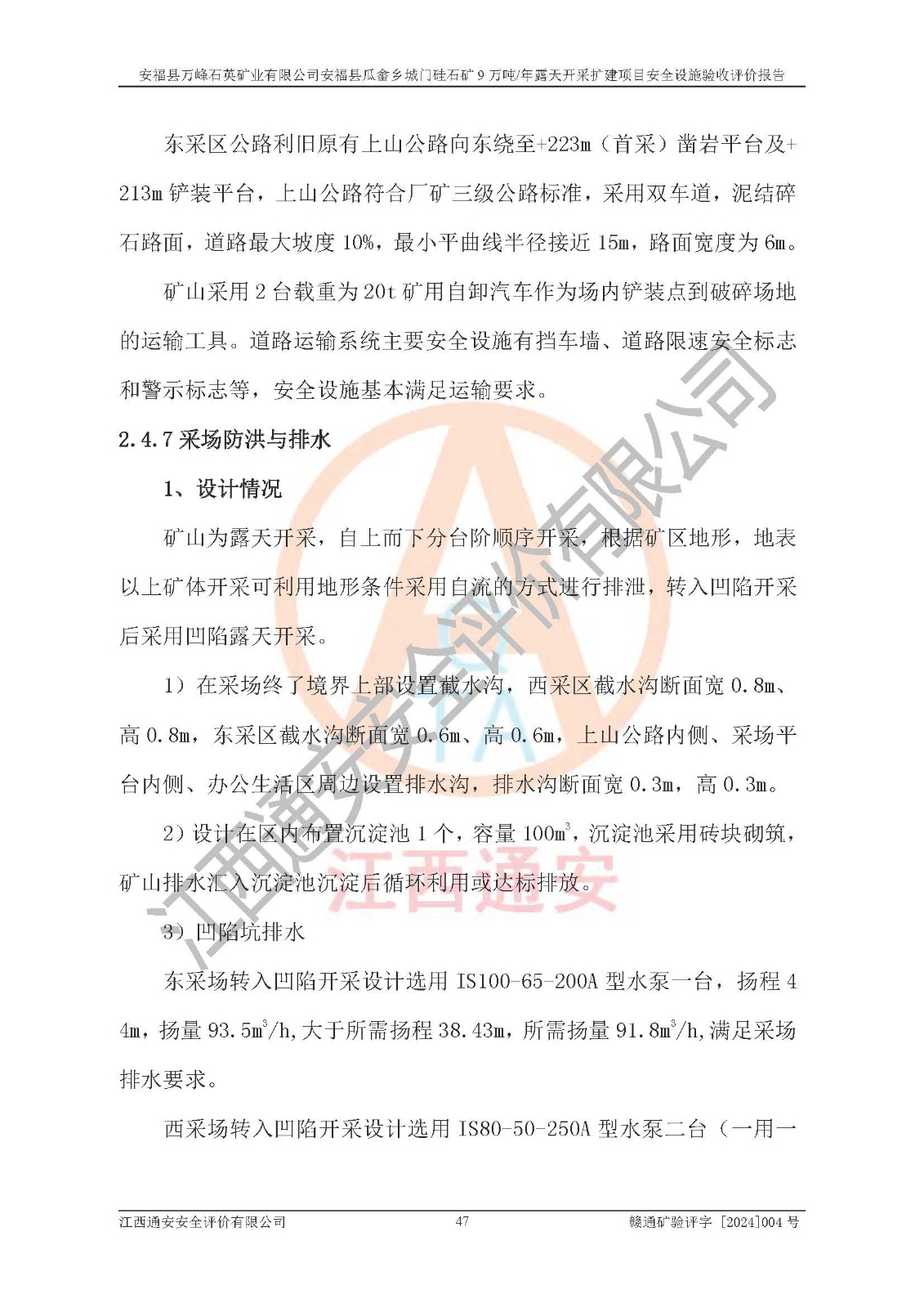 安??h萬(wàn)峰石英礦業(yè)有限公司安??h瓜畬鄉(xiāng)城門(mén)硅石礦礦區(qū)位于安??h城70°方向約15km處,行政區(qū)劃屬安福縣瓜畬鄉(xiāng)管轄。礦區(qū)位置地理坐標(biāo):東經(jīng)114°44′12"~114°44′29",北緯27°28′53"~27°28′57",礦區(qū)中心地理坐標(biāo):東經(jīng)114°44′20",北緯27°28′55"。礦區(qū)有約15km簡(jiǎn)易公路經(jīng)瓜畬鄉(xiāng)**所在地,與安?!掠喙废嘟?,交通方便。 安??h瓜畬鄉(xiāng)城門(mén)硅石礦于2016年3月8日取得采礦許可證,證號(hào)C3608002009027220004917,生產(chǎn)規(guī)模1萬(wàn)噸/年,礦區(qū)面積:0.0646km2。 因礦山生產(chǎn)規(guī)模滿足不了市場(chǎng)要求,加上礦區(qū)有些地征用比較困難,企業(yè)向吉安市自然資源局申請(qǐng)擴(kuò)大生產(chǎn)規(guī)模,并將礦區(qū)范圍進(jìn)行了縮小。 2019年6月8日取得了吉安市自然資源局換發(fā)的采礦許可證,證號(hào)C3608002009027220004917,生產(chǎn)規(guī)模9萬(wàn)噸/年,礦區(qū)面積為0.029km2。**期自2019年6月8日至2027年6月8日。由于新的采礦證擴(kuò)大了生產(chǎn)規(guī)模,且改變了礦區(qū)范圍,該項(xiàng)目屬于擴(kuò)建項(xiàng)目。 吉安市富林礦山技術(shù)服務(wù)有限公司于2019年9月編制了《安??h瓜畬鄉(xiāng)城門(mén)玻璃用石英巖礦資源儲(chǔ)量核實(shí)報(bào)告》,吉安市富林礦山技術(shù)服務(wù)有限公司于2020年4月編制了《安??h瓜畬鄉(xiāng)城門(mén)玻璃用石英巖礦礦產(chǎn)資源開(kāi)發(fā)利用、地質(zhì)環(huán)境恢復(fù)治理與土地復(fù)墾方案》,貴州匯和安全評(píng)價(jià)有限公司于2023年4月編制了《安??h萬(wàn)峰石英礦業(yè)有限公司安??h瓜畬鄉(xiāng)城門(mén)硅石礦9萬(wàn)噸/年露天開(kāi)采擴(kuò)建項(xiàng)目安全預(yù)評(píng)價(jià)報(bào)告》,河南華鼎礦業(yè)設(shè)計(jì)有限公司于2023年6月編制了《安??h萬(wàn)峰石英礦業(yè)有限公司安??h瓜畬鄉(xiāng)城門(mén)硅石礦9萬(wàn)噸/年露天開(kāi)采擴(kuò)建項(xiàng)目初步設(shè)計(jì)》和《安??h萬(wàn)峰石英礦業(yè)有限公司安福縣瓜畬鄉(xiāng)城門(mén)硅石礦9萬(wàn)噸/年露天開(kāi)采擴(kuò)建項(xiàng)目安全設(shè)施設(shè)計(jì)》;2023年7月3日安??h應(yīng)急管理局下發(fā)了《關(guān)于安福縣萬(wàn)峰石英礦業(yè)有限公司安??h瓜畬鄉(xiāng)城門(mén)硅石礦9萬(wàn)噸/年露天開(kāi)采擴(kuò)建項(xiàng)目安全設(shè)施設(shè)計(jì)審查意見(jiàn)》(安應(yīng)急字〔2023〕30號(hào))。 2023年7月安??h萬(wàn)峰石英礦業(yè)有限公司根據(jù)《中華人民共和國(guó)安全生產(chǎn)法》、《安全生產(chǎn)許可證條例》等有關(guān)法律、法規(guī)、部門(mén)規(guī)章的規(guī)定,嚴(yán)格按照《安全設(shè)施設(shè)計(jì)》進(jìn)行基建,該礦山分東、西兩個(gè)采區(qū),西采區(qū)設(shè)計(jì)+259m平臺(tái)為采剝平臺(tái)、+249m平臺(tái)為鏟裝平臺(tái),開(kāi)拓運(yùn)輸?shù)缆分?249m平臺(tái),在基建過(guò)程中,剝離表土?xí)r因表土層發(fā)生變化,+259m采剝平臺(tái)無(wú)硅石資源可采,因此首采平臺(tái)及其鏟裝平臺(tái)、開(kāi)拓運(yùn)輸?shù)缆?*進(jìn)行變更。 2024年4月礦山委托原設(shè)計(jì)單位河南華鼎礦業(yè)設(shè)計(jì)有限公司編制了《安??h萬(wàn)峰石英礦業(yè)有限公司安??h瓜畬鄉(xiāng)城門(mén)硅石礦9萬(wàn)噸/年露天開(kāi)采擴(kuò)建項(xiàng)目變更設(shè)計(jì)》,根據(jù)礦山西采區(qū)+259m、+249m、+239m平臺(tái)均無(wú)硅石資源的實(shí)際情況,對(duì)設(shè)計(jì)的西采區(qū)+259m平臺(tái)為采剝平臺(tái)、+249m平臺(tái)為鏟裝平臺(tái),開(kāi)拓運(yùn)輸?shù)缆分?249m平臺(tái)進(jìn)行變更,將+259m平臺(tái)、+249m平臺(tái)變更為安全平臺(tái),+239m平臺(tái)仍為清掃平臺(tái),首采平臺(tái)變更為+229m平臺(tái)、鏟裝平臺(tái)變更為+219m平臺(tái),開(kāi)拓運(yùn)輸?shù)缆分?219m平臺(tái)、簡(jiǎn)易道路至+229m平臺(tái);東采區(qū)安全設(shè)施設(shè)計(jì)不變,根據(jù)《**礦山監(jiān)察局關(guān)于印發(fā)非煤礦山建設(shè)項(xiàng)目安全設(shè)施重大變更范圍的通知》之規(guī)定,上述變更不屬于重大變更。 安??h萬(wàn)峰石英礦業(yè)有限公司安??h瓜畬鄉(xiāng)城門(mén)硅石礦9萬(wàn)噸/年露天開(kāi)采擴(kuò)建項(xiàng)目基建已完成,本次安全設(shè)施驗(yàn)收評(píng)價(jià)未涉及凹陷露天開(kāi)采。 |
