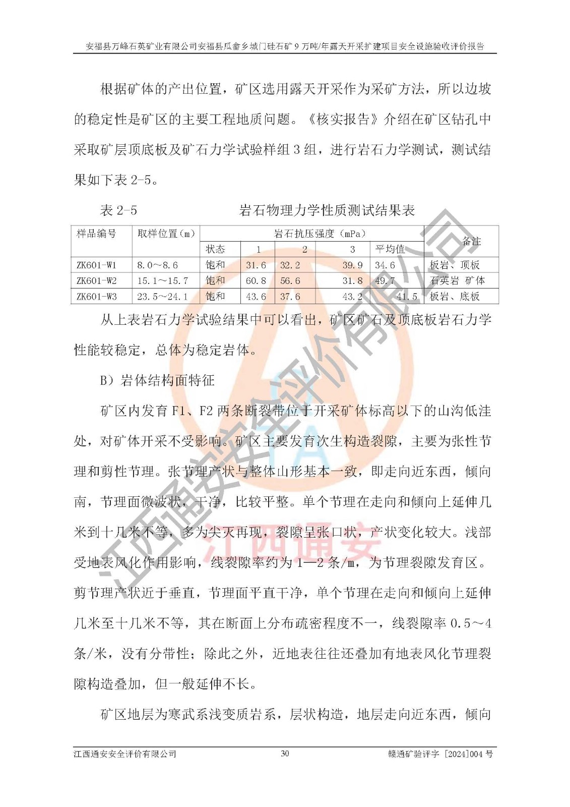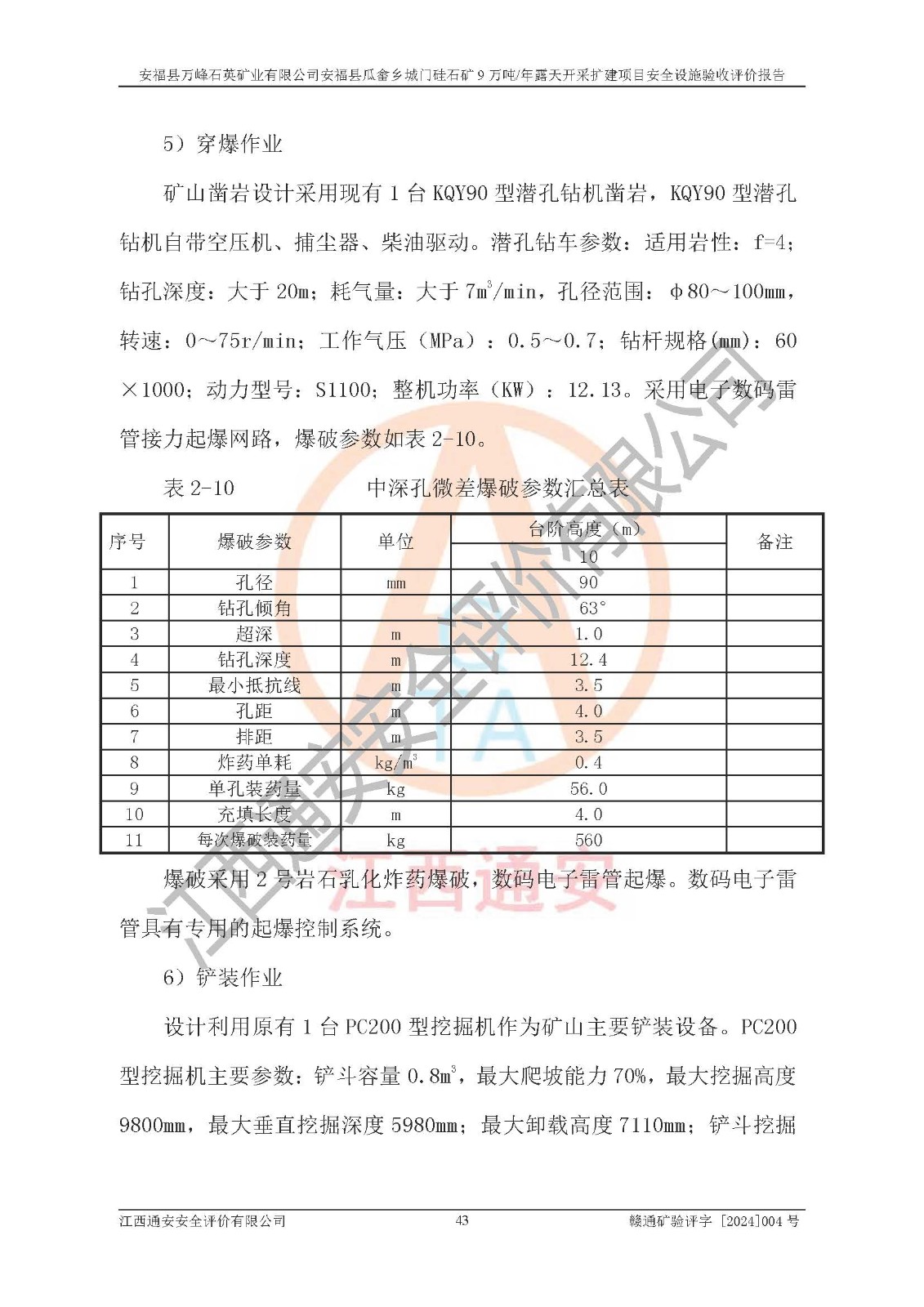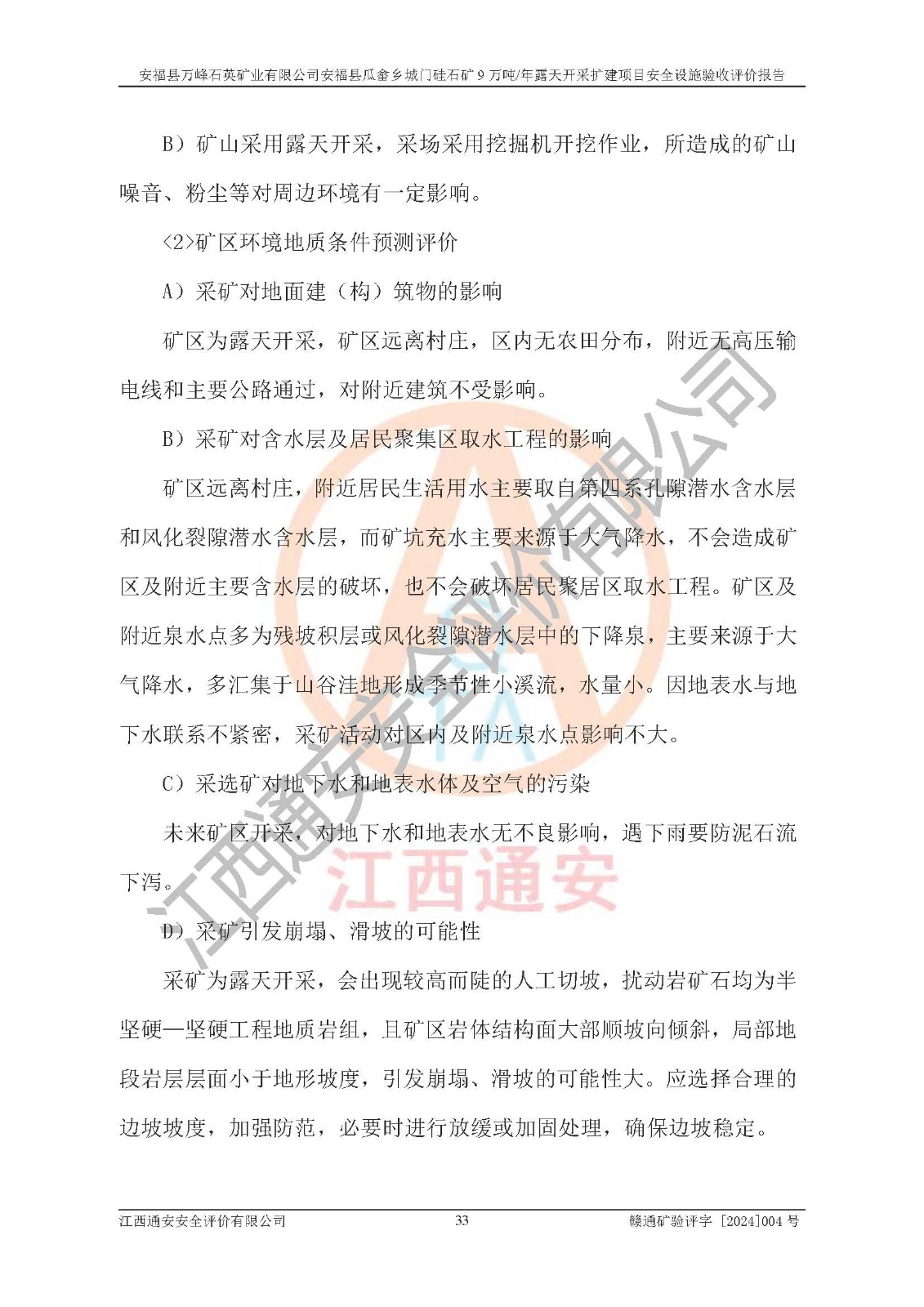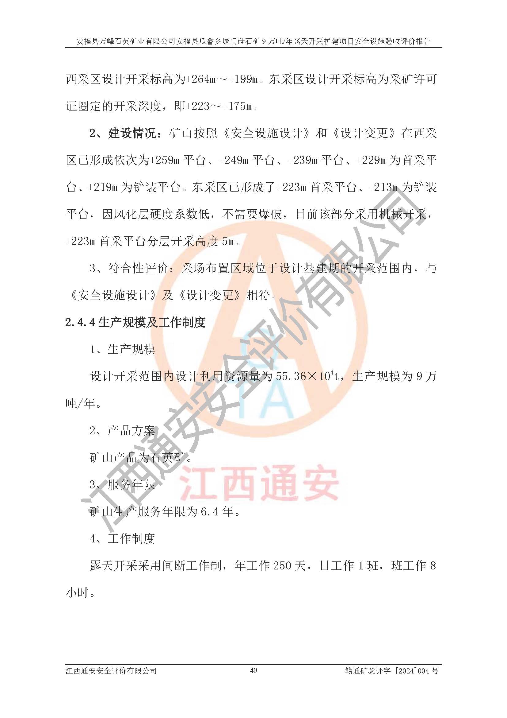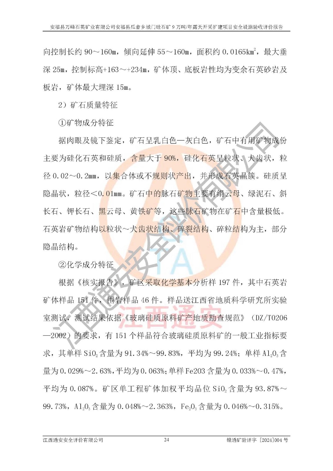 安??h萬(wàn)峰石英礦業(yè)有限公司安??h瓜畬鄉(xiāng)城門(mén)硅石礦礦區(qū)位于安??h城70°方向約15km處,行政區(qū)劃屬安福縣瓜畬鄉(xiāng)管轄。礦區(qū)位置地理坐標(biāo):東經(jīng)114°44′12"~114°44′29",北緯27°28′53"~27°28′57",礦區(qū)中心地理坐標(biāo):東經(jīng)114°44′20",北緯27°28′55"。礦區(qū)有約15km簡(jiǎn)易公路經(jīng)瓜畬鄉(xiāng)**所在地,與安?!掠喙废嘟?,交通方便。 安??h瓜畬鄉(xiāng)城門(mén)硅石礦于2016年3月8日取得采礦許可證,證號(hào)C3608002009027220004917,生產(chǎn)規(guī)模1萬(wàn)噸/年,礦區(qū)面積:0.0646km2。 因礦山生產(chǎn)規(guī)模滿足不了市場(chǎng)要求,加上礦區(qū)有些地征用比較困難,企業(yè)向吉安市自然資源局申請(qǐng)擴(kuò)大生產(chǎn)規(guī)模,并將礦區(qū)范圍進(jìn)行了縮小。 2019年6月8日取得了吉安市自然資源局換發(fā)的采礦許可證,證號(hào)C3608002009027220004917,生產(chǎn)規(guī)模9萬(wàn)噸/年,礦區(qū)面積為0.029km2。**期自2019年6月8日至2027年6月8日。由于新的采礦證擴(kuò)大了生產(chǎn)規(guī)模,且改變了礦區(qū)范圍,該項(xiàng)目屬于擴(kuò)建項(xiàng)目。 吉安市富林礦山技術(shù)服務(wù)有限公司于2019年9月編制了《安??h瓜畬鄉(xiāng)城門(mén)玻璃用石英巖礦資源儲(chǔ)量核實(shí)報(bào)告》,吉安市富林礦山技術(shù)服務(wù)有限公司于2020年4月編制了《安??h瓜畬鄉(xiāng)城門(mén)玻璃用石英巖礦礦產(chǎn)資源開(kāi)發(fā)利用、地質(zhì)環(huán)境恢復(fù)治理與土地復(fù)墾方案》,貴州匯和安全評(píng)價(jià)有限公司于2023年4月編制了《安??h萬(wàn)峰石英礦業(yè)有限公司安??h瓜畬鄉(xiāng)城門(mén)硅石礦9萬(wàn)噸/年露天開(kāi)采擴(kuò)建項(xiàng)目安全預(yù)評(píng)價(jià)報(bào)告》,河南華鼎礦業(yè)設(shè)計(jì)有限公司于2023年6月編制了《安??h萬(wàn)峰石英礦業(yè)有限公司安??h瓜畬鄉(xiāng)城門(mén)硅石礦9萬(wàn)噸/年露天開(kāi)采擴(kuò)建項(xiàng)目初步設(shè)計(jì)》和《安??h萬(wàn)峰石英礦業(yè)有限公司安福縣瓜畬鄉(xiāng)城門(mén)硅石礦9萬(wàn)噸/年露天開(kāi)采擴(kuò)建項(xiàng)目安全設(shè)施設(shè)計(jì)》;2023年7月3日安??h應(yīng)急管理局下發(fā)了《關(guān)于安福縣萬(wàn)峰石英礦業(yè)有限公司安??h瓜畬鄉(xiāng)城門(mén)硅石礦9萬(wàn)噸/年露天開(kāi)采擴(kuò)建項(xiàng)目安全設(shè)施設(shè)計(jì)審查意見(jiàn)》(安應(yīng)急字〔2023〕30號(hào))。 2023年7月安??h萬(wàn)峰石英礦業(yè)有限公司根據(jù)《中華人民共和國(guó)安全生產(chǎn)法》、《安全生產(chǎn)許可證條例》等有關(guān)法律、法規(guī)、部門(mén)規(guī)章的規(guī)定,嚴(yán)格按照《安全設(shè)施設(shè)計(jì)》進(jìn)行基建,該礦山分東、西兩個(gè)采區(qū),西采區(qū)設(shè)計(jì)+259m平臺(tái)為采剝平臺(tái)、+249m平臺(tái)為鏟裝平臺(tái),開(kāi)拓運(yùn)輸?shù)缆分?249m平臺(tái),在基建過(guò)程中,剝離表土?xí)r因表土層發(fā)生變化,+259m采剝平臺(tái)無(wú)硅石資源可采,因此首采平臺(tái)及其鏟裝平臺(tái)、開(kāi)拓運(yùn)輸?shù)缆?*進(jìn)行變更。 2024年4月礦山委托原設(shè)計(jì)單位河南華鼎礦業(yè)設(shè)計(jì)有限公司編制了《安??h萬(wàn)峰石英礦業(yè)有限公司安??h瓜畬鄉(xiāng)城門(mén)硅石礦9萬(wàn)噸/年露天開(kāi)采擴(kuò)建項(xiàng)目變更設(shè)計(jì)》,根據(jù)礦山西采區(qū)+259m、+249m、+239m平臺(tái)均無(wú)硅石資源的實(shí)際情況,對(duì)設(shè)計(jì)的西采區(qū)+259m平臺(tái)為采剝平臺(tái)、+249m平臺(tái)為鏟裝平臺(tái),開(kāi)拓運(yùn)輸?shù)缆分?249m平臺(tái)進(jìn)行變更,將+259m平臺(tái)、+249m平臺(tái)變更為安全平臺(tái),+239m平臺(tái)仍為清掃平臺(tái),首采平臺(tái)變更為+229m平臺(tái)、鏟裝平臺(tái)變更為+219m平臺(tái),開(kāi)拓運(yùn)輸?shù)缆分?219m平臺(tái)、簡(jiǎn)易道路至+229m平臺(tái);東采區(qū)安全設(shè)施設(shè)計(jì)不變,根據(jù)《**礦山監(jiān)察局關(guān)于印發(fā)非煤礦山建設(shè)項(xiàng)目安全設(shè)施重大變更范圍的通知》之規(guī)定,上述變更不屬于重大變更。 安??h萬(wàn)峰石英礦業(yè)有限公司安??h瓜畬鄉(xiāng)城門(mén)硅石礦9萬(wàn)噸/年露天開(kāi)采擴(kuò)建項(xiàng)目基建已完成,本次安全設(shè)施驗(yàn)收評(píng)價(jià)未涉及凹陷露天開(kāi)采。 |