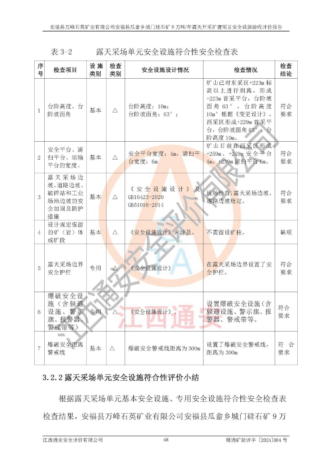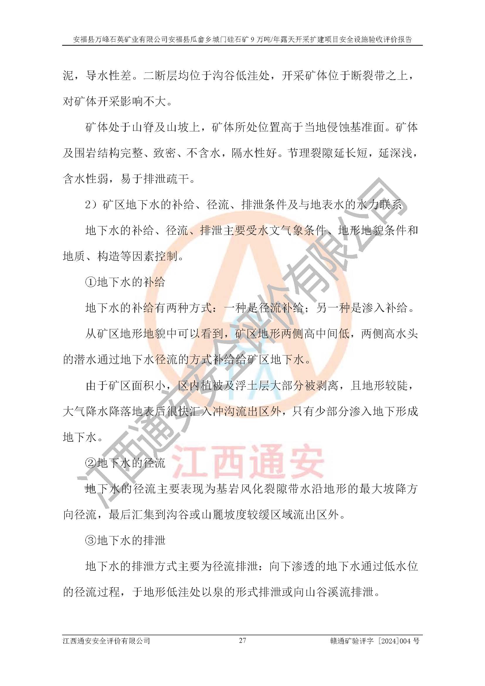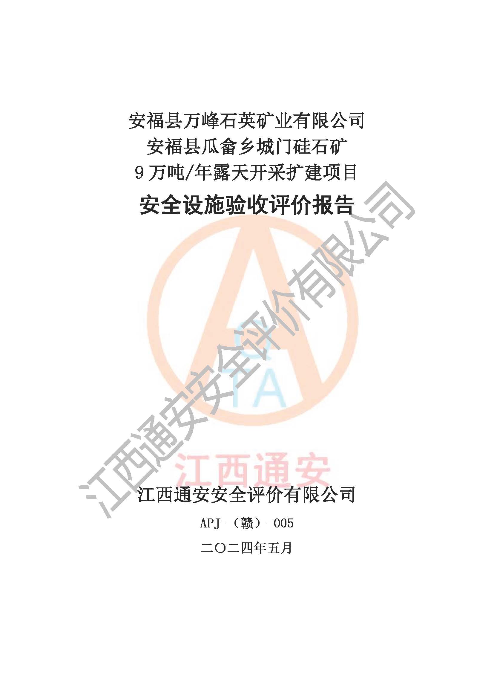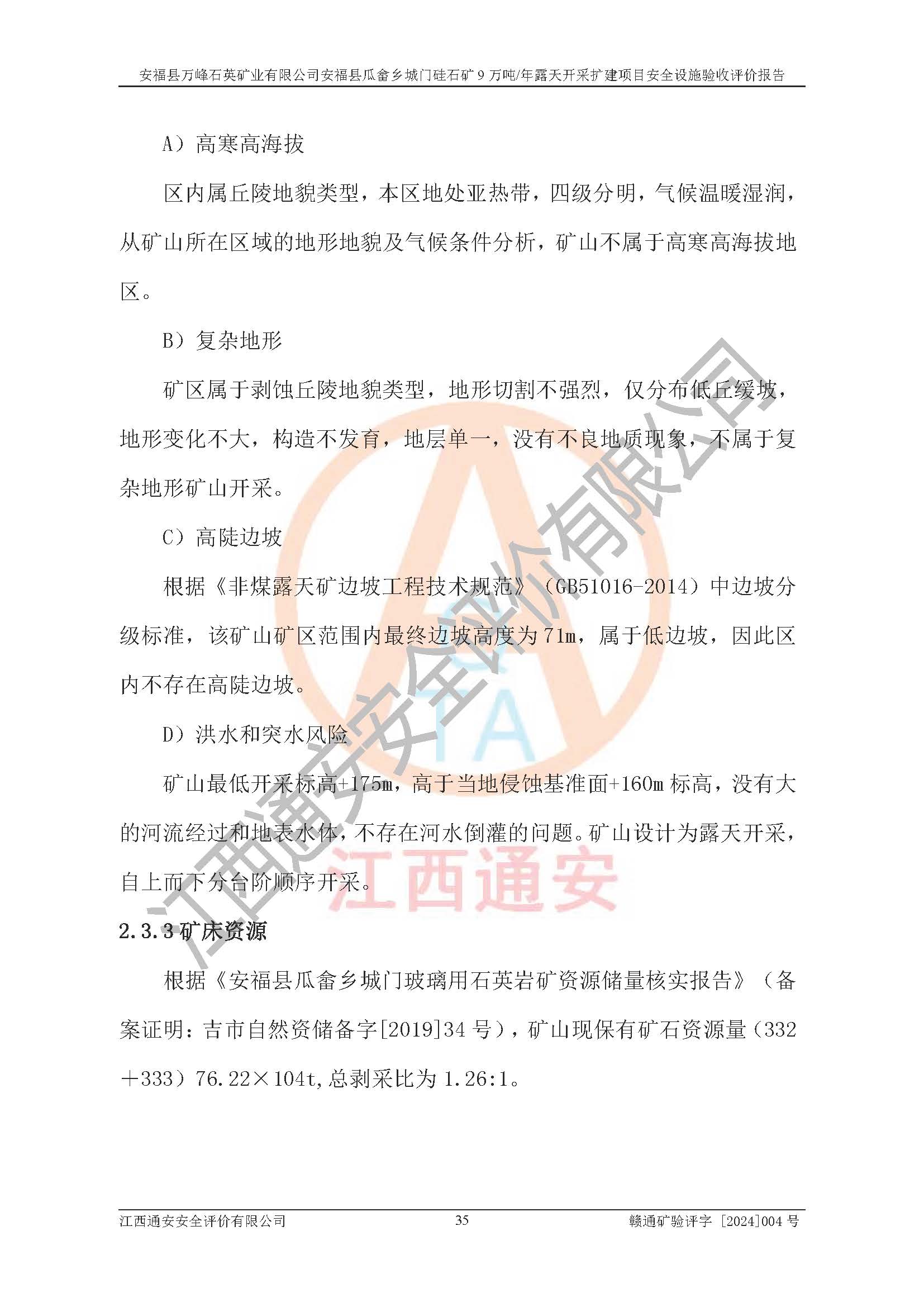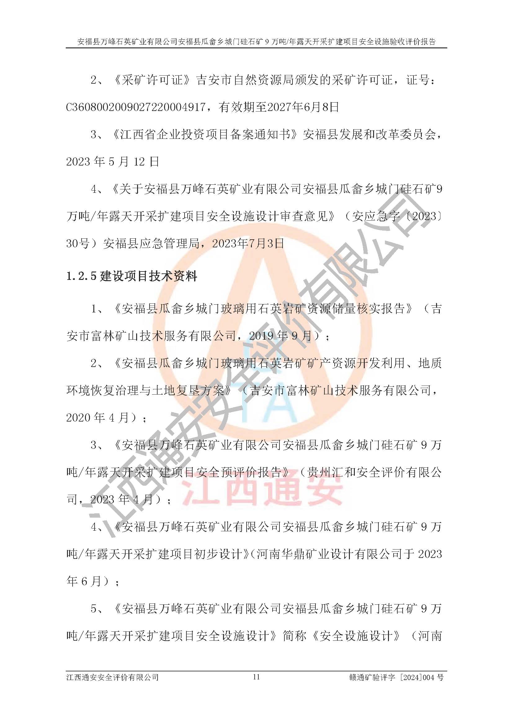 安??h萬(wàn)峰石英礦業(yè)有限公司安??h瓜畬鄉(xiāng)城門(mén)硅石礦礦區(qū)位于安??h城70°方向約15km處,行政區(qū)劃屬安福縣瓜畬鄉(xiāng)管轄。礦區(qū)位置地理坐標(biāo):東經(jīng)114°44′12"~114°44′29",北緯27°28′53"~27°28′57",礦區(qū)中心地理坐標(biāo):東經(jīng)114°44′20",北緯27°28′55"。礦區(qū)有約15km簡(jiǎn)易公路經(jīng)瓜畬鄉(xiāng)**所在地,與安?!掠喙废嘟?,交通方便。 安??h瓜畬鄉(xiāng)城門(mén)硅石礦于2016年3月8日取得采礦許可證,證號(hào)C3608002009027220004917,生產(chǎn)規(guī)模1萬(wàn)噸/年,礦區(qū)面積:0.0646km2。 因礦山生產(chǎn)規(guī)模滿足不了市場(chǎng)要求,加上礦區(qū)有些地征用比較困難,企業(yè)向吉安市自然資源局申請(qǐng)擴(kuò)大生產(chǎn)規(guī)模,并將礦區(qū)范圍進(jìn)行了縮小。 2019年6月8日取得了吉安市自然資源局換發(fā)的采礦許可證,證號(hào)C3608002009027220004917,生產(chǎn)規(guī)模9萬(wàn)噸/年,礦區(qū)面積為0.029km2。**期自2019年6月8日至2027年6月8日。由于新的采礦證擴(kuò)大了生產(chǎn)規(guī)模,且改變了礦區(qū)范圍,該項(xiàng)目屬于擴(kuò)建項(xiàng)目。 吉安市富林礦山技術(shù)服務(wù)有限公司于2019年9月編制了《安??h瓜畬鄉(xiāng)城門(mén)玻璃用石英巖礦資源儲(chǔ)量核實(shí)報(bào)告》,吉安市富林礦山技術(shù)服務(wù)有限公司于2020年4月編制了《安??h瓜畬鄉(xiāng)城門(mén)玻璃用石英巖礦礦產(chǎn)資源開(kāi)發(fā)利用、地質(zhì)環(huán)境恢復(fù)治理與土地復(fù)墾方案》,貴州匯和安全評(píng)價(jià)有限公司于2023年4月編制了《安??h萬(wàn)峰石英礦業(yè)有限公司安??h瓜畬鄉(xiāng)城門(mén)硅石礦9萬(wàn)噸/年露天開(kāi)采擴(kuò)建項(xiàng)目安全預(yù)評(píng)價(jià)報(bào)告》,河南華鼎礦業(yè)設(shè)計(jì)有限公司于2023年6月編制了《安??h萬(wàn)峰石英礦業(yè)有限公司安??h瓜畬鄉(xiāng)城門(mén)硅石礦9萬(wàn)噸/年露天開(kāi)采擴(kuò)建項(xiàng)目初步設(shè)計(jì)》和《安??h萬(wàn)峰石英礦業(yè)有限公司安福縣瓜畬鄉(xiāng)城門(mén)硅石礦9萬(wàn)噸/年露天開(kāi)采擴(kuò)建項(xiàng)目安全設(shè)施設(shè)計(jì)》;2023年7月3日安??h應(yīng)急管理局下發(fā)了《關(guān)于安福縣萬(wàn)峰石英礦業(yè)有限公司安??h瓜畬鄉(xiāng)城門(mén)硅石礦9萬(wàn)噸/年露天開(kāi)采擴(kuò)建項(xiàng)目安全設(shè)施設(shè)計(jì)審查意見(jiàn)》(安應(yīng)急字〔2023〕30號(hào))。 2023年7月安??h萬(wàn)峰石英礦業(yè)有限公司根據(jù)《中華人民共和國(guó)安全生產(chǎn)法》、《安全生產(chǎn)許可證條例》等有關(guān)法律、法規(guī)、部門(mén)規(guī)章的規(guī)定,嚴(yán)格按照《安全設(shè)施設(shè)計(jì)》進(jìn)行基建,該礦山分東、西兩個(gè)采區(qū),西采區(qū)設(shè)計(jì)+259m平臺(tái)為采剝平臺(tái)、+249m平臺(tái)為鏟裝平臺(tái),開(kāi)拓運(yùn)輸?shù)缆分?249m平臺(tái),在基建過(guò)程中,剝離表土?xí)r因表土層發(fā)生變化,+259m采剝平臺(tái)無(wú)硅石資源可采,因此首采平臺(tái)及其鏟裝平臺(tái)、開(kāi)拓運(yùn)輸?shù)缆?*進(jìn)行變更。 2024年4月礦山委托原設(shè)計(jì)單位河南華鼎礦業(yè)設(shè)計(jì)有限公司編制了《安??h萬(wàn)峰石英礦業(yè)有限公司安??h瓜畬鄉(xiāng)城門(mén)硅石礦9萬(wàn)噸/年露天開(kāi)采擴(kuò)建項(xiàng)目變更設(shè)計(jì)》,根據(jù)礦山西采區(qū)+259m、+249m、+239m平臺(tái)均無(wú)硅石資源的實(shí)際情況,對(duì)設(shè)計(jì)的西采區(qū)+259m平臺(tái)為采剝平臺(tái)、+249m平臺(tái)為鏟裝平臺(tái),開(kāi)拓運(yùn)輸?shù)缆分?249m平臺(tái)進(jìn)行變更,將+259m平臺(tái)、+249m平臺(tái)變更為安全平臺(tái),+239m平臺(tái)仍為清掃平臺(tái),首采平臺(tái)變更為+229m平臺(tái)、鏟裝平臺(tái)變更為+219m平臺(tái),開(kāi)拓運(yùn)輸?shù)缆分?219m平臺(tái)、簡(jiǎn)易道路至+229m平臺(tái);東采區(qū)安全設(shè)施設(shè)計(jì)不變,根據(jù)《**礦山監(jiān)察局關(guān)于印發(fā)非煤礦山建設(shè)項(xiàng)目安全設(shè)施重大變更范圍的通知》之規(guī)定,上述變更不屬于重大變更。 安??h萬(wàn)峰石英礦業(yè)有限公司安??h瓜畬鄉(xiāng)城門(mén)硅石礦9萬(wàn)噸/年露天開(kāi)采擴(kuò)建項(xiàng)目基建已完成,本次安全設(shè)施驗(yàn)收評(píng)價(jià)未涉及凹陷露天開(kāi)采。 |