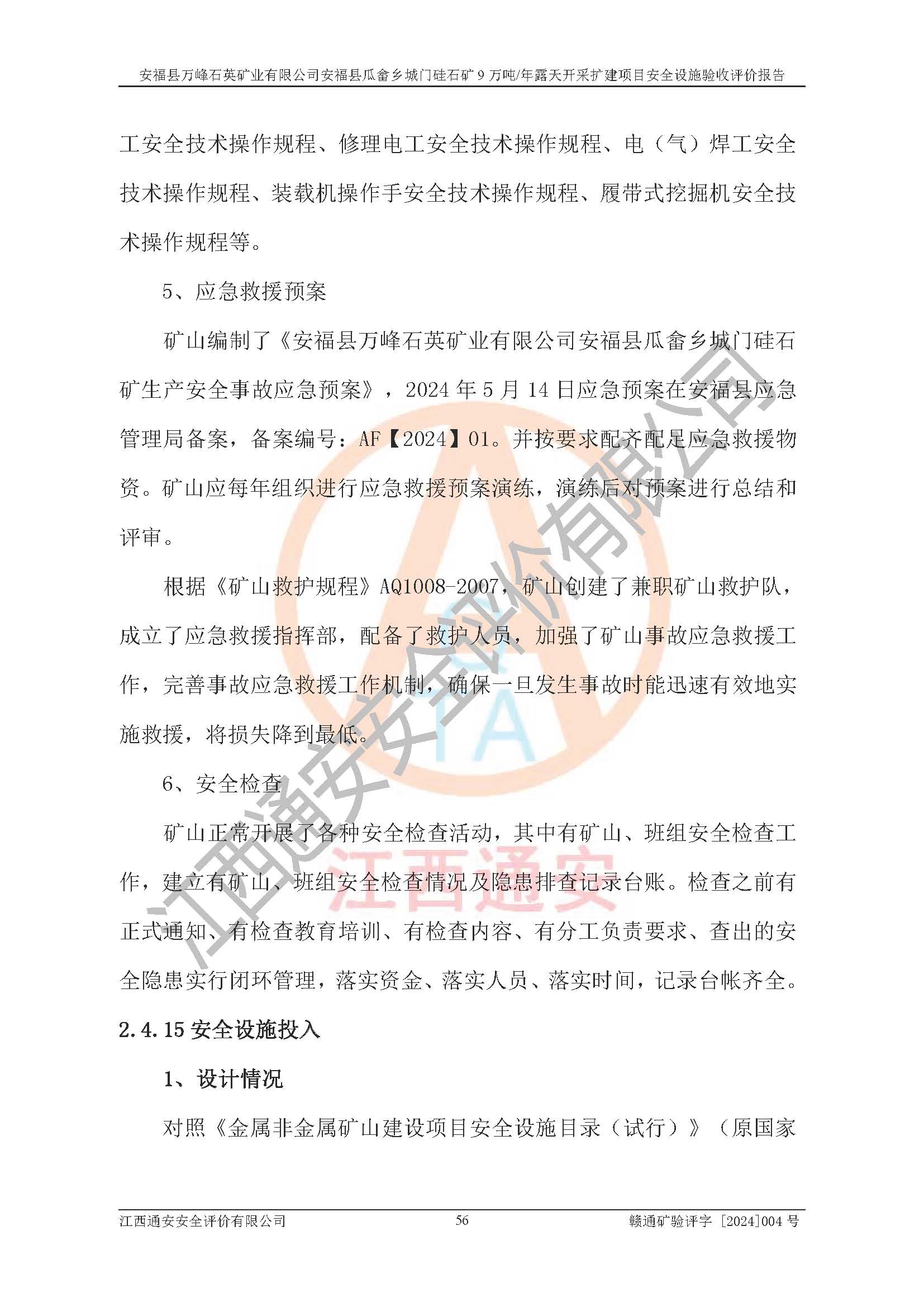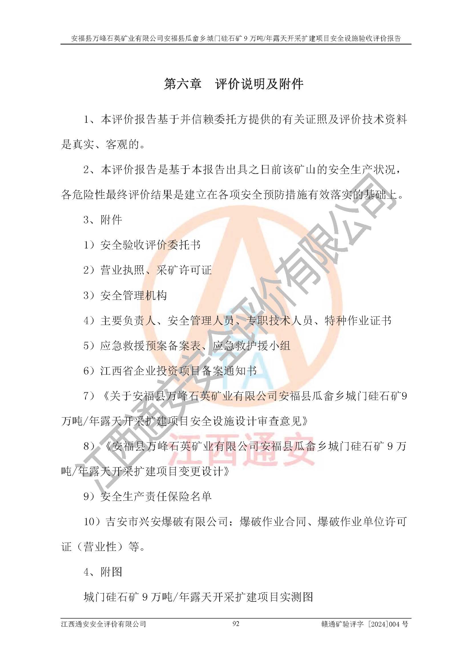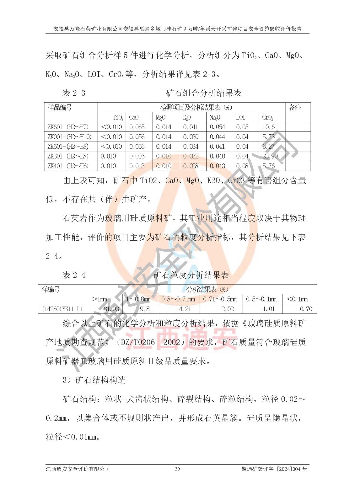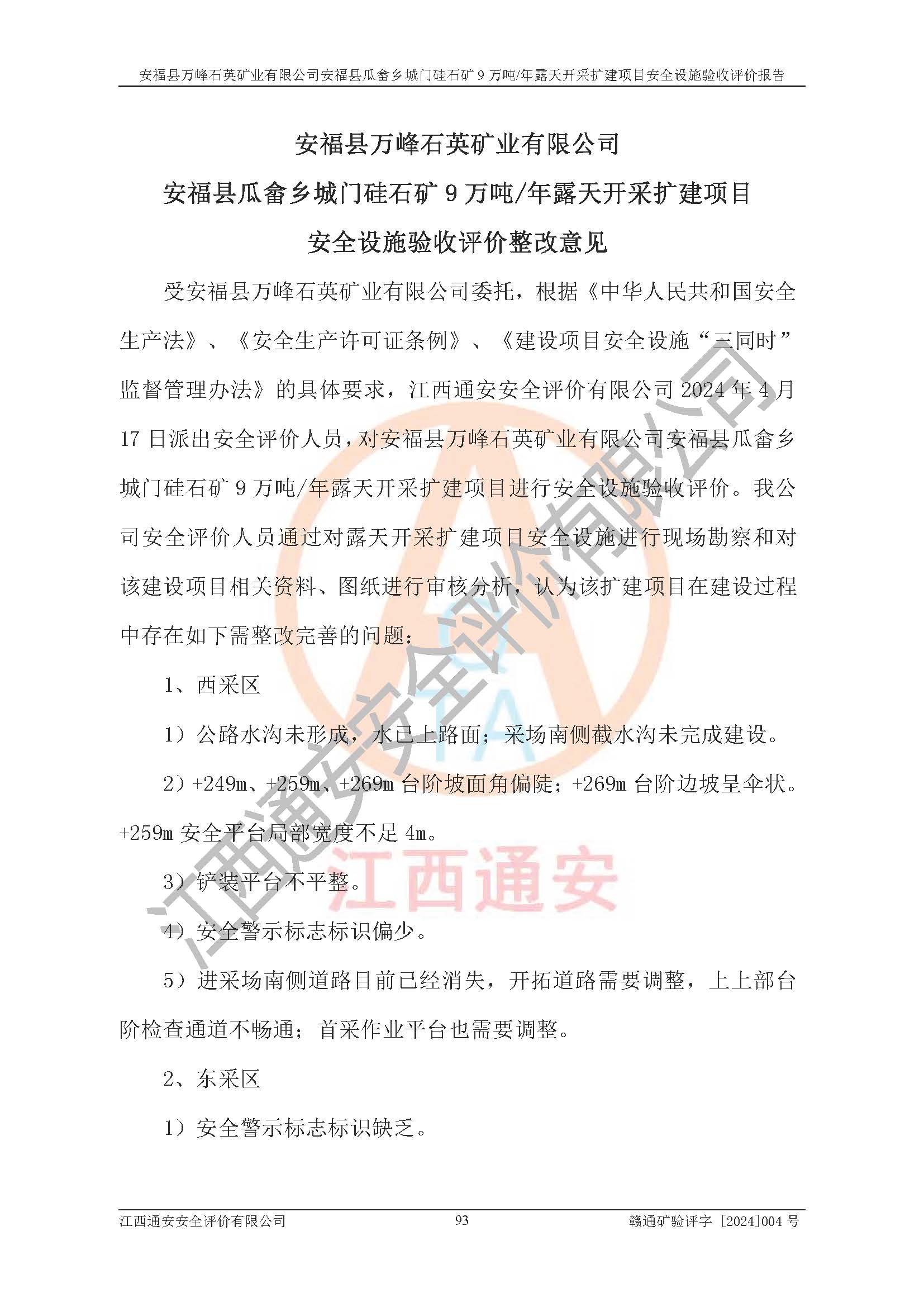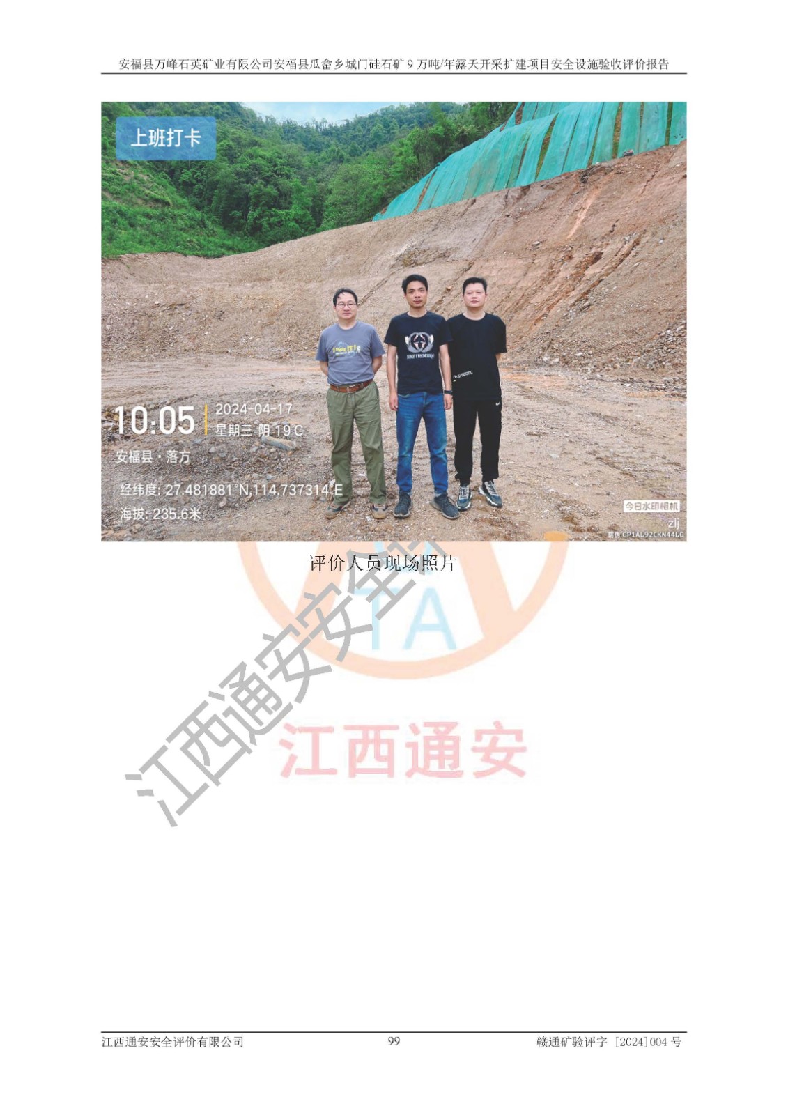 安??h萬(wàn)峰石英礦業(yè)有限公司安??h瓜畬鄉(xiāng)城門(mén)硅石礦礦區(qū)位于安??h城70°方向約15km處,行政區(qū)劃屬安福縣瓜畬鄉(xiāng)管轄。礦區(qū)位置地理坐標(biāo):東經(jīng)114°44′12"~114°44′29",北緯27°28′53"~27°28′57",礦區(qū)中心地理坐標(biāo):東經(jīng)114°44′20",北緯27°28′55"。礦區(qū)有約15km簡(jiǎn)易公路經(jīng)瓜畬鄉(xiāng)**所在地,與安?!掠喙废嘟?,交通方便。 安??h瓜畬鄉(xiāng)城門(mén)硅石礦于2016年3月8日取得采礦許可證,證號(hào)C3608002009027220004917,生產(chǎn)規(guī)模1萬(wàn)噸/年,礦區(qū)面積:0.0646km2。 因礦山生產(chǎn)規(guī)模滿足不了市場(chǎng)要求,加上礦區(qū)有些地征用比較困難,企業(yè)向吉安市自然資源局申請(qǐng)擴(kuò)大生產(chǎn)規(guī)模,并將礦區(qū)范圍進(jìn)行了縮小。 2019年6月8日取得了吉安市自然資源局換發(fā)的采礦許可證,證號(hào)C3608002009027220004917,生產(chǎn)規(guī)模9萬(wàn)噸/年,礦區(qū)面積為0.029km2。**期自2019年6月8日至2027年6月8日。由于新的采礦證擴(kuò)大了生產(chǎn)規(guī)模,且改變了礦區(qū)范圍,該項(xiàng)目屬于擴(kuò)建項(xiàng)目。 吉安市富林礦山技術(shù)服務(wù)有限公司于2019年9月編制了《安??h瓜畬鄉(xiāng)城門(mén)玻璃用石英巖礦資源儲(chǔ)量核實(shí)報(bào)告》,吉安市富林礦山技術(shù)服務(wù)有限公司于2020年4月編制了《安??h瓜畬鄉(xiāng)城門(mén)玻璃用石英巖礦礦產(chǎn)資源開(kāi)發(fā)利用、地質(zhì)環(huán)境恢復(fù)治理與土地復(fù)墾方案》,貴州匯和安全評(píng)價(jià)有限公司于2023年4月編制了《安??h萬(wàn)峰石英礦業(yè)有限公司安??h瓜畬鄉(xiāng)城門(mén)硅石礦9萬(wàn)噸/年露天開(kāi)采擴(kuò)建項(xiàng)目安全預(yù)評(píng)價(jià)報(bào)告》,河南華鼎礦業(yè)設(shè)計(jì)有限公司于2023年6月編制了《安??h萬(wàn)峰石英礦業(yè)有限公司安??h瓜畬鄉(xiāng)城門(mén)硅石礦9萬(wàn)噸/年露天開(kāi)采擴(kuò)建項(xiàng)目初步設(shè)計(jì)》和《安??h萬(wàn)峰石英礦業(yè)有限公司安福縣瓜畬鄉(xiāng)城門(mén)硅石礦9萬(wàn)噸/年露天開(kāi)采擴(kuò)建項(xiàng)目安全設(shè)施設(shè)計(jì)》;2023年7月3日安??h應(yīng)急管理局下發(fā)了《關(guān)于安福縣萬(wàn)峰石英礦業(yè)有限公司安??h瓜畬鄉(xiāng)城門(mén)硅石礦9萬(wàn)噸/年露天開(kāi)采擴(kuò)建項(xiàng)目安全設(shè)施設(shè)計(jì)審查意見(jiàn)》(安應(yīng)急字〔2023〕30號(hào))。 2023年7月安??h萬(wàn)峰石英礦業(yè)有限公司根據(jù)《中華人民共和國(guó)安全生產(chǎn)法》、《安全生產(chǎn)許可證條例》等有關(guān)法律、法規(guī)、部門(mén)規(guī)章的規(guī)定,嚴(yán)格按照《安全設(shè)施設(shè)計(jì)》進(jìn)行基建,該礦山分東、西兩個(gè)采區(qū),西采區(qū)設(shè)計(jì)+259m平臺(tái)為采剝平臺(tái)、+249m平臺(tái)為鏟裝平臺(tái),開(kāi)拓運(yùn)輸?shù)缆分?249m平臺(tái),在基建過(guò)程中,剝離表土?xí)r因表土層發(fā)生變化,+259m采剝平臺(tái)無(wú)硅石資源可采,因此首采平臺(tái)及其鏟裝平臺(tái)、開(kāi)拓運(yùn)輸?shù)缆?*進(jìn)行變更。 2024年4月礦山委托原設(shè)計(jì)單位河南華鼎礦業(yè)設(shè)計(jì)有限公司編制了《安??h萬(wàn)峰石英礦業(yè)有限公司安??h瓜畬鄉(xiāng)城門(mén)硅石礦9萬(wàn)噸/年露天開(kāi)采擴(kuò)建項(xiàng)目變更設(shè)計(jì)》,根據(jù)礦山西采區(qū)+259m、+249m、+239m平臺(tái)均無(wú)硅石資源的實(shí)際情況,對(duì)設(shè)計(jì)的西采區(qū)+259m平臺(tái)為采剝平臺(tái)、+249m平臺(tái)為鏟裝平臺(tái),開(kāi)拓運(yùn)輸?shù)缆分?249m平臺(tái)進(jìn)行變更,將+259m平臺(tái)、+249m平臺(tái)變更為安全平臺(tái),+239m平臺(tái)仍為清掃平臺(tái),首采平臺(tái)變更為+229m平臺(tái)、鏟裝平臺(tái)變更為+219m平臺(tái),開(kāi)拓運(yùn)輸?shù)缆分?219m平臺(tái)、簡(jiǎn)易道路至+229m平臺(tái);東采區(qū)安全設(shè)施設(shè)計(jì)不變,根據(jù)《**礦山監(jiān)察局關(guān)于印發(fā)非煤礦山建設(shè)項(xiàng)目安全設(shè)施重大變更范圍的通知》之規(guī)定,上述變更不屬于重大變更。 安??h萬(wàn)峰石英礦業(yè)有限公司安??h瓜畬鄉(xiāng)城門(mén)硅石礦9萬(wàn)噸/年露天開(kāi)采擴(kuò)建項(xiàng)目基建已完成,本次安全設(shè)施驗(yàn)收評(píng)價(jià)未涉及凹陷露天開(kāi)采。 |