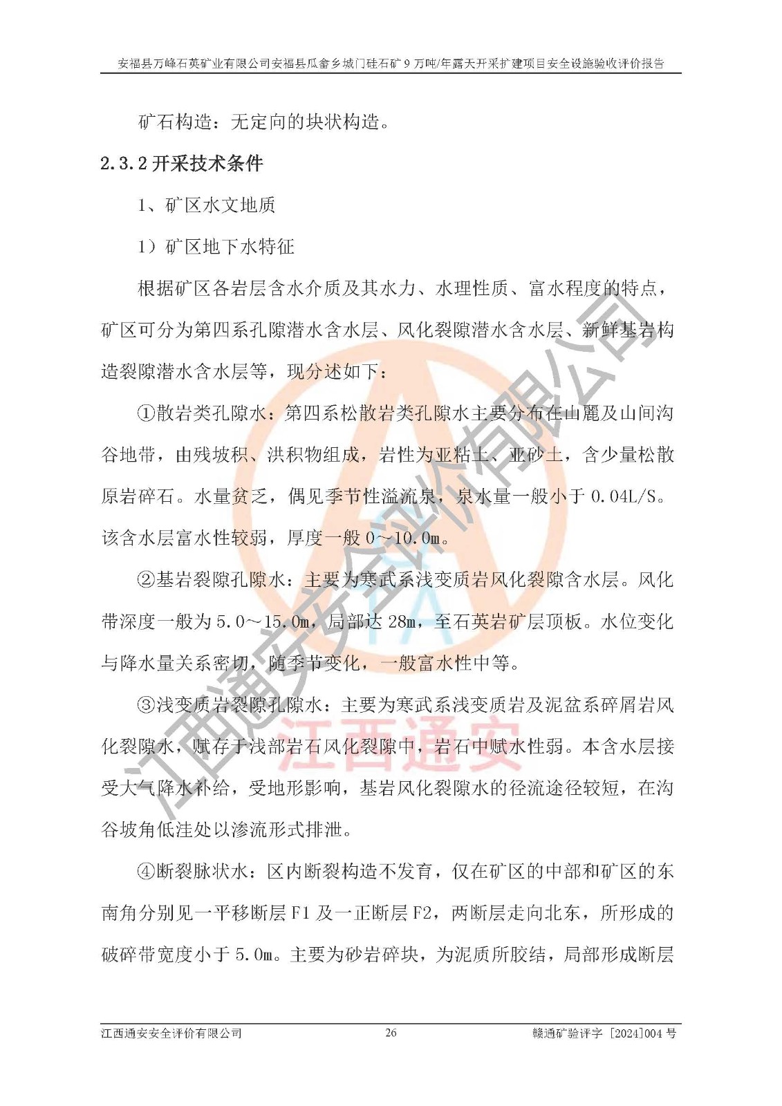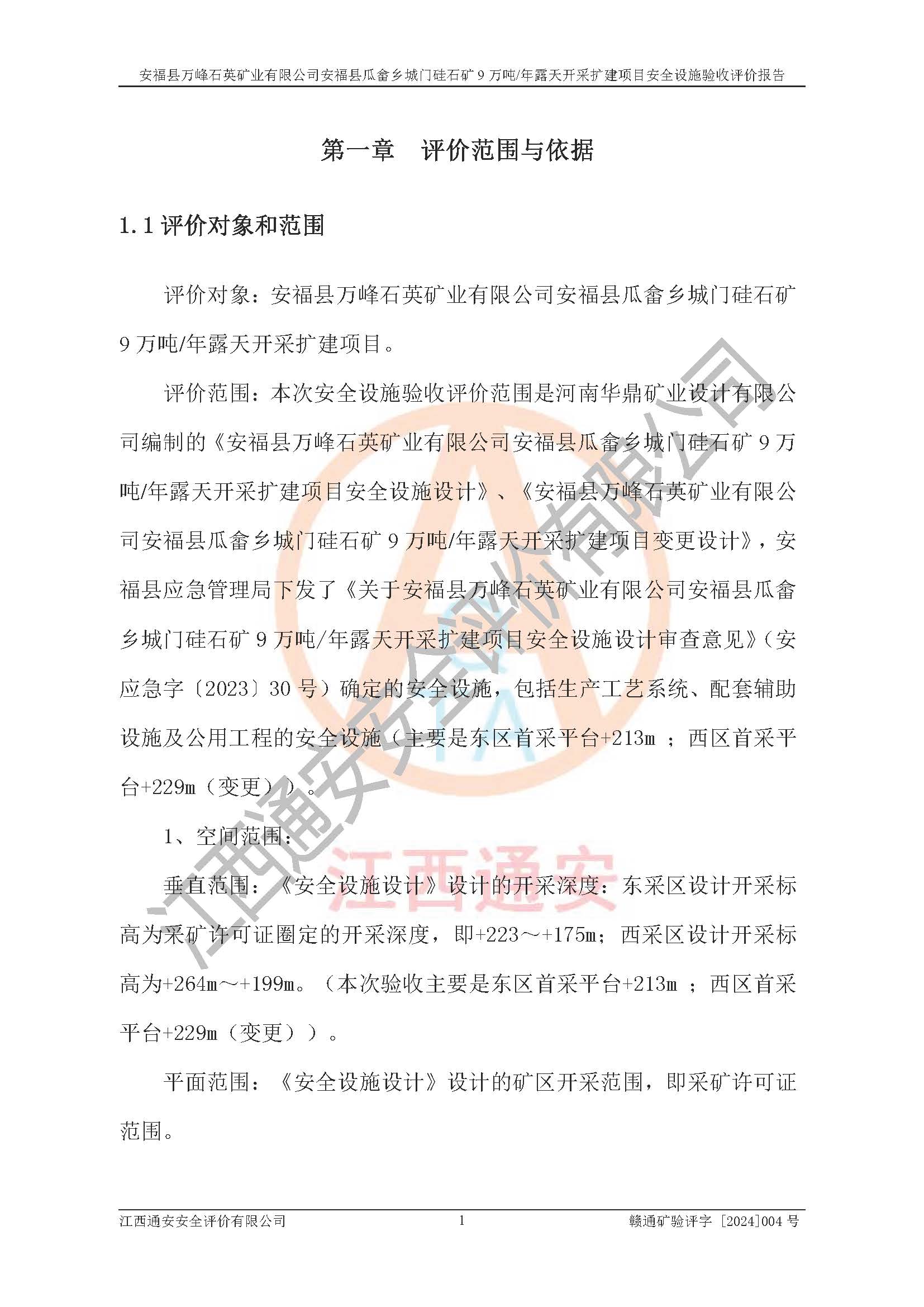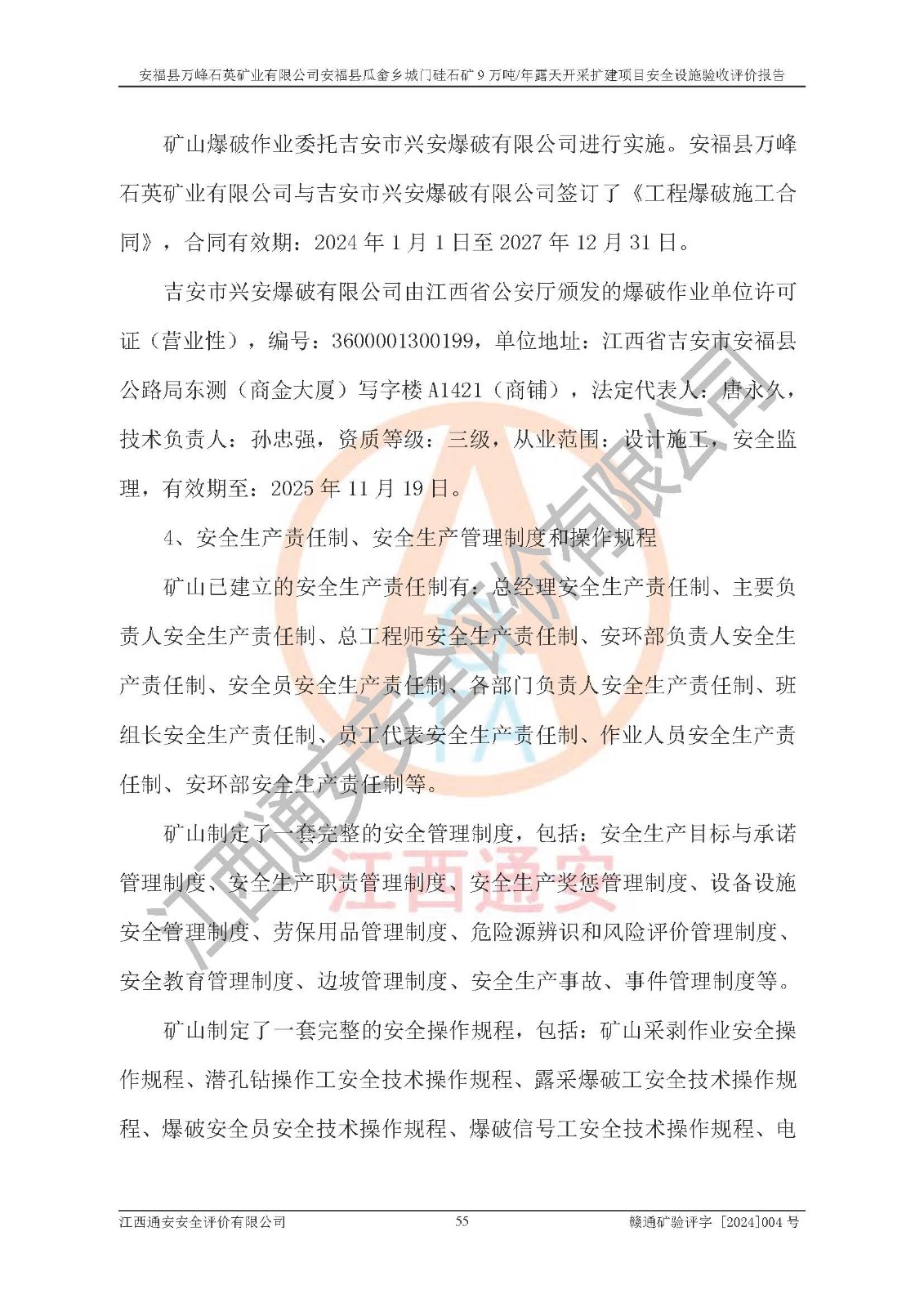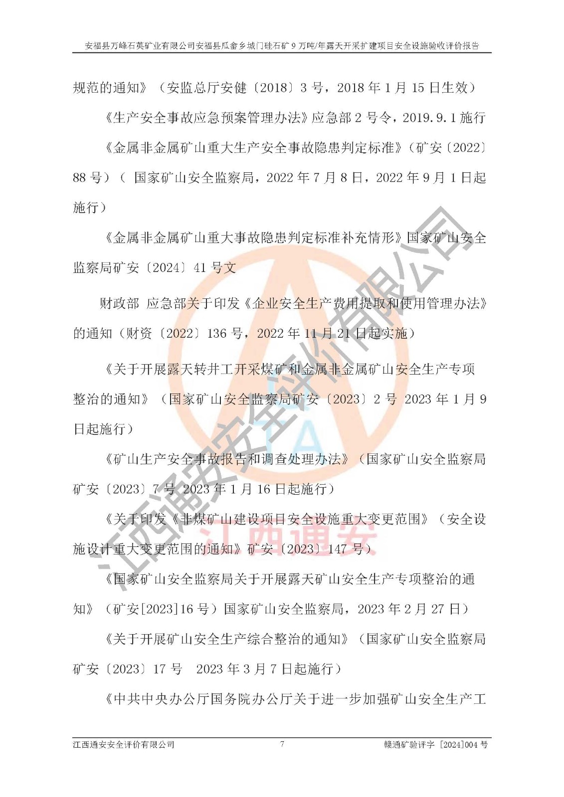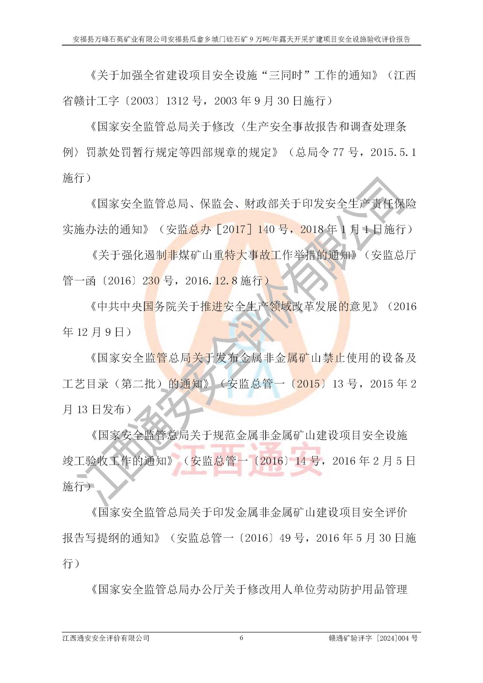 安??h萬(wàn)峰石英礦業(yè)有限公司安??h瓜畬鄉(xiāng)城門(mén)硅石礦礦區(qū)位于安??h城70°方向約15km處,行政區(qū)劃屬安福縣瓜畬鄉(xiāng)管轄。礦區(qū)位置地理坐標(biāo):東經(jīng)114°44′12"~114°44′29",北緯27°28′53"~27°28′57",礦區(qū)中心地理坐標(biāo):東經(jīng)114°44′20",北緯27°28′55"。礦區(qū)有約15km簡(jiǎn)易公路經(jīng)瓜畬鄉(xiāng)**所在地,與安?!掠喙废嘟?,交通方便。 安??h瓜畬鄉(xiāng)城門(mén)硅石礦于2016年3月8日取得采礦許可證,證號(hào)C3608002009027220004917,生產(chǎn)規(guī)模1萬(wàn)噸/年,礦區(qū)面積:0.0646km2。 因礦山生產(chǎn)規(guī)模滿足不了市場(chǎng)要求,加上礦區(qū)有些地征用比較困難,企業(yè)向吉安市自然資源局申請(qǐng)擴(kuò)大生產(chǎn)規(guī)模,并將礦區(qū)范圍進(jìn)行了縮小。 2019年6月8日取得了吉安市自然資源局換發(fā)的采礦許可證,證號(hào)C3608002009027220004917,生產(chǎn)規(guī)模9萬(wàn)噸/年,礦區(qū)面積為0.029km2。**期自2019年6月8日至2027年6月8日。由于新的采礦證擴(kuò)大了生產(chǎn)規(guī)模,且改變了礦區(qū)范圍,該項(xiàng)目屬于擴(kuò)建項(xiàng)目。 吉安市富林礦山技術(shù)服務(wù)有限公司于2019年9月編制了《安??h瓜畬鄉(xiāng)城門(mén)玻璃用石英巖礦資源儲(chǔ)量核實(shí)報(bào)告》,吉安市富林礦山技術(shù)服務(wù)有限公司于2020年4月編制了《安??h瓜畬鄉(xiāng)城門(mén)玻璃用石英巖礦礦產(chǎn)資源開(kāi)發(fā)利用、地質(zhì)環(huán)境恢復(fù)治理與土地復(fù)墾方案》,貴州匯和安全評(píng)價(jià)有限公司于2023年4月編制了《安??h萬(wàn)峰石英礦業(yè)有限公司安??h瓜畬鄉(xiāng)城門(mén)硅石礦9萬(wàn)噸/年露天開(kāi)采擴(kuò)建項(xiàng)目安全預(yù)評(píng)價(jià)報(bào)告》,河南華鼎礦業(yè)設(shè)計(jì)有限公司于2023年6月編制了《安??h萬(wàn)峰石英礦業(yè)有限公司安??h瓜畬鄉(xiāng)城門(mén)硅石礦9萬(wàn)噸/年露天開(kāi)采擴(kuò)建項(xiàng)目初步設(shè)計(jì)》和《安??h萬(wàn)峰石英礦業(yè)有限公司安福縣瓜畬鄉(xiāng)城門(mén)硅石礦9萬(wàn)噸/年露天開(kāi)采擴(kuò)建項(xiàng)目安全設(shè)施設(shè)計(jì)》;2023年7月3日安??h應(yīng)急管理局下發(fā)了《關(guān)于安福縣萬(wàn)峰石英礦業(yè)有限公司安??h瓜畬鄉(xiāng)城門(mén)硅石礦9萬(wàn)噸/年露天開(kāi)采擴(kuò)建項(xiàng)目安全設(shè)施設(shè)計(jì)審查意見(jiàn)》(安應(yīng)急字〔2023〕30號(hào))。 2023年7月安??h萬(wàn)峰石英礦業(yè)有限公司根據(jù)《中華人民共和國(guó)安全生產(chǎn)法》、《安全生產(chǎn)許可證條例》等有關(guān)法律、法規(guī)、部門(mén)規(guī)章的規(guī)定,嚴(yán)格按照《安全設(shè)施設(shè)計(jì)》進(jìn)行基建,該礦山分東、西兩個(gè)采區(qū),西采區(qū)設(shè)計(jì)+259m平臺(tái)為采剝平臺(tái)、+249m平臺(tái)為鏟裝平臺(tái),開(kāi)拓運(yùn)輸?shù)缆分?249m平臺(tái),在基建過(guò)程中,剝離表土?xí)r因表土層發(fā)生變化,+259m采剝平臺(tái)無(wú)硅石資源可采,因此首采平臺(tái)及其鏟裝平臺(tái)、開(kāi)拓運(yùn)輸?shù)缆?*進(jìn)行變更。 2024年4月礦山委托原設(shè)計(jì)單位河南華鼎礦業(yè)設(shè)計(jì)有限公司編制了《安??h萬(wàn)峰石英礦業(yè)有限公司安??h瓜畬鄉(xiāng)城門(mén)硅石礦9萬(wàn)噸/年露天開(kāi)采擴(kuò)建項(xiàng)目變更設(shè)計(jì)》,根據(jù)礦山西采區(qū)+259m、+249m、+239m平臺(tái)均無(wú)硅石資源的實(shí)際情況,對(duì)設(shè)計(jì)的西采區(qū)+259m平臺(tái)為采剝平臺(tái)、+249m平臺(tái)為鏟裝平臺(tái),開(kāi)拓運(yùn)輸?shù)缆分?249m平臺(tái)進(jìn)行變更,將+259m平臺(tái)、+249m平臺(tái)變更為安全平臺(tái),+239m平臺(tái)仍為清掃平臺(tái),首采平臺(tái)變更為+229m平臺(tái)、鏟裝平臺(tái)變更為+219m平臺(tái),開(kāi)拓運(yùn)輸?shù)缆分?219m平臺(tái)、簡(jiǎn)易道路至+229m平臺(tái);東采區(qū)安全設(shè)施設(shè)計(jì)不變,根據(jù)《**礦山監(jiān)察局關(guān)于印發(fā)非煤礦山建設(shè)項(xiàng)目安全設(shè)施重大變更范圍的通知》之規(guī)定,上述變更不屬于重大變更。 安??h萬(wàn)峰石英礦業(yè)有限公司安??h瓜畬鄉(xiāng)城門(mén)硅石礦9萬(wàn)噸/年露天開(kāi)采擴(kuò)建項(xiàng)目基建已完成,本次安全設(shè)施驗(yàn)收評(píng)價(jià)未涉及凹陷露天開(kāi)采。 |