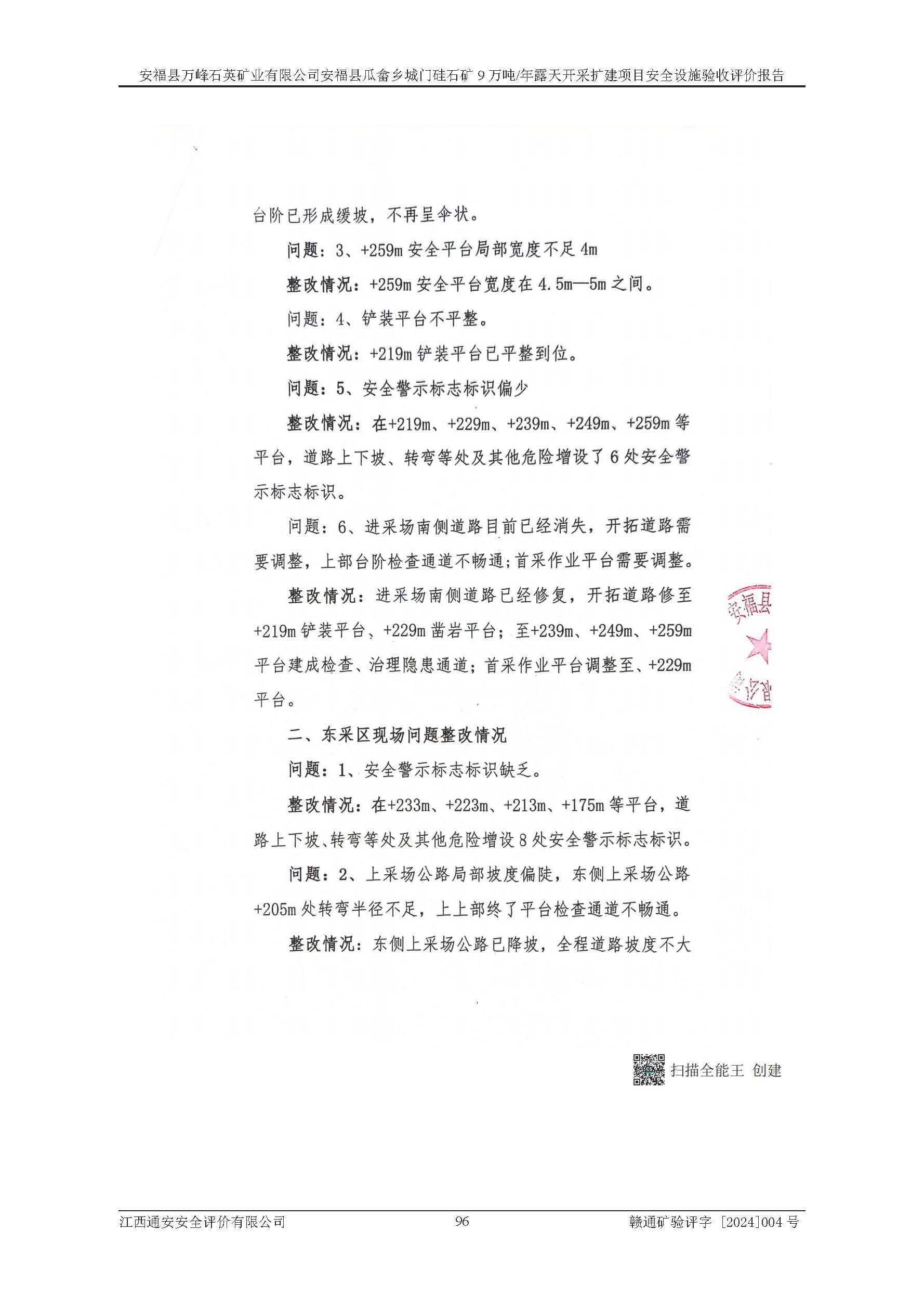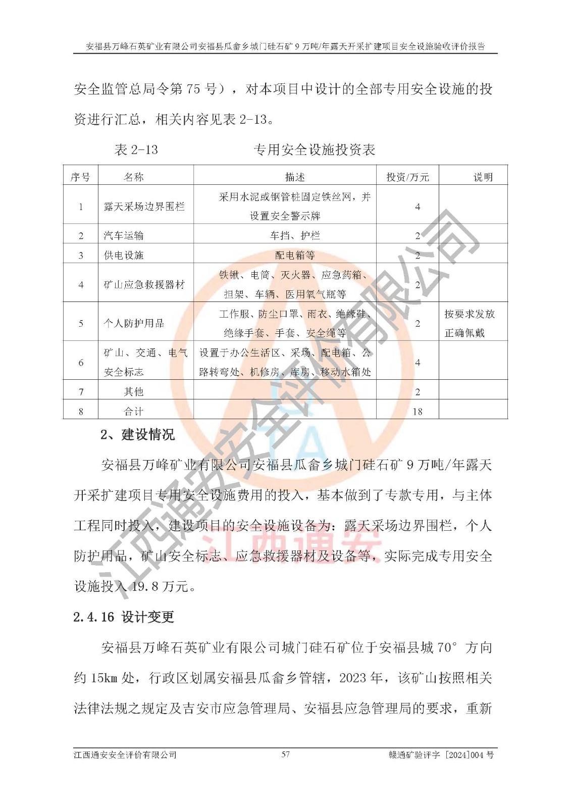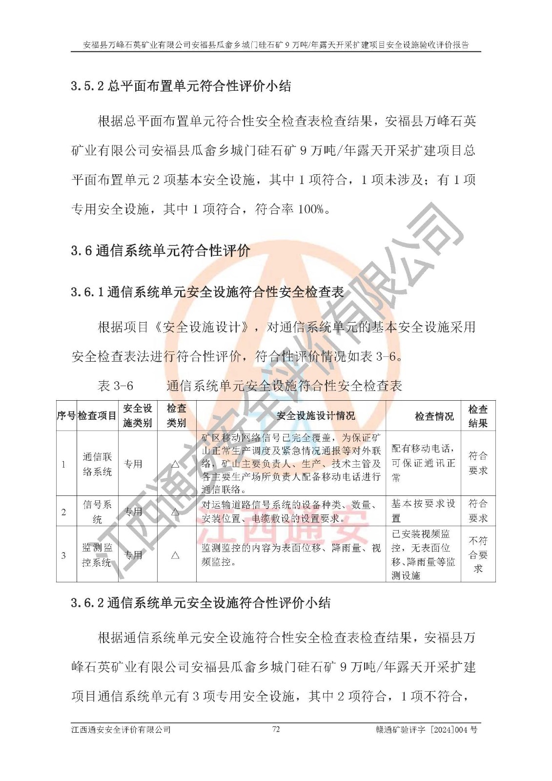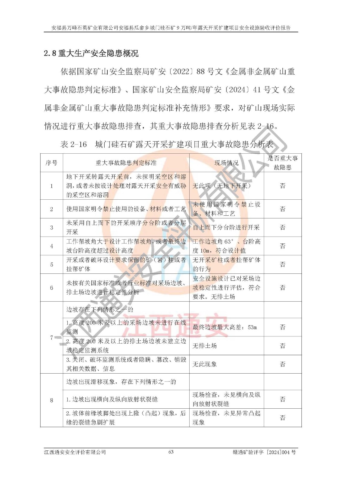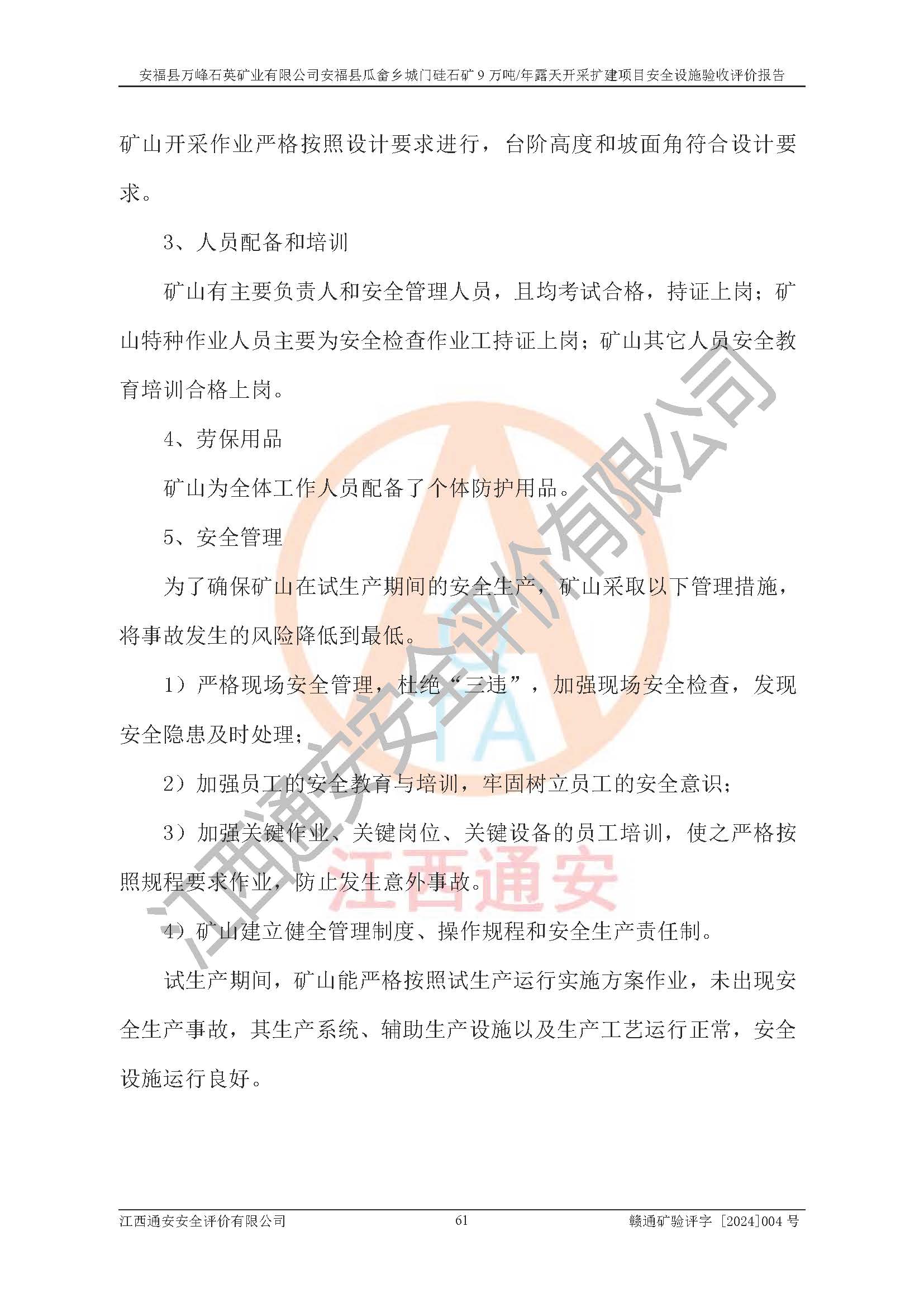 安??h萬(wàn)峰石英礦業(yè)有限公司安??h瓜畬鄉(xiāng)城門(mén)硅石礦礦區(qū)位于安??h城70°方向約15km處,行政區(qū)劃屬安福縣瓜畬鄉(xiāng)管轄。礦區(qū)位置地理坐標(biāo):東經(jīng)114°44′12"~114°44′29",北緯27°28′53"~27°28′57",礦區(qū)中心地理坐標(biāo):東經(jīng)114°44′20",北緯27°28′55"。礦區(qū)有約15km簡(jiǎn)易公路經(jīng)瓜畬鄉(xiāng)**所在地,與安?!掠喙废嘟?,交通方便。 安??h瓜畬鄉(xiāng)城門(mén)硅石礦于2016年3月8日取得采礦許可證,證號(hào)C3608002009027220004917,生產(chǎn)規(guī)模1萬(wàn)噸/年,礦區(qū)面積:0.0646km2。 因礦山生產(chǎn)規(guī)模滿足不了市場(chǎng)要求,加上礦區(qū)有些地征用比較困難,企業(yè)向吉安市自然資源局申請(qǐng)擴(kuò)大生產(chǎn)規(guī)模,并將礦區(qū)范圍進(jìn)行了縮小。 2019年6月8日取得了吉安市自然資源局換發(fā)的采礦許可證,證號(hào)C3608002009027220004917,生產(chǎn)規(guī)模9萬(wàn)噸/年,礦區(qū)面積為0.029km2。**期自2019年6月8日至2027年6月8日。由于新的采礦證擴(kuò)大了生產(chǎn)規(guī)模,且改變了礦區(qū)范圍,該項(xiàng)目屬于擴(kuò)建項(xiàng)目。 吉安市富林礦山技術(shù)服務(wù)有限公司于2019年9月編制了《安??h瓜畬鄉(xiāng)城門(mén)玻璃用石英巖礦資源儲(chǔ)量核實(shí)報(bào)告》,吉安市富林礦山技術(shù)服務(wù)有限公司于2020年4月編制了《安??h瓜畬鄉(xiāng)城門(mén)玻璃用石英巖礦礦產(chǎn)資源開(kāi)發(fā)利用、地質(zhì)環(huán)境恢復(fù)治理與土地復(fù)墾方案》,貴州匯和安全評(píng)價(jià)有限公司于2023年4月編制了《安??h萬(wàn)峰石英礦業(yè)有限公司安??h瓜畬鄉(xiāng)城門(mén)硅石礦9萬(wàn)噸/年露天開(kāi)采擴(kuò)建項(xiàng)目安全預(yù)評(píng)價(jià)報(bào)告》,河南華鼎礦業(yè)設(shè)計(jì)有限公司于2023年6月編制了《安??h萬(wàn)峰石英礦業(yè)有限公司安??h瓜畬鄉(xiāng)城門(mén)硅石礦9萬(wàn)噸/年露天開(kāi)采擴(kuò)建項(xiàng)目初步設(shè)計(jì)》和《安??h萬(wàn)峰石英礦業(yè)有限公司安福縣瓜畬鄉(xiāng)城門(mén)硅石礦9萬(wàn)噸/年露天開(kāi)采擴(kuò)建項(xiàng)目安全設(shè)施設(shè)計(jì)》;2023年7月3日安??h應(yīng)急管理局下發(fā)了《關(guān)于安福縣萬(wàn)峰石英礦業(yè)有限公司安??h瓜畬鄉(xiāng)城門(mén)硅石礦9萬(wàn)噸/年露天開(kāi)采擴(kuò)建項(xiàng)目安全設(shè)施設(shè)計(jì)審查意見(jiàn)》(安應(yīng)急字〔2023〕30號(hào))。 2023年7月安??h萬(wàn)峰石英礦業(yè)有限公司根據(jù)《中華人民共和國(guó)安全生產(chǎn)法》、《安全生產(chǎn)許可證條例》等有關(guān)法律、法規(guī)、部門(mén)規(guī)章的規(guī)定,嚴(yán)格按照《安全設(shè)施設(shè)計(jì)》進(jìn)行基建,該礦山分東、西兩個(gè)采區(qū),西采區(qū)設(shè)計(jì)+259m平臺(tái)為采剝平臺(tái)、+249m平臺(tái)為鏟裝平臺(tái),開(kāi)拓運(yùn)輸?shù)缆分?249m平臺(tái),在基建過(guò)程中,剝離表土?xí)r因表土層發(fā)生變化,+259m采剝平臺(tái)無(wú)硅石資源可采,因此首采平臺(tái)及其鏟裝平臺(tái)、開(kāi)拓運(yùn)輸?shù)缆?*進(jìn)行變更。 2024年4月礦山委托原設(shè)計(jì)單位河南華鼎礦業(yè)設(shè)計(jì)有限公司編制了《安??h萬(wàn)峰石英礦業(yè)有限公司安??h瓜畬鄉(xiāng)城門(mén)硅石礦9萬(wàn)噸/年露天開(kāi)采擴(kuò)建項(xiàng)目變更設(shè)計(jì)》,根據(jù)礦山西采區(qū)+259m、+249m、+239m平臺(tái)均無(wú)硅石資源的實(shí)際情況,對(duì)設(shè)計(jì)的西采區(qū)+259m平臺(tái)為采剝平臺(tái)、+249m平臺(tái)為鏟裝平臺(tái),開(kāi)拓運(yùn)輸?shù)缆分?249m平臺(tái)進(jìn)行變更,將+259m平臺(tái)、+249m平臺(tái)變更為安全平臺(tái),+239m平臺(tái)仍為清掃平臺(tái),首采平臺(tái)變更為+229m平臺(tái)、鏟裝平臺(tái)變更為+219m平臺(tái),開(kāi)拓運(yùn)輸?shù)缆分?219m平臺(tái)、簡(jiǎn)易道路至+229m平臺(tái);東采區(qū)安全設(shè)施設(shè)計(jì)不變,根據(jù)《**礦山監(jiān)察局關(guān)于印發(fā)非煤礦山建設(shè)項(xiàng)目安全設(shè)施重大變更范圍的通知》之規(guī)定,上述變更不屬于重大變更。 安??h萬(wàn)峰石英礦業(yè)有限公司安??h瓜畬鄉(xiāng)城門(mén)硅石礦9萬(wàn)噸/年露天開(kāi)采擴(kuò)建項(xiàng)目基建已完成,本次安全設(shè)施驗(yàn)收評(píng)價(jià)未涉及凹陷露天開(kāi)采。 |