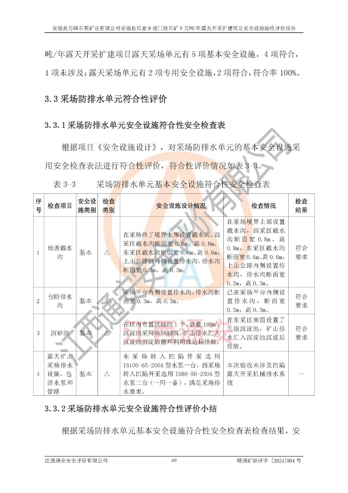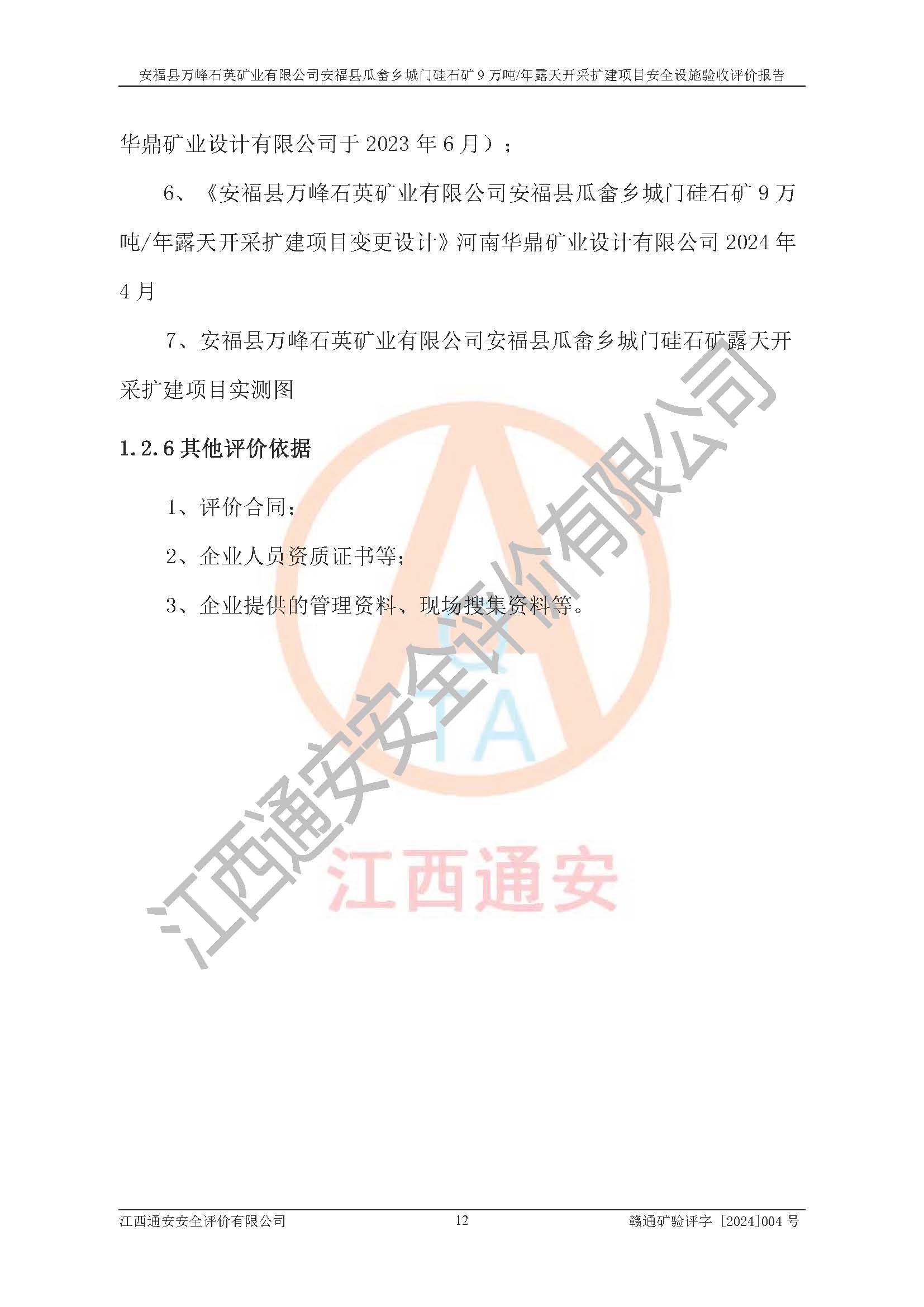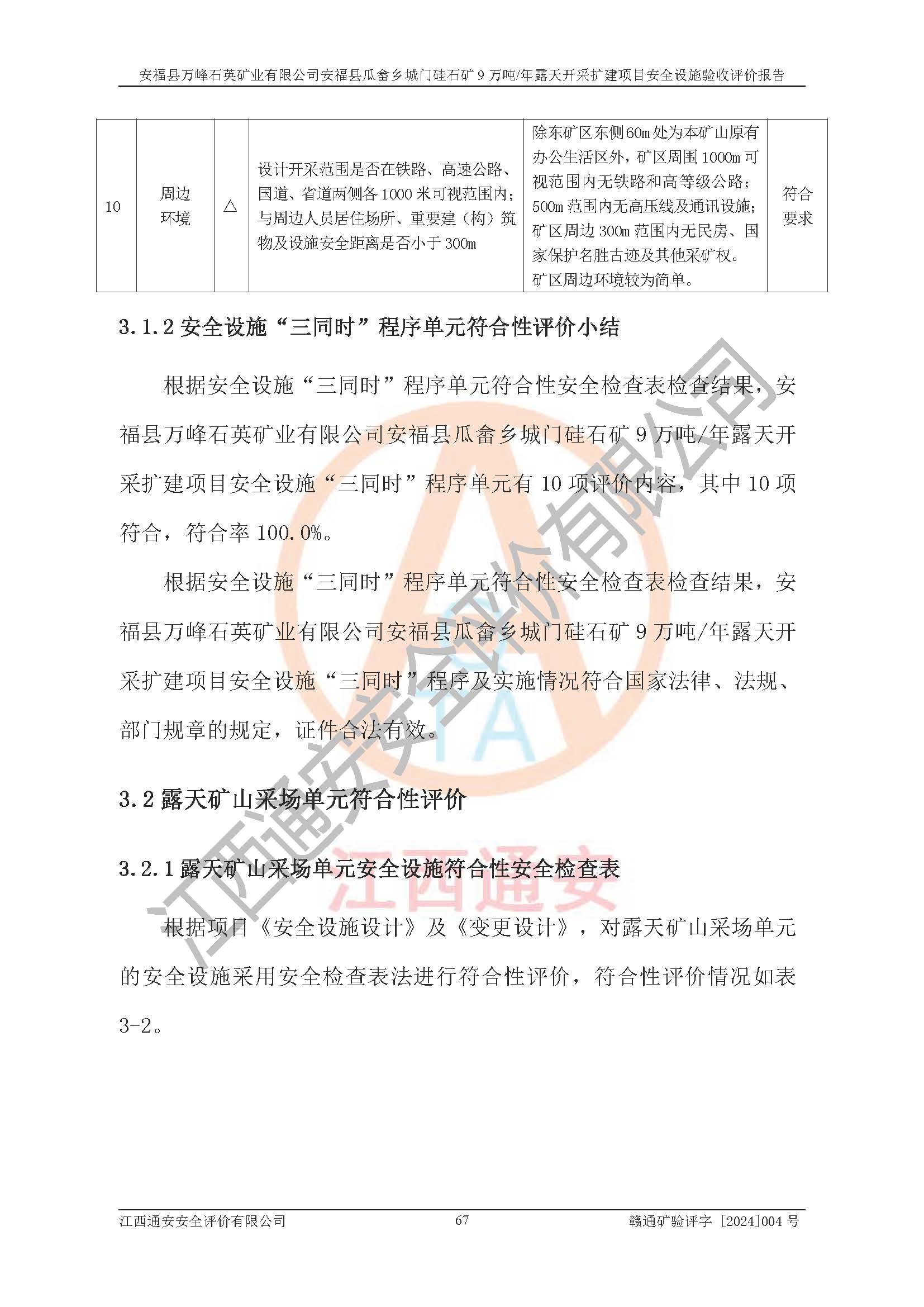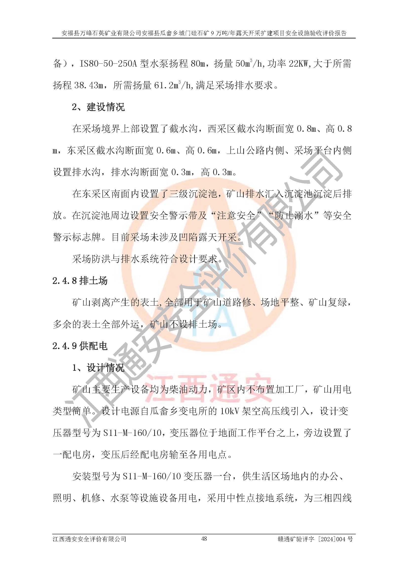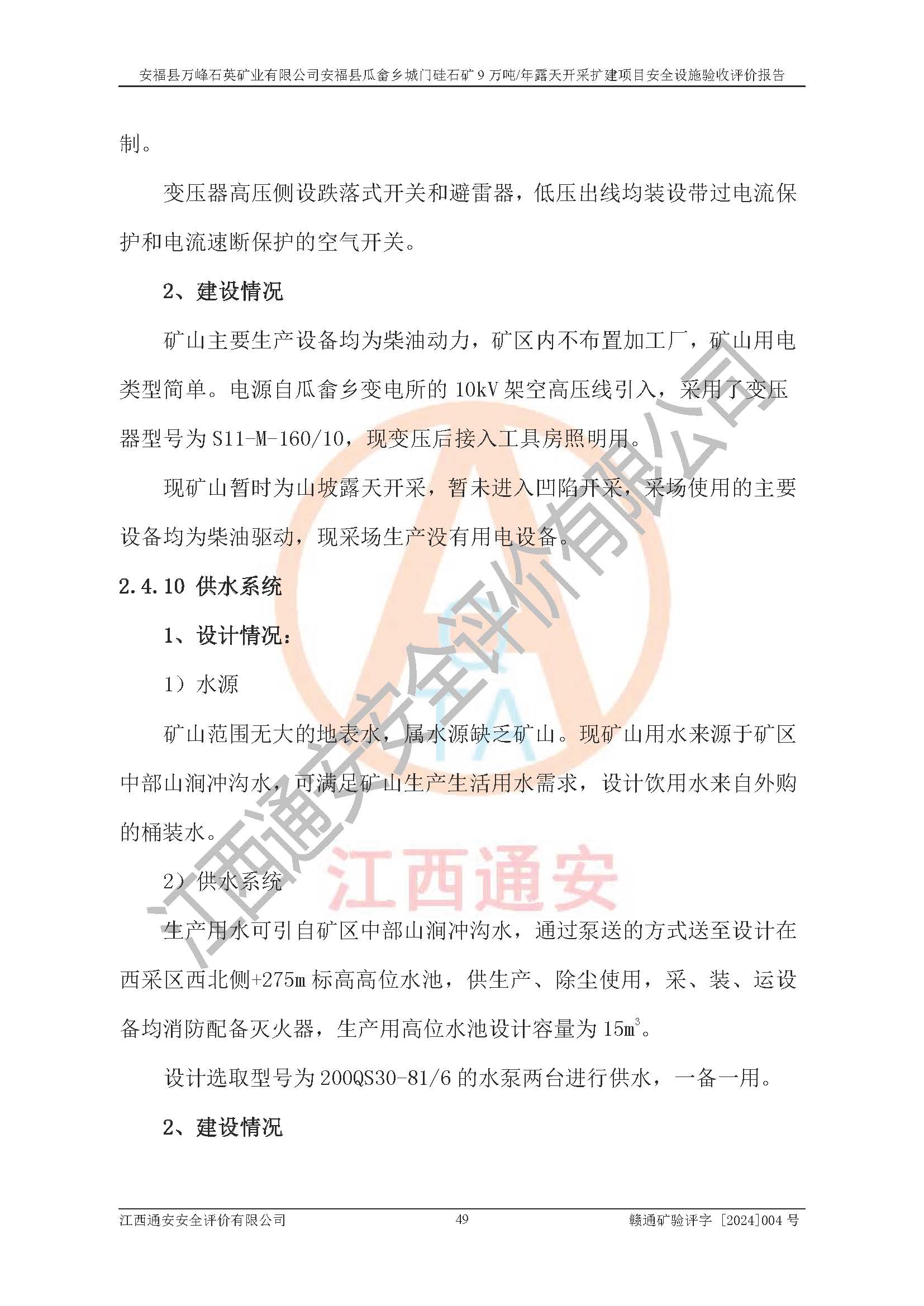 安??h萬(wàn)峰石英礦業(yè)有限公司安??h瓜畬鄉(xiāng)城門(mén)硅石礦礦區(qū)位于安??h城70°方向約15km處,行政區(qū)劃屬安福縣瓜畬鄉(xiāng)管轄。礦區(qū)位置地理坐標(biāo):東經(jīng)114°44′12"~114°44′29",北緯27°28′53"~27°28′57",礦區(qū)中心地理坐標(biāo):東經(jīng)114°44′20",北緯27°28′55"。礦區(qū)有約15km簡(jiǎn)易公路經(jīng)瓜畬鄉(xiāng)**所在地,與安?!掠喙废嘟?,交通方便。 安??h瓜畬鄉(xiāng)城門(mén)硅石礦于2016年3月8日取得采礦許可證,證號(hào)C3608002009027220004917,生產(chǎn)規(guī)模1萬(wàn)噸/年,礦區(qū)面積:0.0646km2。 因礦山生產(chǎn)規(guī)模滿足不了市場(chǎng)要求,加上礦區(qū)有些地征用比較困難,企業(yè)向吉安市自然資源局申請(qǐng)擴(kuò)大生產(chǎn)規(guī)模,并將礦區(qū)范圍進(jìn)行了縮小。 2019年6月8日取得了吉安市自然資源局換發(fā)的采礦許可證,證號(hào)C3608002009027220004917,生產(chǎn)規(guī)模9萬(wàn)噸/年,礦區(qū)面積為0.029km2。**期自2019年6月8日至2027年6月8日。由于新的采礦證擴(kuò)大了生產(chǎn)規(guī)模,且改變了礦區(qū)范圍,該項(xiàng)目屬于擴(kuò)建項(xiàng)目。 吉安市富林礦山技術(shù)服務(wù)有限公司于2019年9月編制了《安??h瓜畬鄉(xiāng)城門(mén)玻璃用石英巖礦資源儲(chǔ)量核實(shí)報(bào)告》,吉安市富林礦山技術(shù)服務(wù)有限公司于2020年4月編制了《安??h瓜畬鄉(xiāng)城門(mén)玻璃用石英巖礦礦產(chǎn)資源開(kāi)發(fā)利用、地質(zhì)環(huán)境恢復(fù)治理與土地復(fù)墾方案》,貴州匯和安全評(píng)價(jià)有限公司于2023年4月編制了《安??h萬(wàn)峰石英礦業(yè)有限公司安??h瓜畬鄉(xiāng)城門(mén)硅石礦9萬(wàn)噸/年露天開(kāi)采擴(kuò)建項(xiàng)目安全預(yù)評(píng)價(jià)報(bào)告》,河南華鼎礦業(yè)設(shè)計(jì)有限公司于2023年6月編制了《安??h萬(wàn)峰石英礦業(yè)有限公司安??h瓜畬鄉(xiāng)城門(mén)硅石礦9萬(wàn)噸/年露天開(kāi)采擴(kuò)建項(xiàng)目初步設(shè)計(jì)》和《安??h萬(wàn)峰石英礦業(yè)有限公司安福縣瓜畬鄉(xiāng)城門(mén)硅石礦9萬(wàn)噸/年露天開(kāi)采擴(kuò)建項(xiàng)目安全設(shè)施設(shè)計(jì)》;2023年7月3日安??h應(yīng)急管理局下發(fā)了《關(guān)于安福縣萬(wàn)峰石英礦業(yè)有限公司安??h瓜畬鄉(xiāng)城門(mén)硅石礦9萬(wàn)噸/年露天開(kāi)采擴(kuò)建項(xiàng)目安全設(shè)施設(shè)計(jì)審查意見(jiàn)》(安應(yīng)急字〔2023〕30號(hào))。 2023年7月安??h萬(wàn)峰石英礦業(yè)有限公司根據(jù)《中華人民共和國(guó)安全生產(chǎn)法》、《安全生產(chǎn)許可證條例》等有關(guān)法律、法規(guī)、部門(mén)規(guī)章的規(guī)定,嚴(yán)格按照《安全設(shè)施設(shè)計(jì)》進(jìn)行基建,該礦山分東、西兩個(gè)采區(qū),西采區(qū)設(shè)計(jì)+259m平臺(tái)為采剝平臺(tái)、+249m平臺(tái)為鏟裝平臺(tái),開(kāi)拓運(yùn)輸?shù)缆分?249m平臺(tái),在基建過(guò)程中,剝離表土?xí)r因表土層發(fā)生變化,+259m采剝平臺(tái)無(wú)硅石資源可采,因此首采平臺(tái)及其鏟裝平臺(tái)、開(kāi)拓運(yùn)輸?shù)缆?*進(jìn)行變更。 2024年4月礦山委托原設(shè)計(jì)單位河南華鼎礦業(yè)設(shè)計(jì)有限公司編制了《安??h萬(wàn)峰石英礦業(yè)有限公司安??h瓜畬鄉(xiāng)城門(mén)硅石礦9萬(wàn)噸/年露天開(kāi)采擴(kuò)建項(xiàng)目變更設(shè)計(jì)》,根據(jù)礦山西采區(qū)+259m、+249m、+239m平臺(tái)均無(wú)硅石資源的實(shí)際情況,對(duì)設(shè)計(jì)的西采區(qū)+259m平臺(tái)為采剝平臺(tái)、+249m平臺(tái)為鏟裝平臺(tái),開(kāi)拓運(yùn)輸?shù)缆分?249m平臺(tái)進(jìn)行變更,將+259m平臺(tái)、+249m平臺(tái)變更為安全平臺(tái),+239m平臺(tái)仍為清掃平臺(tái),首采平臺(tái)變更為+229m平臺(tái)、鏟裝平臺(tái)變更為+219m平臺(tái),開(kāi)拓運(yùn)輸?shù)缆分?219m平臺(tái)、簡(jiǎn)易道路至+229m平臺(tái);東采區(qū)安全設(shè)施設(shè)計(jì)不變,根據(jù)《**礦山監(jiān)察局關(guān)于印發(fā)非煤礦山建設(shè)項(xiàng)目安全設(shè)施重大變更范圍的通知》之規(guī)定,上述變更不屬于重大變更。 安??h萬(wàn)峰石英礦業(yè)有限公司安??h瓜畬鄉(xiāng)城門(mén)硅石礦9萬(wàn)噸/年露天開(kāi)采擴(kuò)建項(xiàng)目基建已完成,本次安全設(shè)施驗(yàn)收評(píng)價(jià)未涉及凹陷露天開(kāi)采。 |