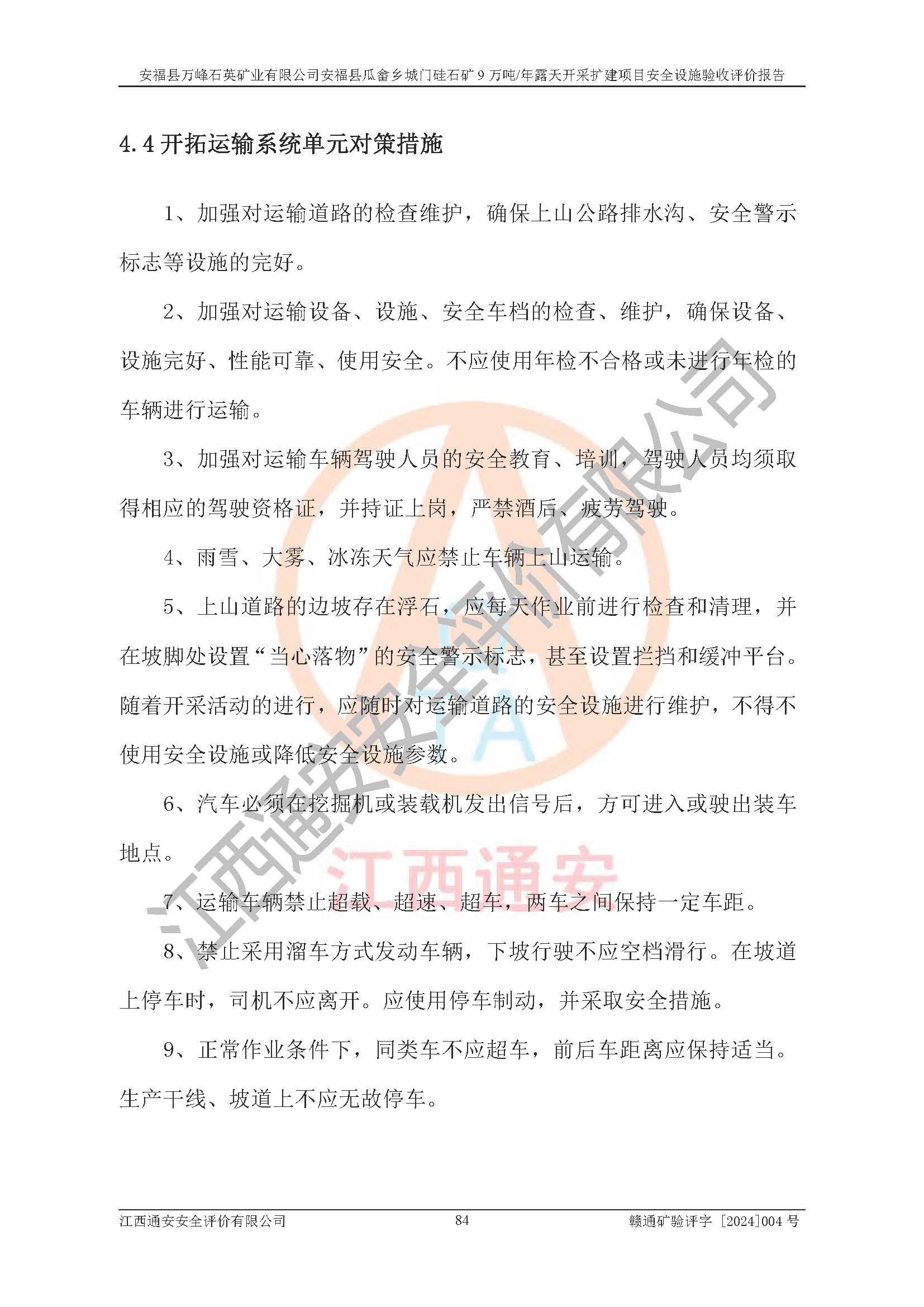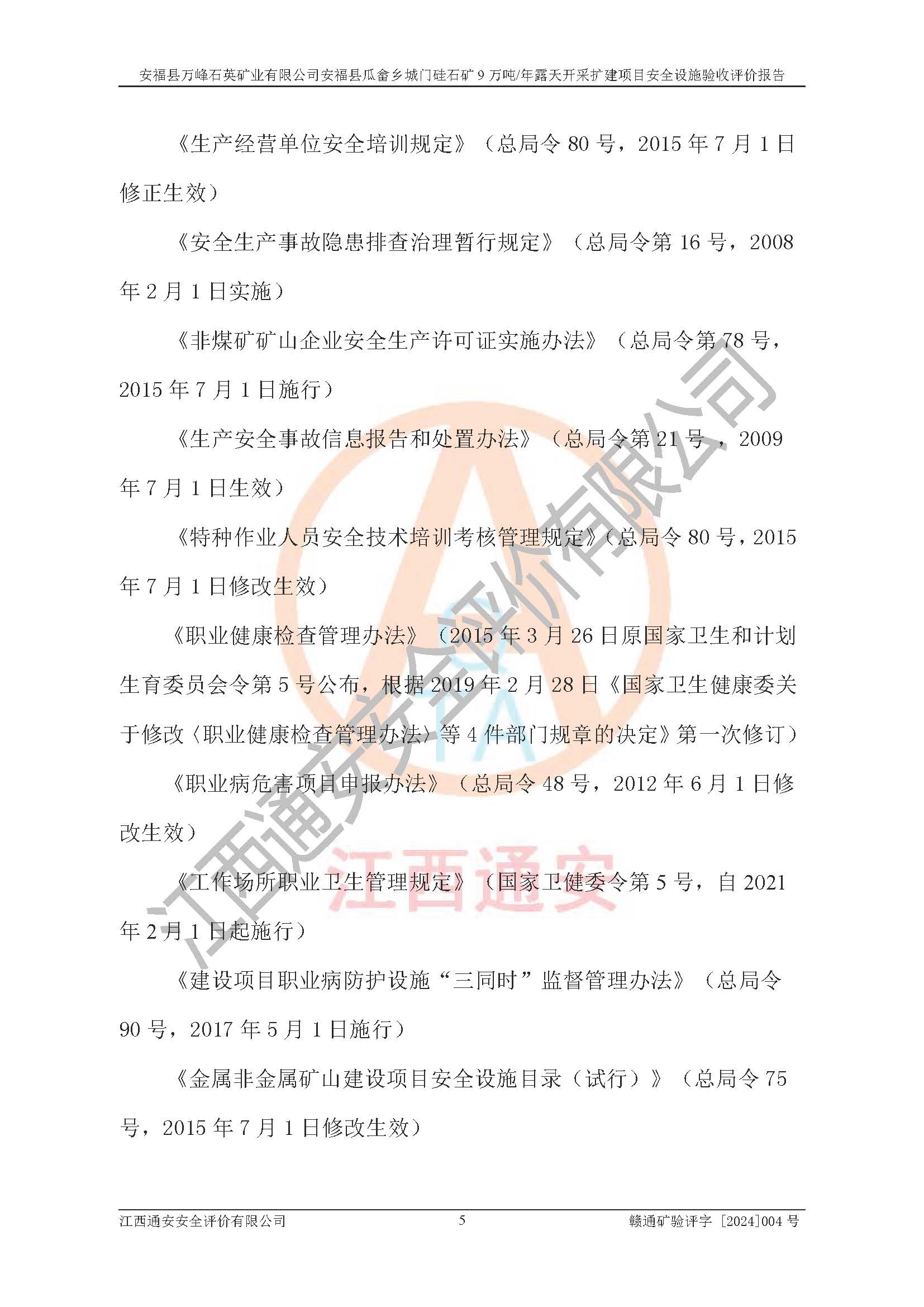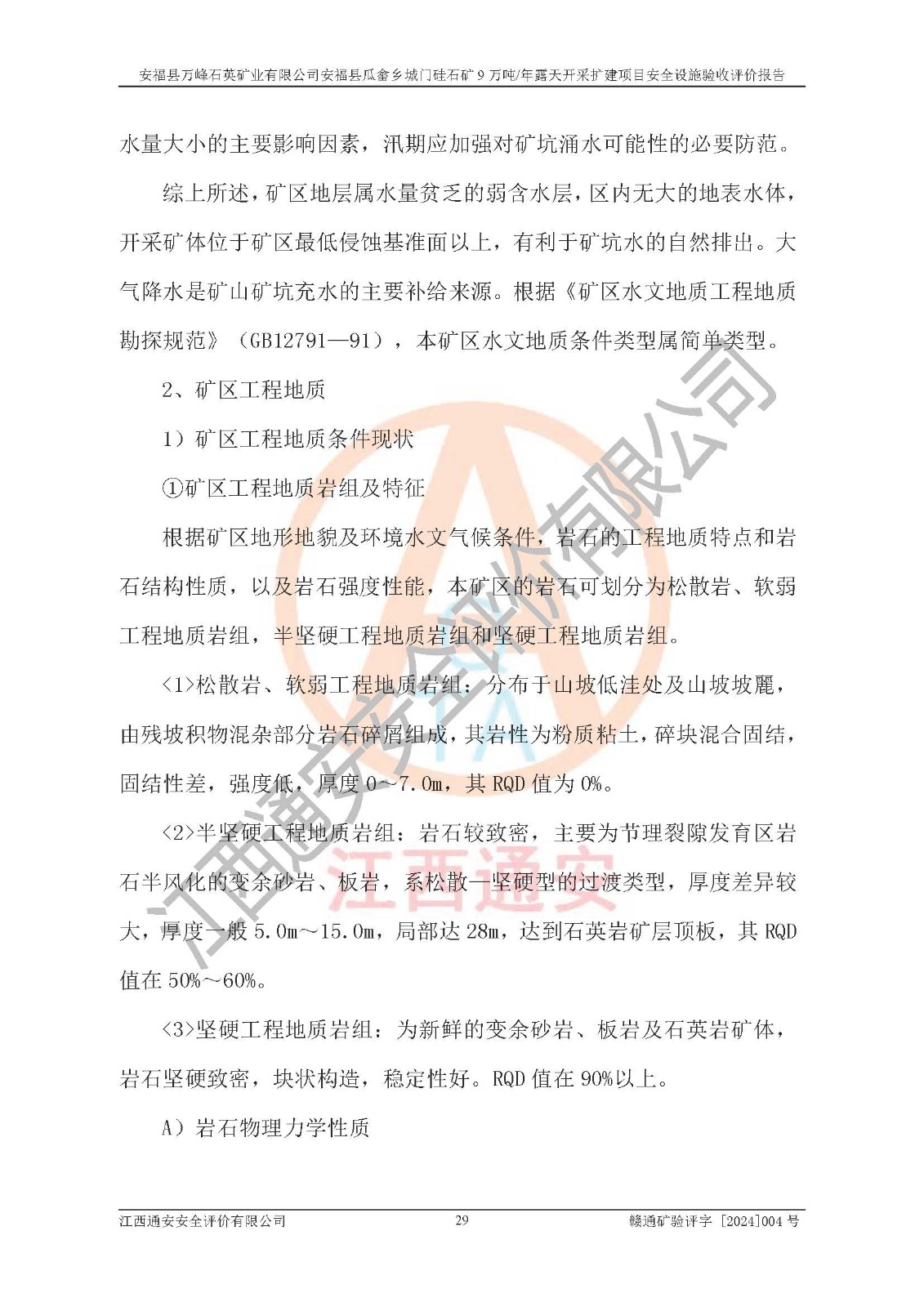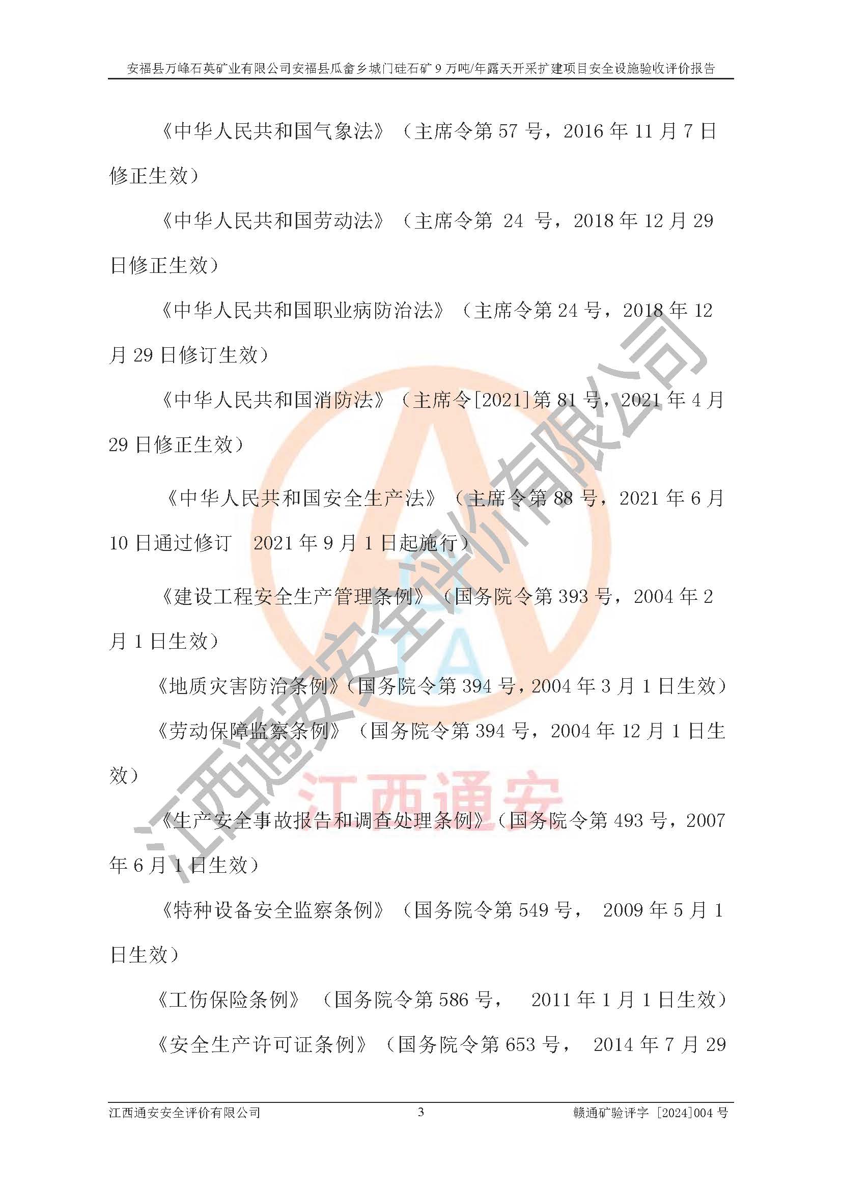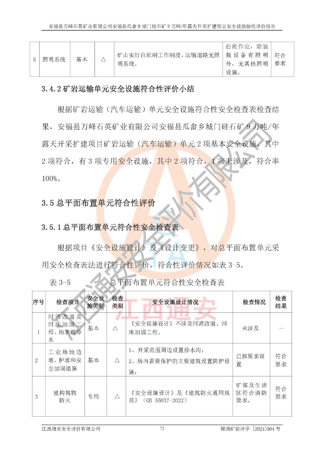 安??h萬(wàn)峰石英礦業(yè)有限公司安??h瓜畬鄉(xiāng)城門(mén)硅石礦礦區(qū)位于安??h城70°方向約15km處,行政區(qū)劃屬安福縣瓜畬鄉(xiāng)管轄。礦區(qū)位置地理坐標(biāo):東經(jīng)114°44′12"~114°44′29",北緯27°28′53"~27°28′57",礦區(qū)中心地理坐標(biāo):東經(jīng)114°44′20",北緯27°28′55"。礦區(qū)有約15km簡(jiǎn)易公路經(jīng)瓜畬鄉(xiāng)**所在地,與安?!掠喙废嘟?,交通方便。 安??h瓜畬鄉(xiāng)城門(mén)硅石礦于2016年3月8日取得采礦許可證,證號(hào)C3608002009027220004917,生產(chǎn)規(guī)模1萬(wàn)噸/年,礦區(qū)面積:0.0646km2。 因礦山生產(chǎn)規(guī)模滿足不了市場(chǎng)要求,加上礦區(qū)有些地征用比較困難,企業(yè)向吉安市自然資源局申請(qǐng)擴(kuò)大生產(chǎn)規(guī)模,并將礦區(qū)范圍進(jìn)行了縮小。 2019年6月8日取得了吉安市自然資源局換發(fā)的采礦許可證,證號(hào)C3608002009027220004917,生產(chǎn)規(guī)模9萬(wàn)噸/年,礦區(qū)面積為0.029km2。**期自2019年6月8日至2027年6月8日。由于新的采礦證擴(kuò)大了生產(chǎn)規(guī)模,且改變了礦區(qū)范圍,該項(xiàng)目屬于擴(kuò)建項(xiàng)目。 吉安市富林礦山技術(shù)服務(wù)有限公司于2019年9月編制了《安??h瓜畬鄉(xiāng)城門(mén)玻璃用石英巖礦資源儲(chǔ)量核實(shí)報(bào)告》,吉安市富林礦山技術(shù)服務(wù)有限公司于2020年4月編制了《安??h瓜畬鄉(xiāng)城門(mén)玻璃用石英巖礦礦產(chǎn)資源開(kāi)發(fā)利用、地質(zhì)環(huán)境恢復(fù)治理與土地復(fù)墾方案》,貴州匯和安全評(píng)價(jià)有限公司于2023年4月編制了《安??h萬(wàn)峰石英礦業(yè)有限公司安??h瓜畬鄉(xiāng)城門(mén)硅石礦9萬(wàn)噸/年露天開(kāi)采擴(kuò)建項(xiàng)目安全預(yù)評(píng)價(jià)報(bào)告》,河南華鼎礦業(yè)設(shè)計(jì)有限公司于2023年6月編制了《安??h萬(wàn)峰石英礦業(yè)有限公司安??h瓜畬鄉(xiāng)城門(mén)硅石礦9萬(wàn)噸/年露天開(kāi)采擴(kuò)建項(xiàng)目初步設(shè)計(jì)》和《安??h萬(wàn)峰石英礦業(yè)有限公司安福縣瓜畬鄉(xiāng)城門(mén)硅石礦9萬(wàn)噸/年露天開(kāi)采擴(kuò)建項(xiàng)目安全設(shè)施設(shè)計(jì)》;2023年7月3日安??h應(yīng)急管理局下發(fā)了《關(guān)于安福縣萬(wàn)峰石英礦業(yè)有限公司安??h瓜畬鄉(xiāng)城門(mén)硅石礦9萬(wàn)噸/年露天開(kāi)采擴(kuò)建項(xiàng)目安全設(shè)施設(shè)計(jì)審查意見(jiàn)》(安應(yīng)急字〔2023〕30號(hào))。 2023年7月安??h萬(wàn)峰石英礦業(yè)有限公司根據(jù)《中華人民共和國(guó)安全生產(chǎn)法》、《安全生產(chǎn)許可證條例》等有關(guān)法律、法規(guī)、部門(mén)規(guī)章的規(guī)定,嚴(yán)格按照《安全設(shè)施設(shè)計(jì)》進(jìn)行基建,該礦山分東、西兩個(gè)采區(qū),西采區(qū)設(shè)計(jì)+259m平臺(tái)為采剝平臺(tái)、+249m平臺(tái)為鏟裝平臺(tái),開(kāi)拓運(yùn)輸?shù)缆分?249m平臺(tái),在基建過(guò)程中,剝離表土?xí)r因表土層發(fā)生變化,+259m采剝平臺(tái)無(wú)硅石資源可采,因此首采平臺(tái)及其鏟裝平臺(tái)、開(kāi)拓運(yùn)輸?shù)缆?*進(jìn)行變更。 2024年4月礦山委托原設(shè)計(jì)單位河南華鼎礦業(yè)設(shè)計(jì)有限公司編制了《安??h萬(wàn)峰石英礦業(yè)有限公司安??h瓜畬鄉(xiāng)城門(mén)硅石礦9萬(wàn)噸/年露天開(kāi)采擴(kuò)建項(xiàng)目變更設(shè)計(jì)》,根據(jù)礦山西采區(qū)+259m、+249m、+239m平臺(tái)均無(wú)硅石資源的實(shí)際情況,對(duì)設(shè)計(jì)的西采區(qū)+259m平臺(tái)為采剝平臺(tái)、+249m平臺(tái)為鏟裝平臺(tái),開(kāi)拓運(yùn)輸?shù)缆分?249m平臺(tái)進(jìn)行變更,將+259m平臺(tái)、+249m平臺(tái)變更為安全平臺(tái),+239m平臺(tái)仍為清掃平臺(tái),首采平臺(tái)變更為+229m平臺(tái)、鏟裝平臺(tái)變更為+219m平臺(tái),開(kāi)拓運(yùn)輸?shù)缆分?219m平臺(tái)、簡(jiǎn)易道路至+229m平臺(tái);東采區(qū)安全設(shè)施設(shè)計(jì)不變,根據(jù)《**礦山監(jiān)察局關(guān)于印發(fā)非煤礦山建設(shè)項(xiàng)目安全設(shè)施重大變更范圍的通知》之規(guī)定,上述變更不屬于重大變更。 安??h萬(wàn)峰石英礦業(yè)有限公司安??h瓜畬鄉(xiāng)城門(mén)硅石礦9萬(wàn)噸/年露天開(kāi)采擴(kuò)建項(xiàng)目基建已完成,本次安全設(shè)施驗(yàn)收評(píng)價(jià)未涉及凹陷露天開(kāi)采。 |