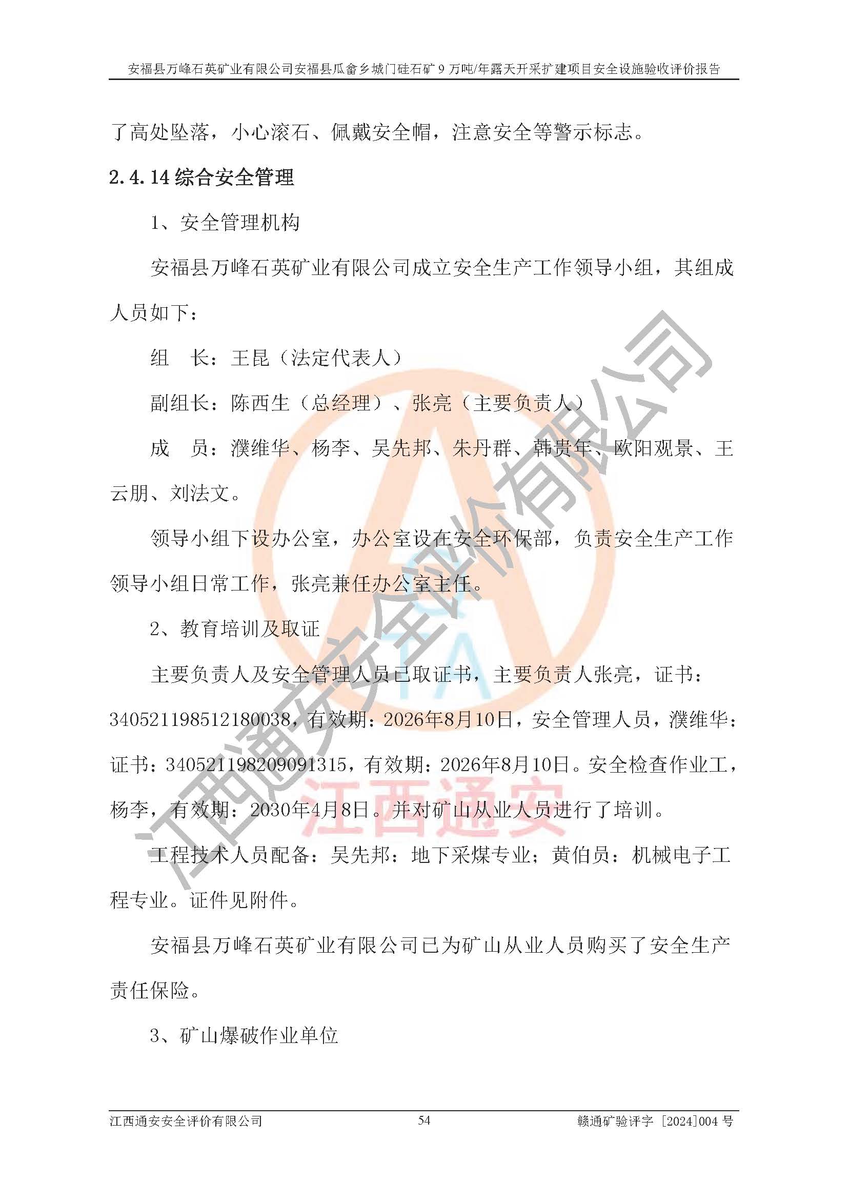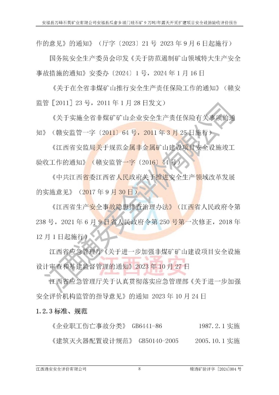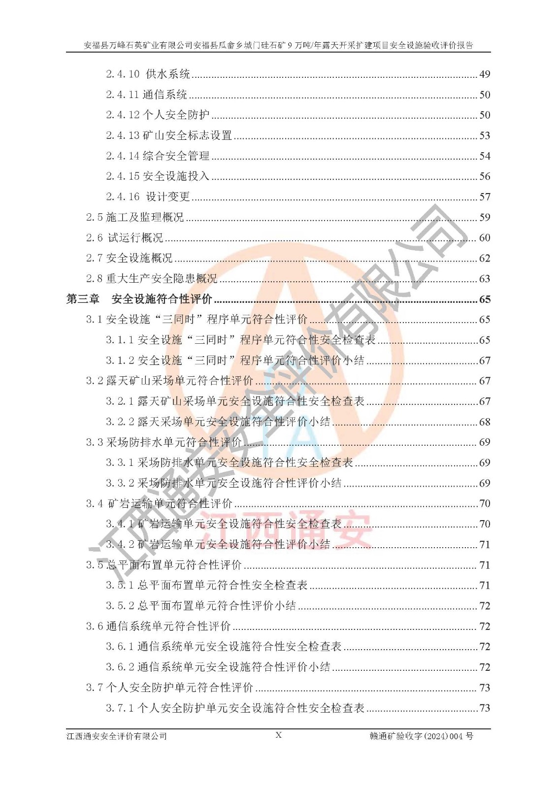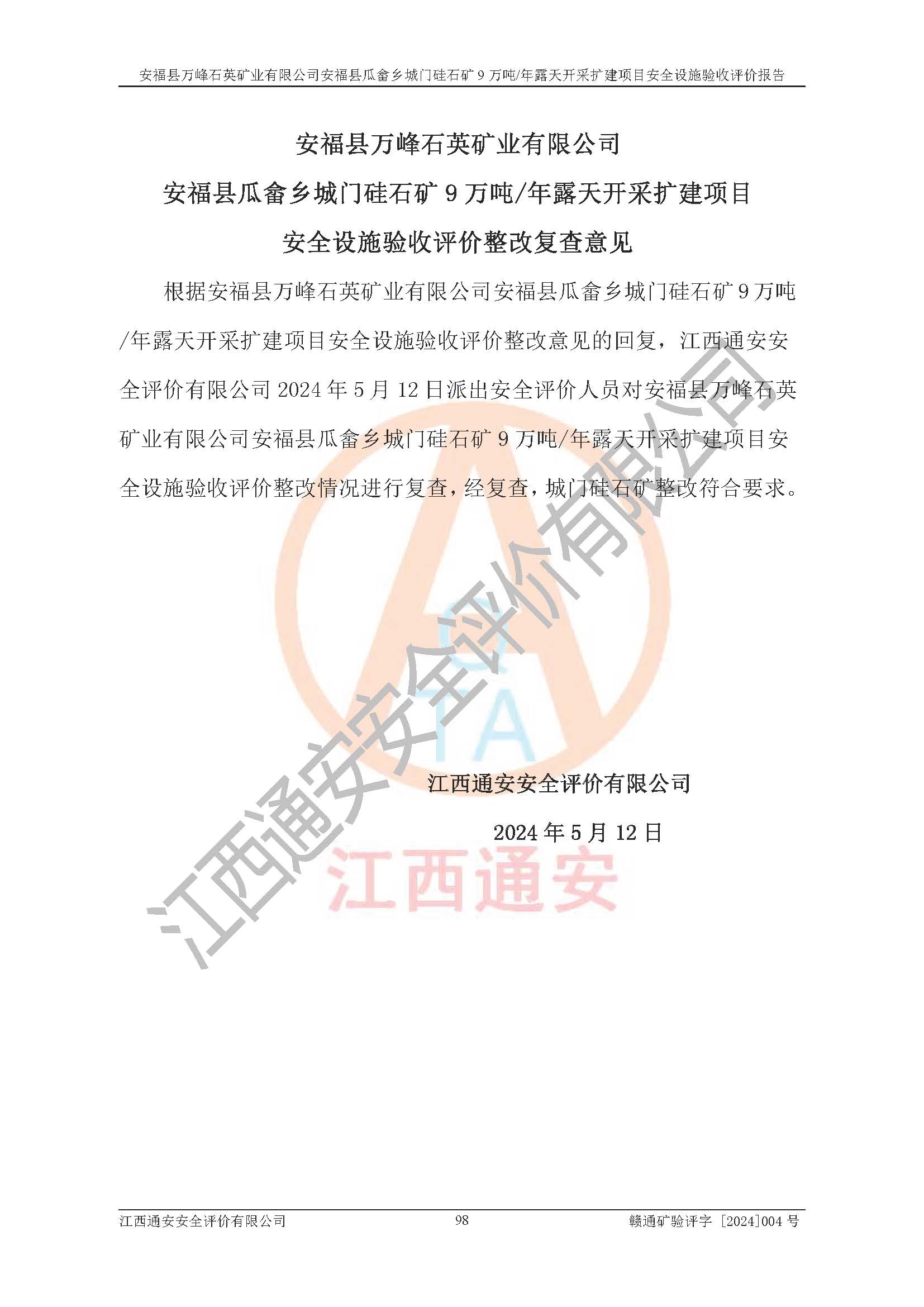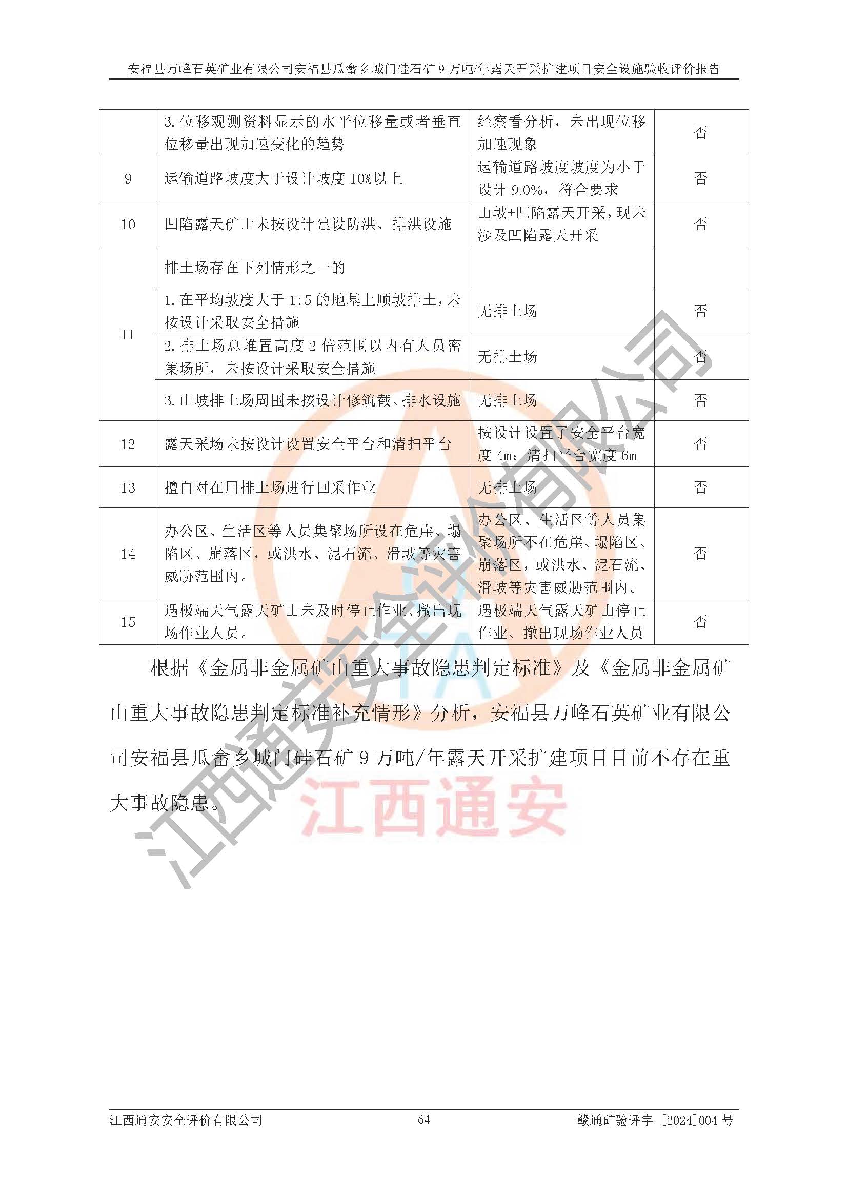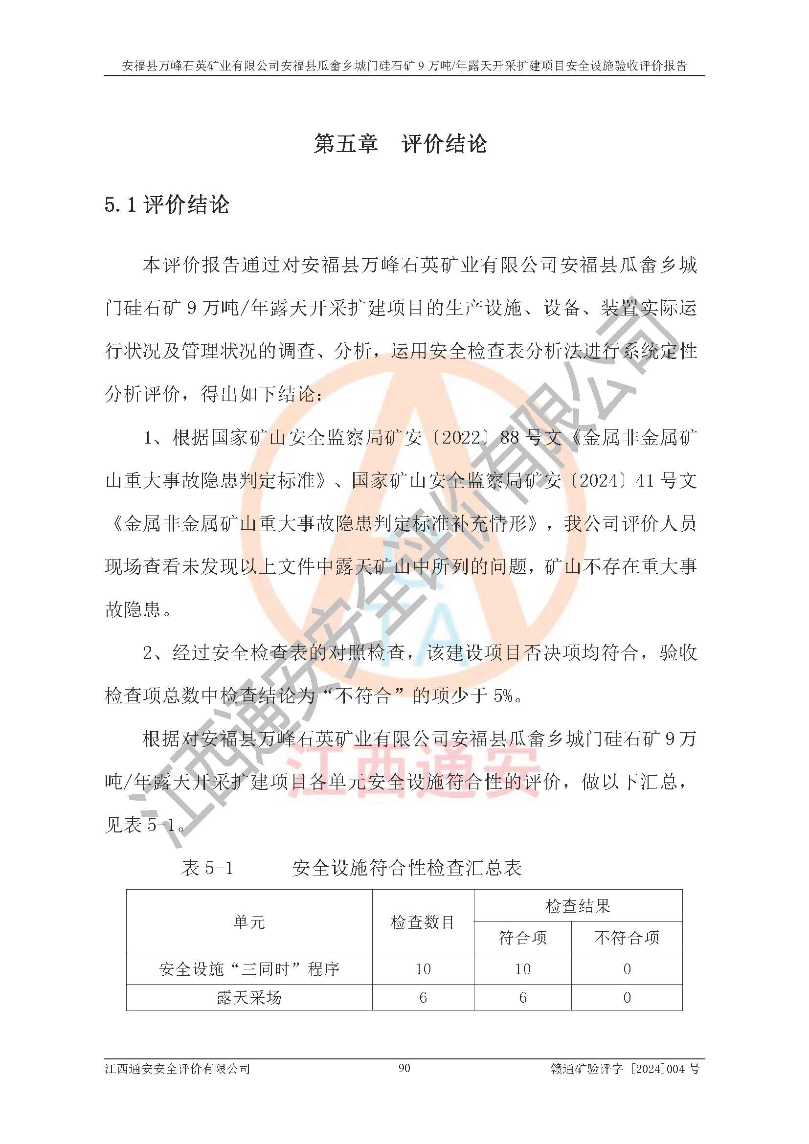 安??h萬(wàn)峰石英礦業(yè)有限公司安??h瓜畬鄉(xiāng)城門(mén)硅石礦礦區(qū)位于安??h城70°方向約15km處,行政區(qū)劃屬安福縣瓜畬鄉(xiāng)管轄。礦區(qū)位置地理坐標(biāo):東經(jīng)114°44′12"~114°44′29",北緯27°28′53"~27°28′57",礦區(qū)中心地理坐標(biāo):東經(jīng)114°44′20",北緯27°28′55"。礦區(qū)有約15km簡(jiǎn)易公路經(jīng)瓜畬鄉(xiāng)**所在地,與安?!掠喙废嘟?,交通方便。 安??h瓜畬鄉(xiāng)城門(mén)硅石礦于2016年3月8日取得采礦許可證,證號(hào)C3608002009027220004917,生產(chǎn)規(guī)模1萬(wàn)噸/年,礦區(qū)面積:0.0646km2。 因礦山生產(chǎn)規(guī)模滿足不了市場(chǎng)要求,加上礦區(qū)有些地征用比較困難,企業(yè)向吉安市自然資源局申請(qǐng)擴(kuò)大生產(chǎn)規(guī)模,并將礦區(qū)范圍進(jìn)行了縮小。 2019年6月8日取得了吉安市自然資源局換發(fā)的采礦許可證,證號(hào)C3608002009027220004917,生產(chǎn)規(guī)模9萬(wàn)噸/年,礦區(qū)面積為0.029km2。**期自2019年6月8日至2027年6月8日。由于新的采礦證擴(kuò)大了生產(chǎn)規(guī)模,且改變了礦區(qū)范圍,該項(xiàng)目屬于擴(kuò)建項(xiàng)目。 吉安市富林礦山技術(shù)服務(wù)有限公司于2019年9月編制了《安??h瓜畬鄉(xiāng)城門(mén)玻璃用石英巖礦資源儲(chǔ)量核實(shí)報(bào)告》,吉安市富林礦山技術(shù)服務(wù)有限公司于2020年4月編制了《安??h瓜畬鄉(xiāng)城門(mén)玻璃用石英巖礦礦產(chǎn)資源開(kāi)發(fā)利用、地質(zhì)環(huán)境恢復(fù)治理與土地復(fù)墾方案》,貴州匯和安全評(píng)價(jià)有限公司于2023年4月編制了《安??h萬(wàn)峰石英礦業(yè)有限公司安??h瓜畬鄉(xiāng)城門(mén)硅石礦9萬(wàn)噸/年露天開(kāi)采擴(kuò)建項(xiàng)目安全預(yù)評(píng)價(jià)報(bào)告》,河南華鼎礦業(yè)設(shè)計(jì)有限公司于2023年6月編制了《安??h萬(wàn)峰石英礦業(yè)有限公司安??h瓜畬鄉(xiāng)城門(mén)硅石礦9萬(wàn)噸/年露天開(kāi)采擴(kuò)建項(xiàng)目初步設(shè)計(jì)》和《安??h萬(wàn)峰石英礦業(yè)有限公司安福縣瓜畬鄉(xiāng)城門(mén)硅石礦9萬(wàn)噸/年露天開(kāi)采擴(kuò)建項(xiàng)目安全設(shè)施設(shè)計(jì)》;2023年7月3日安??h應(yīng)急管理局下發(fā)了《關(guān)于安福縣萬(wàn)峰石英礦業(yè)有限公司安??h瓜畬鄉(xiāng)城門(mén)硅石礦9萬(wàn)噸/年露天開(kāi)采擴(kuò)建項(xiàng)目安全設(shè)施設(shè)計(jì)審查意見(jiàn)》(安應(yīng)急字〔2023〕30號(hào))。 2023年7月安??h萬(wàn)峰石英礦業(yè)有限公司根據(jù)《中華人民共和國(guó)安全生產(chǎn)法》、《安全生產(chǎn)許可證條例》等有關(guān)法律、法規(guī)、部門(mén)規(guī)章的規(guī)定,嚴(yán)格按照《安全設(shè)施設(shè)計(jì)》進(jìn)行基建,該礦山分東、西兩個(gè)采區(qū),西采區(qū)設(shè)計(jì)+259m平臺(tái)為采剝平臺(tái)、+249m平臺(tái)為鏟裝平臺(tái),開(kāi)拓運(yùn)輸?shù)缆分?249m平臺(tái),在基建過(guò)程中,剝離表土?xí)r因表土層發(fā)生變化,+259m采剝平臺(tái)無(wú)硅石資源可采,因此首采平臺(tái)及其鏟裝平臺(tái)、開(kāi)拓運(yùn)輸?shù)缆?*進(jìn)行變更。 2024年4月礦山委托原設(shè)計(jì)單位河南華鼎礦業(yè)設(shè)計(jì)有限公司編制了《安??h萬(wàn)峰石英礦業(yè)有限公司安??h瓜畬鄉(xiāng)城門(mén)硅石礦9萬(wàn)噸/年露天開(kāi)采擴(kuò)建項(xiàng)目變更設(shè)計(jì)》,根據(jù)礦山西采區(qū)+259m、+249m、+239m平臺(tái)均無(wú)硅石資源的實(shí)際情況,對(duì)設(shè)計(jì)的西采區(qū)+259m平臺(tái)為采剝平臺(tái)、+249m平臺(tái)為鏟裝平臺(tái),開(kāi)拓運(yùn)輸?shù)缆分?249m平臺(tái)進(jìn)行變更,將+259m平臺(tái)、+249m平臺(tái)變更為安全平臺(tái),+239m平臺(tái)仍為清掃平臺(tái),首采平臺(tái)變更為+229m平臺(tái)、鏟裝平臺(tái)變更為+219m平臺(tái),開(kāi)拓運(yùn)輸?shù)缆分?219m平臺(tái)、簡(jiǎn)易道路至+229m平臺(tái);東采區(qū)安全設(shè)施設(shè)計(jì)不變,根據(jù)《**礦山監(jiān)察局關(guān)于印發(fā)非煤礦山建設(shè)項(xiàng)目安全設(shè)施重大變更范圍的通知》之規(guī)定,上述變更不屬于重大變更。 安??h萬(wàn)峰石英礦業(yè)有限公司安??h瓜畬鄉(xiāng)城門(mén)硅石礦9萬(wàn)噸/年露天開(kāi)采擴(kuò)建項(xiàng)目基建已完成,本次安全設(shè)施驗(yàn)收評(píng)價(jià)未涉及凹陷露天開(kāi)采。 |