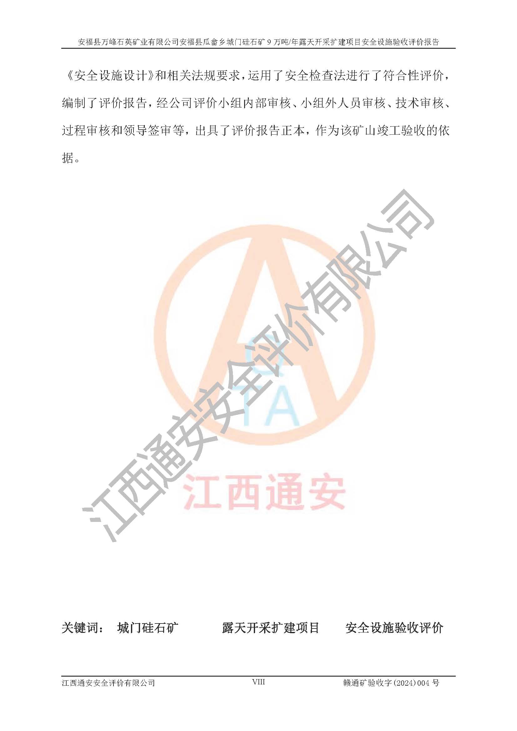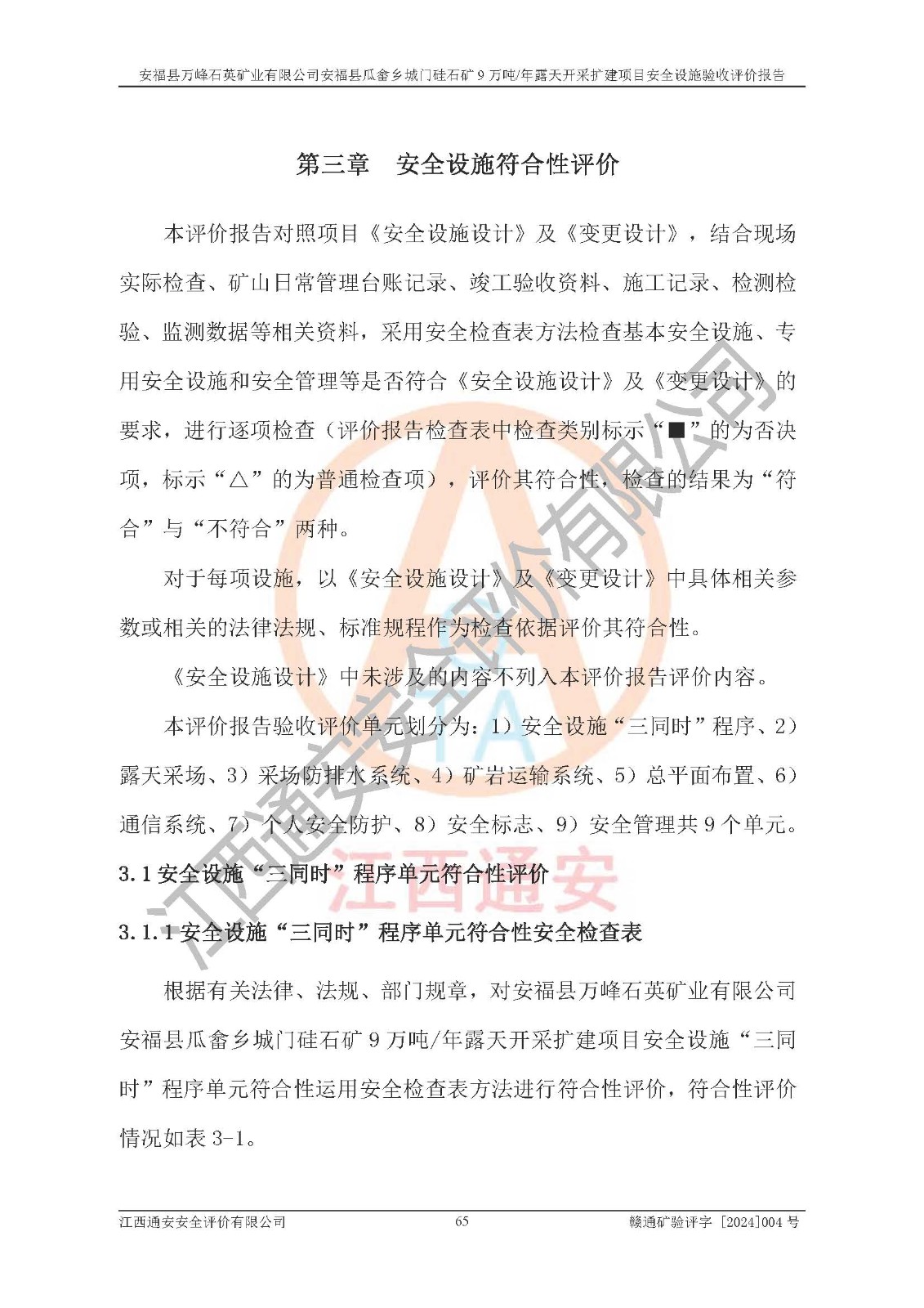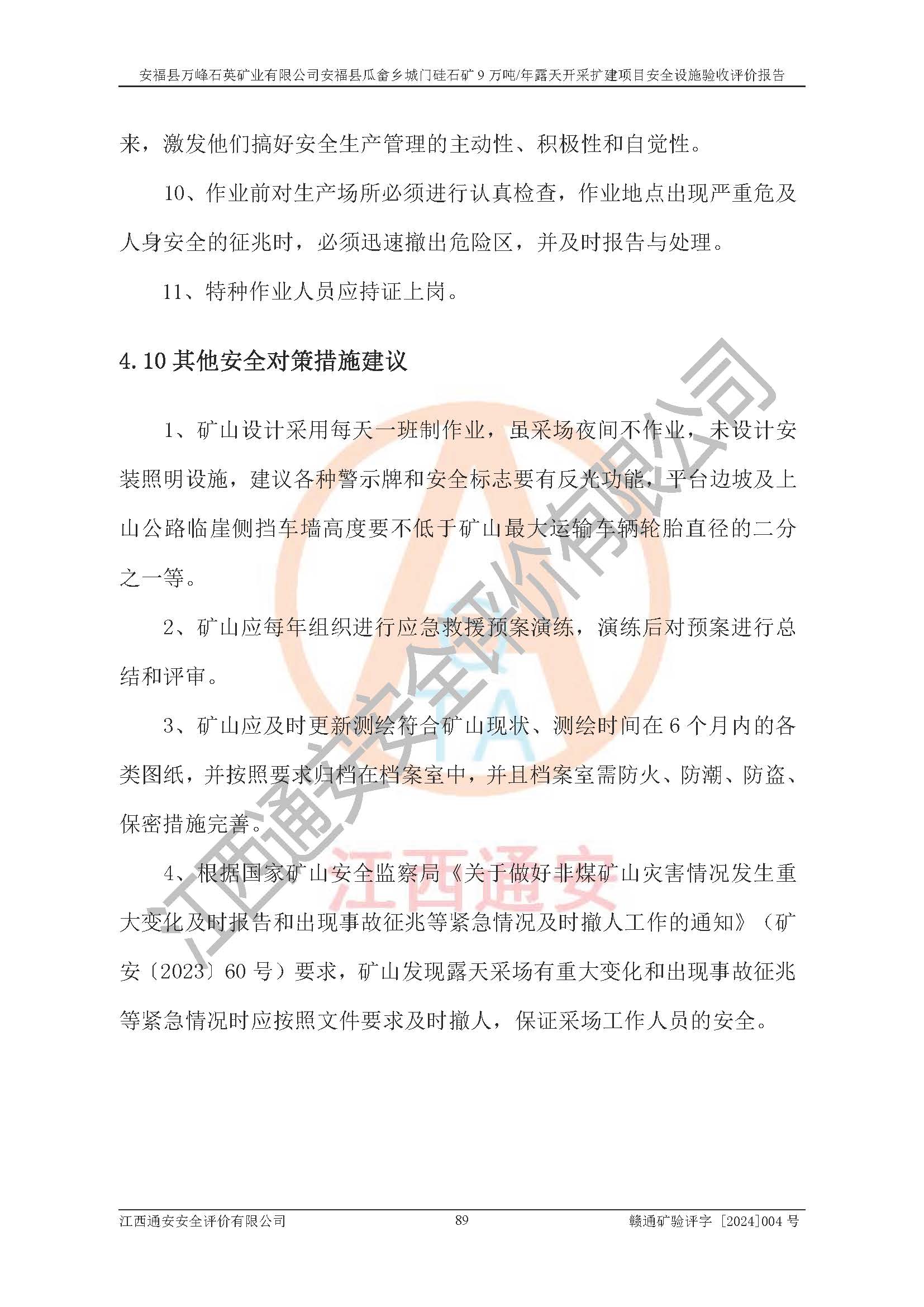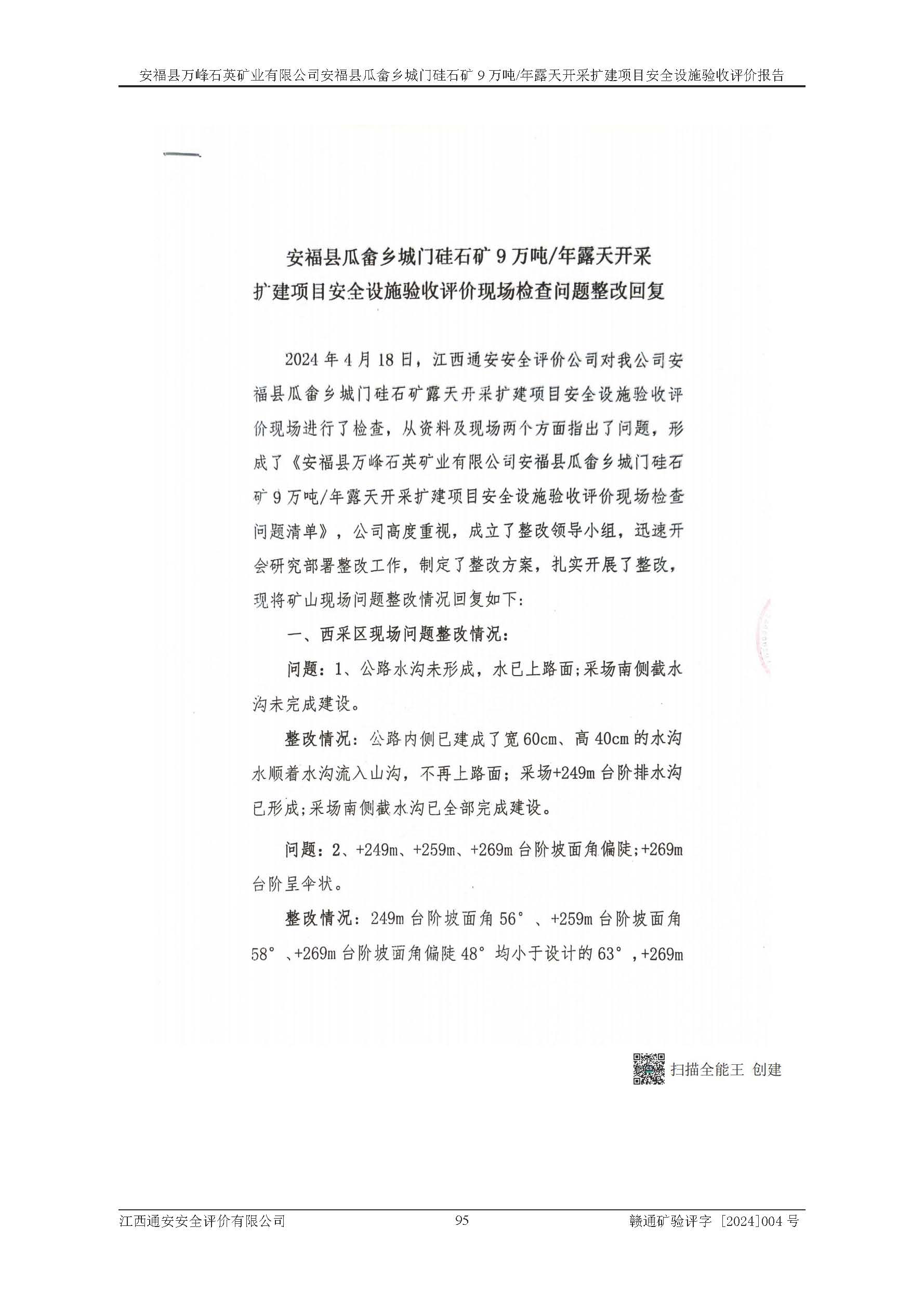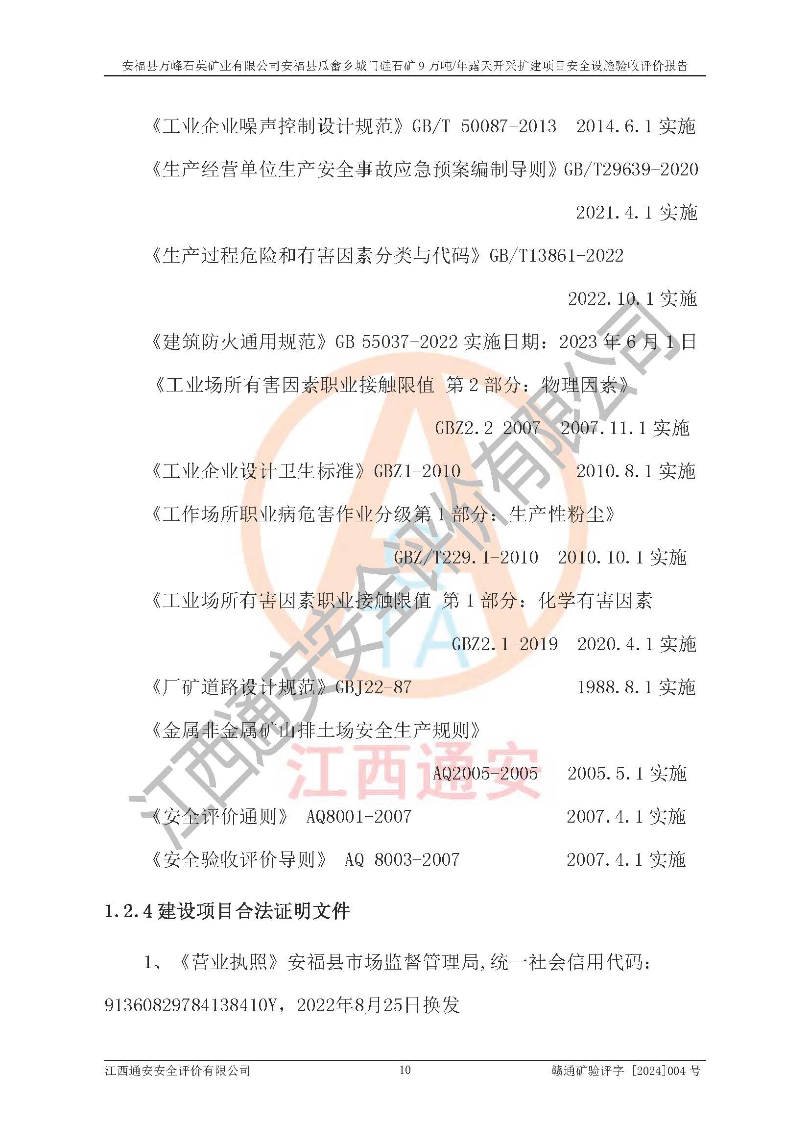 安??h萬(wàn)峰石英礦業(yè)有限公司安??h瓜畬鄉(xiāng)城門(mén)硅石礦礦區(qū)位于安??h城70°方向約15km處,行政區(qū)劃屬安福縣瓜畬鄉(xiāng)管轄。礦區(qū)位置地理坐標(biāo):東經(jīng)114°44′12"~114°44′29",北緯27°28′53"~27°28′57",礦區(qū)中心地理坐標(biāo):東經(jīng)114°44′20",北緯27°28′55"。礦區(qū)有約15km簡(jiǎn)易公路經(jīng)瓜畬鄉(xiāng)**所在地,與安?!掠喙废嘟?,交通方便。 安??h瓜畬鄉(xiāng)城門(mén)硅石礦于2016年3月8日取得采礦許可證,證號(hào)C3608002009027220004917,生產(chǎn)規(guī)模1萬(wàn)噸/年,礦區(qū)面積:0.0646km2。 因礦山生產(chǎn)規(guī)模滿足不了市場(chǎng)要求,加上礦區(qū)有些地征用比較困難,企業(yè)向吉安市自然資源局申請(qǐng)擴(kuò)大生產(chǎn)規(guī)模,并將礦區(qū)范圍進(jìn)行了縮小。 2019年6月8日取得了吉安市自然資源局換發(fā)的采礦許可證,證號(hào)C3608002009027220004917,生產(chǎn)規(guī)模9萬(wàn)噸/年,礦區(qū)面積為0.029km2。**期自2019年6月8日至2027年6月8日。由于新的采礦證擴(kuò)大了生產(chǎn)規(guī)模,且改變了礦區(qū)范圍,該項(xiàng)目屬于擴(kuò)建項(xiàng)目。 吉安市富林礦山技術(shù)服務(wù)有限公司于2019年9月編制了《安??h瓜畬鄉(xiāng)城門(mén)玻璃用石英巖礦資源儲(chǔ)量核實(shí)報(bào)告》,吉安市富林礦山技術(shù)服務(wù)有限公司于2020年4月編制了《安??h瓜畬鄉(xiāng)城門(mén)玻璃用石英巖礦礦產(chǎn)資源開(kāi)發(fā)利用、地質(zhì)環(huán)境恢復(fù)治理與土地復(fù)墾方案》,貴州匯和安全評(píng)價(jià)有限公司于2023年4月編制了《安??h萬(wàn)峰石英礦業(yè)有限公司安??h瓜畬鄉(xiāng)城門(mén)硅石礦9萬(wàn)噸/年露天開(kāi)采擴(kuò)建項(xiàng)目安全預(yù)評(píng)價(jià)報(bào)告》,河南華鼎礦業(yè)設(shè)計(jì)有限公司于2023年6月編制了《安??h萬(wàn)峰石英礦業(yè)有限公司安??h瓜畬鄉(xiāng)城門(mén)硅石礦9萬(wàn)噸/年露天開(kāi)采擴(kuò)建項(xiàng)目初步設(shè)計(jì)》和《安??h萬(wàn)峰石英礦業(yè)有限公司安福縣瓜畬鄉(xiāng)城門(mén)硅石礦9萬(wàn)噸/年露天開(kāi)采擴(kuò)建項(xiàng)目安全設(shè)施設(shè)計(jì)》;2023年7月3日安??h應(yīng)急管理局下發(fā)了《關(guān)于安福縣萬(wàn)峰石英礦業(yè)有限公司安??h瓜畬鄉(xiāng)城門(mén)硅石礦9萬(wàn)噸/年露天開(kāi)采擴(kuò)建項(xiàng)目安全設(shè)施設(shè)計(jì)審查意見(jiàn)》(安應(yīng)急字〔2023〕30號(hào))。 2023年7月安??h萬(wàn)峰石英礦業(yè)有限公司根據(jù)《中華人民共和國(guó)安全生產(chǎn)法》、《安全生產(chǎn)許可證條例》等有關(guān)法律、法規(guī)、部門(mén)規(guī)章的規(guī)定,嚴(yán)格按照《安全設(shè)施設(shè)計(jì)》進(jìn)行基建,該礦山分東、西兩個(gè)采區(qū),西采區(qū)設(shè)計(jì)+259m平臺(tái)為采剝平臺(tái)、+249m平臺(tái)為鏟裝平臺(tái),開(kāi)拓運(yùn)輸?shù)缆分?249m平臺(tái),在基建過(guò)程中,剝離表土?xí)r因表土層發(fā)生變化,+259m采剝平臺(tái)無(wú)硅石資源可采,因此首采平臺(tái)及其鏟裝平臺(tái)、開(kāi)拓運(yùn)輸?shù)缆?*進(jìn)行變更。 2024年4月礦山委托原設(shè)計(jì)單位河南華鼎礦業(yè)設(shè)計(jì)有限公司編制了《安??h萬(wàn)峰石英礦業(yè)有限公司安??h瓜畬鄉(xiāng)城門(mén)硅石礦9萬(wàn)噸/年露天開(kāi)采擴(kuò)建項(xiàng)目變更設(shè)計(jì)》,根據(jù)礦山西采區(qū)+259m、+249m、+239m平臺(tái)均無(wú)硅石資源的實(shí)際情況,對(duì)設(shè)計(jì)的西采區(qū)+259m平臺(tái)為采剝平臺(tái)、+249m平臺(tái)為鏟裝平臺(tái),開(kāi)拓運(yùn)輸?shù)缆分?249m平臺(tái)進(jìn)行變更,將+259m平臺(tái)、+249m平臺(tái)變更為安全平臺(tái),+239m平臺(tái)仍為清掃平臺(tái),首采平臺(tái)變更為+229m平臺(tái)、鏟裝平臺(tái)變更為+219m平臺(tái),開(kāi)拓運(yùn)輸?shù)缆分?219m平臺(tái)、簡(jiǎn)易道路至+229m平臺(tái);東采區(qū)安全設(shè)施設(shè)計(jì)不變,根據(jù)《**礦山監(jiān)察局關(guān)于印發(fā)非煤礦山建設(shè)項(xiàng)目安全設(shè)施重大變更范圍的通知》之規(guī)定,上述變更不屬于重大變更。 安??h萬(wàn)峰石英礦業(yè)有限公司安??h瓜畬鄉(xiāng)城門(mén)硅石礦9萬(wàn)噸/年露天開(kāi)采擴(kuò)建項(xiàng)目基建已完成,本次安全設(shè)施驗(yàn)收評(píng)價(jià)未涉及凹陷露天開(kāi)采。 |