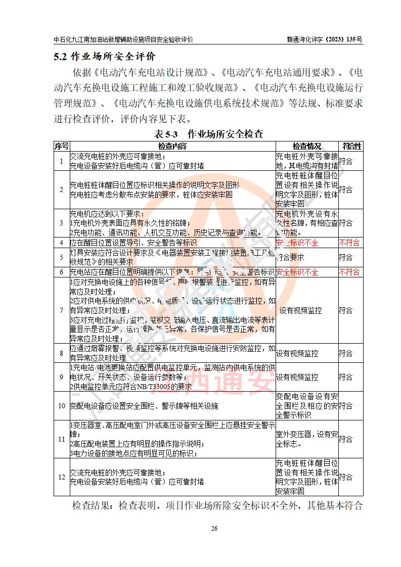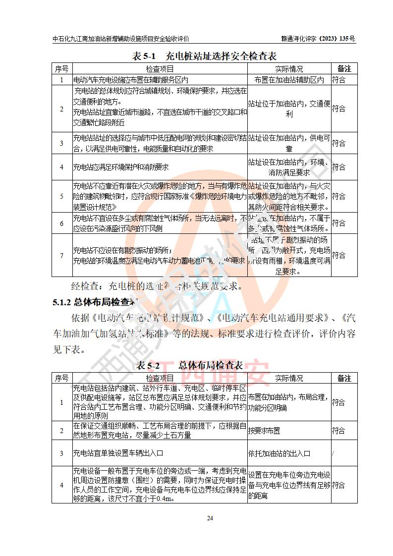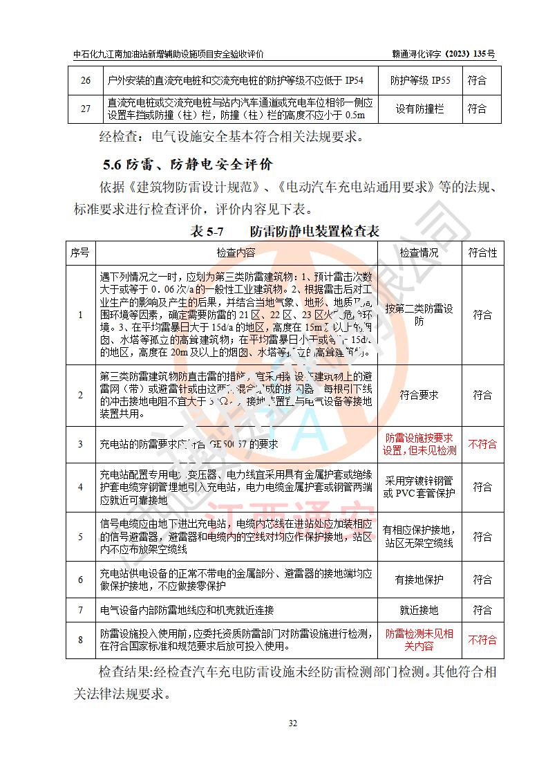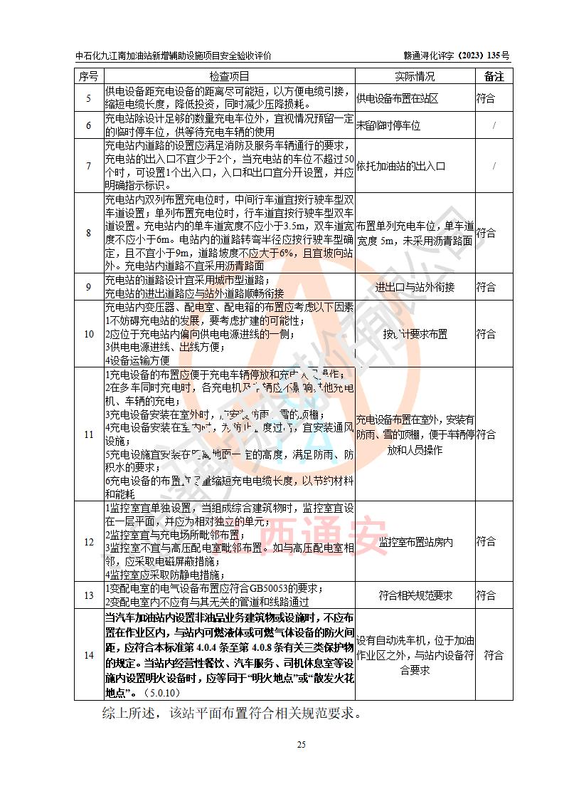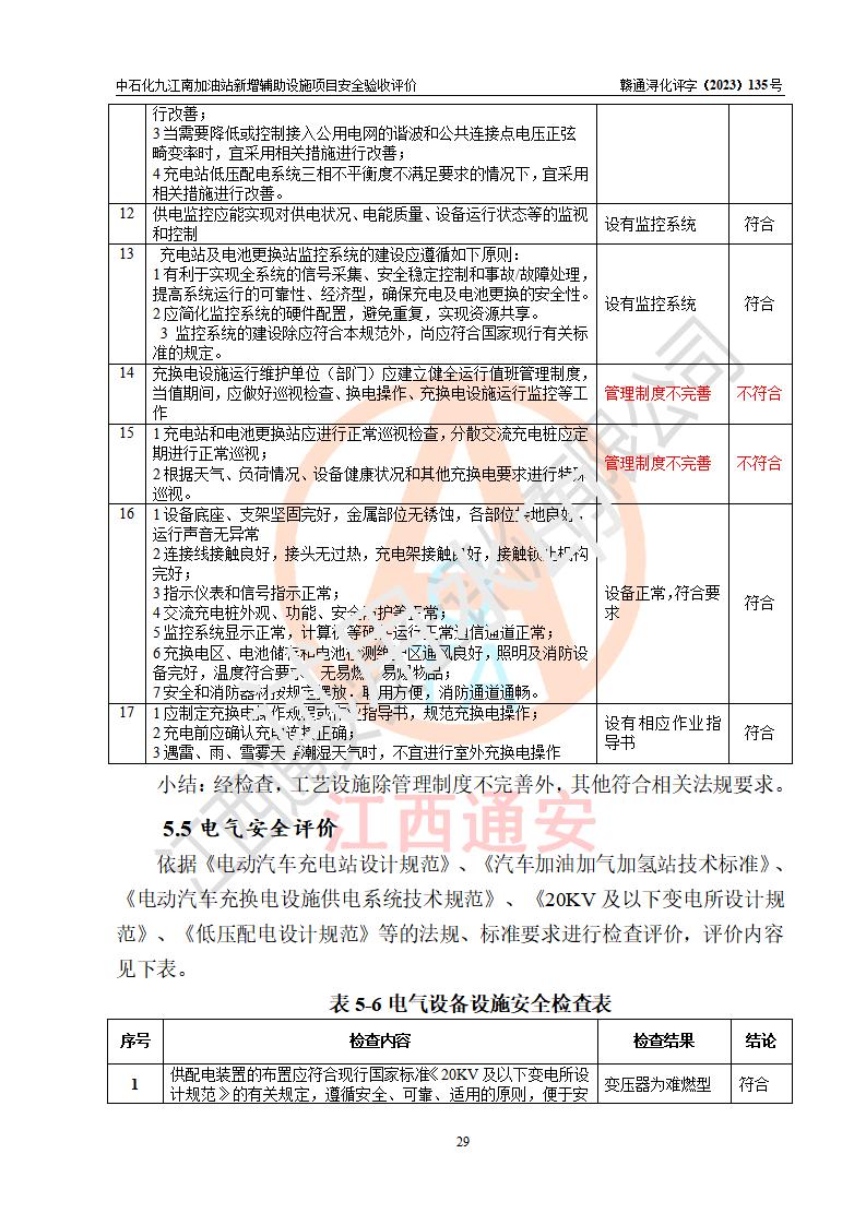 評價結(jié)論 | 中國石化銷售股份有限公司江西九江潯陽石油分公司九江南加油站新增輔助設(shè)施項目涉及的安全條件、安全生產(chǎn)條件、安全生產(chǎn)管理符合《電動汽車充電站設(shè)計規(guī)范》、《汽車加油加氣加氫站技術(shù)標準》等**有關(guān)法規(guī)、標準、規(guī)范要求,能滿足經(jīng)營單位的安全條件,具備項目竣工驗收的條件。 | |||