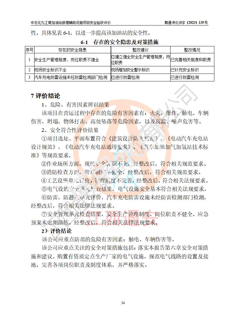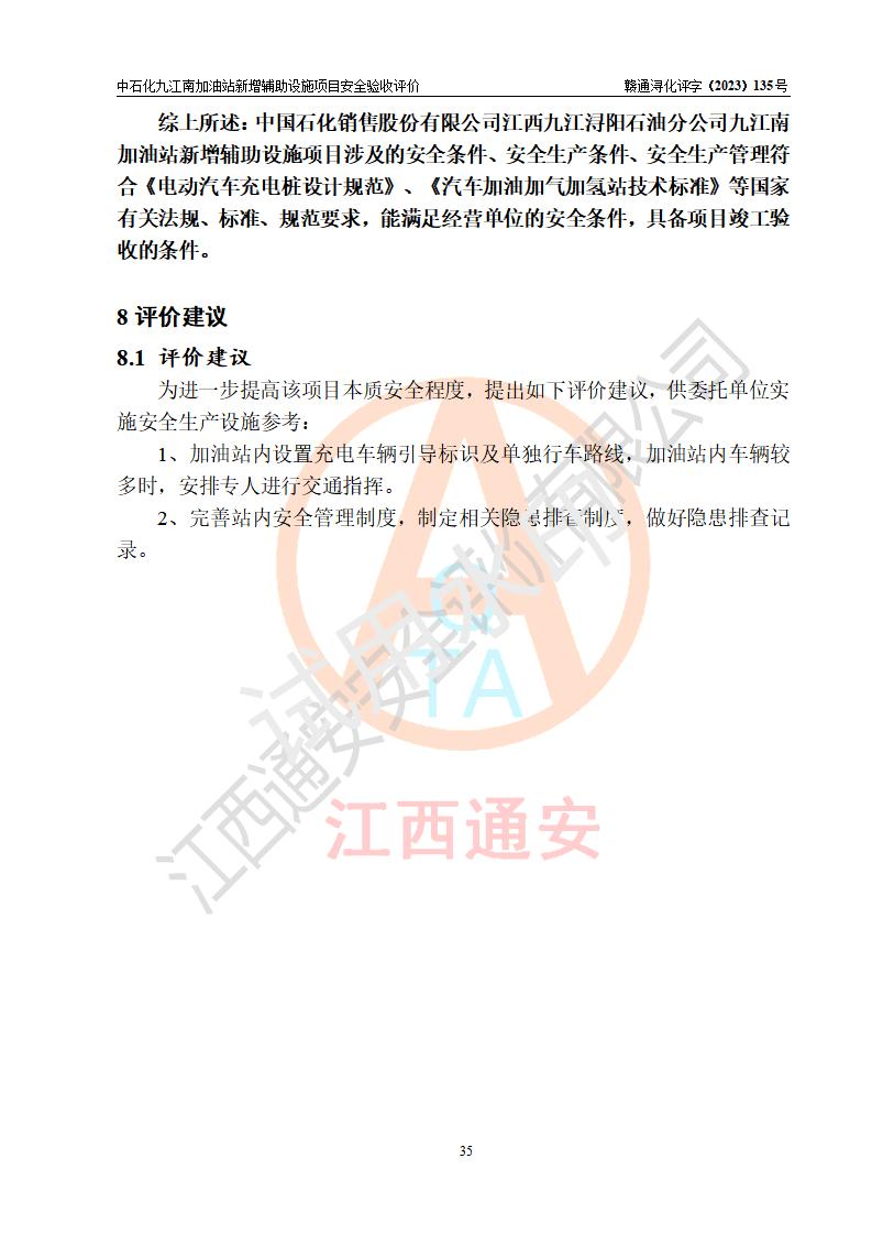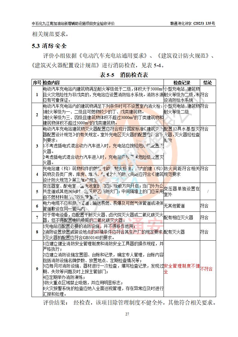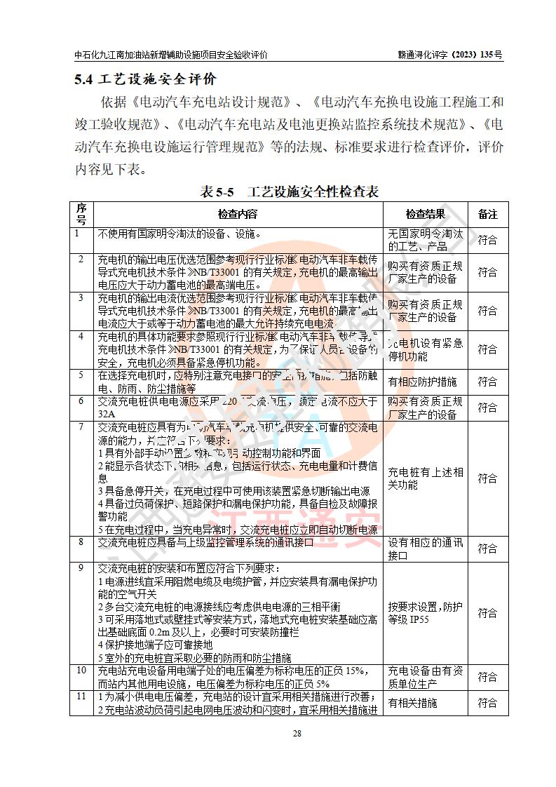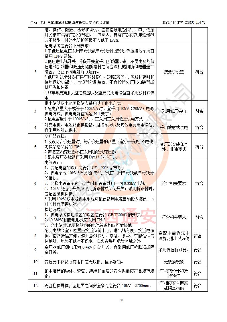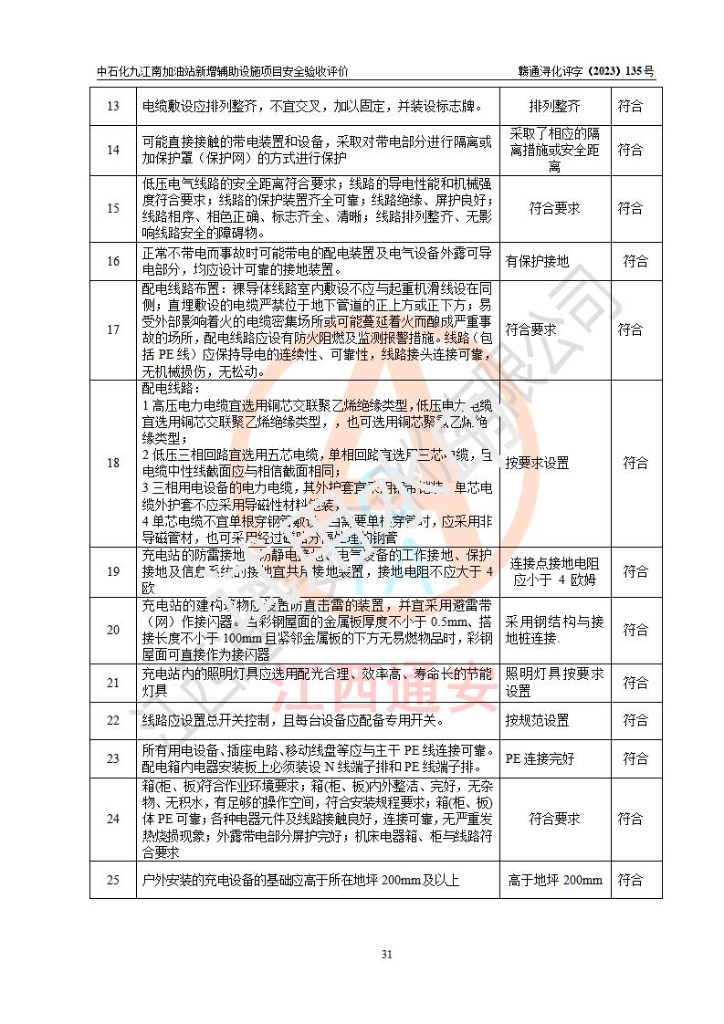 評價結(jié)論 | 中國石化銷售股份有限公司江西九江潯陽石油分公司九江南加油站新增輔助設(shè)施項目涉及的安全條件、安全生產(chǎn)條件、安全生產(chǎn)管理符合《電動汽車充電站設(shè)計規(guī)范》、《汽車加油加氣加氫站技術(shù)標準》等**有關(guān)法規(guī)、標準、規(guī)范要求,能滿足經(jīng)營單位的安全條件,具備項目竣工驗收的條件。 | |||