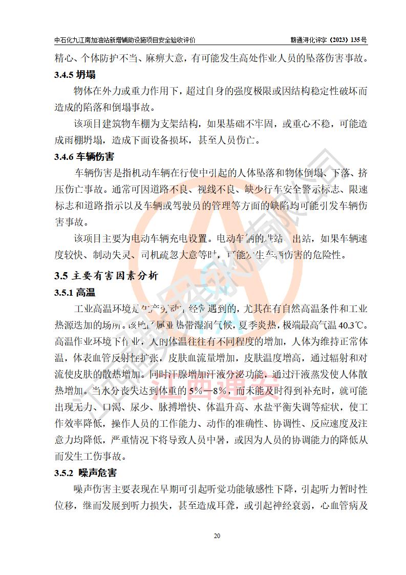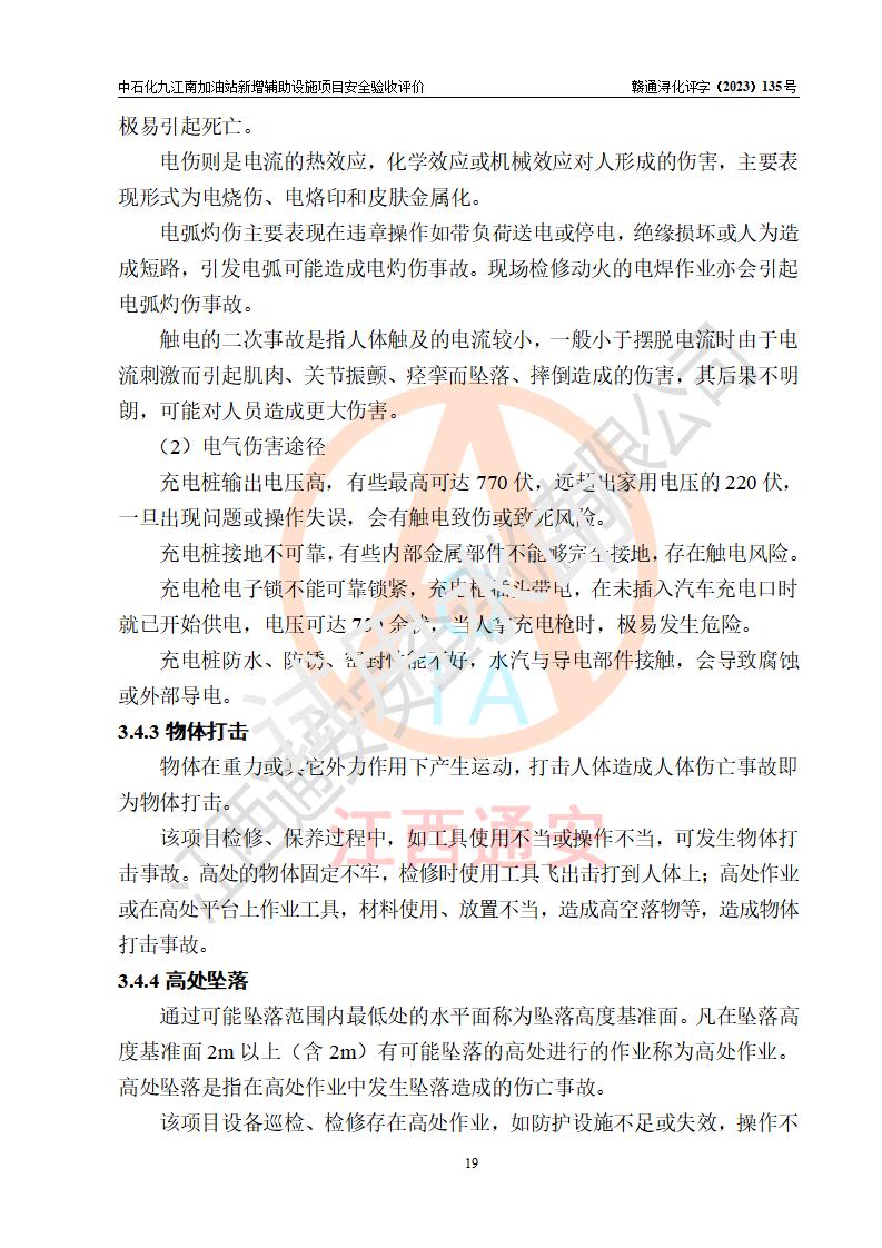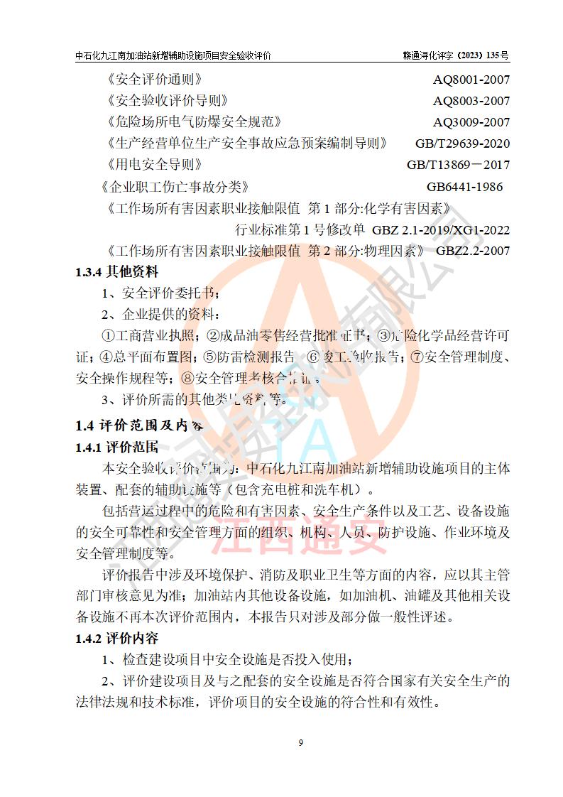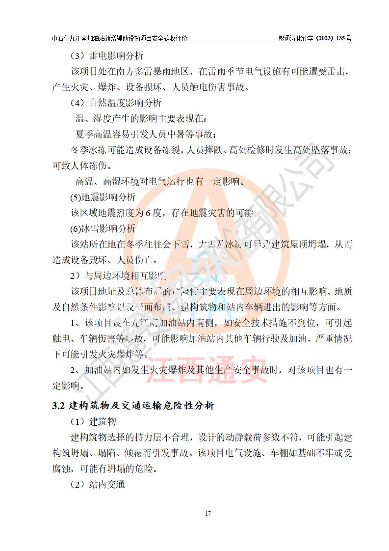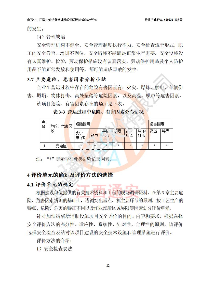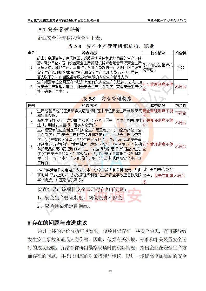 評價結(jié)論 | 中國石化銷售股份有限公司江西九江潯陽石油分公司九江南加油站新增輔助設(shè)施項目涉及的安全條件、安全生產(chǎn)條件、安全生產(chǎn)管理符合《電動汽車充電站設(shè)計規(guī)范》、《汽車加油加氣加氫站技術(shù)標準》等**有關(guān)法規(guī)、標準、規(guī)范要求,能滿足經(jīng)營單位的安全條件,具備項目竣工驗收的條件。 | |||