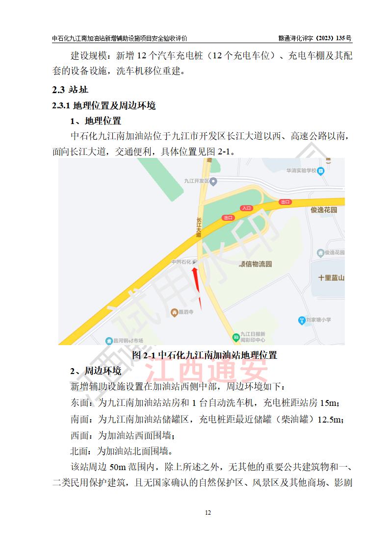 項目簡介 | 中國石化銷售股份有限公司江西九江潯陽石油分公司九江南加油站是一家專門從事成品油零售經(jīng)營的有限公司分公司(外商投資企業(yè)分公司),經(jīng)營場所位于江西省九江市開發(fā)區(qū)長江大道以西、高速公路以南?,F(xiàn)有從業(yè)人員7名,其中安全管理人員1人,加油站負責(zé)人杜建國。 該站于2021年11月23日由九江經(jīng)濟技術(shù)開發(fā)區(qū)行政審批局換發(fā)的《危險化學(xué)品經(jīng)營許可證》(編號:贛?;?jīng)字[2021]K00006號),**期至2024年11月22日;于2020年11月02日取得九江市商務(wù)局頒發(fā)的《成品油零售經(jīng)營批準證書》(油零售證書第潯0114號)**期至2025年11月01日。 隨著電動汽車的增多,對汽車充電樁的需求越來越多,為滿足電動汽車的充電要求,該站新增12個汽車充電樁(12個充電車位)及其相關(guān)的設(shè)備設(shè)施,洗車機移位重建。 | |||