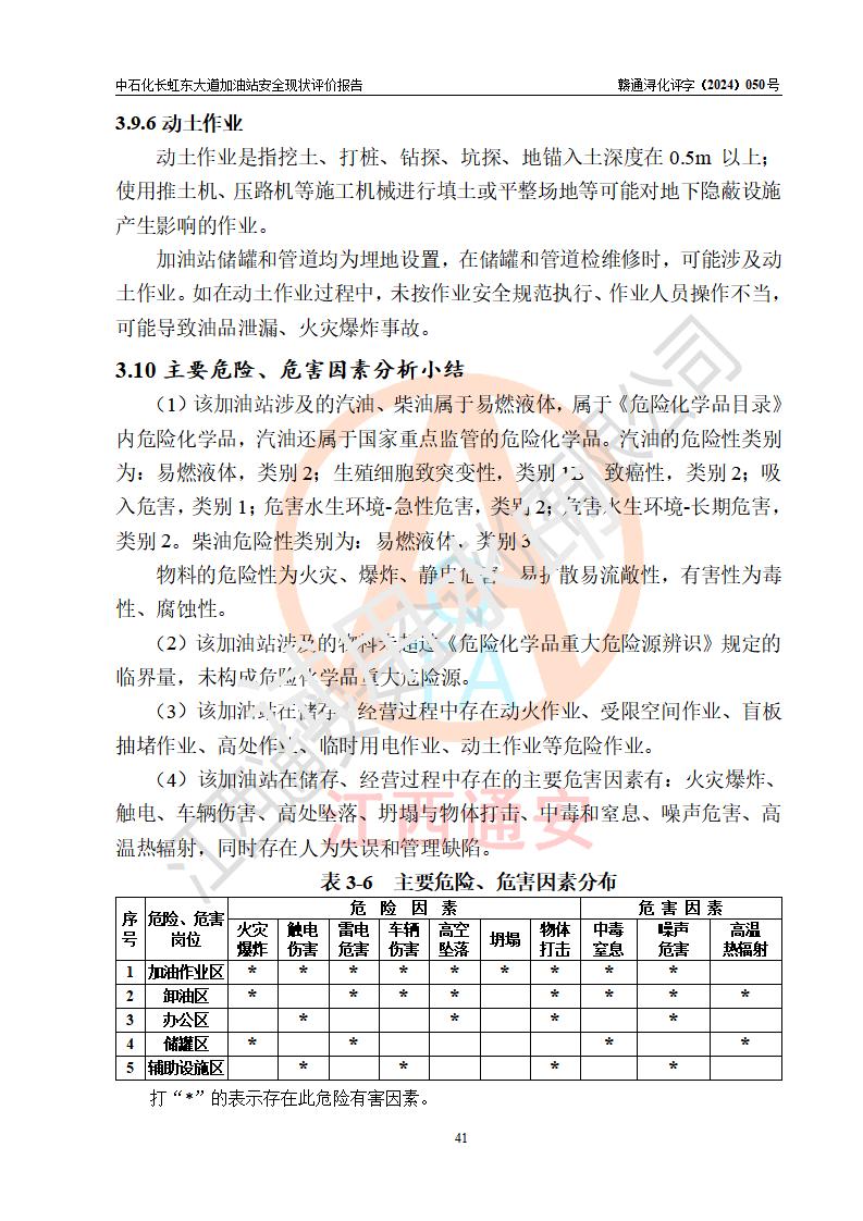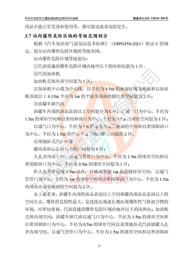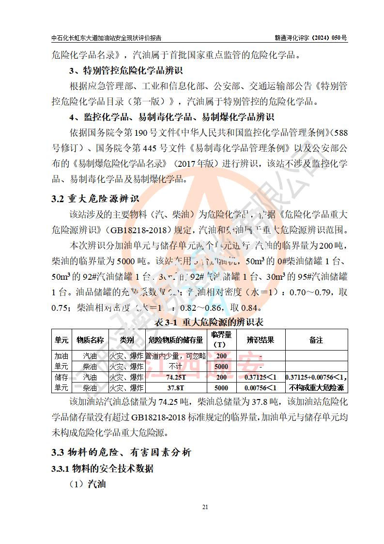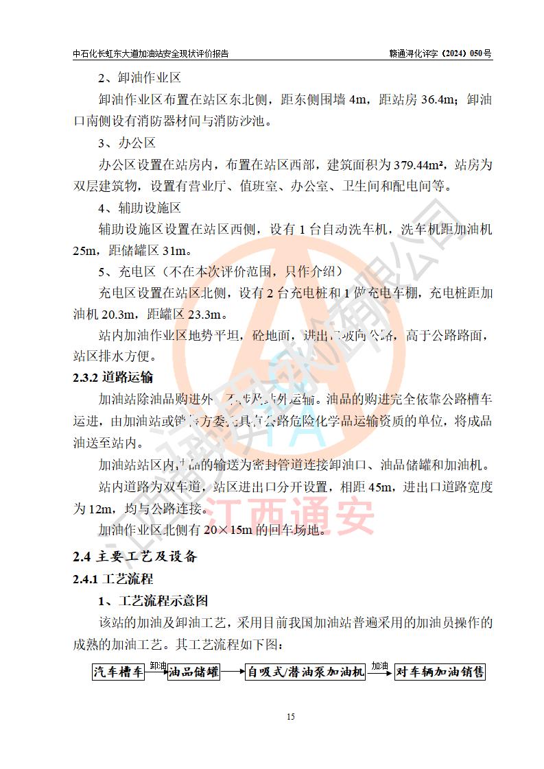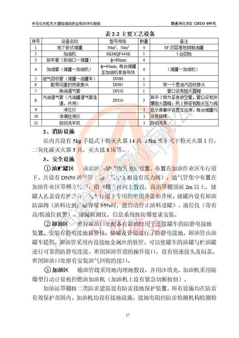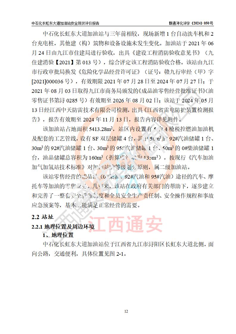 項(xiàng)目簡介 | 中國石化銷售股份有限公司江西九江潯陽石油分公司長虹東大道加油站是一家專門從事成品油零售經(jīng)營的有限公司分公司(外商投資企業(yè)分公司),經(jīng)營場所位于江西省九江市潯陽區(qū)長虹東大道北側(cè)。現(xiàn)有從業(yè)人員4名,其中安全管理人員1人,加油站負(fù)責(zé)人杜建國。 該加油站占地面積5413.28m2,站區(qū)內(nèi)設(shè)置有5臺(tái)4槍稅控燃油加油機(jī)及配套的工藝管線,設(shè)有SF雙層儲(chǔ)罐4臺(tái),其中50m3的92#汽油儲(chǔ)罐1臺(tái)、30m3的92#汽油儲(chǔ)罐1臺(tái)、30m3的95#汽油儲(chǔ)罐1臺(tái)、50m3的0#柴油儲(chǔ)罐1臺(tái),油品儲(chǔ)罐總?cè)莘e為160m3(折算成汽油為135m3),按現(xiàn)行《汽車加油加氣加氫站技術(shù)標(biāo)準(zhǔn)》對(duì)加油站的等級(jí)劃分原則,屬二級(jí)加油站。 該站由九江市行政審批局換發(fā)《危險(xiǎn)化學(xué)品經(jīng)營許可證》(證號(hào):贛九行審經(jīng)(甲)字[2021]000036號(hào)),**期限2021年07月28日至2024年07月27日。 | |||