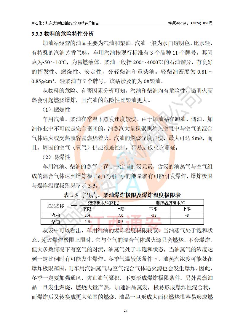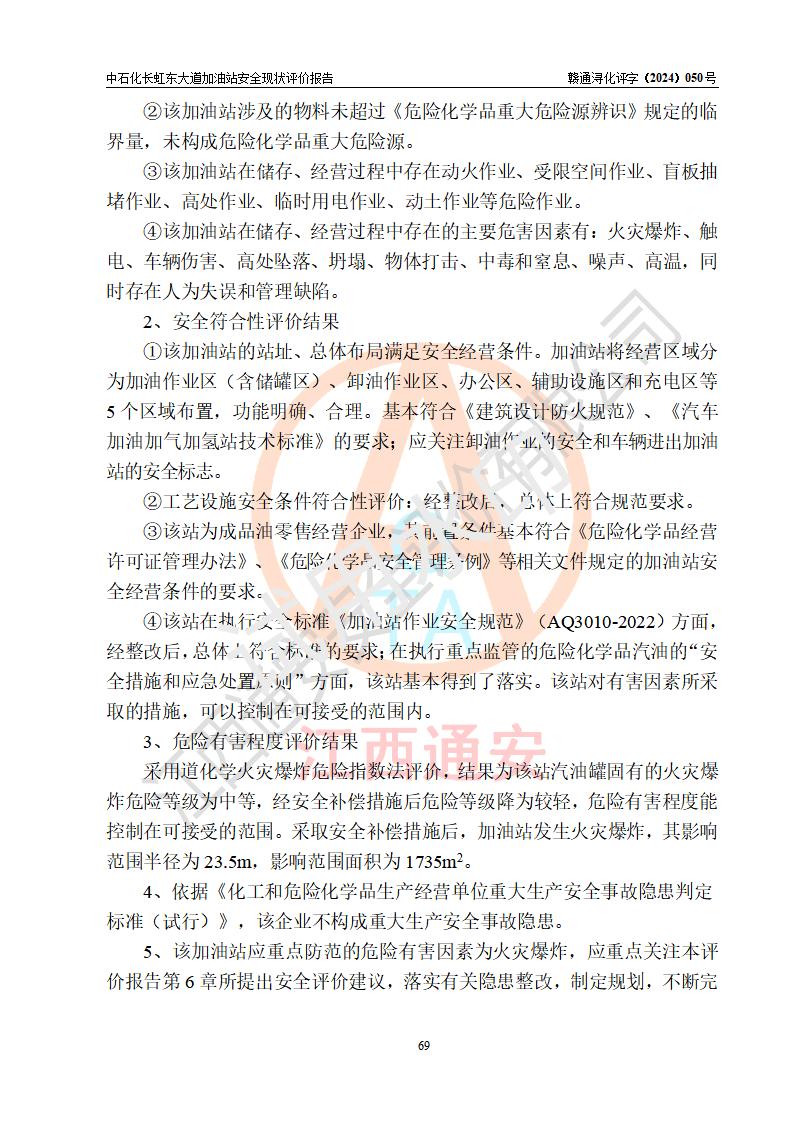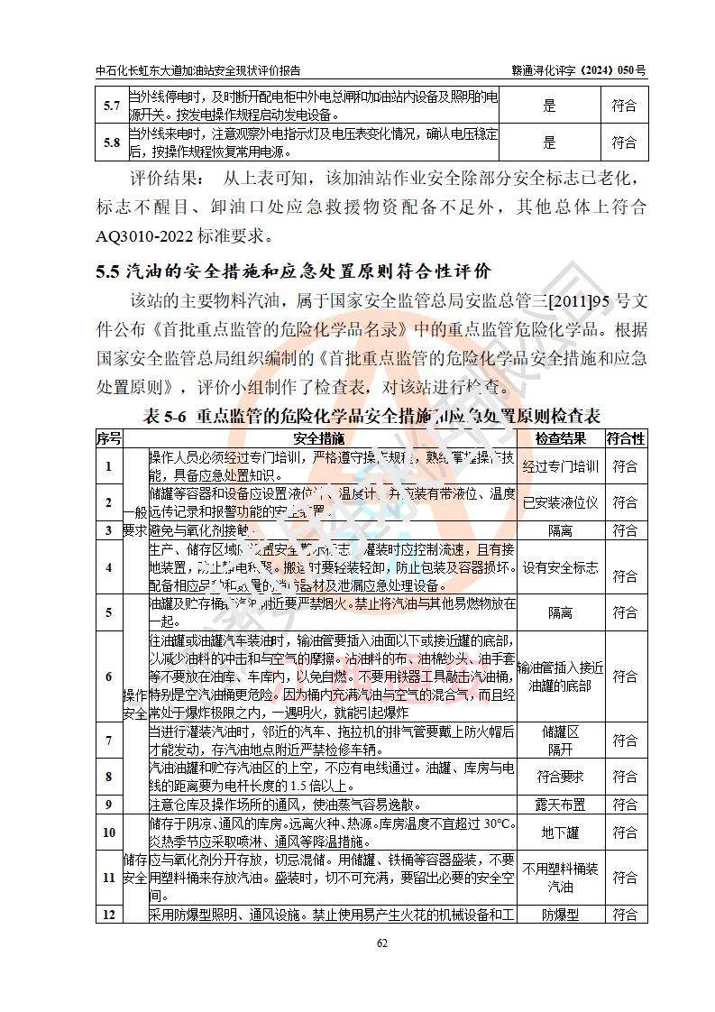 評(píng)價(jià)結(jié)論 | 中國石化銷售股份有限公司江西九江潯陽石油分公司長虹東大道加油站涉及的安全條件、安全經(jīng)營條件、安全生產(chǎn)管理符合《危險(xiǎn)化學(xué)品經(jīng)營許可證管理辦法》、《汽車加油加氣加氫站技術(shù)標(biāo)準(zhǔn)》等**有關(guān)法規(guī)、標(biāo)準(zhǔn)、規(guī)范要求,能滿足危險(xiǎn)化學(xué)品經(jīng)營安全條件。 | |||