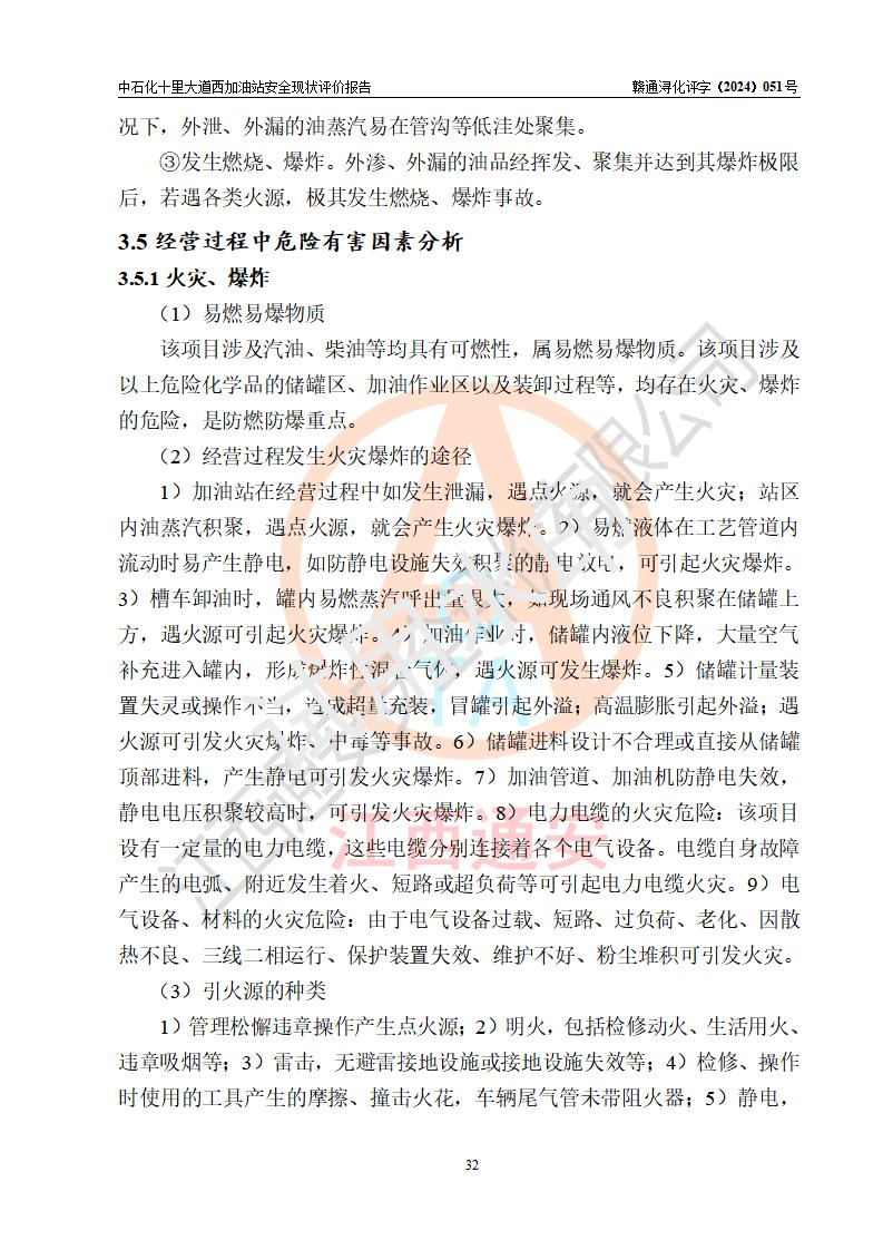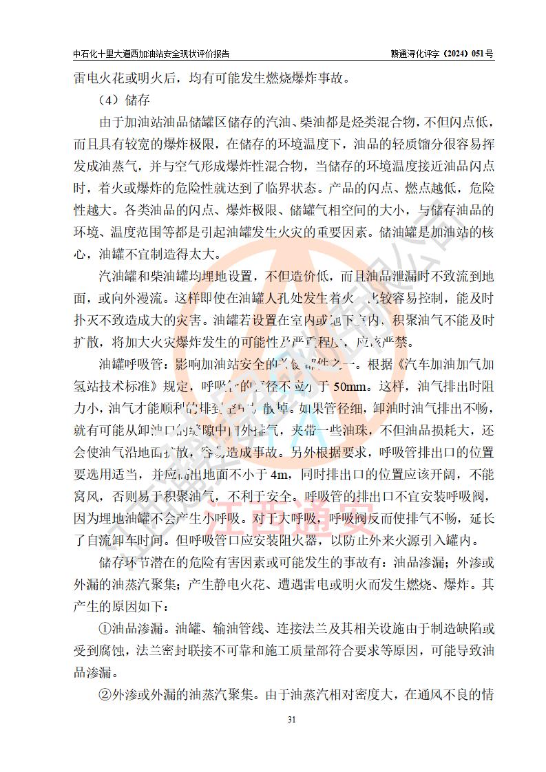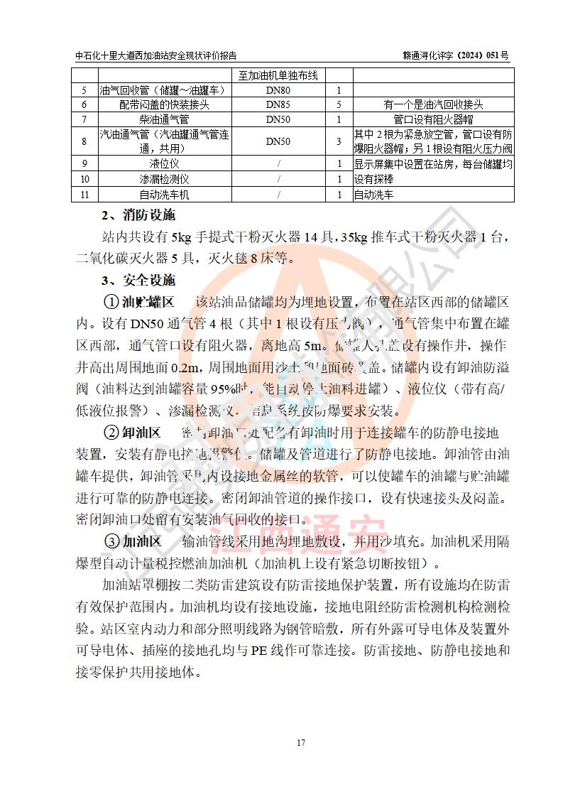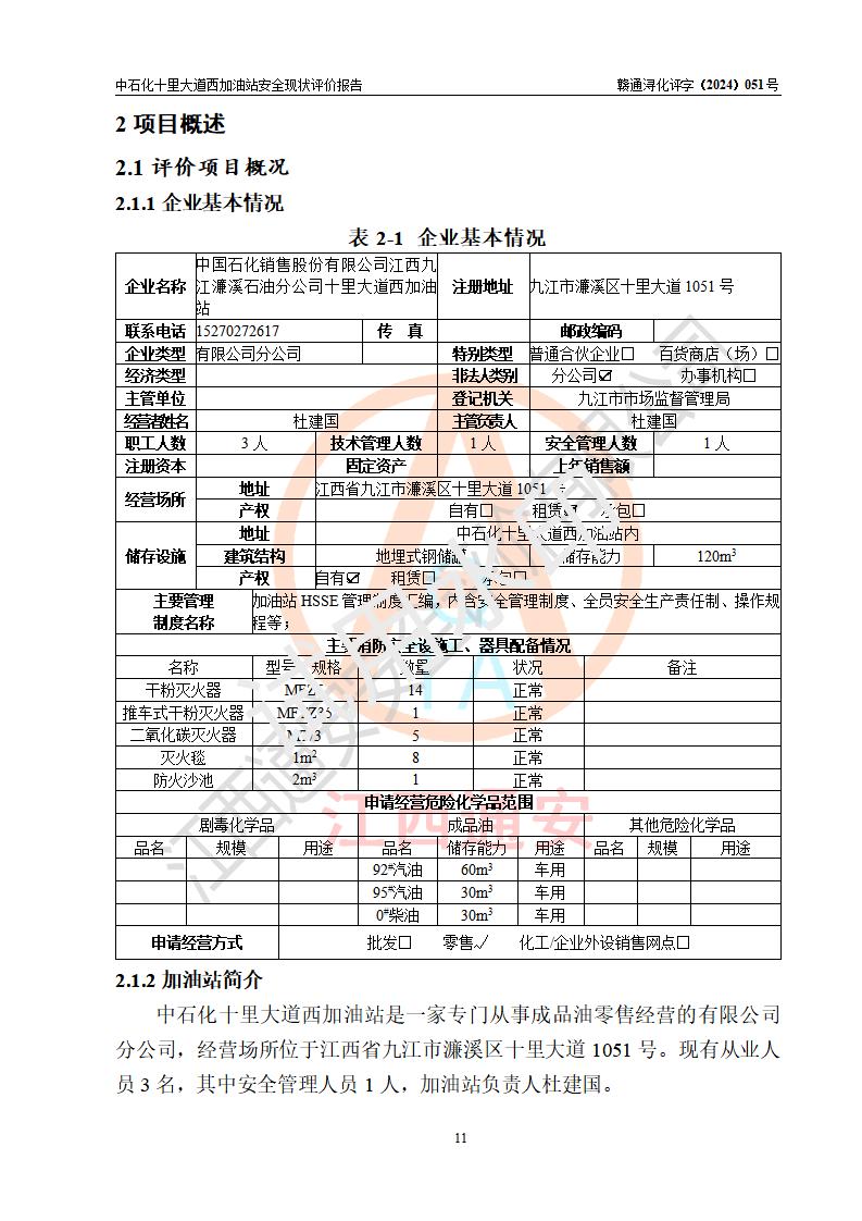 項(xiàng)目簡介 | 中國石化銷售股份有限公司江西九江濂溪石油分公司十里大道西加油站是一家專門從事成品油零售經(jīng)營的有限公司分公司(外商投資企業(yè)分公司),經(jīng)營場所位于江西省九江市濂溪區(qū)十里大道1051號(hào)。現(xiàn)有從業(yè)人員3名,其中安全管理人員1人,加油站負(fù)責(zé)人杜建國。 該加油站占地面積2070m2,站區(qū)內(nèi)設(shè)置有4臺(tái)雙槍稅控燃油加油機(jī)及配套的工藝管線,設(shè)有SF雙層儲(chǔ)罐4臺(tái),其中30m3的92#汽油儲(chǔ)罐2臺(tái)、30m3的95#汽油儲(chǔ)罐1臺(tái)、30m3的0#柴油儲(chǔ)罐1臺(tái),油品儲(chǔ)罐總?cè)莘e為120m3(折算成汽油為105m3),按現(xiàn)行《汽車加油加氣加氫站技術(shù)標(biāo)準(zhǔn)》對(duì)加油站的等級(jí)劃分原則,屬二級(jí)加油站。 該站由九江市行政審批局換發(fā)《危險(xiǎn)化學(xué)品經(jīng)營許可證》(證號(hào):贛九行審經(jīng)(甲)字[2021]000042號(hào)),**期限2021年08月09日至2024年08月08日。 | |||