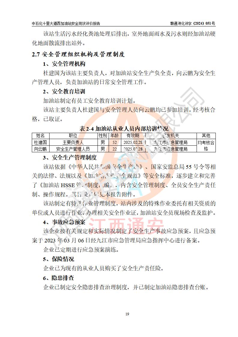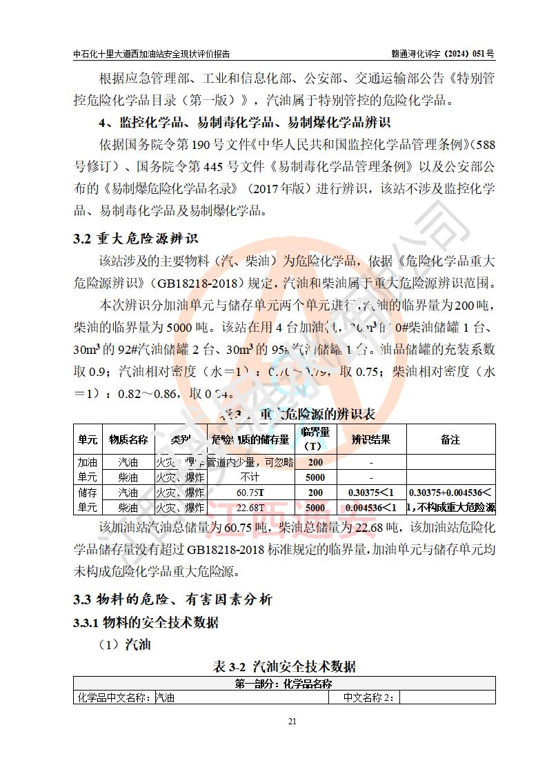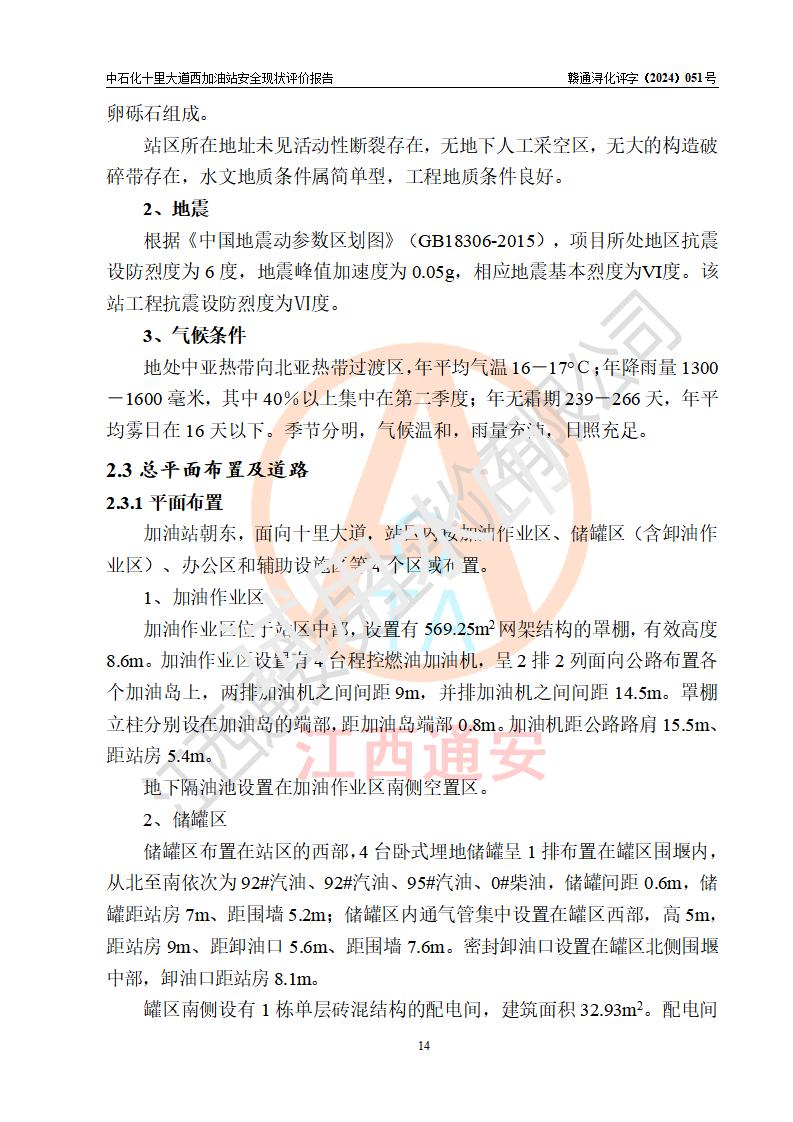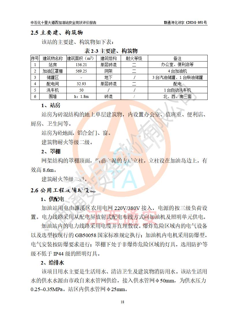 項(xiàng)目簡介 | 中國石化銷售股份有限公司江西九江濂溪石油分公司十里大道西加油站是一家專門從事成品油零售經(jīng)營的有限公司分公司(外商投資企業(yè)分公司),經(jīng)營場所位于江西省九江市濂溪區(qū)十里大道1051號(hào)。現(xiàn)有從業(yè)人員3名,其中安全管理人員1人,加油站負(fù)責(zé)人杜建國。 該加油站占地面積2070m2,站區(qū)內(nèi)設(shè)置有4臺(tái)雙槍稅控燃油加油機(jī)及配套的工藝管線,設(shè)有SF雙層儲(chǔ)罐4臺(tái),其中30m3的92#汽油儲(chǔ)罐2臺(tái)、30m3的95#汽油儲(chǔ)罐1臺(tái)、30m3的0#柴油儲(chǔ)罐1臺(tái),油品儲(chǔ)罐總?cè)莘e為120m3(折算成汽油為105m3),按現(xiàn)行《汽車加油加氣加氫站技術(shù)標(biāo)準(zhǔn)》對(duì)加油站的等級(jí)劃分原則,屬二級(jí)加油站。 該站由九江市行政審批局換發(fā)《危險(xiǎn)化學(xué)品經(jīng)營許可證》(證號(hào):贛九行審經(jīng)(甲)字[2021]000042號(hào)),**期限2021年08月09日至2024年08月08日。 | |||