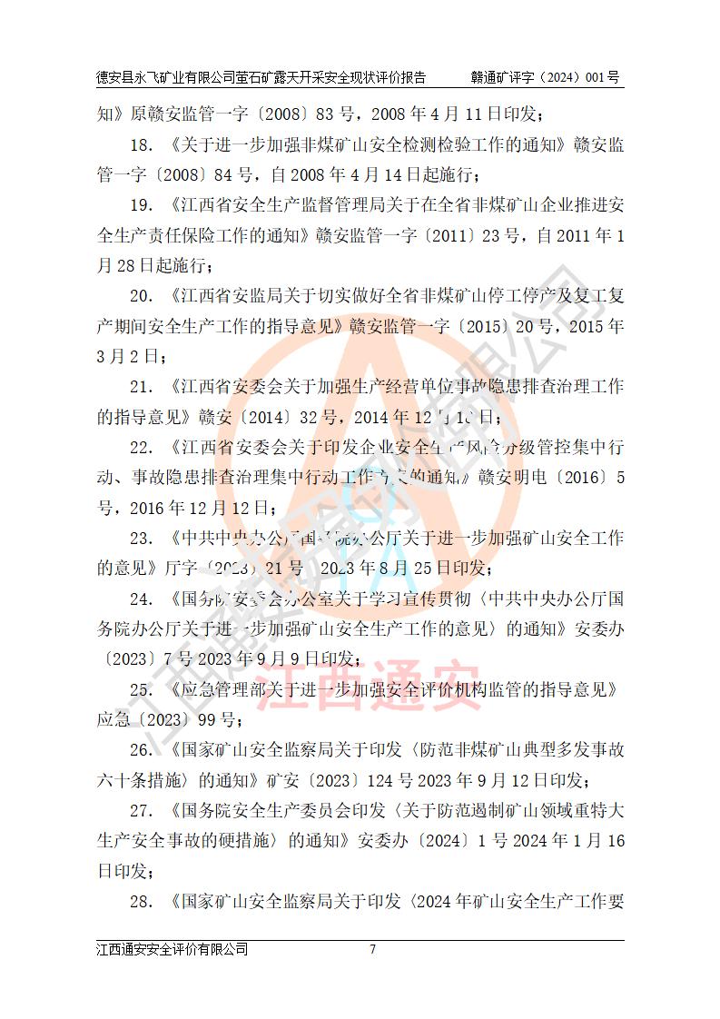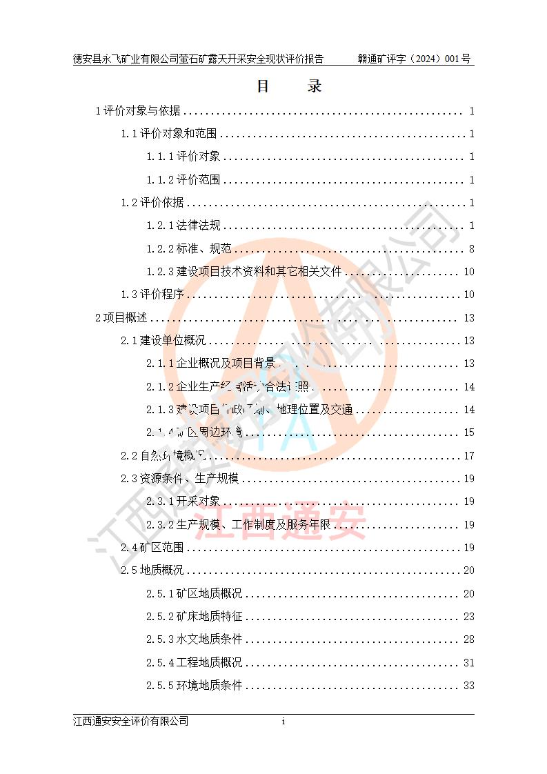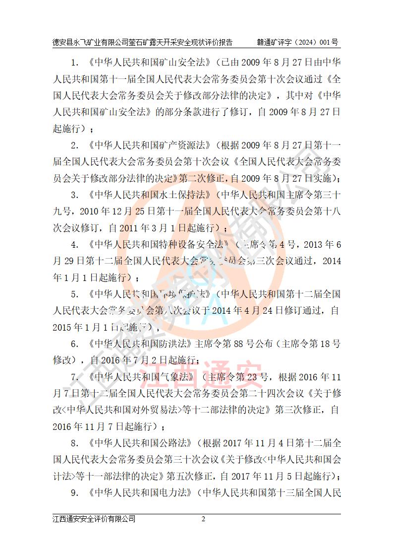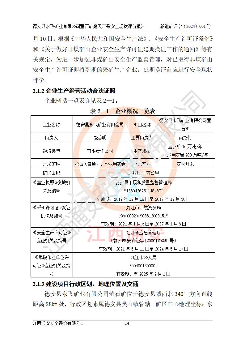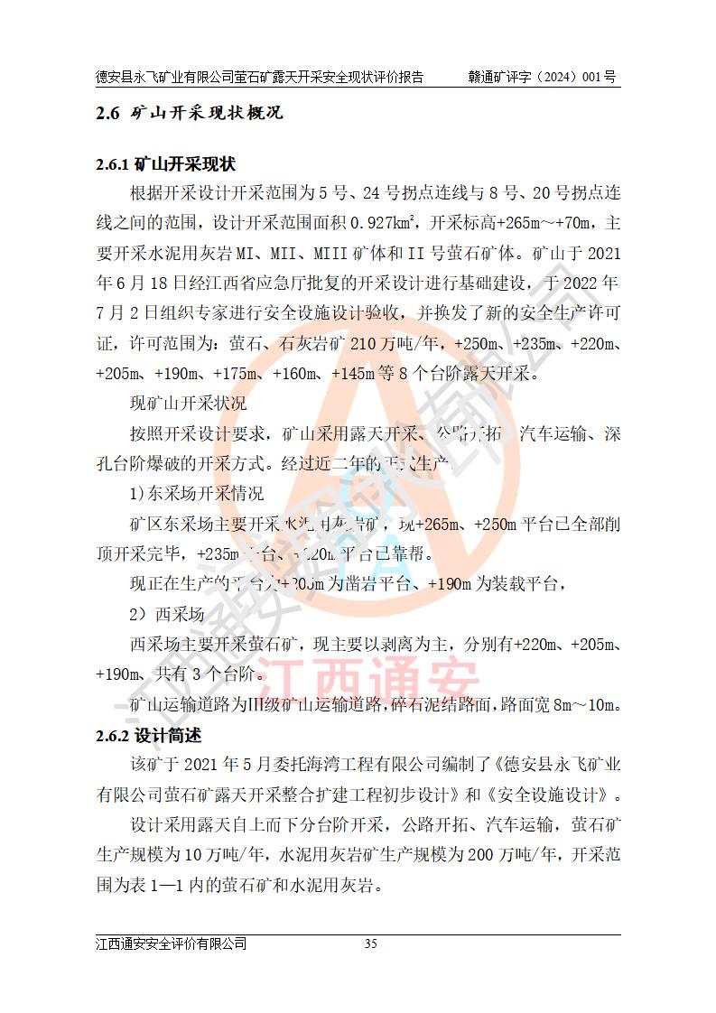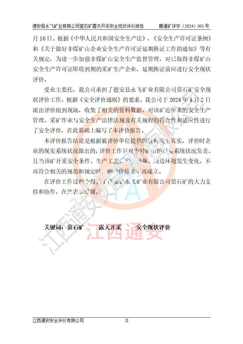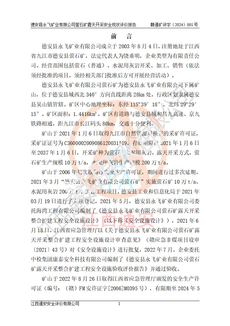 報告名稱 | 德安縣永飛礦業(yè)有限公司螢石礦露天開采安全現(xiàn)狀評價報告 | |||||