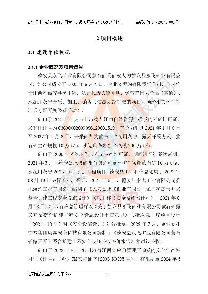 項目簡介 | 德安縣永飛礦業(yè)有限公司成立于2003年8月4日,注冊地址于江西省九江市德安縣螢石礦,法定**人為饒垂明,企業(yè)類型為有限責(zé)任公司。經(jīng)營范圍包括螢石(普通)、水泥用灰?guī)r開采、加工、銷售(依法須經(jīng)批準(zhǔn)的項目,須經(jīng)相關(guān)部門批準(zhǔn)后方可開展經(jīng)營活動)。 德安縣永飛礦業(yè)有限公司螢石礦為德安縣永飛礦業(yè)有限公司下屬礦山,位于德安縣城西北340°方向直線距離28km處,行政區(qū)劃隸屬德安縣吳山鎮(zhèn)管轄。礦區(qū)中心地理坐標(biāo):東經(jīng)115o39′18″,北緯29o29′15″。礦區(qū)面積:1.4416km2。礦區(qū)有道路與德安縣城和昌九高速、京九鐵路相通,距九江市長江碼頭80km,交通十分便利。 礦山于2021年1月6日取得九江市自然資源局換發(fā)的采礦許可證,采礦證證號為C3600002009086120031519,**期限自2021年1月6日至2037年1月6日,開采礦種為螢石、水泥用灰?guī)r,露天開采方式,螢石礦生產(chǎn)規(guī)模10萬t/a,水泥用灰?guī)r生產(chǎn)規(guī)模200萬t/a。 礦山于2006年初次取得過安全生產(chǎn)許可證,期間進(jìn)行過多次延期。2021年3月“德安縣永飛礦業(yè)有限公司螢石礦”實施螢石礦10萬t/a、水泥用灰?guī)r200萬t/a擴(kuò)建工程項目,德安縣工業(yè)和信息化局于2021年03月19日進(jìn)行了立項登記。2021年5月,德安縣永飛礦業(yè)有限公司委托海灣工程有限公司編制了《德安縣永飛礦業(yè)有限公司螢石礦露天開采整合擴(kuò)建工程安全設(shè)施設(shè)計》(以下稱《安全設(shè)施設(shè)計》),2021年6月18日,江西省應(yīng)急管理廳以《關(guān)于德安縣永飛礦業(yè)有限公司螢石礦露天開采整合擴(kuò)建工程安全設(shè)施設(shè)計審查意見》(贛應(yīng)急非煤項目設(shè)審〔2021〕43號)對《安全設(shè)施設(shè)計》進(jìn)行批復(fù),2022年7月,企業(yè)委托中檢集團(tuán)康泰安全科技有限公司編制了《德安縣永飛礦業(yè)有限公司螢石礦露天開采整合擴(kuò)建工程安全設(shè)施驗收評價報告》并通過驗收。 礦山于2022年8月26日取得江西省應(yīng)急管理廳頒發(fā)的安全生產(chǎn)許可證(編號:(贛)FM安許證字[2006]M0395號),有限期至2024年5月10日。根據(jù)《中華人民共和國安全生產(chǎn)法》、《安全生產(chǎn)許可證條例》和《關(guān)于做好非煤礦山企業(yè)安全生產(chǎn)許可證延期換證工作的通知》等有關(guān)規(guī)定。 | |||||