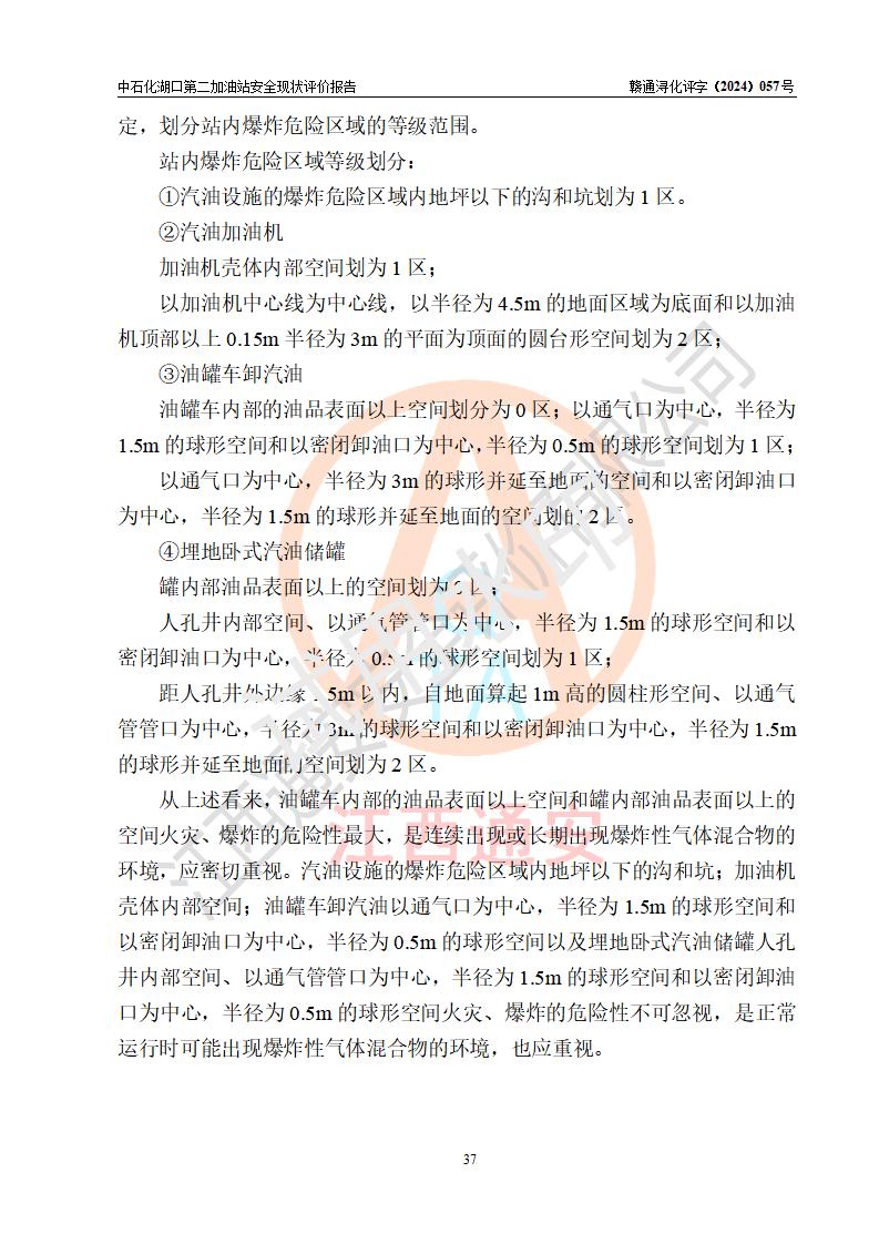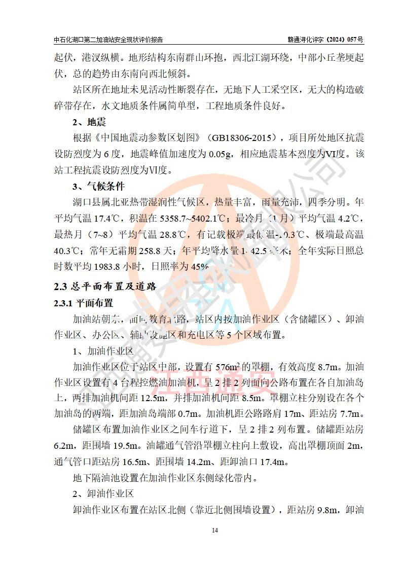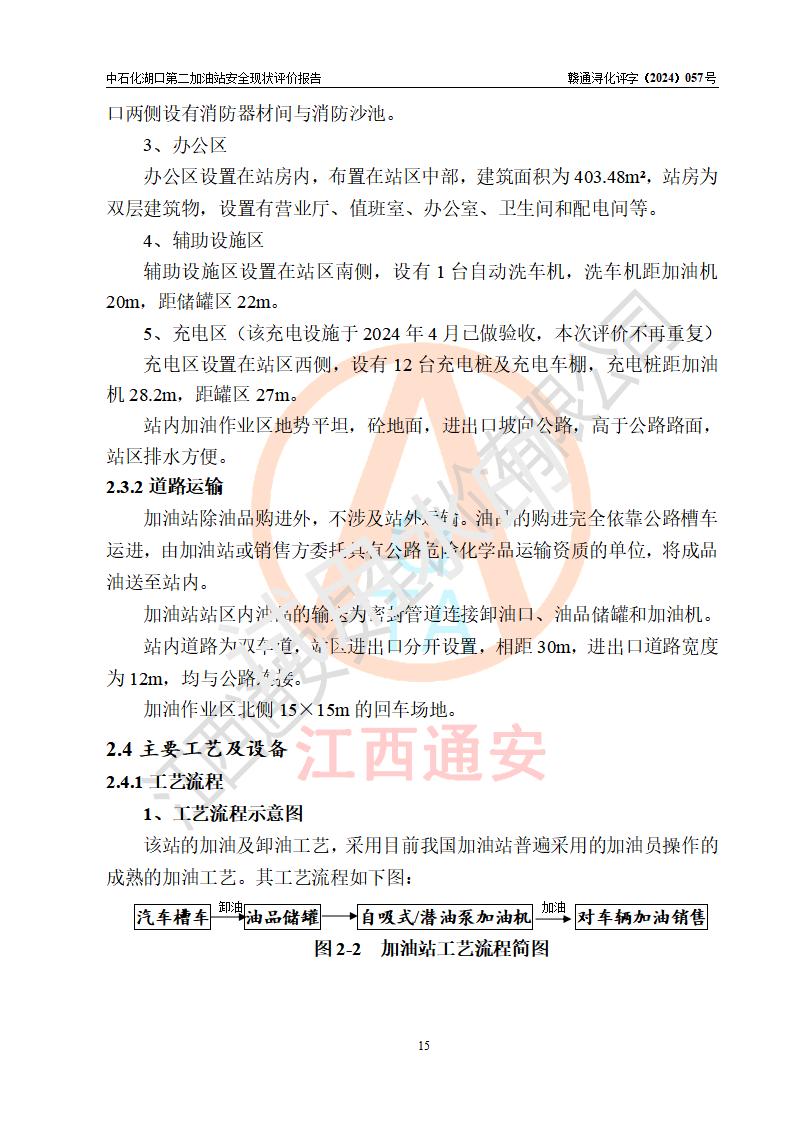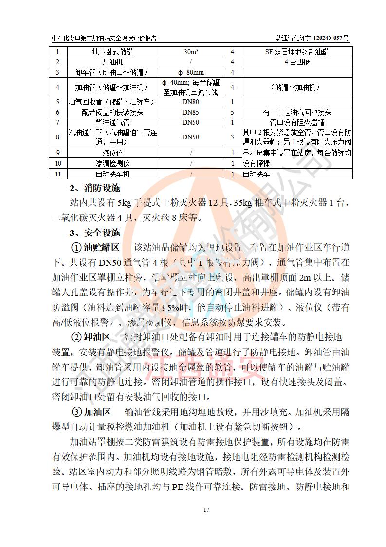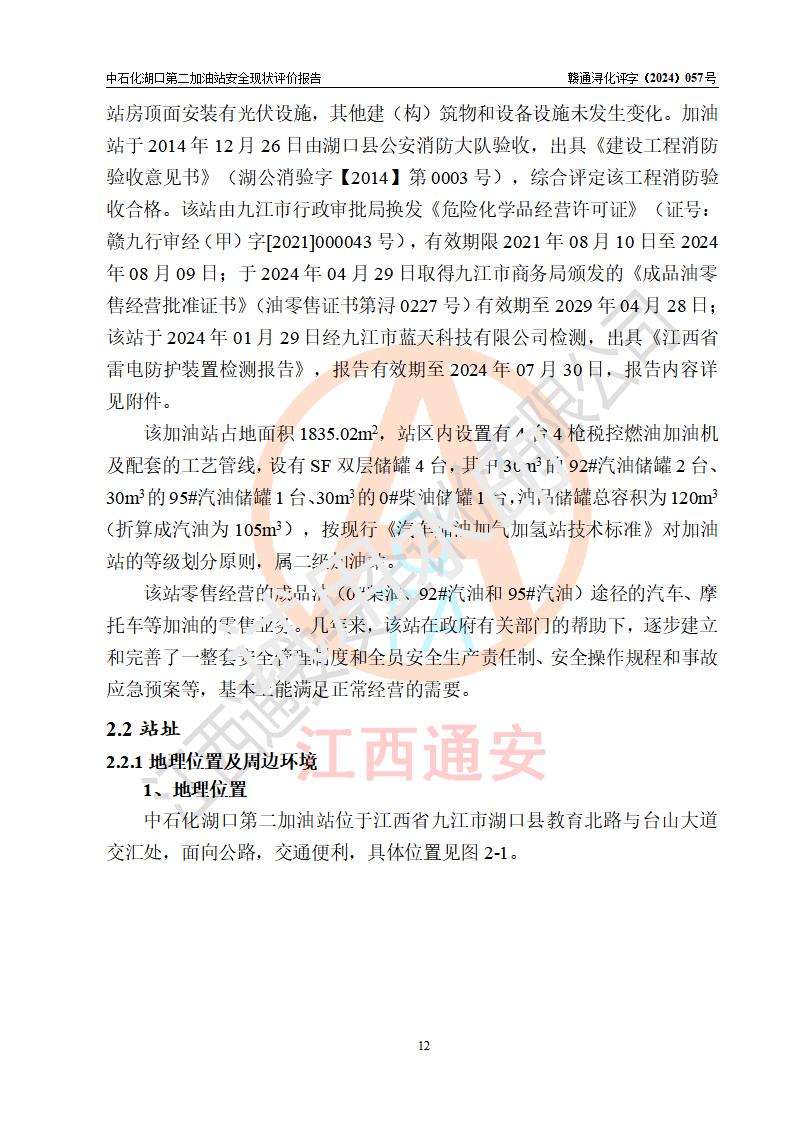 項(xiàng)目簡(jiǎn)介 | 中國(guó)石化銷售股份有限公司江西九江湖口石油分公司第二加油站是一家專門(mén)從事成品油零售經(jīng)營(yíng)的有限公司分公司(外商投資企業(yè)分公司),經(jīng)營(yíng)場(chǎng)所位于江西省九江市湖口縣教育北路與臺(tái)山大道交匯處?,F(xiàn)有從業(yè)人員4名,其中安全管理人員1人,加油站負(fù)責(zé)人熊瑋。 該加油站占地面積1835.02m2,站區(qū)內(nèi)設(shè)置有4臺(tái)4槍稅控燃油加油機(jī)及配套的工藝管線,設(shè)有SF雙層儲(chǔ)罐4臺(tái),其中30m3的92#汽油儲(chǔ)罐2臺(tái)、30m3的95#汽油儲(chǔ)罐1臺(tái)、30m3的0#柴油儲(chǔ)罐1臺(tái),油品儲(chǔ)罐總?cè)莘e為120m3(折算成汽油為105m3),按現(xiàn)行《汽車加油加氣加氫站技術(shù)標(biāo)準(zhǔn)》對(duì)加油站的等級(jí)劃分原則,屬二級(jí)加油站。 該站由九江市行政審批局換發(fā)《危險(xiǎn)化學(xué)品經(jīng)營(yíng)許可證》(證號(hào):贛九行審經(jīng)(甲)字[2021]000043號(hào)),**期限2021年08月10日至2024年08月09日。 | |||