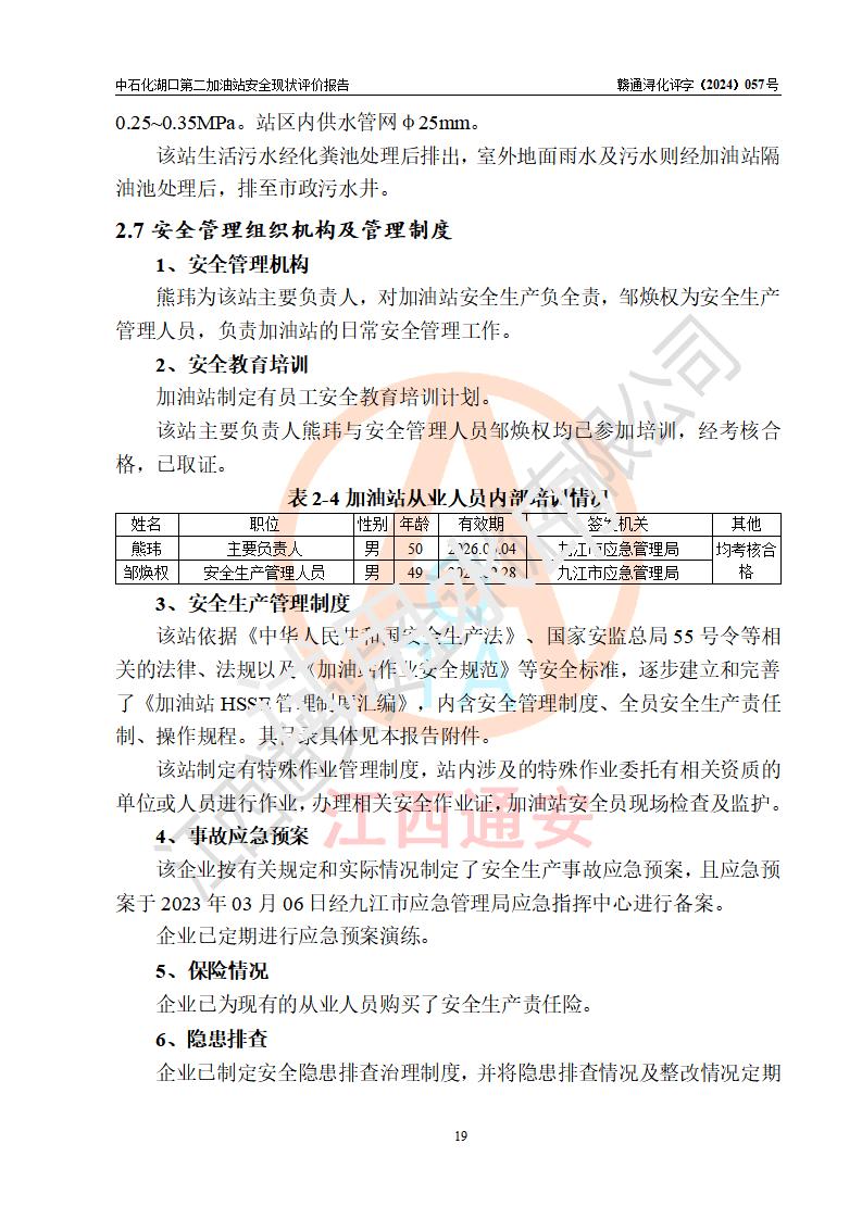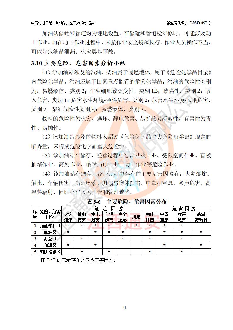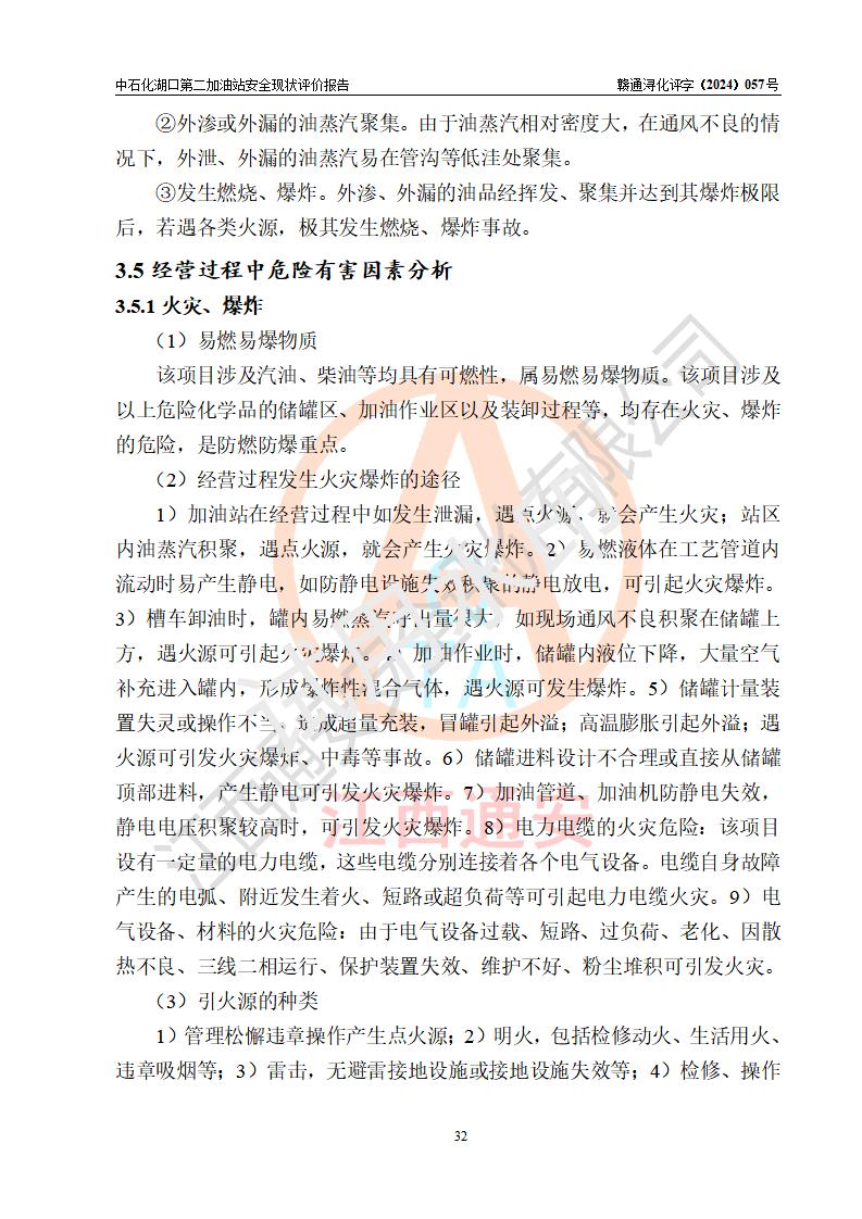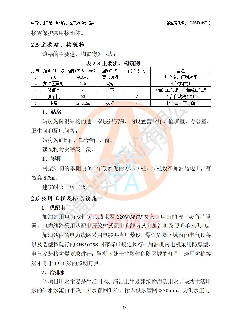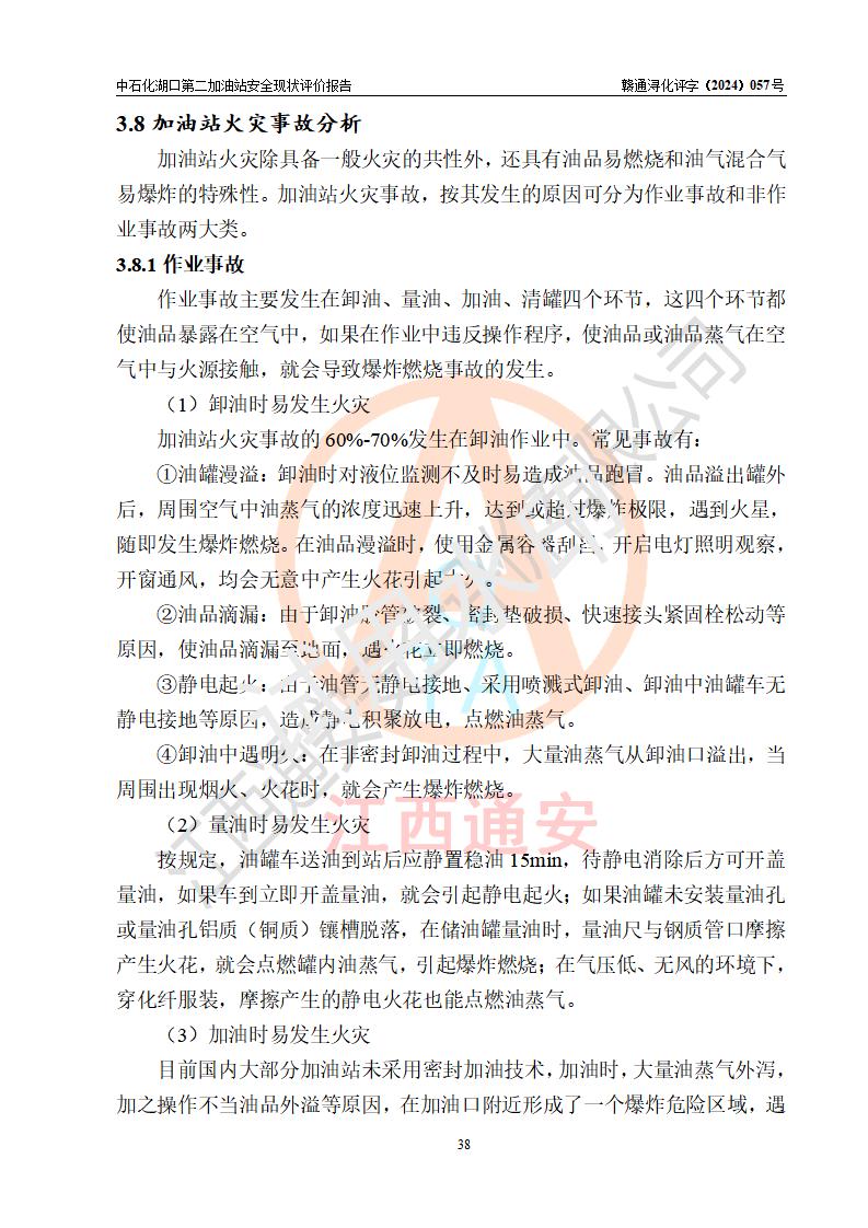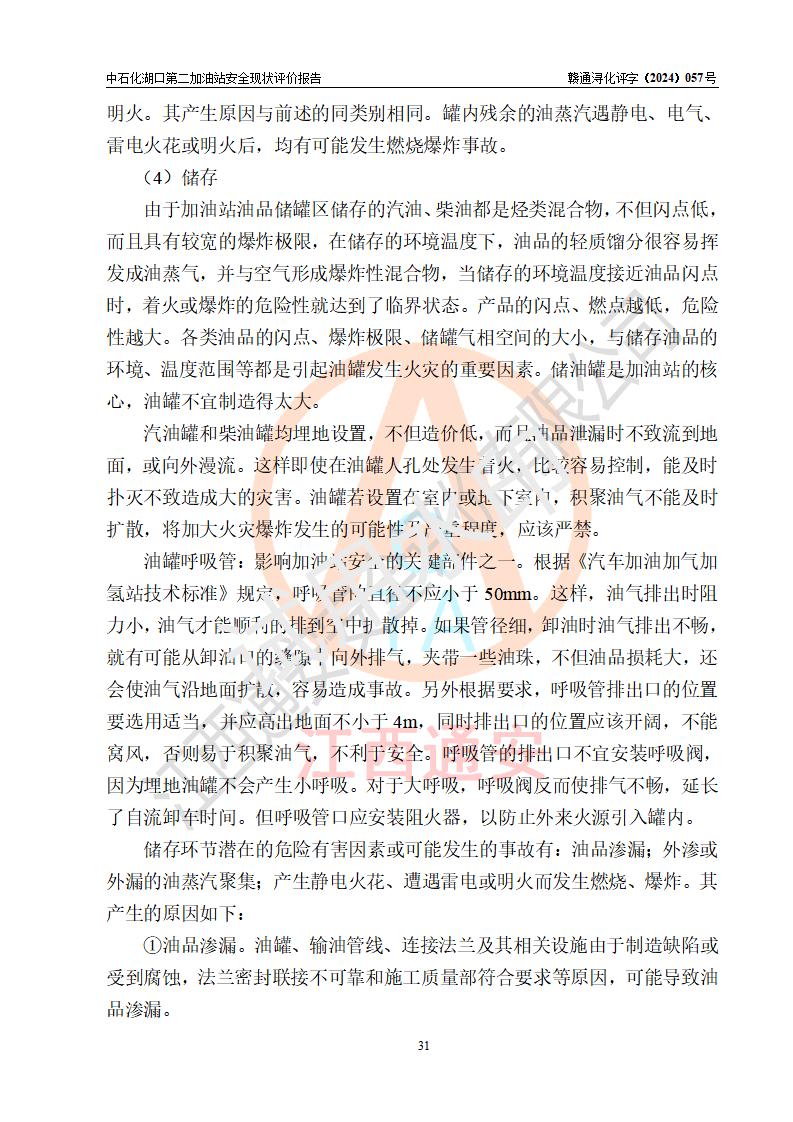 項(xiàng)目簡(jiǎn)介 | 中國(guó)石化銷售股份有限公司江西九江湖口石油分公司第二加油站是一家專門(mén)從事成品油零售經(jīng)營(yíng)的有限公司分公司(外商投資企業(yè)分公司),經(jīng)營(yíng)場(chǎng)所位于江西省九江市湖口縣教育北路與臺(tái)山大道交匯處?,F(xiàn)有從業(yè)人員4名,其中安全管理人員1人,加油站負(fù)責(zé)人熊瑋。 該加油站占地面積1835.02m2,站區(qū)內(nèi)設(shè)置有4臺(tái)4槍稅控燃油加油機(jī)及配套的工藝管線,設(shè)有SF雙層儲(chǔ)罐4臺(tái),其中30m3的92#汽油儲(chǔ)罐2臺(tái)、30m3的95#汽油儲(chǔ)罐1臺(tái)、30m3的0#柴油儲(chǔ)罐1臺(tái),油品儲(chǔ)罐總?cè)莘e為120m3(折算成汽油為105m3),按現(xiàn)行《汽車加油加氣加氫站技術(shù)標(biāo)準(zhǔn)》對(duì)加油站的等級(jí)劃分原則,屬二級(jí)加油站。 該站由九江市行政審批局換發(fā)《危險(xiǎn)化學(xué)品經(jīng)營(yíng)許可證》(證號(hào):贛九行審經(jīng)(甲)字[2021]000043號(hào)),**期限2021年08月10日至2024年08月09日。 | |||