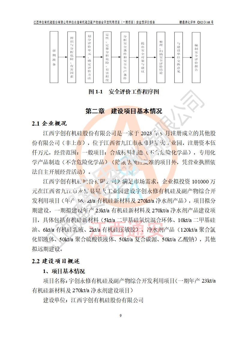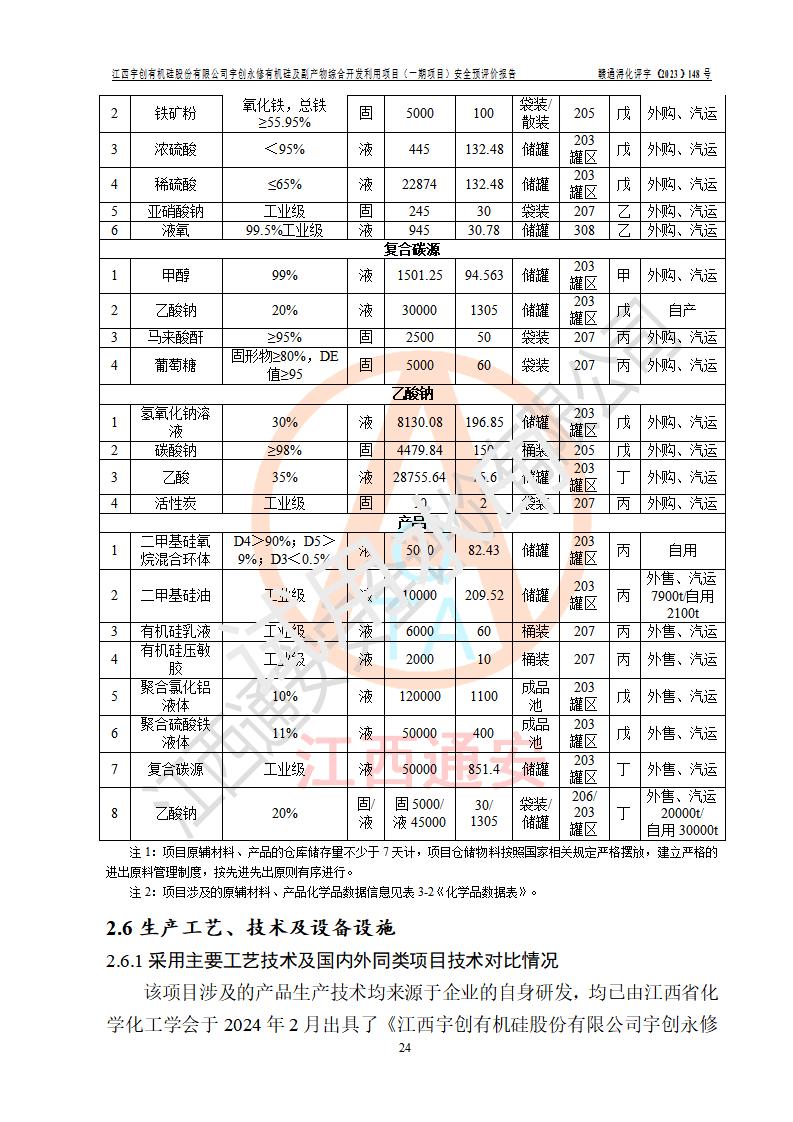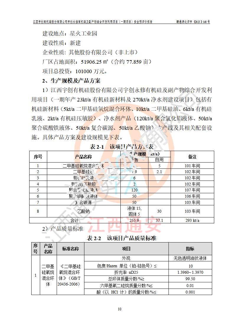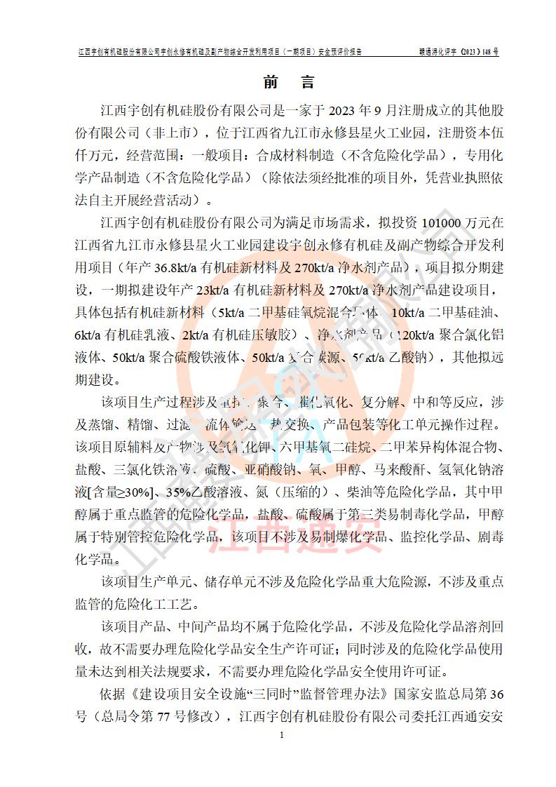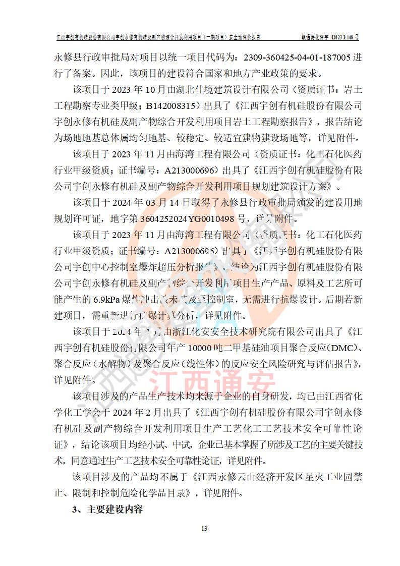 項(xiàng)目簡(jiǎn)介 | 江西宇創(chuàng)有機(jī)硅股份有限公司是一家于2023年9月注冊(cè)成立的其他股份有限公司(非上市),位于江西省九江市永修縣星火工業(yè)園,注冊(cè)資本伍仟萬元,經(jīng)營(yíng)范圍:一般項(xiàng)目:合成材料制造(不含危險(xiǎn)化學(xué)品),**化學(xué)產(chǎn)品制造(不含危險(xiǎn)化學(xué)品)(除依法須經(jīng)批準(zhǔn)的項(xiàng)目外,憑營(yíng)業(yè)執(zhí)照依法自主開展經(jīng)營(yíng)活動(dòng))。 江西宇創(chuàng)有機(jī)硅股份有限公司為滿足市場(chǎng)需求,企業(yè)擬投資101000萬元在江西省九江市永修縣星火工業(yè)園建設(shè)宇創(chuàng)永修有機(jī)硅及副產(chǎn)物綜合開發(fā)利用項(xiàng)目(年產(chǎn)36.8kt/a有機(jī)硅新材料及270kt/a凈水劑產(chǎn)品),項(xiàng)目擬分期建設(shè),一期擬建設(shè)年產(chǎn)23kt/a有機(jī)硅新材料及270kt/a凈水劑產(chǎn)品建設(shè)項(xiàng)目,具體包括有機(jī)硅新材料(5kt/a二甲基硅氧烷混合環(huán)體、10kt/a二甲基硅油、6kt/a有機(jī)硅乳液、2kt/a有機(jī)硅壓敏膠)、凈水劑產(chǎn)品(120kt/a聚合氯化鋁液體、50kt/a聚合硫酸鐵液體、50kt/a復(fù)合碳源、50kt/a乙酸鈉),其他擬遠(yuǎn)期建設(shè)。 | |||||