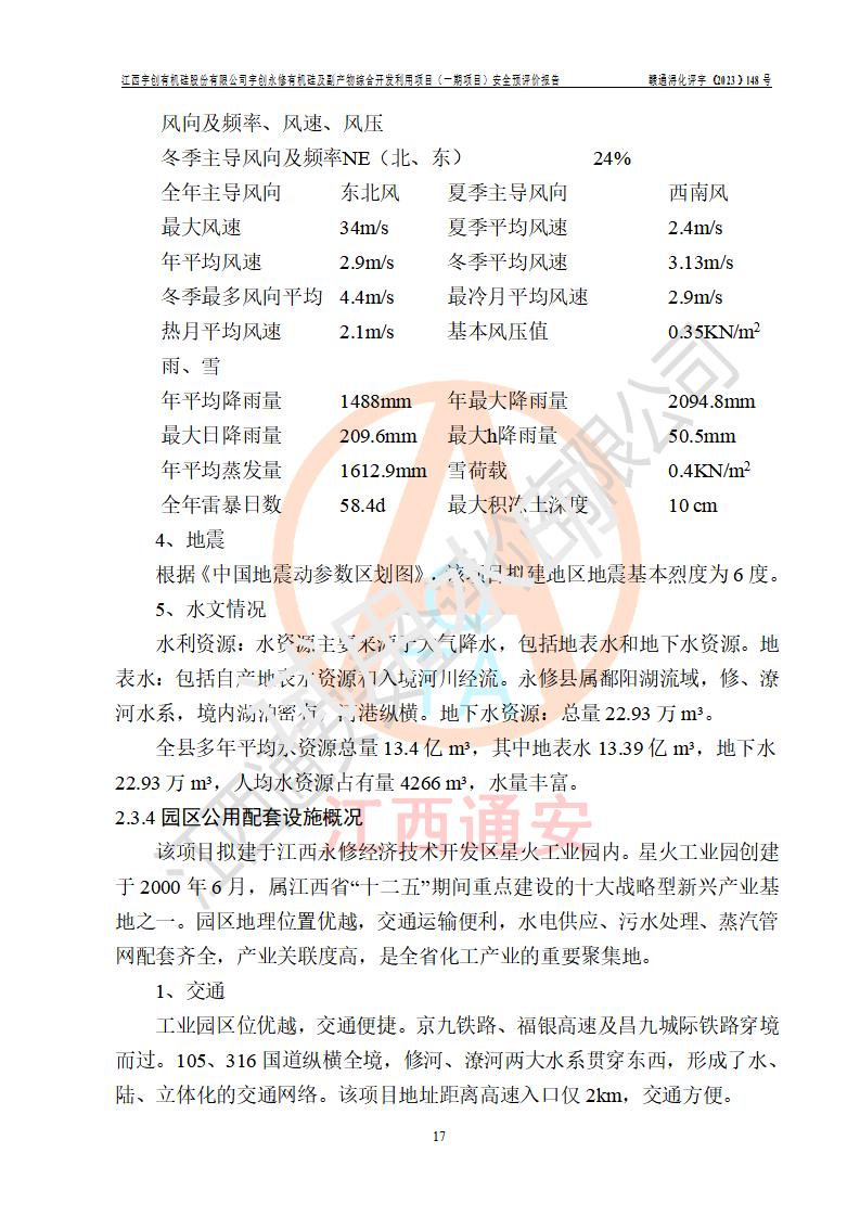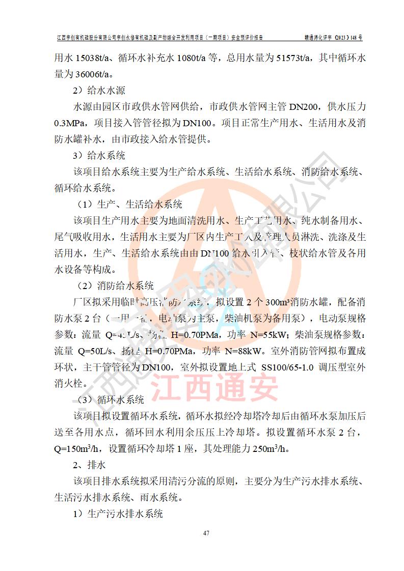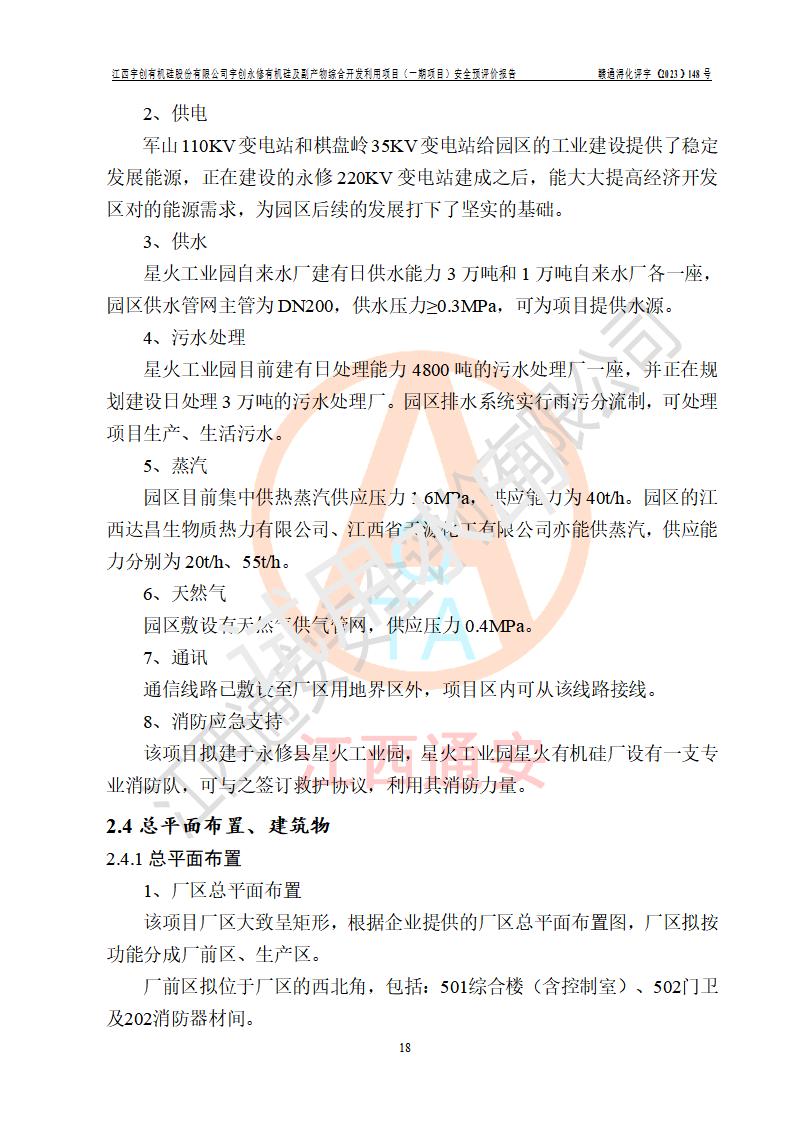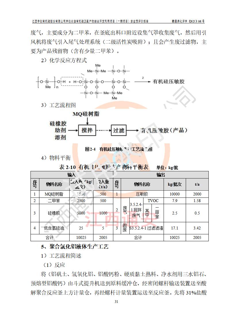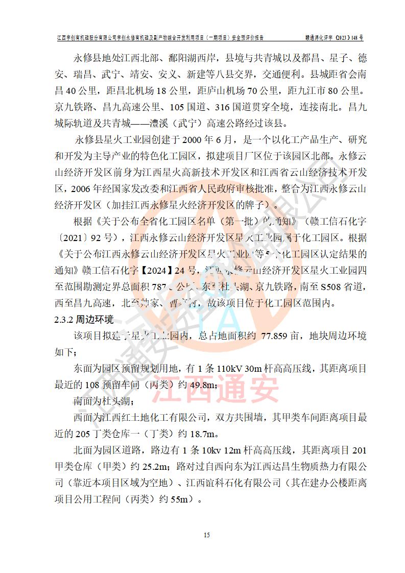 項(xiàng)目簡(jiǎn)介 | 江西宇創(chuàng)有機(jī)硅股份有限公司是一家于2023年9月注冊(cè)成立的其他股份有限公司(非上市),位于江西省九江市永修縣星火工業(yè)園,注冊(cè)資本伍仟萬元,經(jīng)營(yíng)范圍:一般項(xiàng)目:合成材料制造(不含危險(xiǎn)化學(xué)品),**化學(xué)產(chǎn)品制造(不含危險(xiǎn)化學(xué)品)(除依法須經(jīng)批準(zhǔn)的項(xiàng)目外,憑營(yíng)業(yè)執(zhí)照依法自主開展經(jīng)營(yíng)活動(dòng))。 江西宇創(chuàng)有機(jī)硅股份有限公司為滿足市場(chǎng)需求,企業(yè)擬投資101000萬元在江西省九江市永修縣星火工業(yè)園建設(shè)宇創(chuàng)永修有機(jī)硅及副產(chǎn)物綜合開發(fā)利用項(xiàng)目(年產(chǎn)36.8kt/a有機(jī)硅新材料及270kt/a凈水劑產(chǎn)品),項(xiàng)目擬分期建設(shè),一期擬建設(shè)年產(chǎn)23kt/a有機(jī)硅新材料及270kt/a凈水劑產(chǎn)品建設(shè)項(xiàng)目,具體包括有機(jī)硅新材料(5kt/a二甲基硅氧烷混合環(huán)體、10kt/a二甲基硅油、6kt/a有機(jī)硅乳液、2kt/a有機(jī)硅壓敏膠)、凈水劑產(chǎn)品(120kt/a聚合氯化鋁液體、50kt/a聚合硫酸鐵液體、50kt/a復(fù)合碳源、50kt/a乙酸鈉),其他擬遠(yuǎn)期建設(shè)。 | |||||