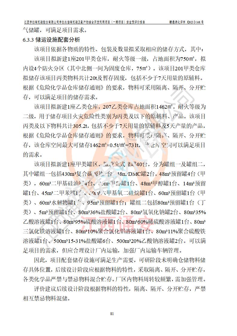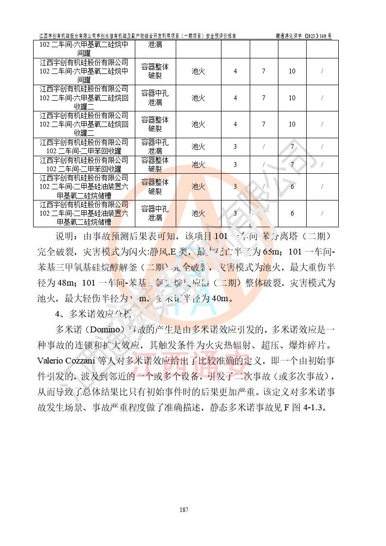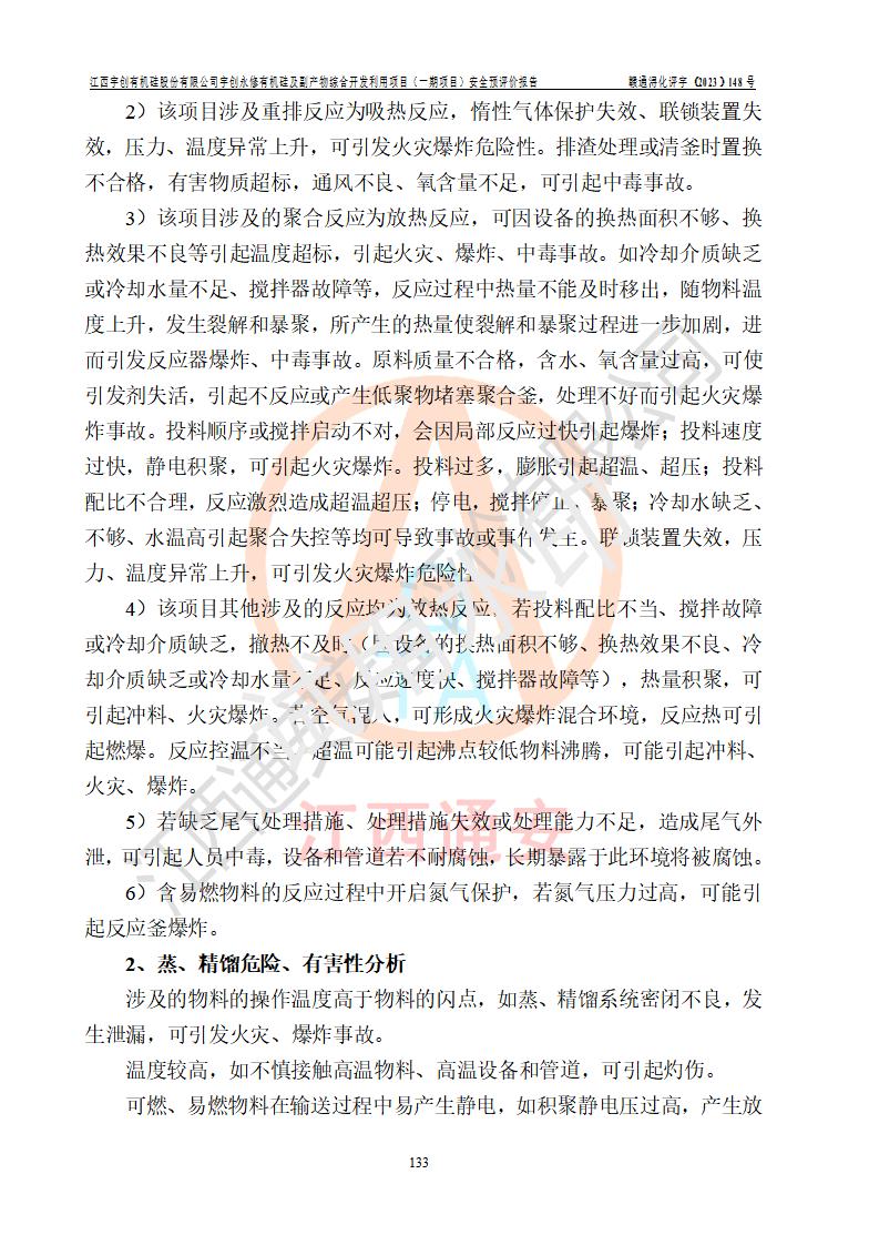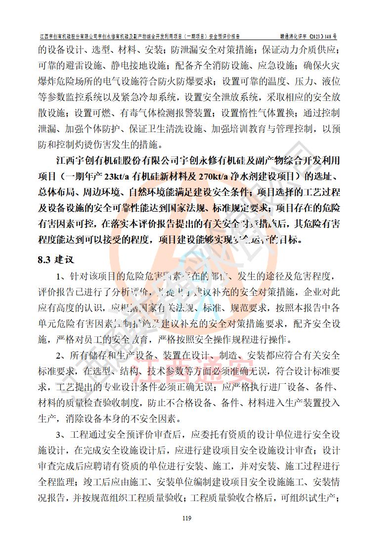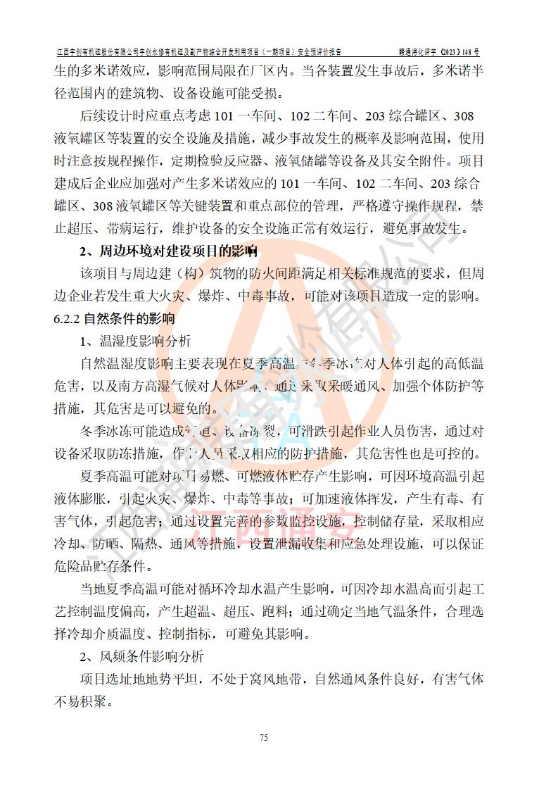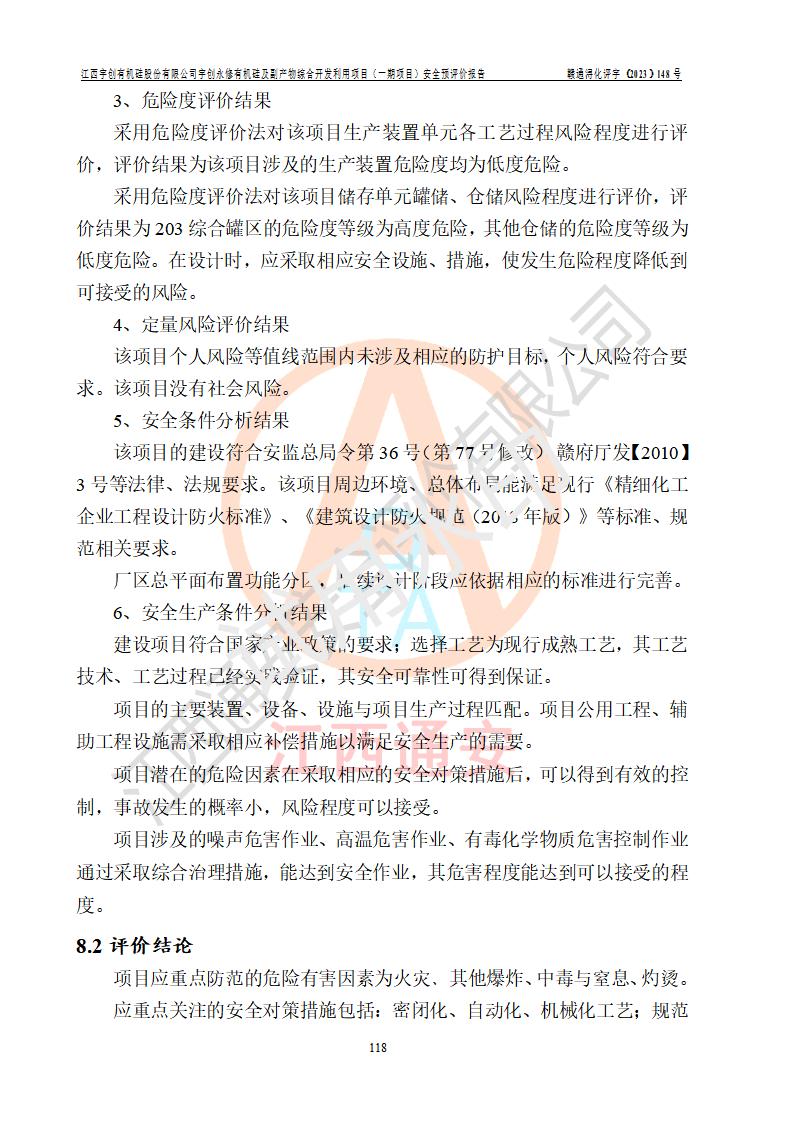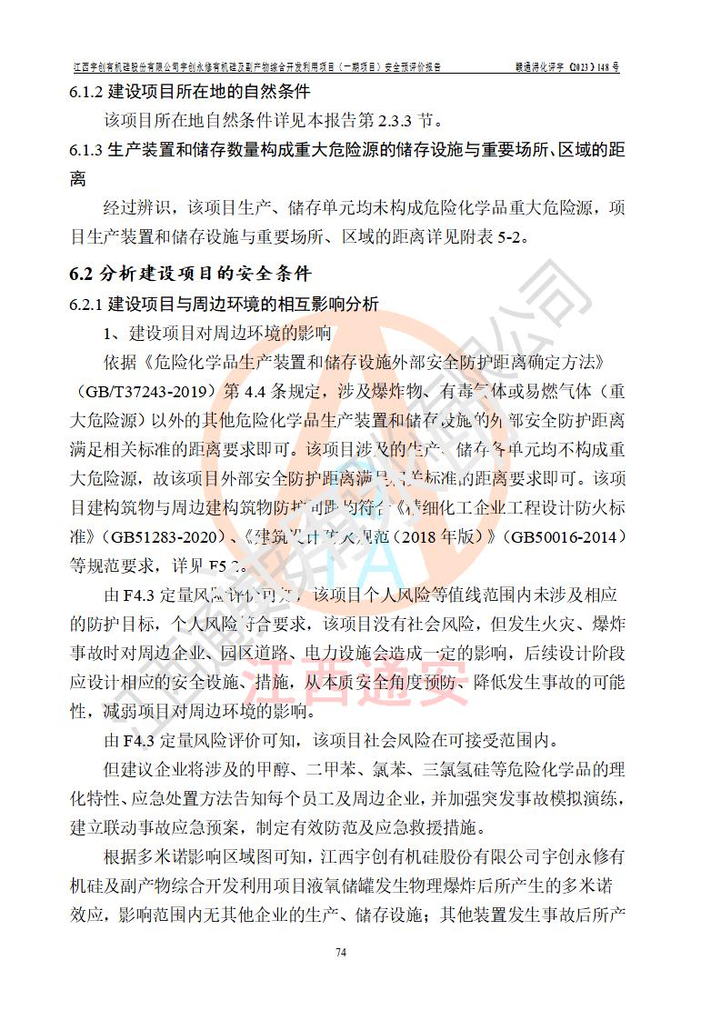 評(píng)價(jià)結(jié)論 | 江西宇創(chuàng)有機(jī)硅股份有限公司宇創(chuàng)永修有機(jī)硅及副產(chǎn)物綜合開發(fā)利用項(xiàng)目(一期年產(chǎn)23kt/a有機(jī)硅新材料及270kt/a凈水劑建設(shè)項(xiàng)目)的選址、總體布局、周邊環(huán)境、自然環(huán)境能滿足建設(shè)安全條件;項(xiàng)目選擇的工藝過程及設(shè)備設(shè)施的安全可靠性能達(dá)到**法規(guī)、標(biāo)準(zhǔn)規(guī)定要求;項(xiàng)目存在的危險(xiǎn)有害因素可控,在落實(shí)本評(píng)價(jià)報(bào)告提出的有關(guān)安全對(duì)策措施后,其危險(xiǎn)有害程度能達(dá)到可以接受的程度,項(xiàng)目建設(shè)能夠?qū)崿F(xiàn)安全運(yùn)行的目標(biāo)。 | |||||