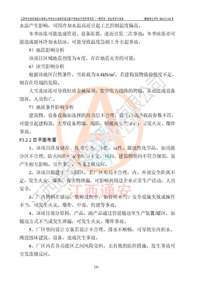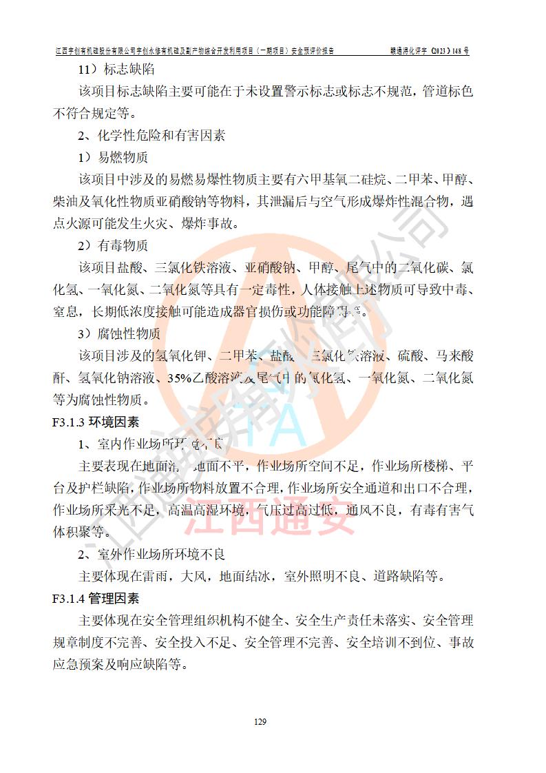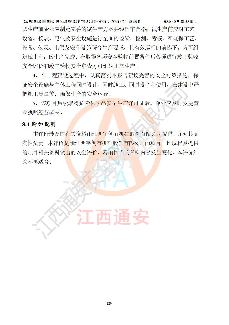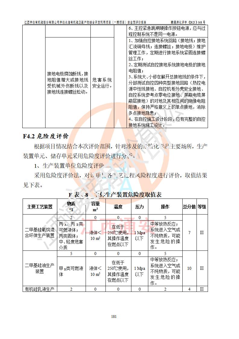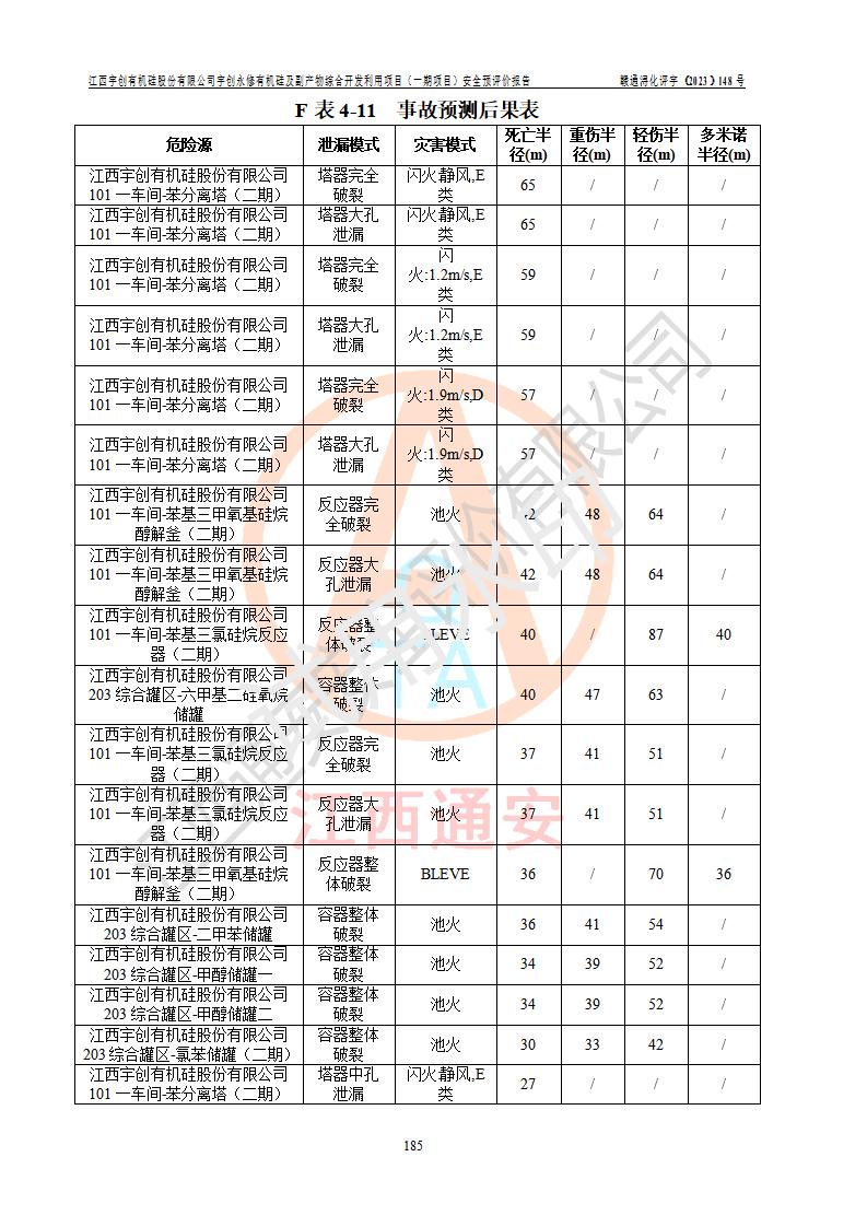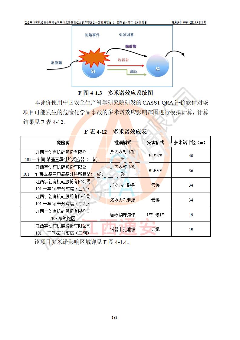 評(píng)價(jià)結(jié)論 | 江西宇創(chuàng)有機(jī)硅股份有限公司宇創(chuàng)永修有機(jī)硅及副產(chǎn)物綜合開發(fā)利用項(xiàng)目(一期年產(chǎn)23kt/a有機(jī)硅新材料及270kt/a凈水劑建設(shè)項(xiàng)目)的選址、總體布局、周邊環(huán)境、自然環(huán)境能滿足建設(shè)安全條件;項(xiàng)目選擇的工藝過程及設(shè)備設(shè)施的安全可靠性能達(dá)到**法規(guī)、標(biāo)準(zhǔn)規(guī)定要求;項(xiàng)目存在的危險(xiǎn)有害因素可控,在落實(shí)本評(píng)價(jià)報(bào)告提出的有關(guān)安全對(duì)策措施后,其危險(xiǎn)有害程度能達(dá)到可以接受的程度,項(xiàng)目建設(shè)能夠?qū)崿F(xiàn)安全運(yùn)行的目標(biāo)。 | |||||