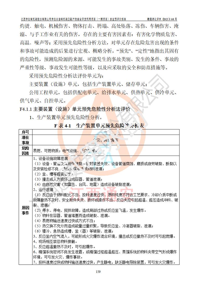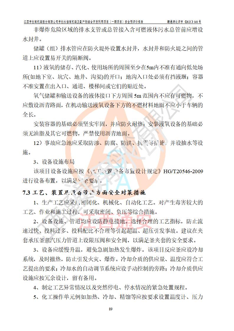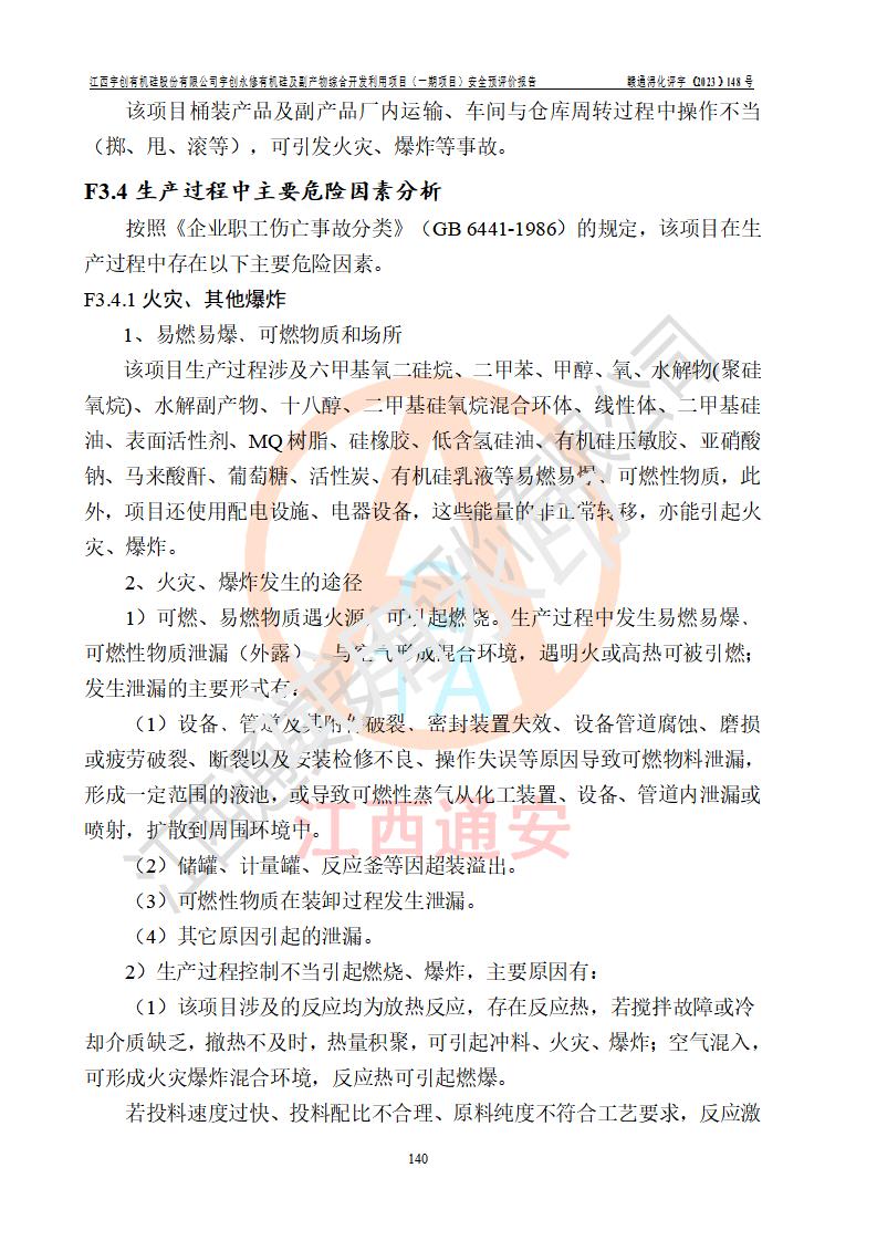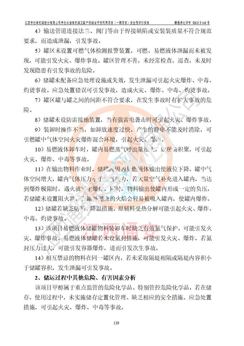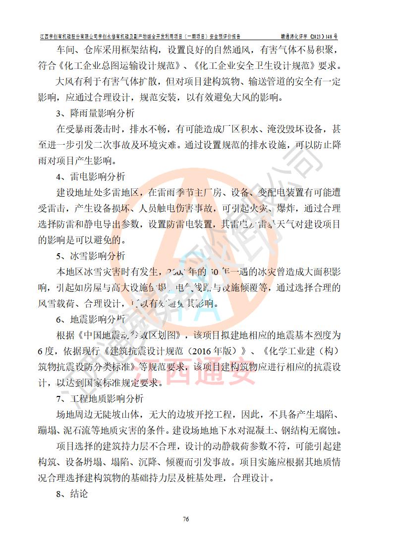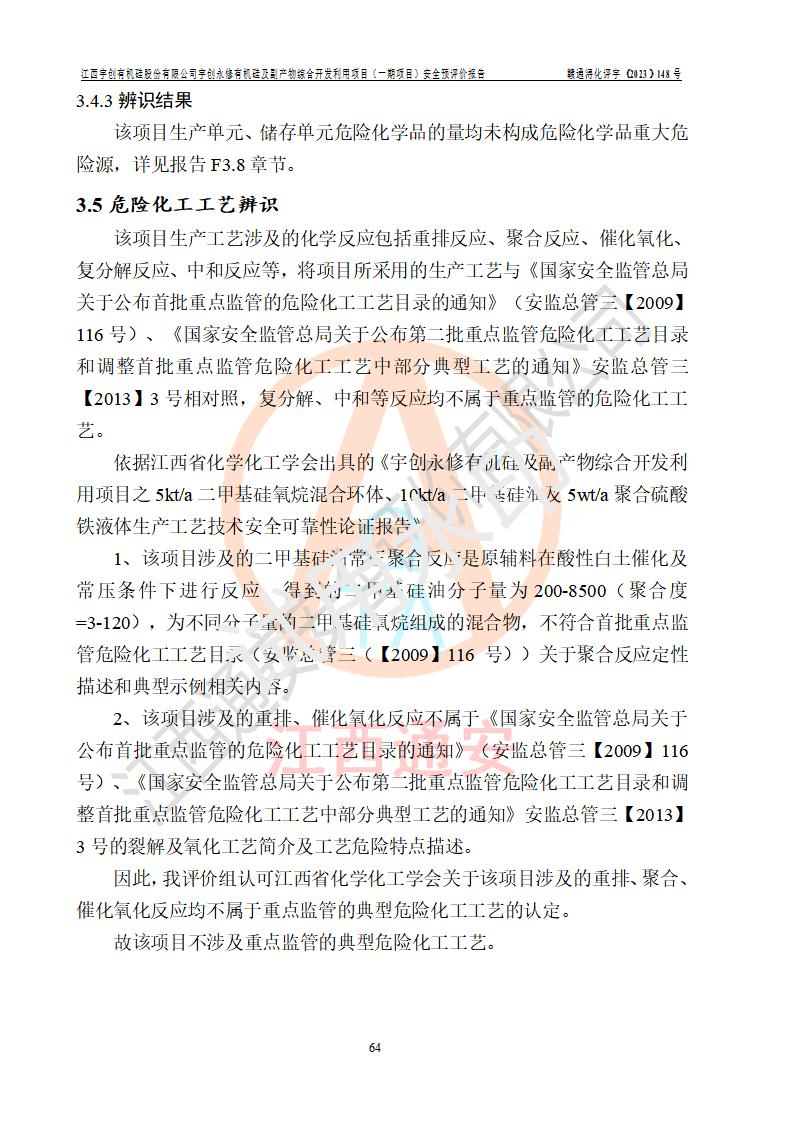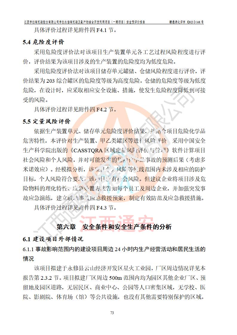 評(píng)價(jià)結(jié)論 | 江西宇創(chuàng)有機(jī)硅股份有限公司宇創(chuàng)永修有機(jī)硅及副產(chǎn)物綜合開發(fā)利用項(xiàng)目(一期年產(chǎn)23kt/a有機(jī)硅新材料及270kt/a凈水劑建設(shè)項(xiàng)目)的選址、總體布局、周邊環(huán)境、自然環(huán)境能滿足建設(shè)安全條件;項(xiàng)目選擇的工藝過程及設(shè)備設(shè)施的安全可靠性能達(dá)到**法規(guī)、標(biāo)準(zhǔn)規(guī)定要求;項(xiàng)目存在的危險(xiǎn)有害因素可控,在落實(shí)本評(píng)價(jià)報(bào)告提出的有關(guān)安全對(duì)策措施后,其危險(xiǎn)有害程度能達(dá)到可以接受的程度,項(xiàng)目建設(shè)能夠?qū)崿F(xiàn)安全運(yùn)行的目標(biāo)。 | |||||