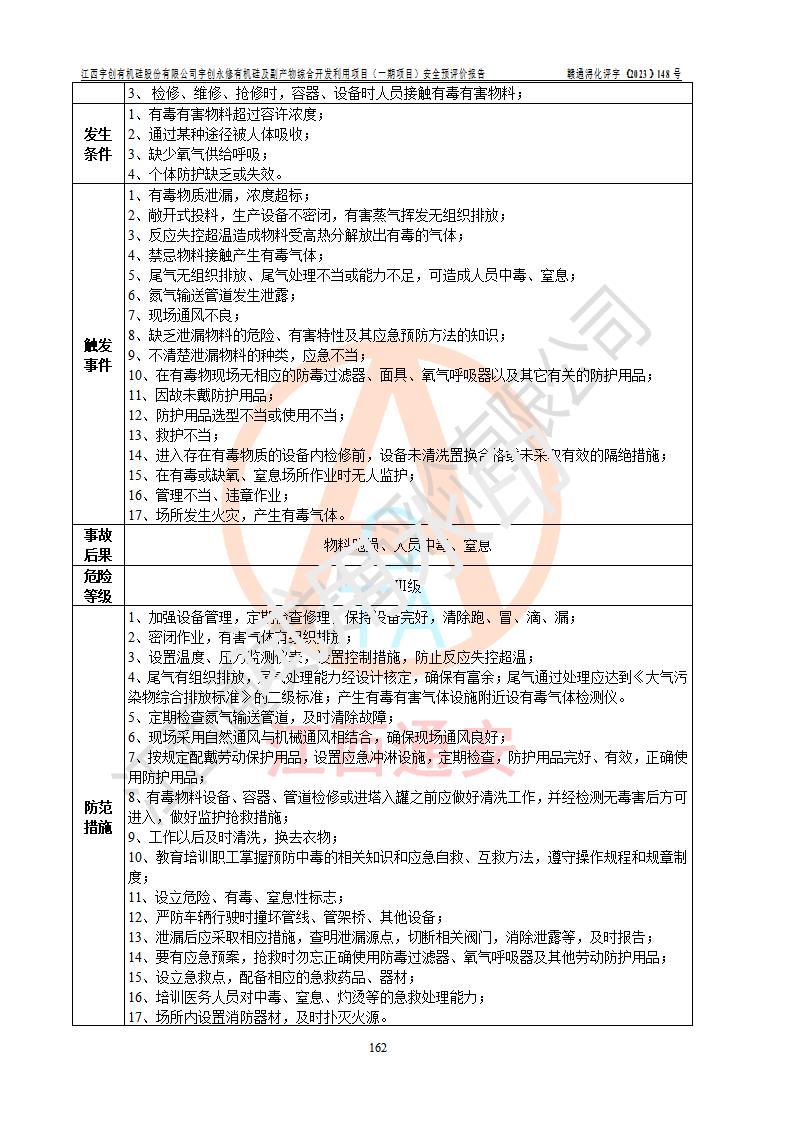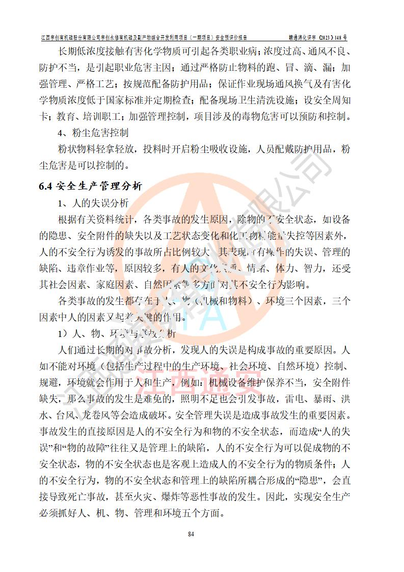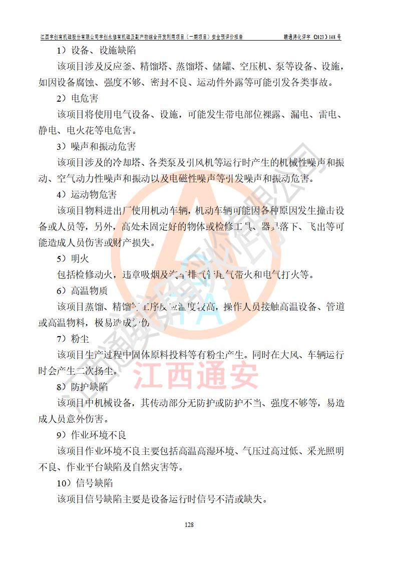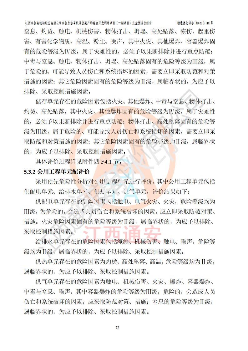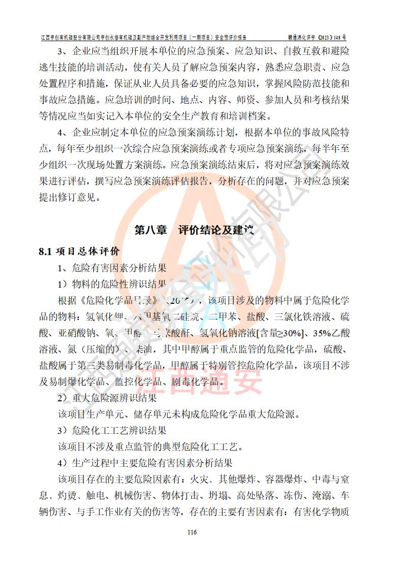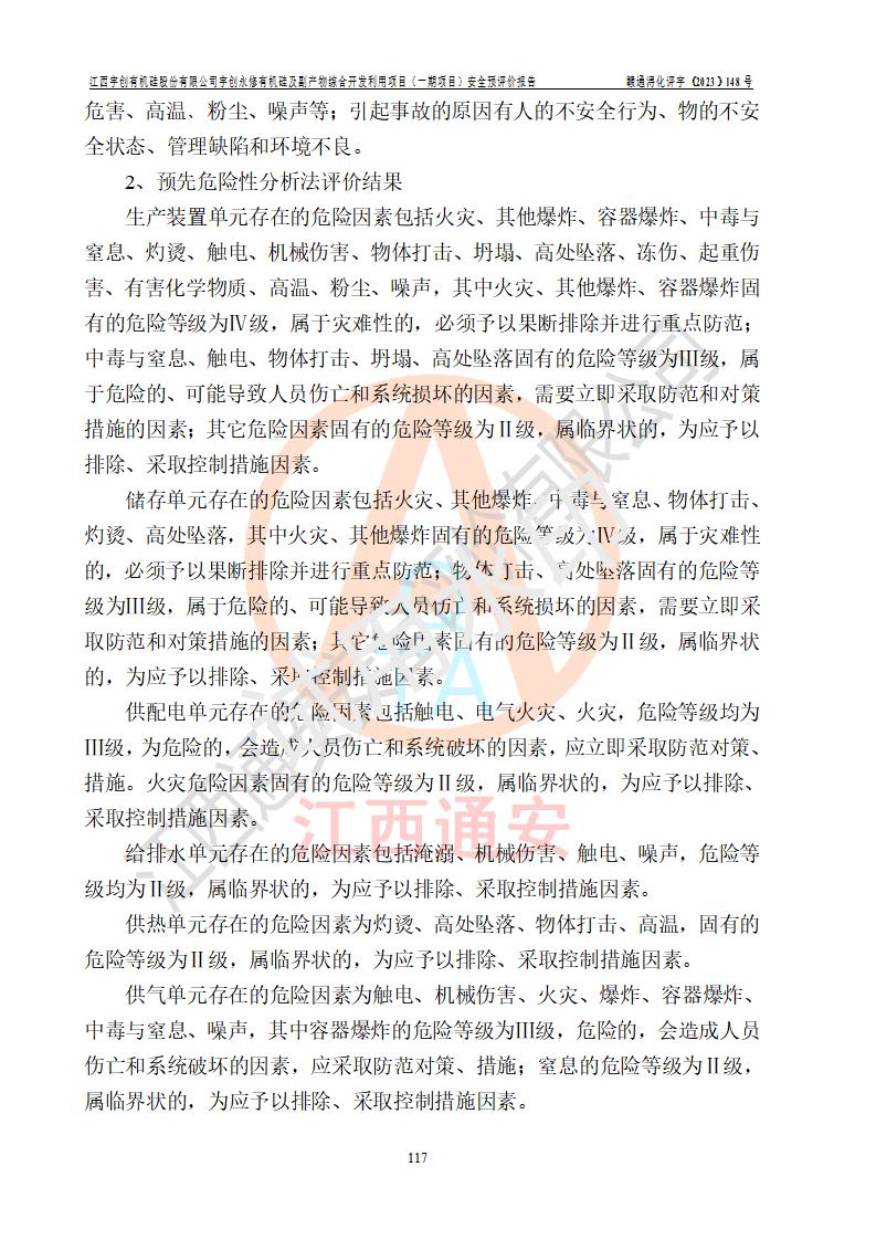 評(píng)價(jià)結(jié)論 | 江西宇創(chuàng)有機(jī)硅股份有限公司宇創(chuàng)永修有機(jī)硅及副產(chǎn)物綜合開發(fā)利用項(xiàng)目(一期年產(chǎn)23kt/a有機(jī)硅新材料及270kt/a凈水劑建設(shè)項(xiàng)目)的選址、總體布局、周邊環(huán)境、自然環(huán)境能滿足建設(shè)安全條件;項(xiàng)目選擇的工藝過程及設(shè)備設(shè)施的安全可靠性能達(dá)到**法規(guī)、標(biāo)準(zhǔn)規(guī)定要求;項(xiàng)目存在的危險(xiǎn)有害因素可控,在落實(shí)本評(píng)價(jià)報(bào)告提出的有關(guān)安全對(duì)策措施后,其危險(xiǎn)有害程度能達(dá)到可以接受的程度,項(xiàng)目建設(shè)能夠?qū)崿F(xiàn)安全運(yùn)行的目標(biāo)。 | |||||