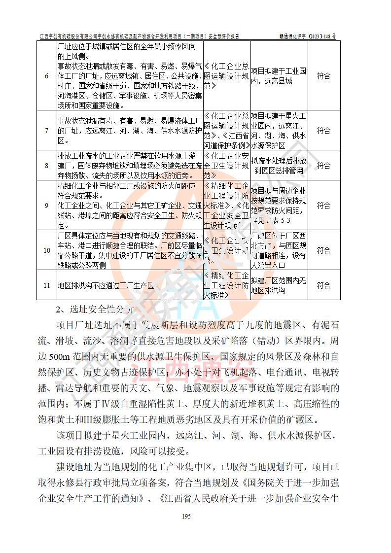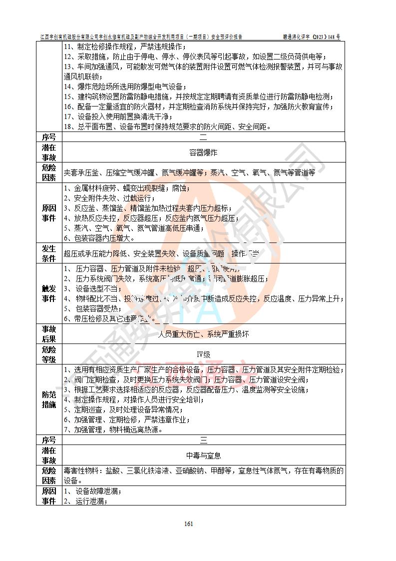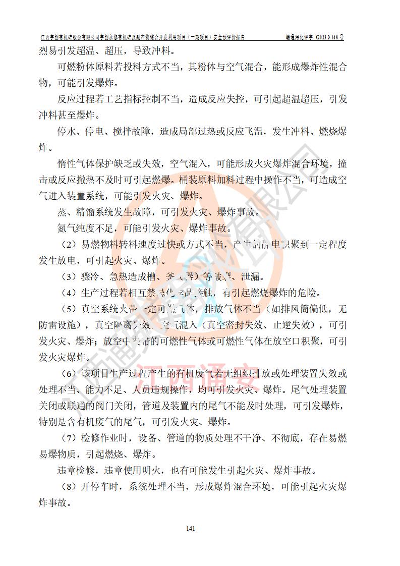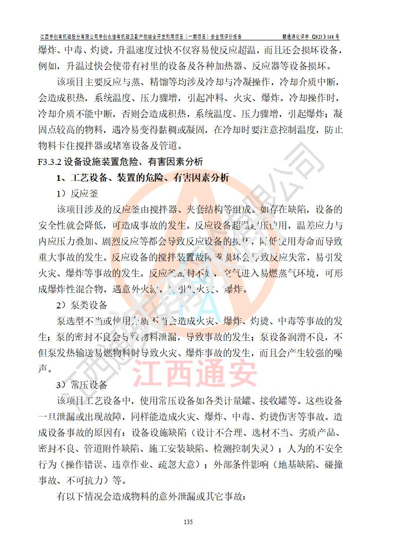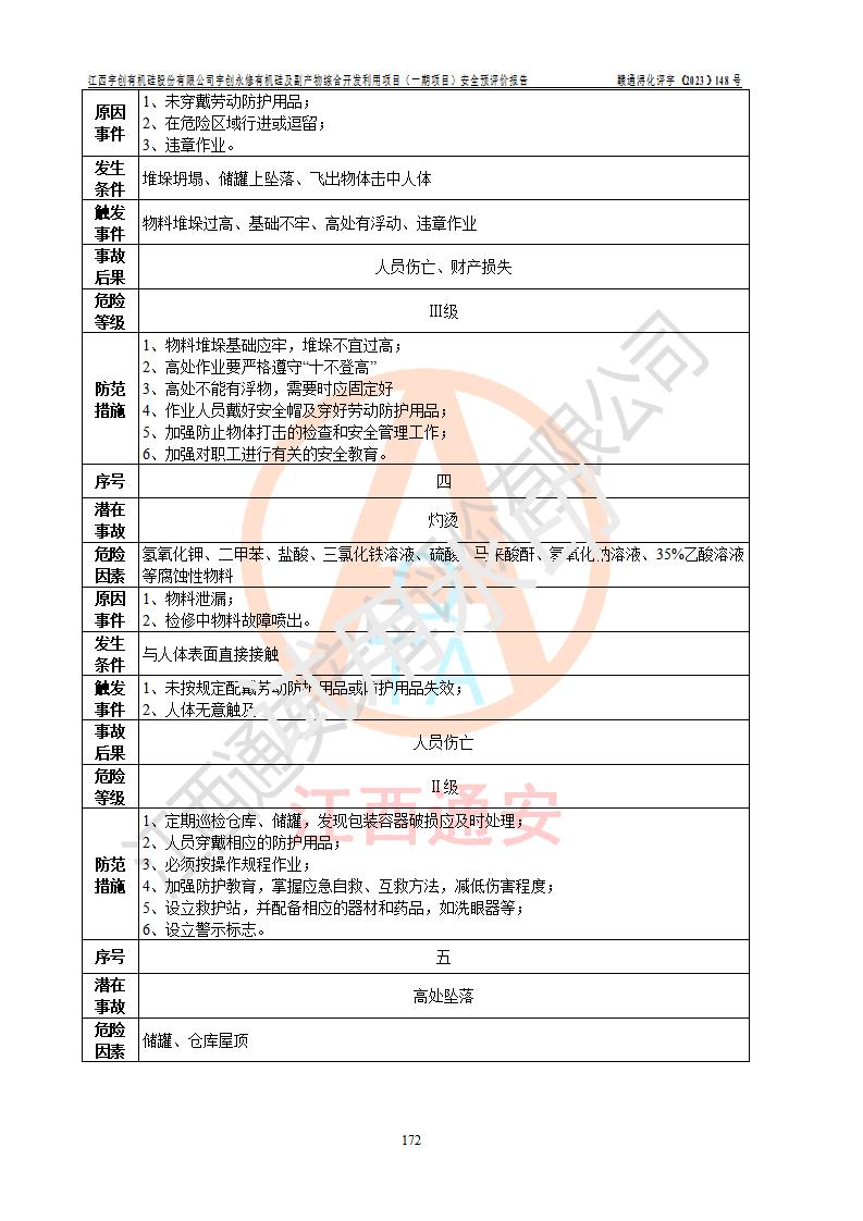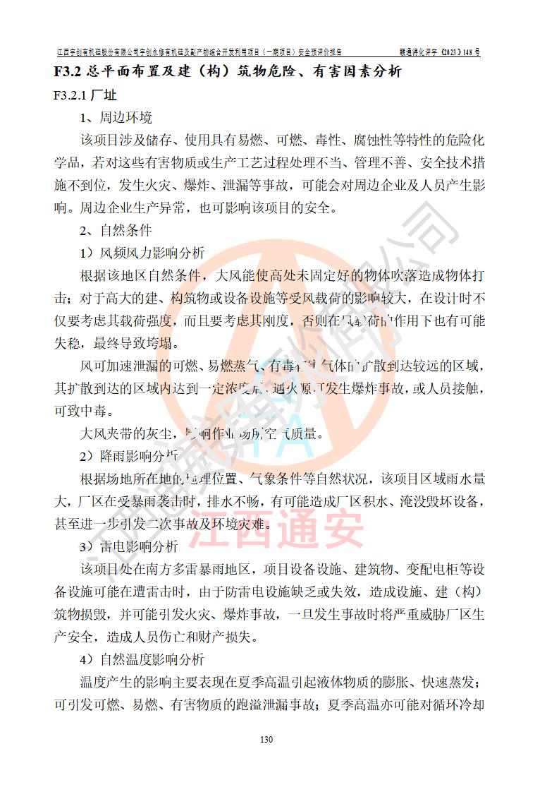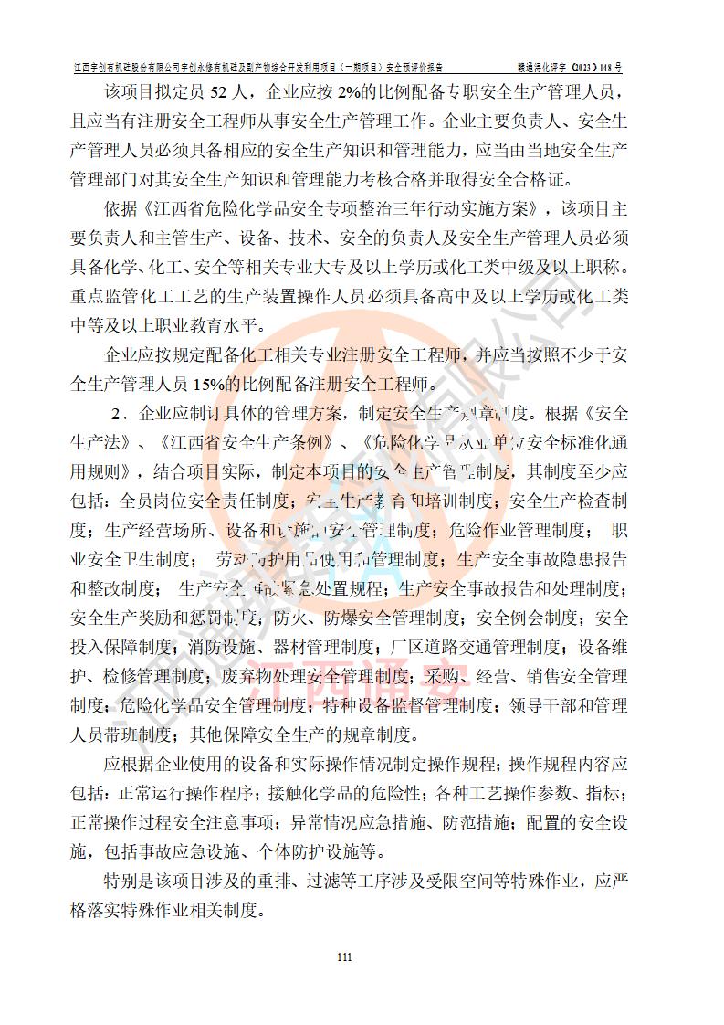 評(píng)價(jià)結(jié)論 | 江西宇創(chuàng)有機(jī)硅股份有限公司宇創(chuàng)永修有機(jī)硅及副產(chǎn)物綜合開發(fā)利用項(xiàng)目(一期年產(chǎn)23kt/a有機(jī)硅新材料及270kt/a凈水劑建設(shè)項(xiàng)目)的選址、總體布局、周邊環(huán)境、自然環(huán)境能滿足建設(shè)安全條件;項(xiàng)目選擇的工藝過程及設(shè)備設(shè)施的安全可靠性能達(dá)到**法規(guī)、標(biāo)準(zhǔn)規(guī)定要求;項(xiàng)目存在的危險(xiǎn)有害因素可控,在落實(shí)本評(píng)價(jià)報(bào)告提出的有關(guān)安全對(duì)策措施后,其危險(xiǎn)有害程度能達(dá)到可以接受的程度,項(xiàng)目建設(shè)能夠?qū)崿F(xiàn)安全運(yùn)行的目標(biāo)。 | |||||