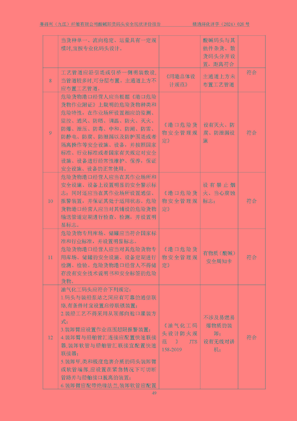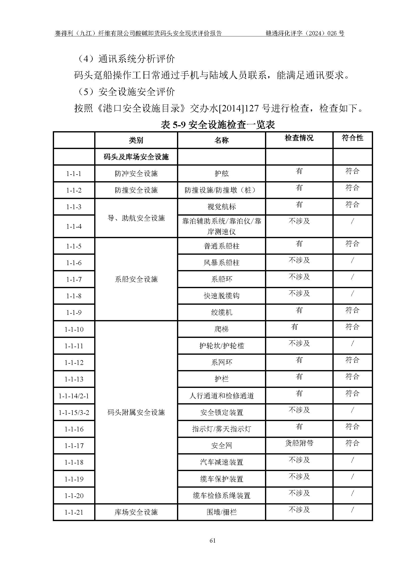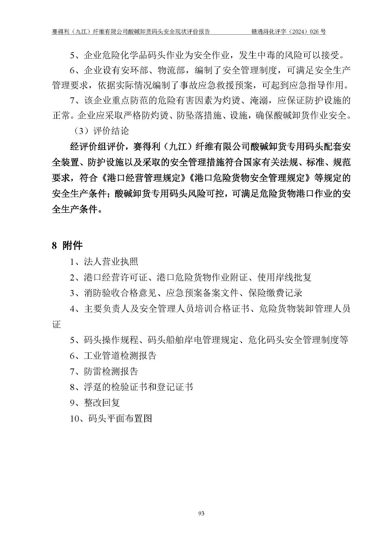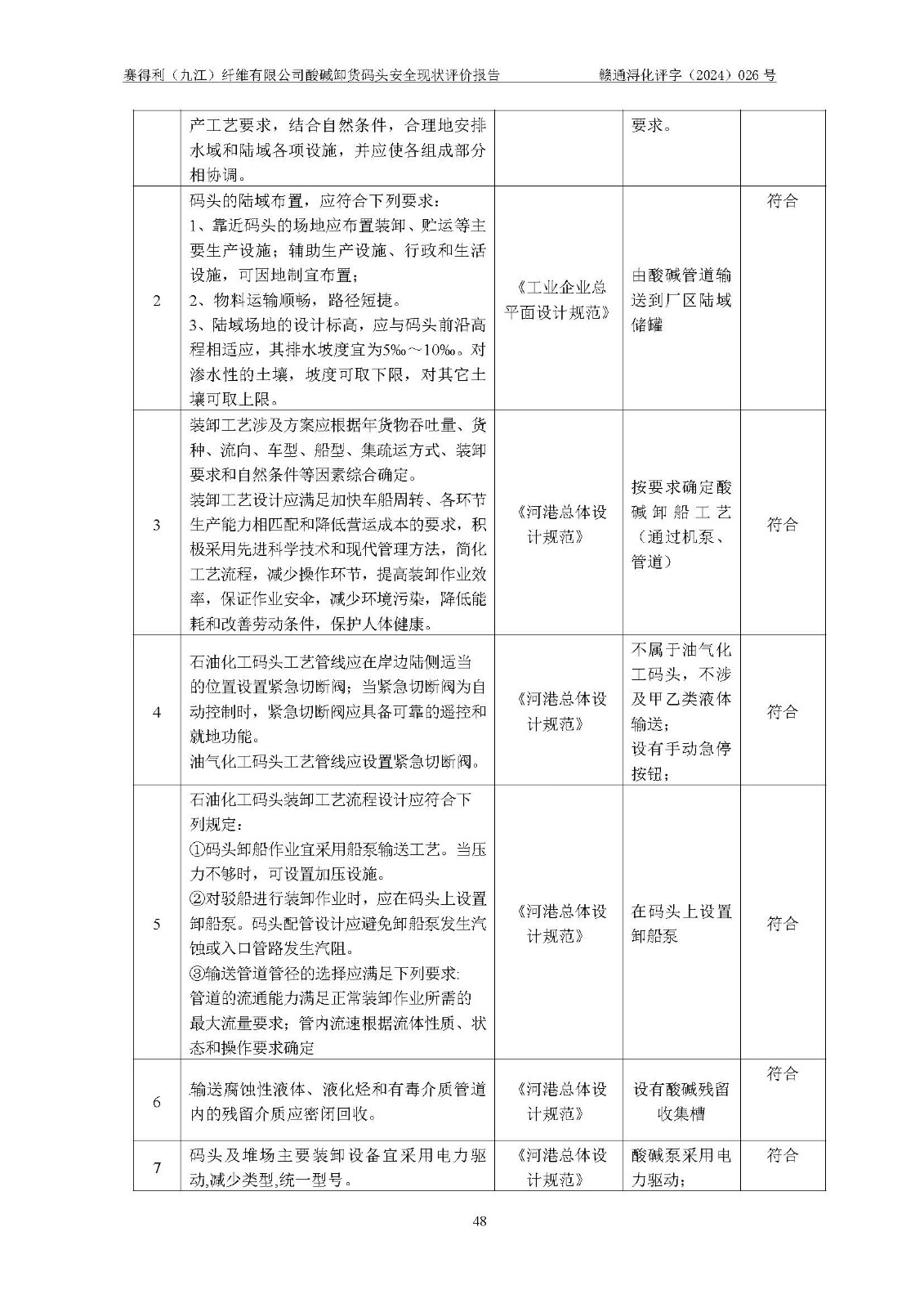 評價結(jié)論 | 經(jīng)評價組評價,賽得利(九江)纖維有限公司酸堿卸貨**碼頭配套安全裝置、防護設(shè)施以及采取的安全管理措施符合**有關(guān)法規(guī)、標(biāo)準(zhǔn)、規(guī)范要求,符合《港口經(jīng)營管理規(guī)定》《港口危險貨物安全管理規(guī)定》等規(guī)定的安全生產(chǎn)條件;酸堿卸貨**碼頭風(fēng)險可控,可滿足危險貨物港口作業(yè)的安全生產(chǎn)條件。 | ||||