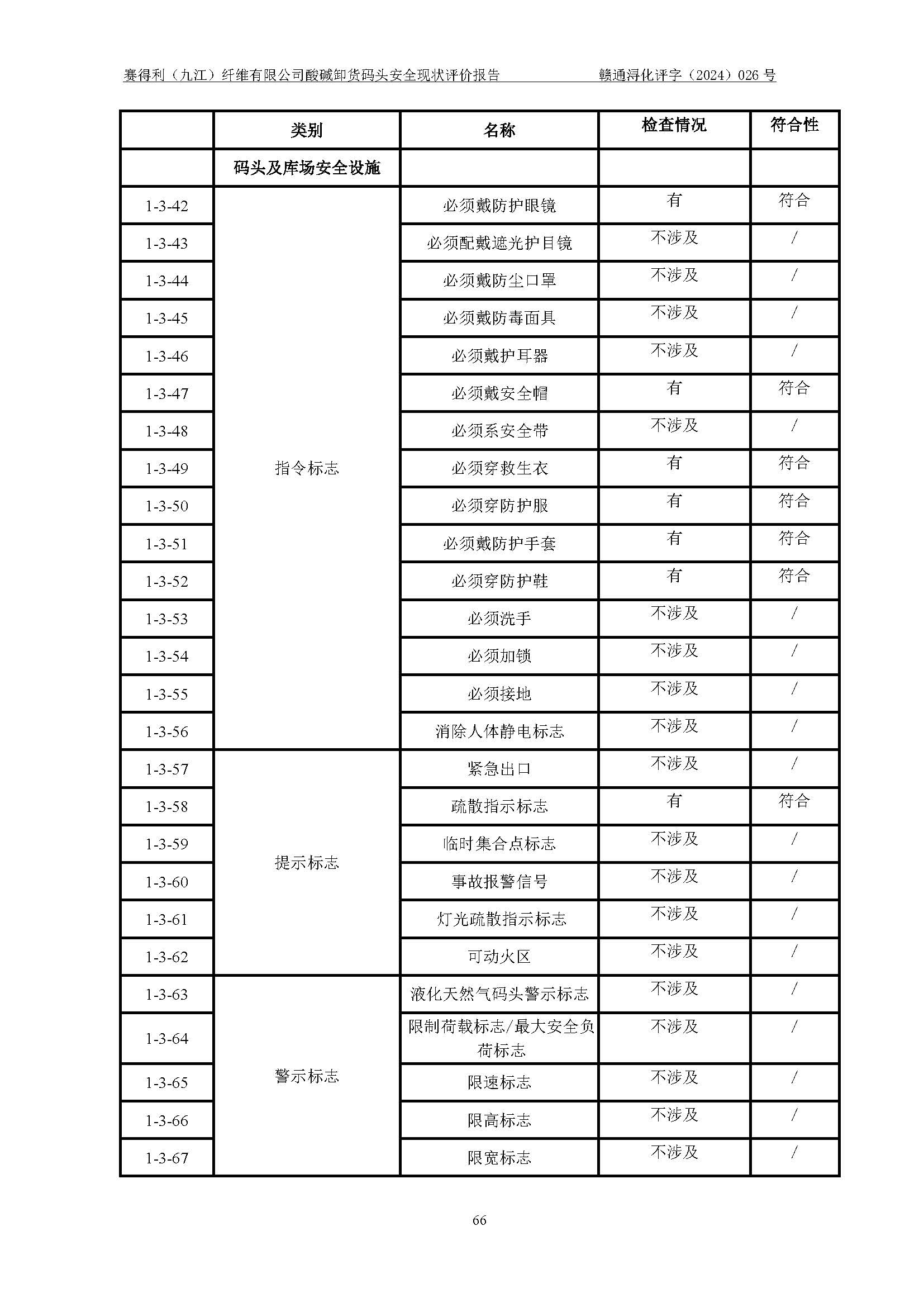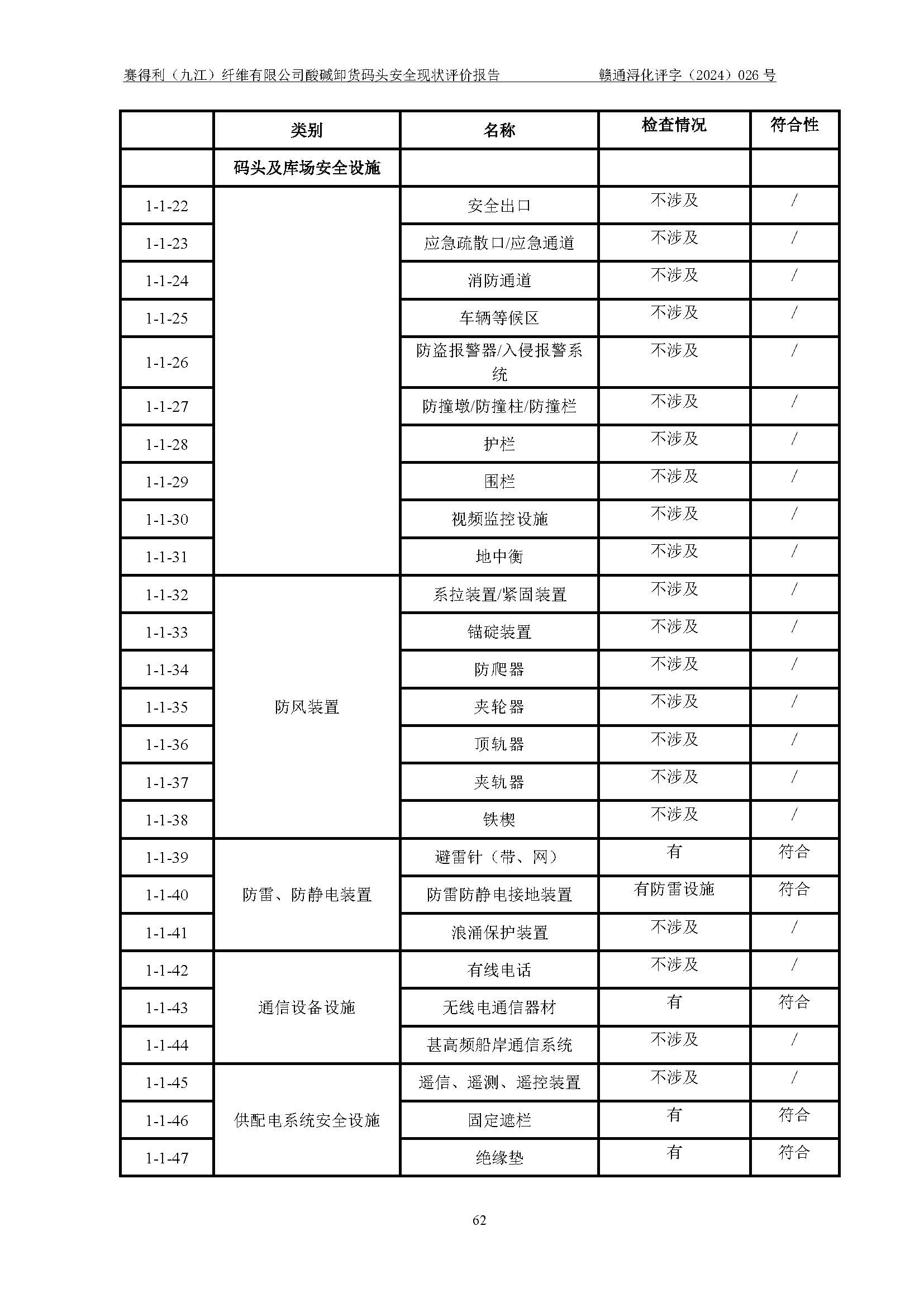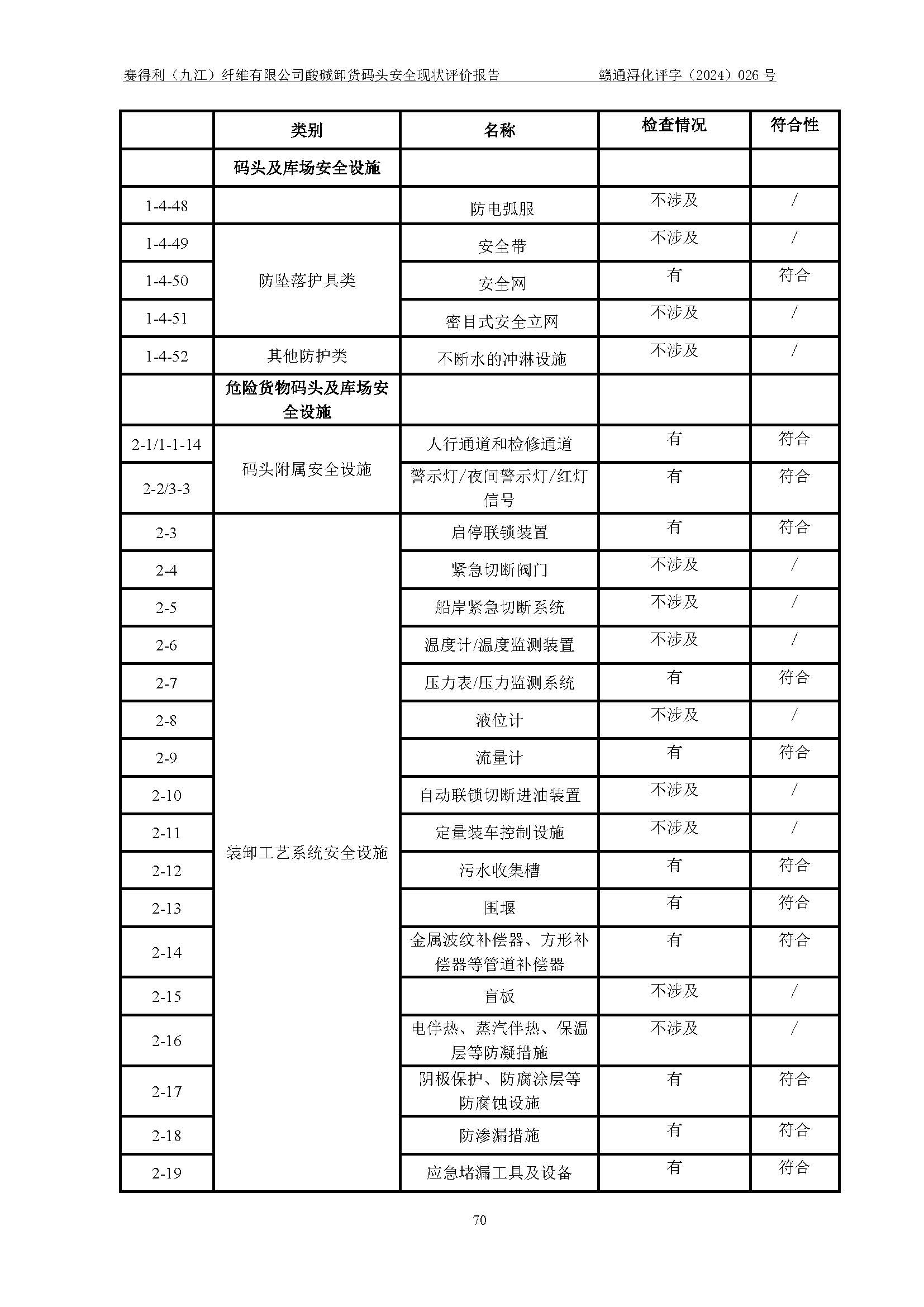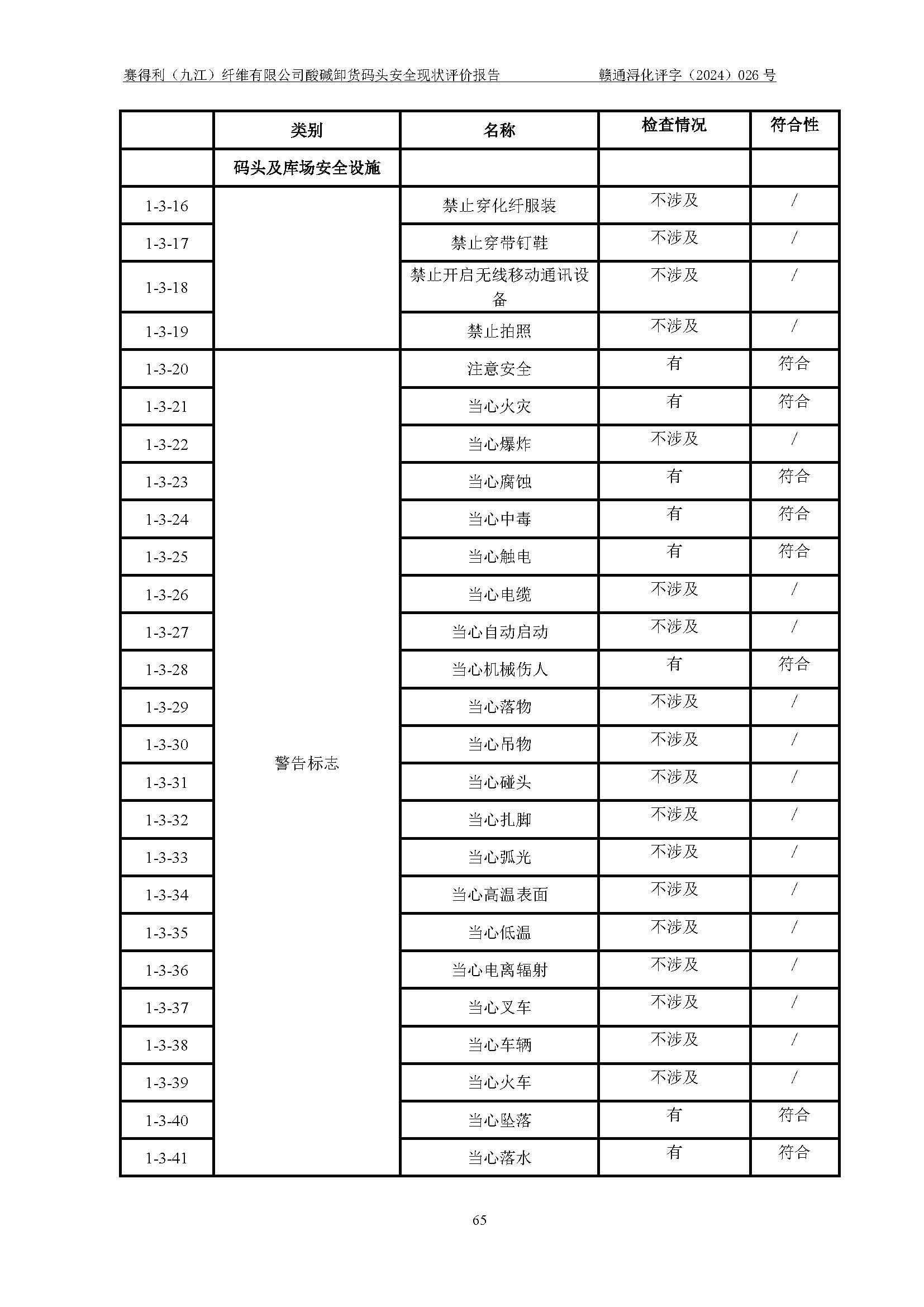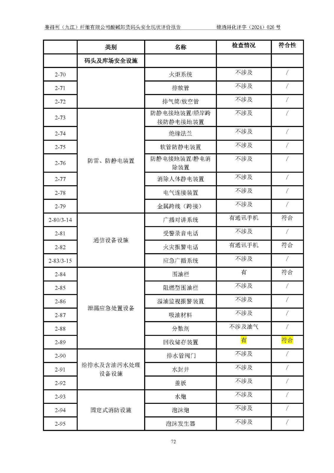 評價結(jié)論 | 經(jīng)評價組評價,賽得利(九江)纖維有限公司酸堿卸貨**碼頭配套安全裝置、防護設(shè)施以及采取的安全管理措施符合**有關(guān)法規(guī)、標(biāo)準(zhǔn)、規(guī)范要求,符合《港口經(jīng)營管理規(guī)定》《港口危險貨物安全管理規(guī)定》等規(guī)定的安全生產(chǎn)條件;酸堿卸貨**碼頭風(fēng)險可控,可滿足危險貨物港口作業(yè)的安全生產(chǎn)條件。 | ||||