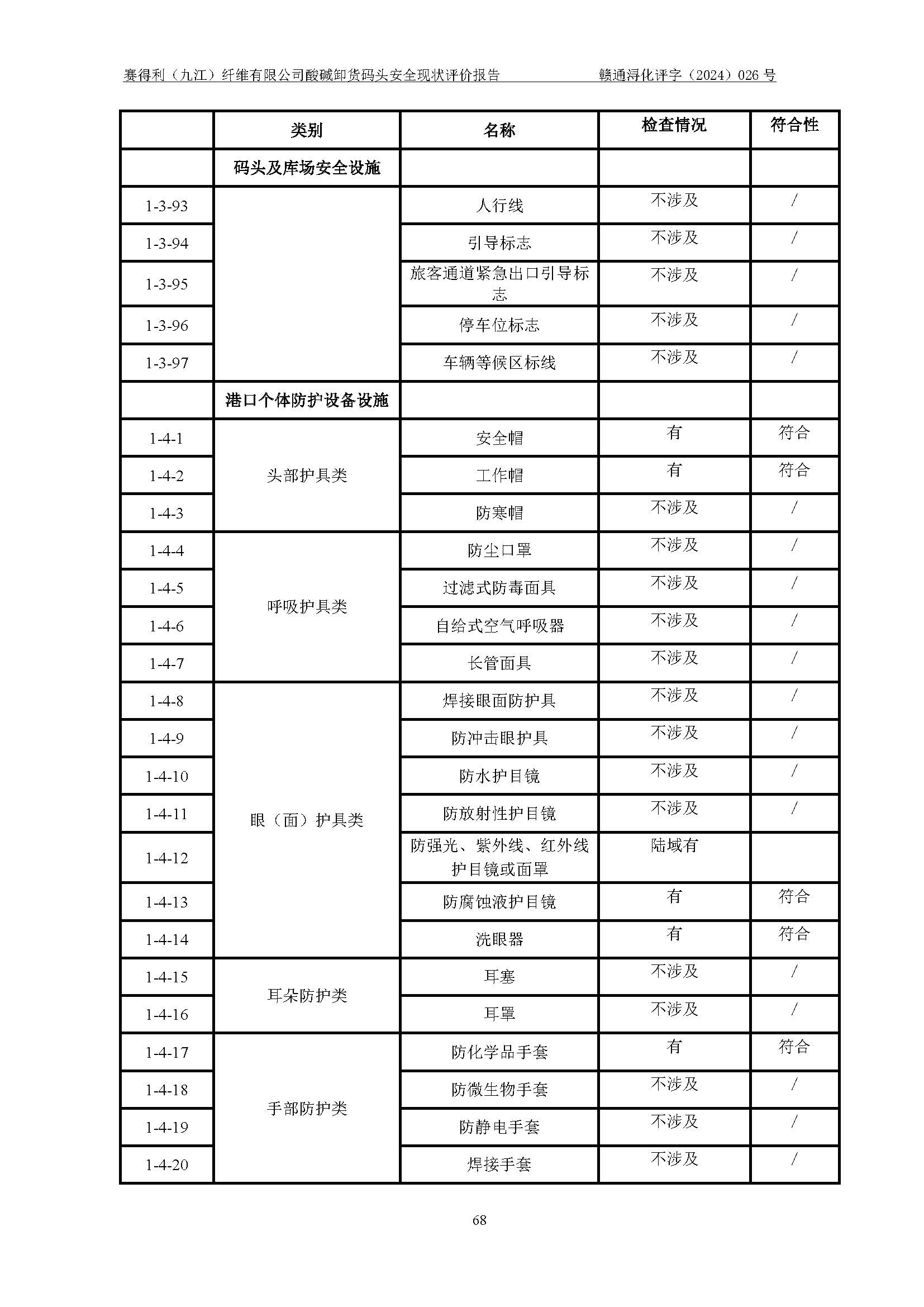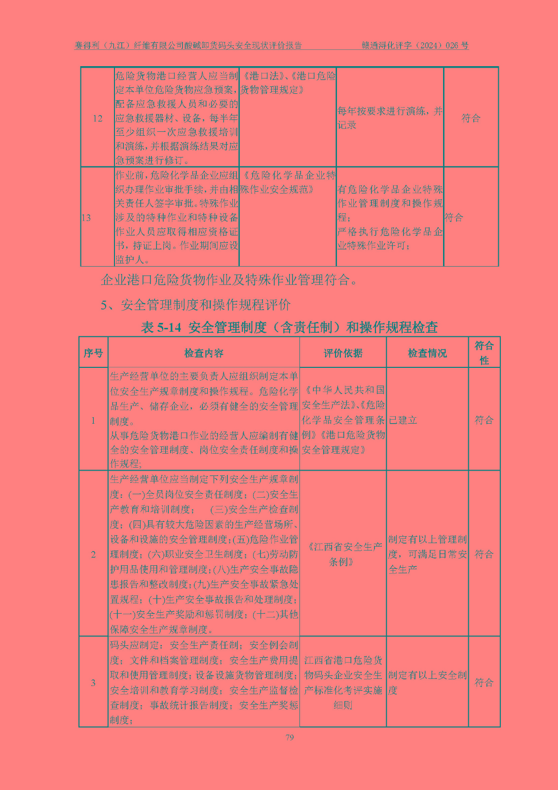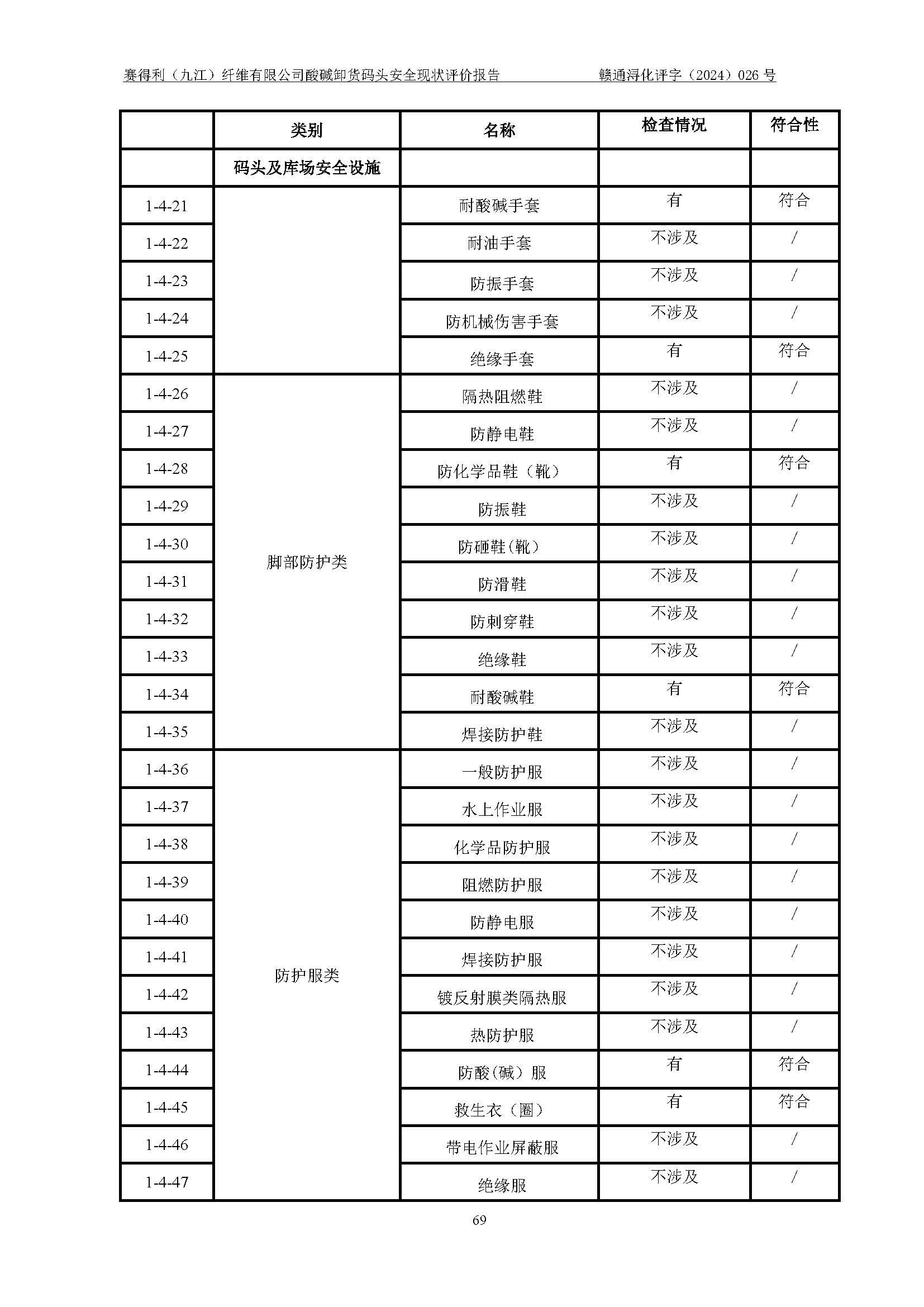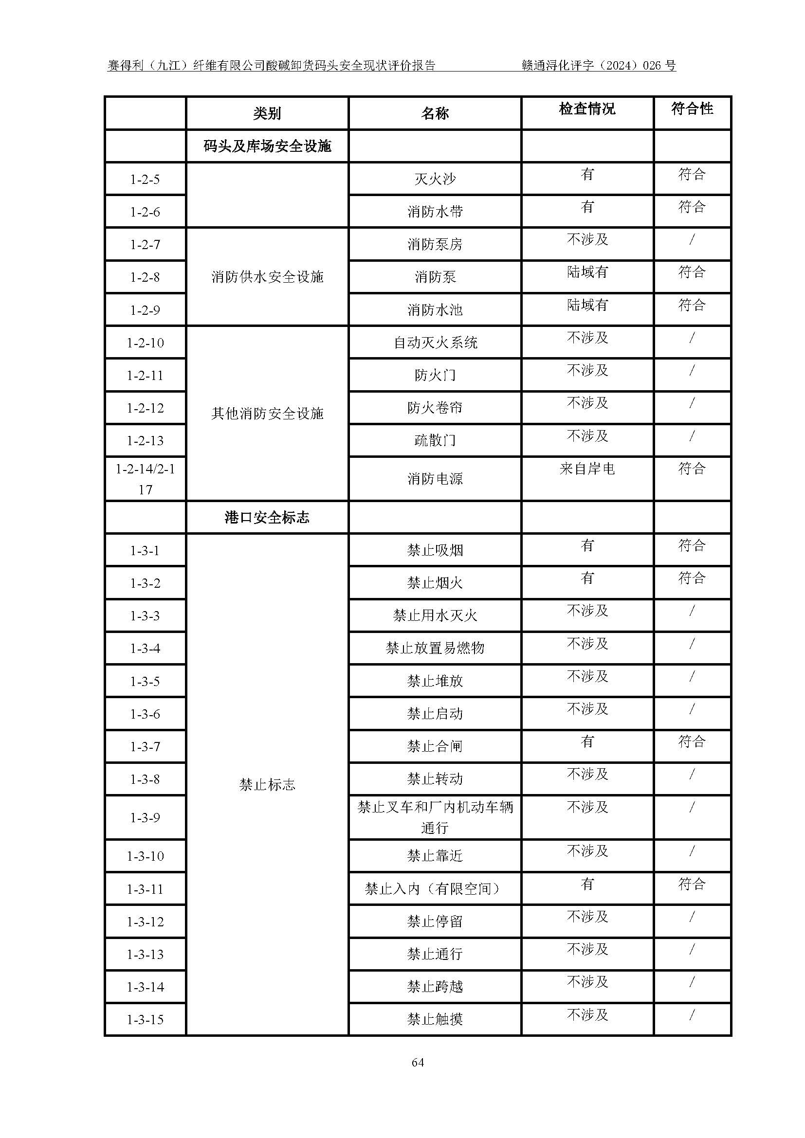 評價結(jié)論 | 經(jīng)評價組評價,賽得利(九江)纖維有限公司酸堿卸貨**碼頭配套安全裝置、防護設(shè)施以及采取的安全管理措施符合**有關(guān)法規(guī)、標(biāo)準(zhǔn)、規(guī)范要求,符合《港口經(jīng)營管理規(guī)定》《港口危險貨物安全管理規(guī)定》等規(guī)定的安全生產(chǎn)條件;酸堿卸貨**碼頭風(fēng)險可控,可滿足危險貨物港口作業(yè)的安全生產(chǎn)條件。 | ||||