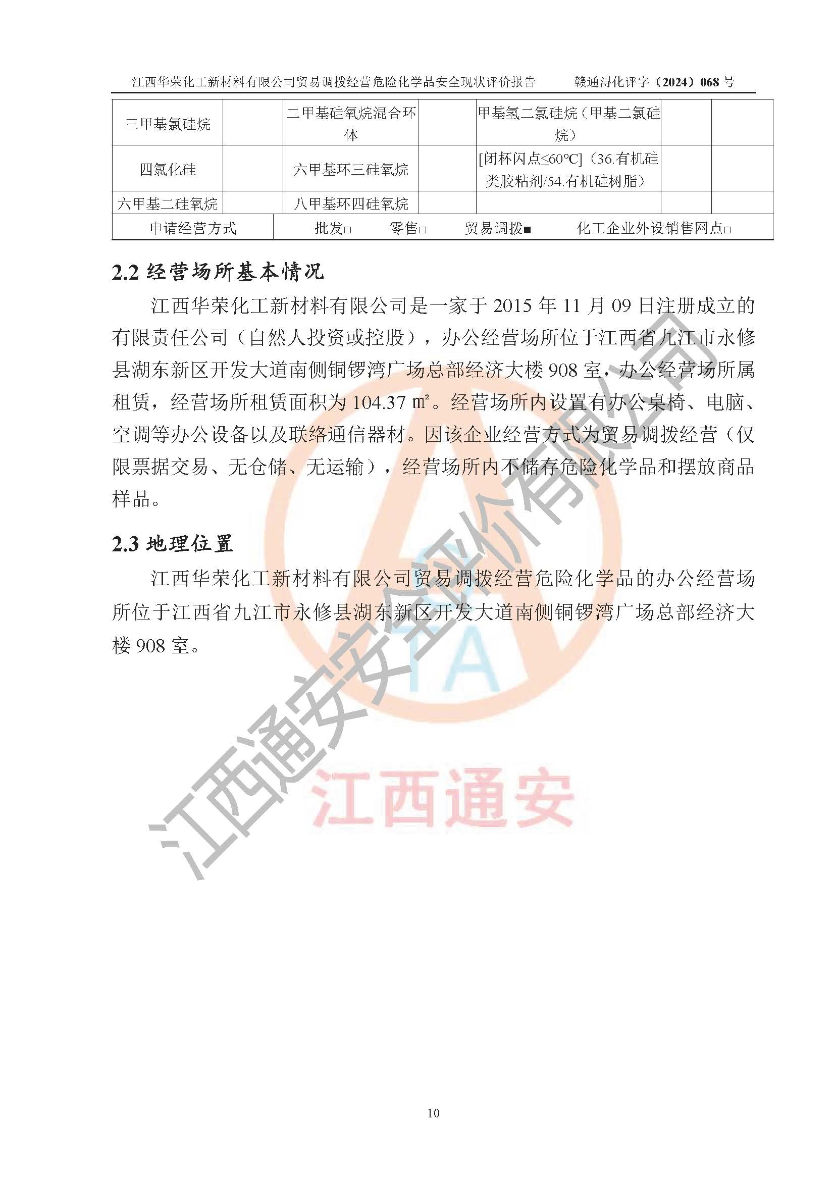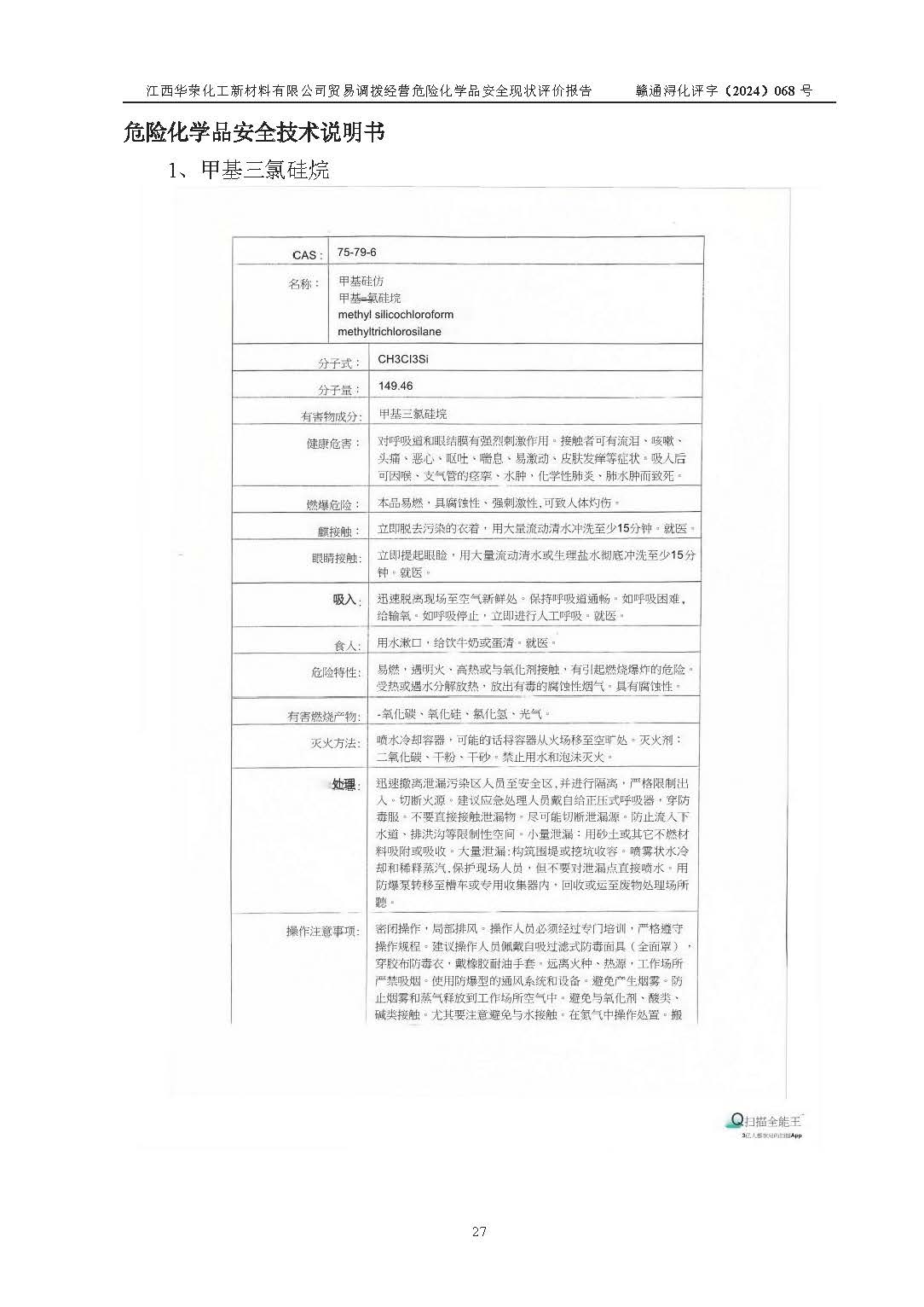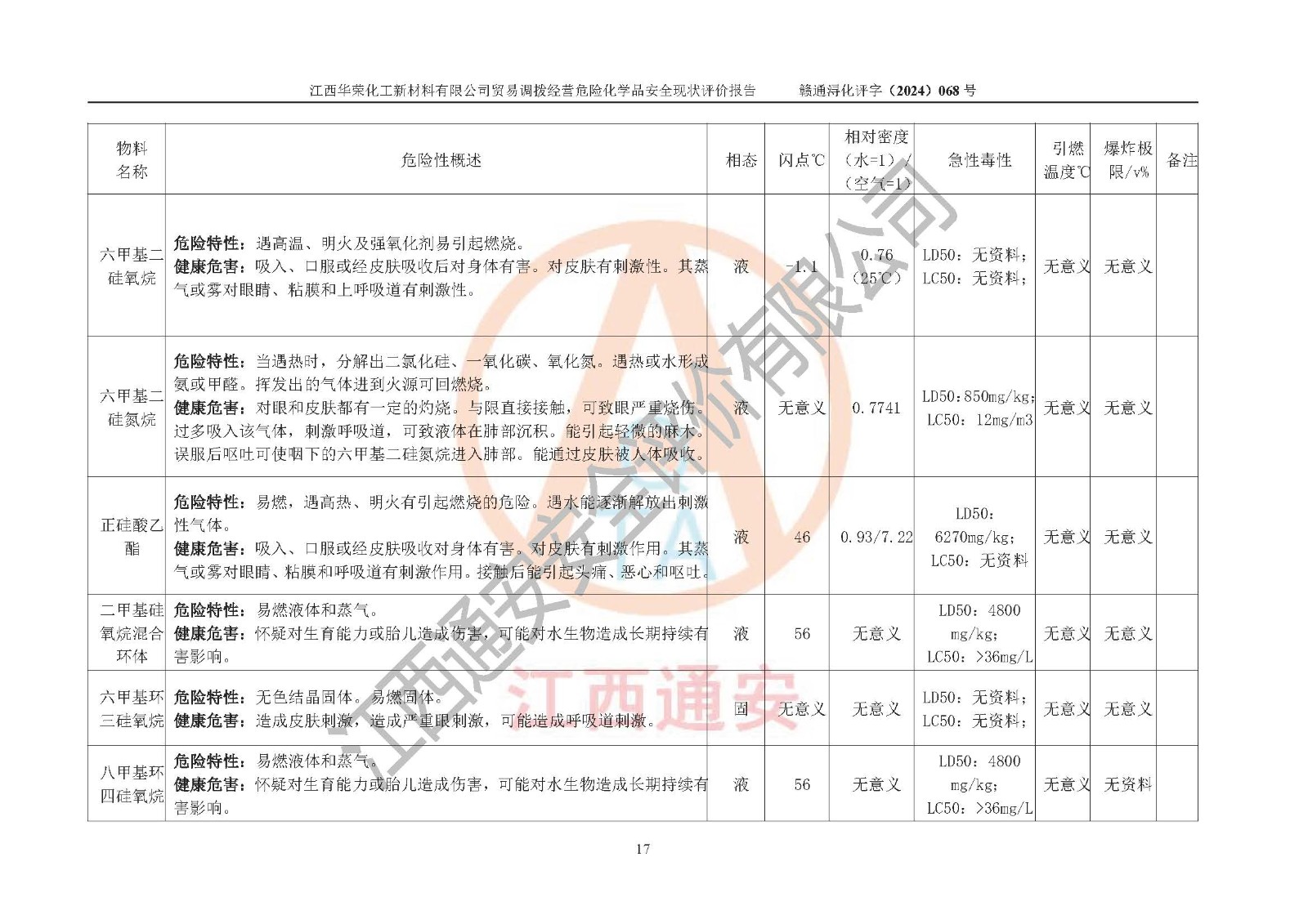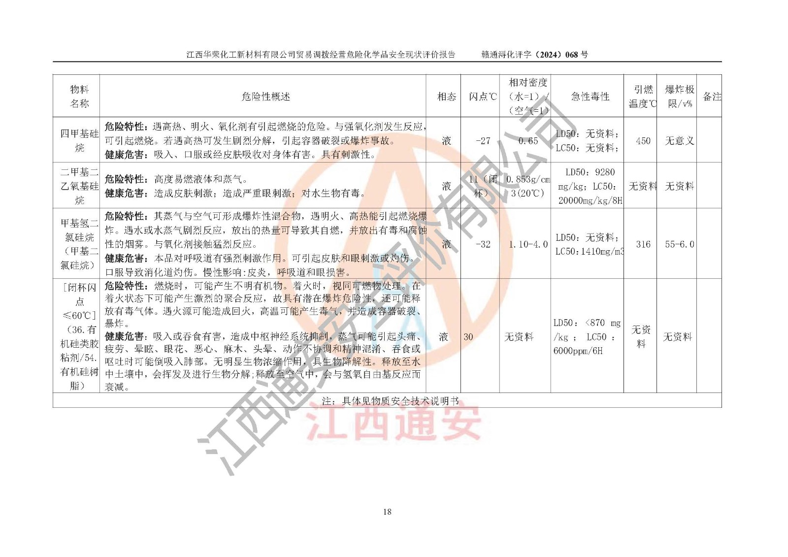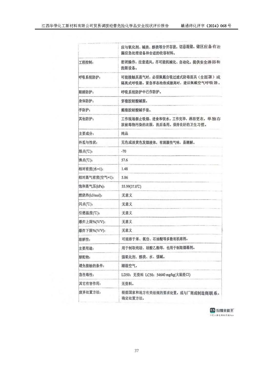 項目簡介 | 江西華榮化工新材料有限公司是一家于2015年11月09日注冊成立的有限責任公司,企業(yè)注冊地址與經營場所位于江西省九江市永修縣湖東新區(qū)開發(fā)大道南側銅鑼灣廣場總部經濟大樓908室,注冊資本與實收資本均為200萬元人民幣。該公司現(xiàn)有員工5人,法定**人王汝華。公司目前經營范圍為:許可項目:危險化學品經營(依法須經批準的項目,經相關部門批準后在許可**期內方可開展經營活動,具體經營項目和許可期限以相關部門批準文件或許可證件為準)一般項目:化工產品銷售(不含許可類化工產品),橡膠制品銷售,建筑材料銷售,金屬材料銷售,貨物進出口,信息技術咨詢服務(除依法須經批準的項目外,憑營業(yè)執(zhí)照依法自主開展經營活動)。 江西華榮化工新材料有限公司以貿易調撥方式經營危險化學品,品種為:甲基三氯硅烷、二甲基二氯硅烷、**基氯硅烷、四氯化硅、六甲基二硅氧烷、六甲基二硅氮烷、正硅酸乙酯、二甲基硅氧烷混合環(huán)體、六甲基環(huán)三硅氧烷、八甲基環(huán)四硅氧烷、四甲基硅烷、二甲基二乙氧基硅烷、甲基氫二氯硅烷(又稱為甲基二氯硅烷,新增)、[閉杯閃點≤60℃](36.有機硅類膠粘劑/54.有機硅樹脂)。不涉及危險化學品的運輸、儲存、店面零售、經營場所樣品擺放等問題。企業(yè)貿易調撥經營的危險化學品由具有危險化學品經營資質或生產廠家供貨,經營的危險化學品的運輸委托具有相應資質的單位承擔。 根據(jù)《危險化學品安全管理條例》(***第645號令修訂)、《危險化學品經營許可證管理辦法》(**安監(jiān)總局第55號令,第79號令修改)等法規(guī)和文件的要求,《危險化學品經營許可證》申請單位,應提供《安全評價報告》。 江西華榮化工新材料有限公司已向發(fā)證部門提出申請,目前正在做申請的準備工作,故委托江西通安安全評價有限公司承擔其貿易調撥經營危險化學品安全條件現(xiàn)狀評價工作。 江西通安安全評價有限公司接受委托后,組織了評價組;于2024年6月對該公司辦公經營場所進行了現(xiàn)場踏勘,查詢該公司經營管理模式及規(guī)章制度執(zhí)行情況。依據(jù)《安全評價通則》(AQ8001-2007)的要求,評價組完成了風險分析、資料收集、現(xiàn)場勘查和類比調查等前期準備工作。在此基礎上,根據(jù)企業(yè)提供的資料,分析了該企業(yè)在貿易調撥經營過程中可能存在的危險、有害因素。選擇了相應的安全評價方法逐項進行分析、評價,提出相應的預防和控制對策措施;并與企業(yè)安全管理人員進行了溝通后,編制完成了本評價報告,以作為企業(yè)申辦《危險化學品經營許可證》的安全技術依據(jù)。 本次評價范圍為江西華榮化工新材料有限公司貿易調撥經營危險化學品過程中的安全條件及安全管理方面的現(xiàn)狀。包括經營過程中安全管理的組織、機構、人員及安全管理制度等。該單位不涉及貿易調撥經營危險化學品的運輸、儲存,其委托危險化學品的道路運輸、儲存不在本評價范圍內。 | ||||||