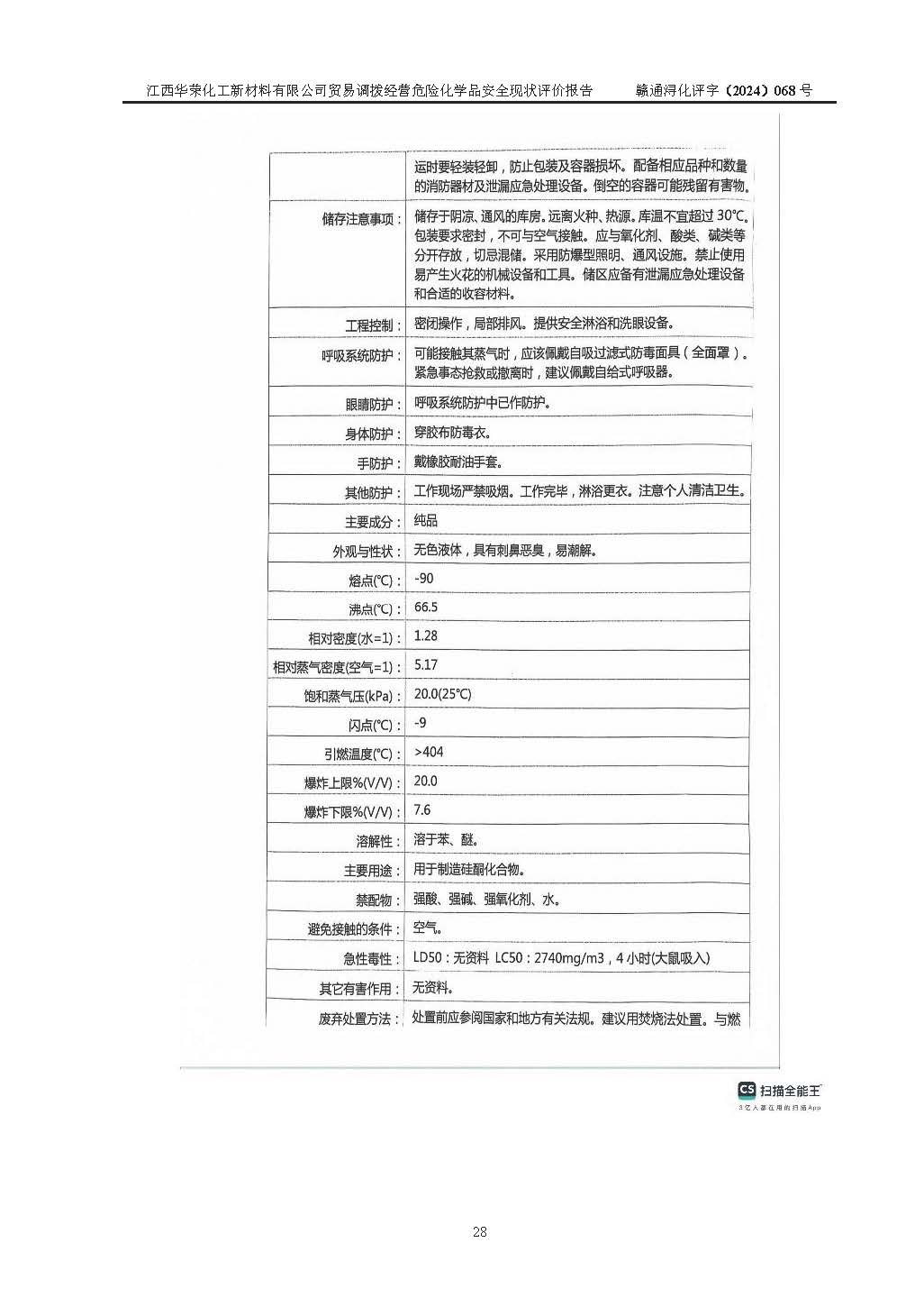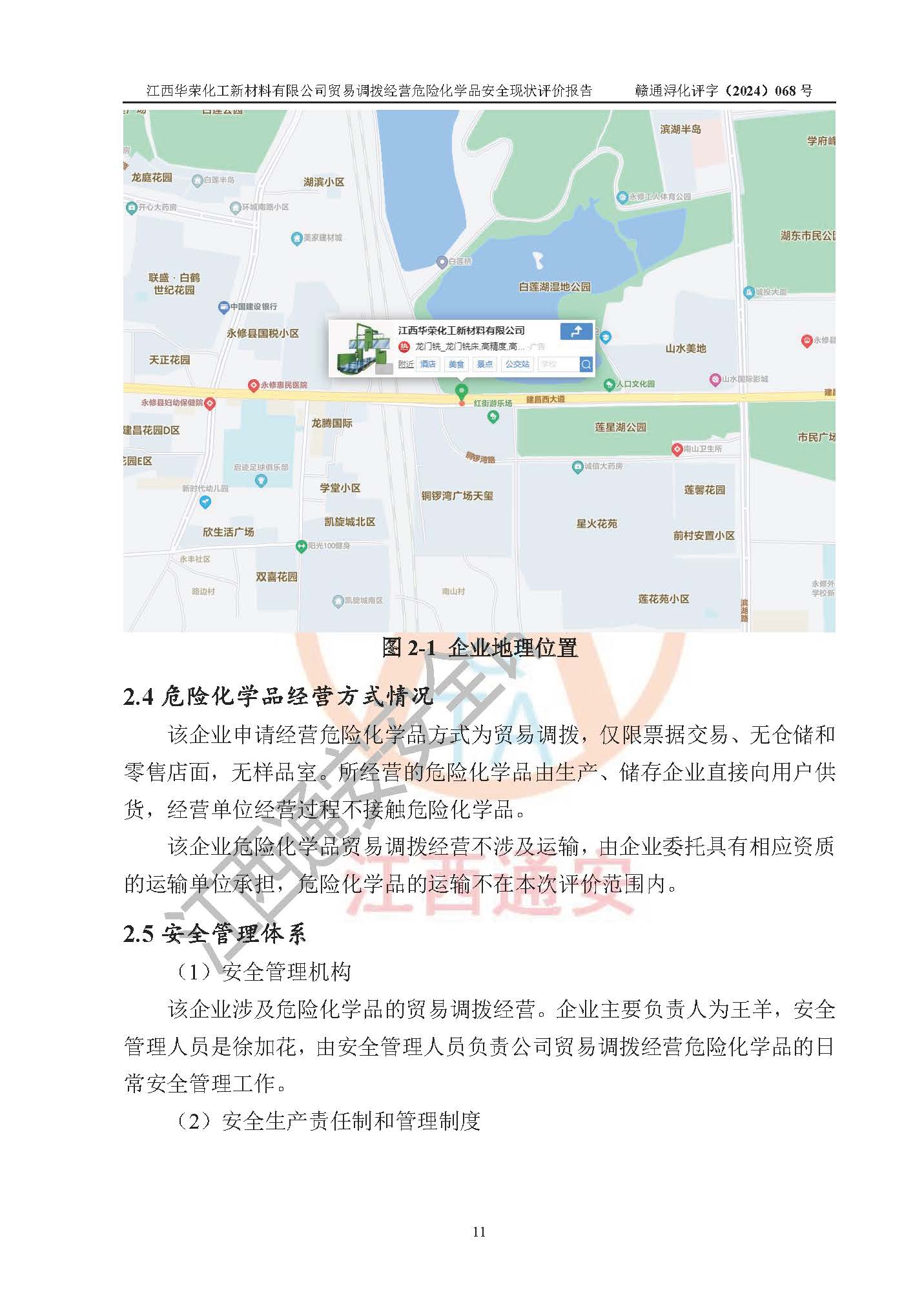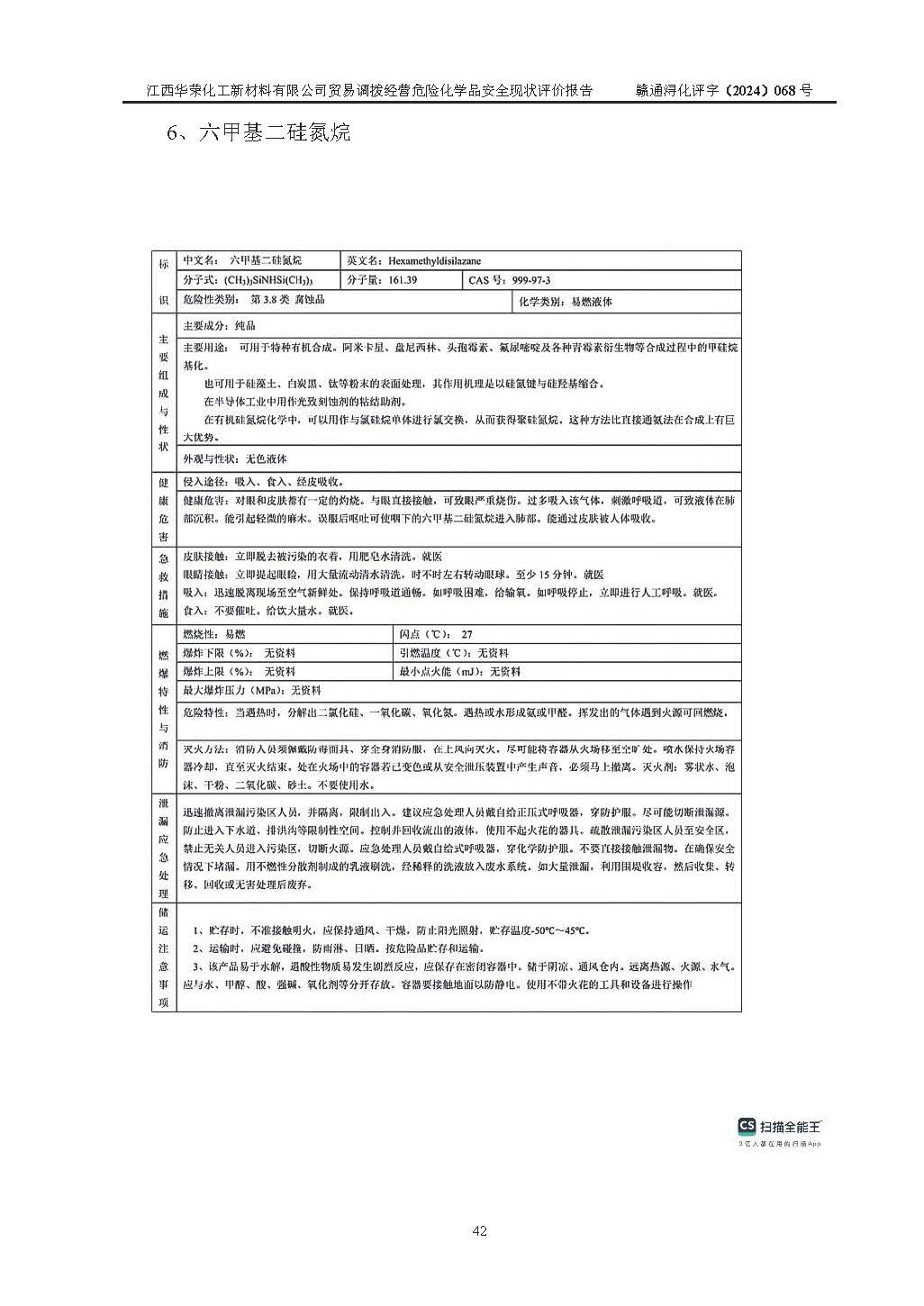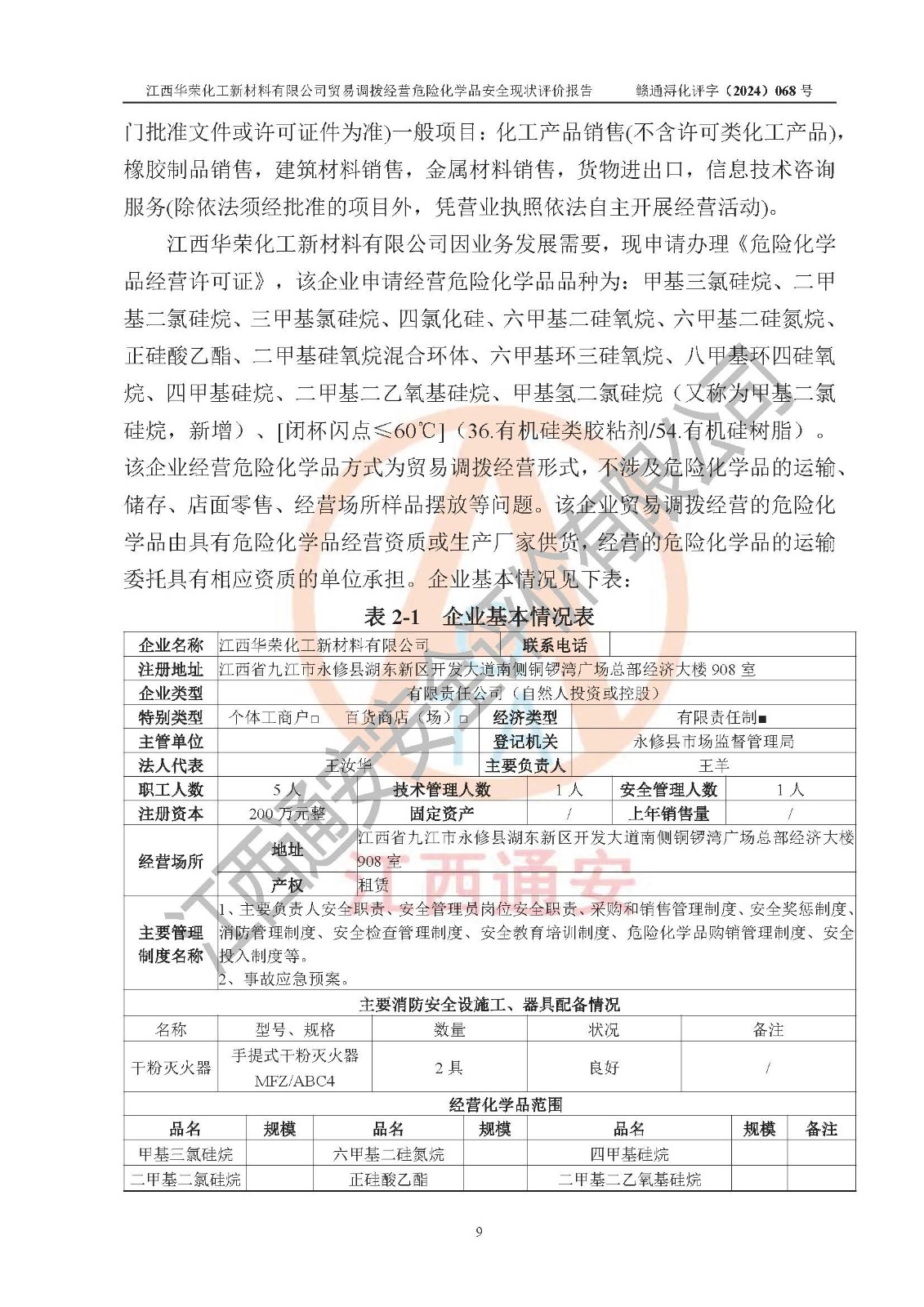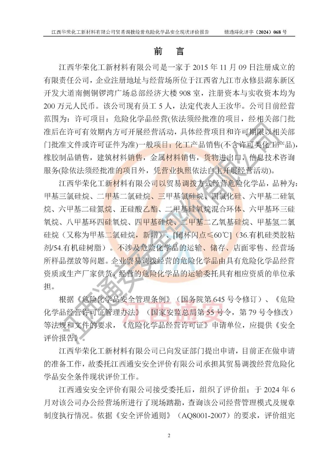 項目簡介 | 江西華榮化工新材料有限公司是一家于2015年11月09日注冊成立的有限責任公司,企業(yè)注冊地址與經營場所位于江西省九江市永修縣湖東新區(qū)開發(fā)大道南側銅鑼灣廣場總部經濟大樓908室,注冊資本與實收資本均為200萬元人民幣。該公司現(xiàn)有員工5人,法定**人王汝華。公司目前經營范圍為:許可項目:危險化學品經營(依法須經批準的項目,經相關部門批準后在許可**期內方可開展經營活動,具體經營項目和許可期限以相關部門批準文件或許可證件為準)一般項目:化工產品銷售(不含許可類化工產品),橡膠制品銷售,建筑材料銷售,金屬材料銷售,貨物進出口,信息技術咨詢服務(除依法須經批準的項目外,憑營業(yè)執(zhí)照依法自主開展經營活動)。 江西華榮化工新材料有限公司以貿易調撥方式經營危險化學品,品種為:甲基三氯硅烷、二甲基二氯硅烷、**基氯硅烷、四氯化硅、六甲基二硅氧烷、六甲基二硅氮烷、正硅酸乙酯、二甲基硅氧烷混合環(huán)體、六甲基環(huán)三硅氧烷、八甲基環(huán)四硅氧烷、四甲基硅烷、二甲基二乙氧基硅烷、甲基氫二氯硅烷(又稱為甲基二氯硅烷,新增)、[閉杯閃點≤60℃](36.有機硅類膠粘劑/54.有機硅樹脂)。不涉及危險化學品的運輸、儲存、店面零售、經營場所樣品擺放等問題。企業(yè)貿易調撥經營的危險化學品由具有危險化學品經營資質或生產廠家供貨,經營的危險化學品的運輸委托具有相應資質的單位承擔。 根據(jù)《危險化學品安全管理條例》(***第645號令修訂)、《危險化學品經營許可證管理辦法》(**安監(jiān)總局第55號令,第79號令修改)等法規(guī)和文件的要求,《危險化學品經營許可證》申請單位,應提供《安全評價報告》。 江西華榮化工新材料有限公司已向發(fā)證部門提出申請,目前正在做申請的準備工作,故委托江西通安安全評價有限公司承擔其貿易調撥經營危險化學品安全條件現(xiàn)狀評價工作。 江西通安安全評價有限公司接受委托后,組織了評價組;于2024年6月對該公司辦公經營場所進行了現(xiàn)場踏勘,查詢該公司經營管理模式及規(guī)章制度執(zhí)行情況。依據(jù)《安全評價通則》(AQ8001-2007)的要求,評價組完成了風險分析、資料收集、現(xiàn)場勘查和類比調查等前期準備工作。在此基礎上,根據(jù)企業(yè)提供的資料,分析了該企業(yè)在貿易調撥經營過程中可能存在的危險、有害因素。選擇了相應的安全評價方法逐項進行分析、評價,提出相應的預防和控制對策措施;并與企業(yè)安全管理人員進行了溝通后,編制完成了本評價報告,以作為企業(yè)申辦《危險化學品經營許可證》的安全技術依據(jù)。 本次評價范圍為江西華榮化工新材料有限公司貿易調撥經營危險化學品過程中的安全條件及安全管理方面的現(xiàn)狀。包括經營過程中安全管理的組織、機構、人員及安全管理制度等。該單位不涉及貿易調撥經營危險化學品的運輸、儲存,其委托危險化學品的道路運輸、儲存不在本評價范圍內。 | ||||||