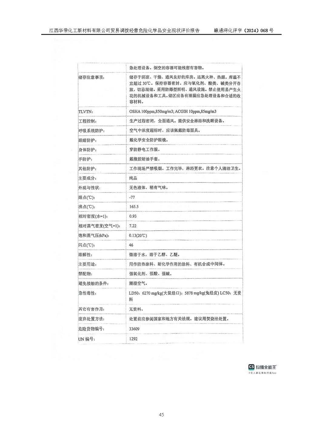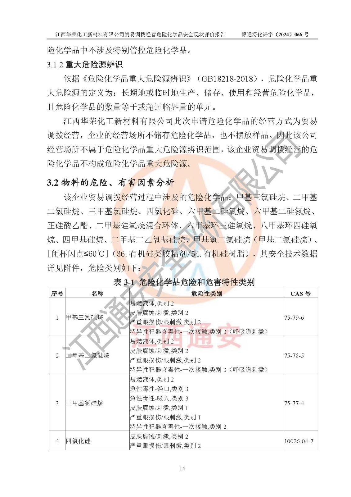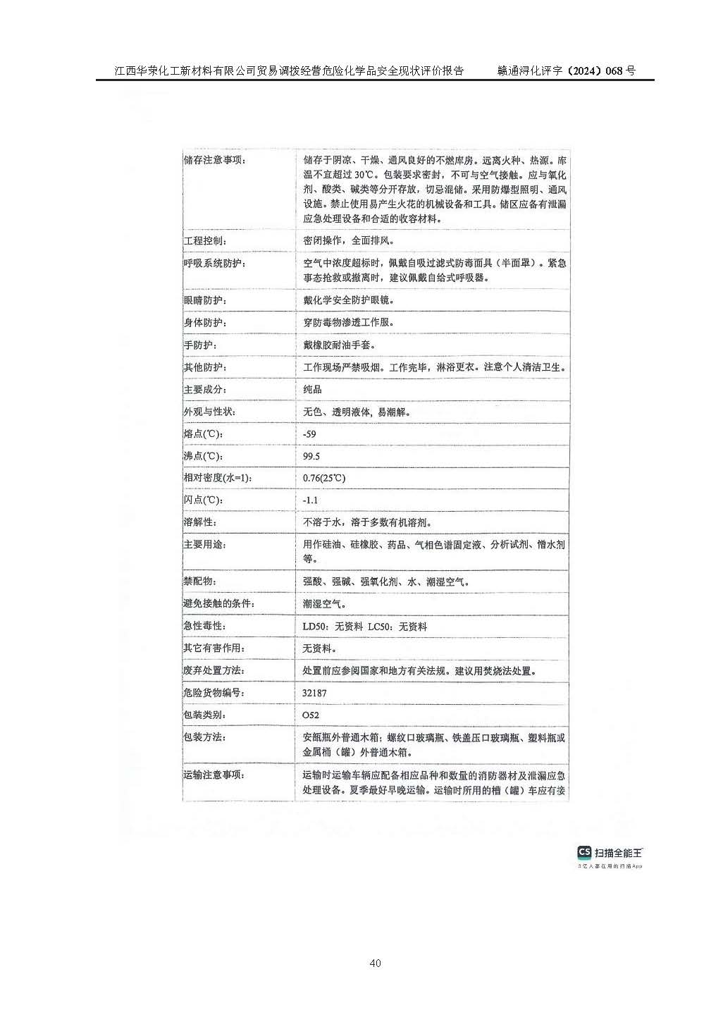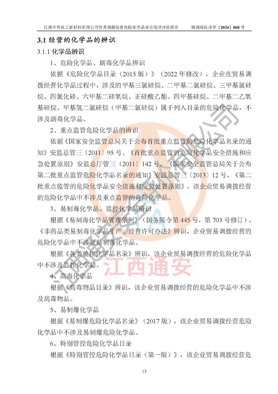 項目簡介 | 江西華榮化工新材料有限公司是一家于2015年11月09日注冊成立的有限責任公司,企業(yè)注冊地址與經營場所位于江西省九江市永修縣湖東新區(qū)開發(fā)大道南側銅鑼灣廣場總部經濟大樓908室,注冊資本與實收資本均為200萬元人民幣。該公司現(xiàn)有員工5人,法定**人王汝華。公司目前經營范圍為:許可項目:危險化學品經營(依法須經批準的項目,經相關部門批準后在許可**期內方可開展經營活動,具體經營項目和許可期限以相關部門批準文件或許可證件為準)一般項目:化工產品銷售(不含許可類化工產品),橡膠制品銷售,建筑材料銷售,金屬材料銷售,貨物進出口,信息技術咨詢服務(除依法須經批準的項目外,憑營業(yè)執(zhí)照依法自主開展經營活動)。 江西華榮化工新材料有限公司以貿易調撥方式經營危險化學品,品種為:甲基三氯硅烷、二甲基二氯硅烷、**基氯硅烷、四氯化硅、六甲基二硅氧烷、六甲基二硅氮烷、正硅酸乙酯、二甲基硅氧烷混合環(huán)體、六甲基環(huán)三硅氧烷、八甲基環(huán)四硅氧烷、四甲基硅烷、二甲基二乙氧基硅烷、甲基氫二氯硅烷(又稱為甲基二氯硅烷,新增)、[閉杯閃點≤60℃](36.有機硅類膠粘劑/54.有機硅樹脂)。不涉及危險化學品的運輸、儲存、店面零售、經營場所樣品擺放等問題。企業(yè)貿易調撥經營的危險化學品由具有危險化學品經營資質或生產廠家供貨,經營的危險化學品的運輸委托具有相應資質的單位承擔。 根據(jù)《危險化學品安全管理條例》(***第645號令修訂)、《危險化學品經營許可證管理辦法》(**安監(jiān)總局第55號令,第79號令修改)等法規(guī)和文件的要求,《危險化學品經營許可證》申請單位,應提供《安全評價報告》。 江西華榮化工新材料有限公司已向發(fā)證部門提出申請,目前正在做申請的準備工作,故委托江西通安安全評價有限公司承擔其貿易調撥經營危險化學品安全條件現(xiàn)狀評價工作。 江西通安安全評價有限公司接受委托后,組織了評價組;于2024年6月對該公司辦公經營場所進行了現(xiàn)場踏勘,查詢該公司經營管理模式及規(guī)章制度執(zhí)行情況。依據(jù)《安全評價通則》(AQ8001-2007)的要求,評價組完成了風險分析、資料收集、現(xiàn)場勘查和類比調查等前期準備工作。在此基礎上,根據(jù)企業(yè)提供的資料,分析了該企業(yè)在貿易調撥經營過程中可能存在的危險、有害因素。選擇了相應的安全評價方法逐項進行分析、評價,提出相應的預防和控制對策措施;并與企業(yè)安全管理人員進行了溝通后,編制完成了本評價報告,以作為企業(yè)申辦《危險化學品經營許可證》的安全技術依據(jù)。 本次評價范圍為江西華榮化工新材料有限公司貿易調撥經營危險化學品過程中的安全條件及安全管理方面的現(xiàn)狀。包括經營過程中安全管理的組織、機構、人員及安全管理制度等。該單位不涉及貿易調撥經營危險化學品的運輸、儲存,其委托危險化學品的道路運輸、儲存不在本評價范圍內。 | ||||||