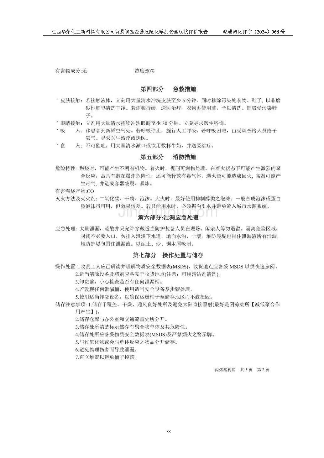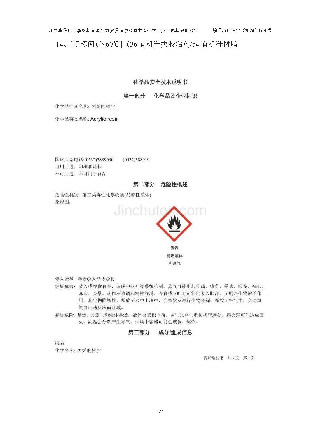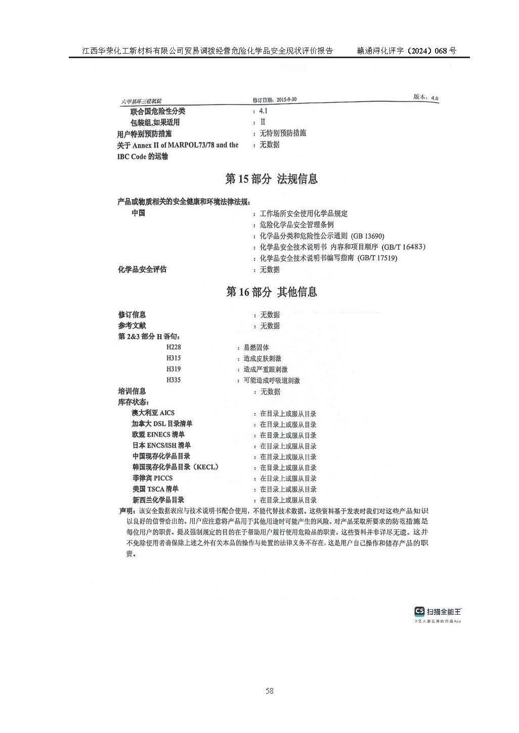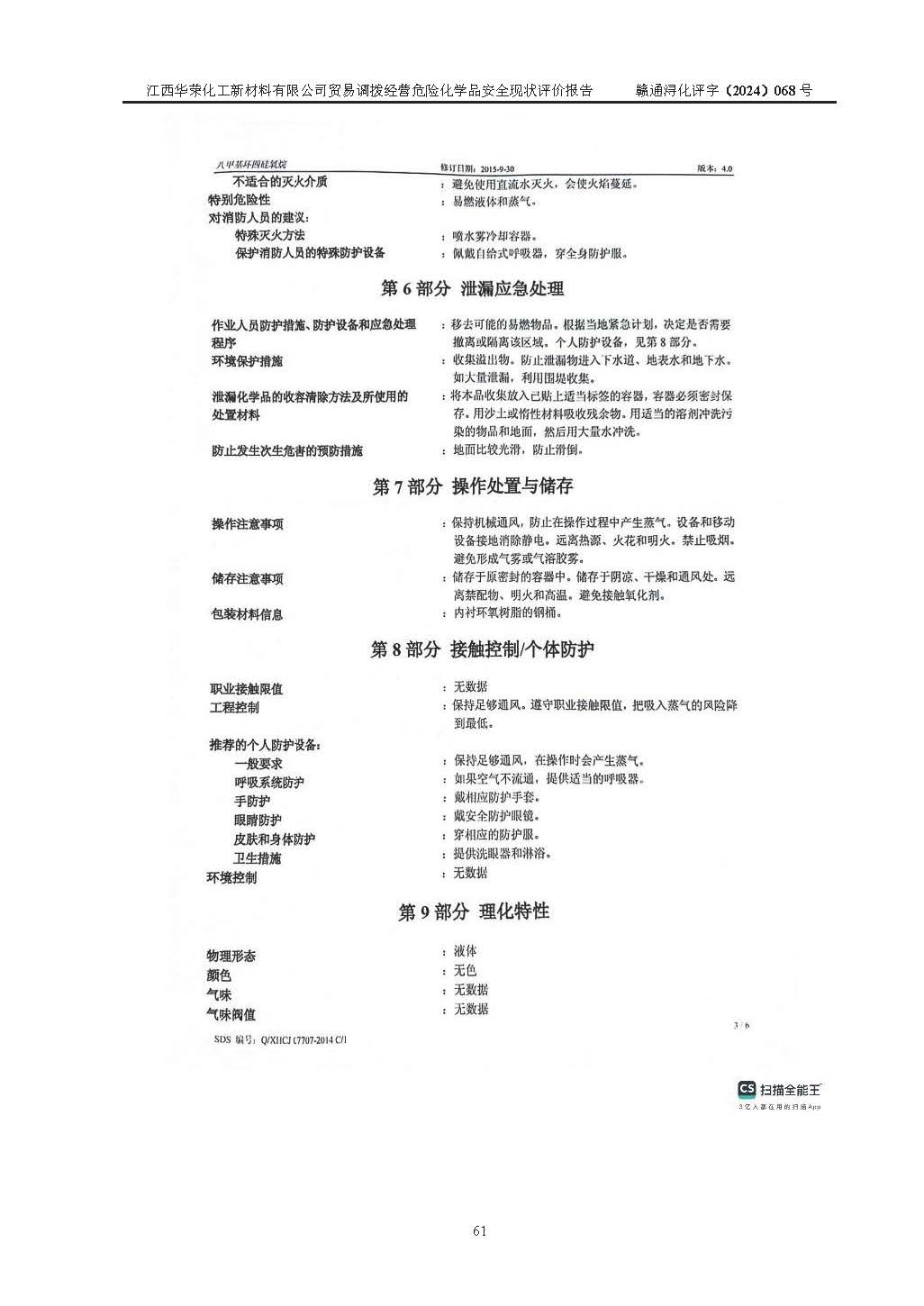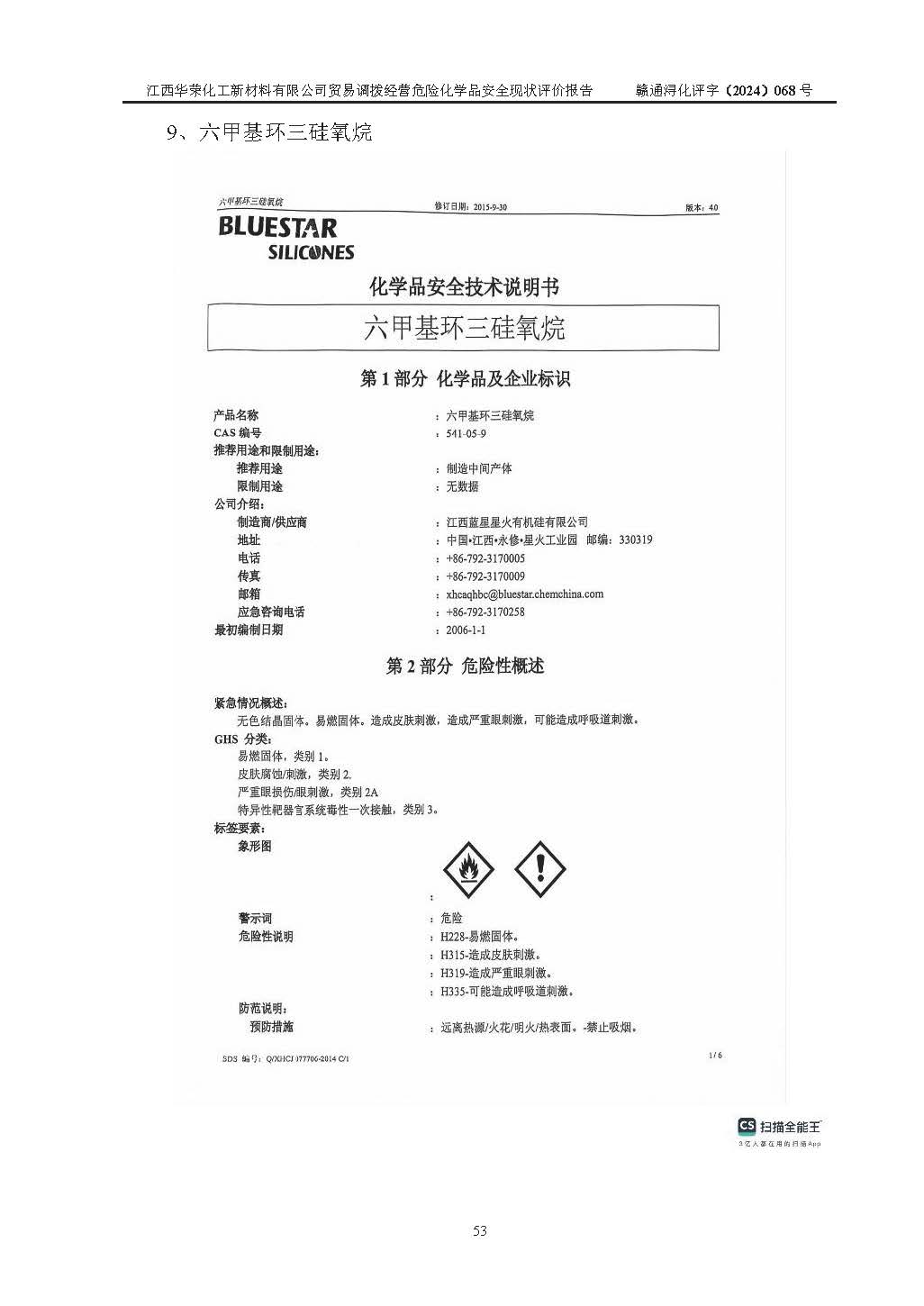 項目簡介 | 江西華榮化工新材料有限公司是一家于2015年11月09日注冊成立的有限責任公司,企業(yè)注冊地址與經營場所位于江西省九江市永修縣湖東新區(qū)開發(fā)大道南側銅鑼灣廣場總部經濟大樓908室,注冊資本與實收資本均為200萬元人民幣。該公司現(xiàn)有員工5人,法定**人王汝華。公司目前經營范圍為:許可項目:危險化學品經營(依法須經批準的項目,經相關部門批準后在許可**期內方可開展經營活動,具體經營項目和許可期限以相關部門批準文件或許可證件為準)一般項目:化工產品銷售(不含許可類化工產品),橡膠制品銷售,建筑材料銷售,金屬材料銷售,貨物進出口,信息技術咨詢服務(除依法須經批準的項目外,憑營業(yè)執(zhí)照依法自主開展經營活動)。 江西華榮化工新材料有限公司以貿易調撥方式經營危險化學品,品種為:甲基三氯硅烷、二甲基二氯硅烷、**基氯硅烷、四氯化硅、六甲基二硅氧烷、六甲基二硅氮烷、正硅酸乙酯、二甲基硅氧烷混合環(huán)體、六甲基環(huán)三硅氧烷、八甲基環(huán)四硅氧烷、四甲基硅烷、二甲基二乙氧基硅烷、甲基氫二氯硅烷(又稱為甲基二氯硅烷,新增)、[閉杯閃點≤60℃](36.有機硅類膠粘劑/54.有機硅樹脂)。不涉及危險化學品的運輸、儲存、店面零售、經營場所樣品擺放等問題。企業(yè)貿易調撥經營的危險化學品由具有危險化學品經營資質或生產廠家供貨,經營的危險化學品的運輸委托具有相應資質的單位承擔。 根據(jù)《危險化學品安全管理條例》(***第645號令修訂)、《危險化學品經營許可證管理辦法》(**安監(jiān)總局第55號令,第79號令修改)等法規(guī)和文件的要求,《危險化學品經營許可證》申請單位,應提供《安全評價報告》。 江西華榮化工新材料有限公司已向發(fā)證部門提出申請,目前正在做申請的準備工作,故委托江西通安安全評價有限公司承擔其貿易調撥經營危險化學品安全條件現(xiàn)狀評價工作。 江西通安安全評價有限公司接受委托后,組織了評價組;于2024年6月對該公司辦公經營場所進行了現(xiàn)場踏勘,查詢該公司經營管理模式及規(guī)章制度執(zhí)行情況。依據(jù)《安全評價通則》(AQ8001-2007)的要求,評價組完成了風險分析、資料收集、現(xiàn)場勘查和類比調查等前期準備工作。在此基礎上,根據(jù)企業(yè)提供的資料,分析了該企業(yè)在貿易調撥經營過程中可能存在的危險、有害因素。選擇了相應的安全評價方法逐項進行分析、評價,提出相應的預防和控制對策措施;并與企業(yè)安全管理人員進行了溝通后,編制完成了本評價報告,以作為企業(yè)申辦《危險化學品經營許可證》的安全技術依據(jù)。 本次評價范圍為江西華榮化工新材料有限公司貿易調撥經營危險化學品過程中的安全條件及安全管理方面的現(xiàn)狀。包括經營過程中安全管理的組織、機構、人員及安全管理制度等。該單位不涉及貿易調撥經營危險化學品的運輸、儲存,其委托危險化學品的道路運輸、儲存不在本評價范圍內。 | ||||||
