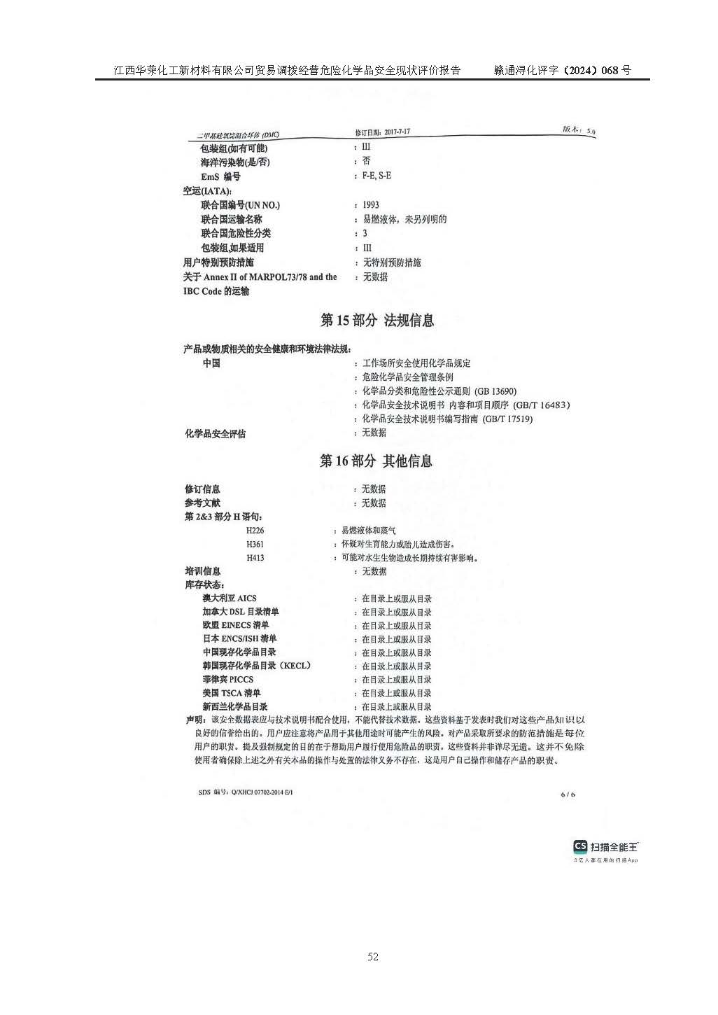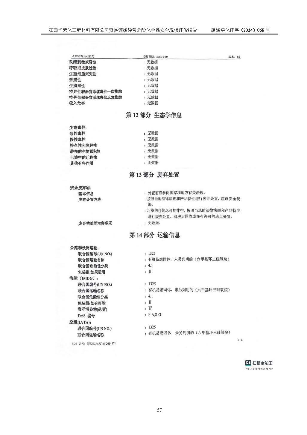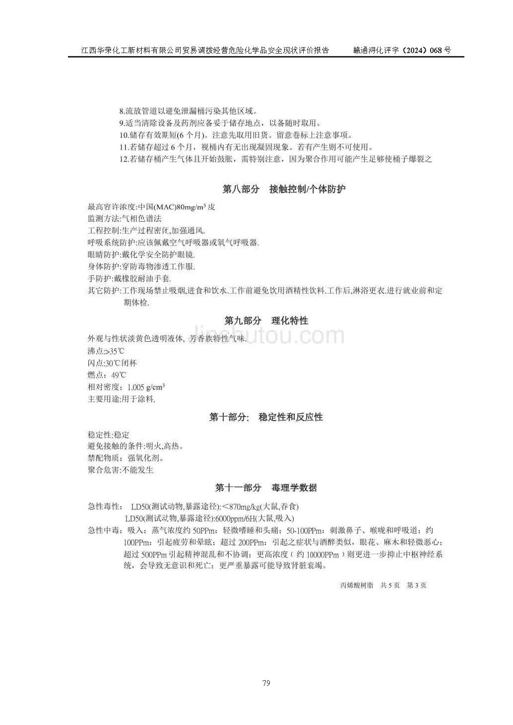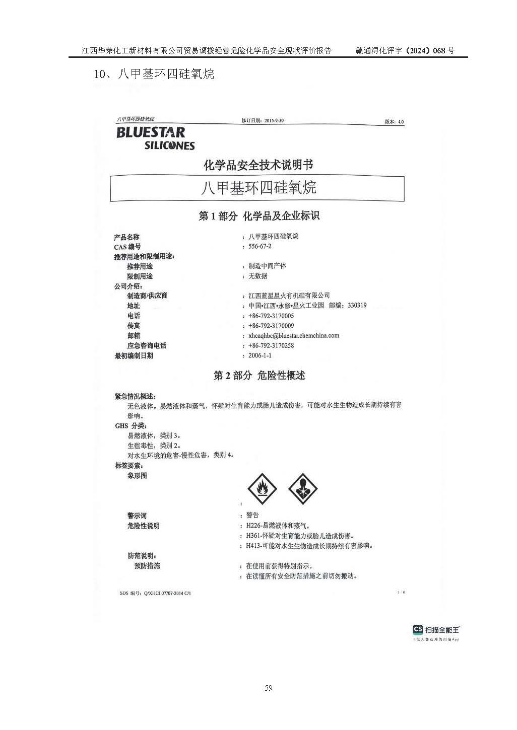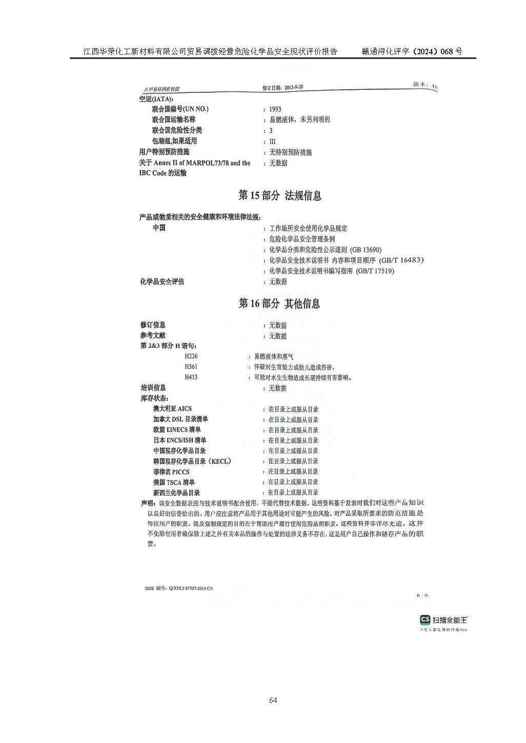 項目簡介 | 江西華榮化工新材料有限公司是一家于2015年11月09日注冊成立的有限責任公司,企業(yè)注冊地址與經營場所位于江西省九江市永修縣湖東新區(qū)開發(fā)大道南側銅鑼灣廣場總部經濟大樓908室,注冊資本與實收資本均為200萬元人民幣。該公司現(xiàn)有員工5人,法定**人王汝華。公司目前經營范圍為:許可項目:危險化學品經營(依法須經批準的項目,經相關部門批準后在許可**期內方可開展經營活動,具體經營項目和許可期限以相關部門批準文件或許可證件為準)一般項目:化工產品銷售(不含許可類化工產品),橡膠制品銷售,建筑材料銷售,金屬材料銷售,貨物進出口,信息技術咨詢服務(除依法須經批準的項目外,憑營業(yè)執(zhí)照依法自主開展經營活動)。 江西華榮化工新材料有限公司以貿易調撥方式經營危險化學品,品種為:甲基三氯硅烷、二甲基二氯硅烷、**基氯硅烷、四氯化硅、六甲基二硅氧烷、六甲基二硅氮烷、正硅酸乙酯、二甲基硅氧烷混合環(huán)體、六甲基環(huán)三硅氧烷、八甲基環(huán)四硅氧烷、四甲基硅烷、二甲基二乙氧基硅烷、甲基氫二氯硅烷(又稱為甲基二氯硅烷,新增)、[閉杯閃點≤60℃](36.有機硅類膠粘劑/54.有機硅樹脂)。不涉及危險化學品的運輸、儲存、店面零售、經營場所樣品擺放等問題。企業(yè)貿易調撥經營的危險化學品由具有危險化學品經營資質或生產廠家供貨,經營的危險化學品的運輸委托具有相應資質的單位承擔。 根據(jù)《危險化學品安全管理條例》(***第645號令修訂)、《危險化學品經營許可證管理辦法》(**安監(jiān)總局第55號令,第79號令修改)等法規(guī)和文件的要求,《危險化學品經營許可證》申請單位,應提供《安全評價報告》。 江西華榮化工新材料有限公司已向發(fā)證部門提出申請,目前正在做申請的準備工作,故委托江西通安安全評價有限公司承擔其貿易調撥經營危險化學品安全條件現(xiàn)狀評價工作。 江西通安安全評價有限公司接受委托后,組織了評價組;于2024年6月對該公司辦公經營場所進行了現(xiàn)場踏勘,查詢該公司經營管理模式及規(guī)章制度執(zhí)行情況。依據(jù)《安全評價通則》(AQ8001-2007)的要求,評價組完成了風險分析、資料收集、現(xiàn)場勘查和類比調查等前期準備工作。在此基礎上,根據(jù)企業(yè)提供的資料,分析了該企業(yè)在貿易調撥經營過程中可能存在的危險、有害因素。選擇了相應的安全評價方法逐項進行分析、評價,提出相應的預防和控制對策措施;并與企業(yè)安全管理人員進行了溝通后,編制完成了本評價報告,以作為企業(yè)申辦《危險化學品經營許可證》的安全技術依據(jù)。 本次評價范圍為江西華榮化工新材料有限公司貿易調撥經營危險化學品過程中的安全條件及安全管理方面的現(xiàn)狀。包括經營過程中安全管理的組織、機構、人員及安全管理制度等。該單位不涉及貿易調撥經營危險化學品的運輸、儲存,其委托危險化學品的道路運輸、儲存不在本評價范圍內。 | ||||||