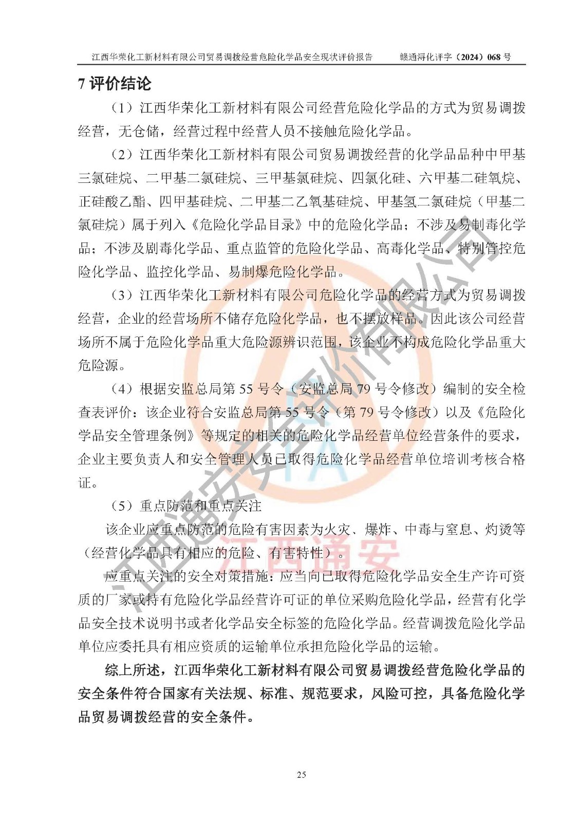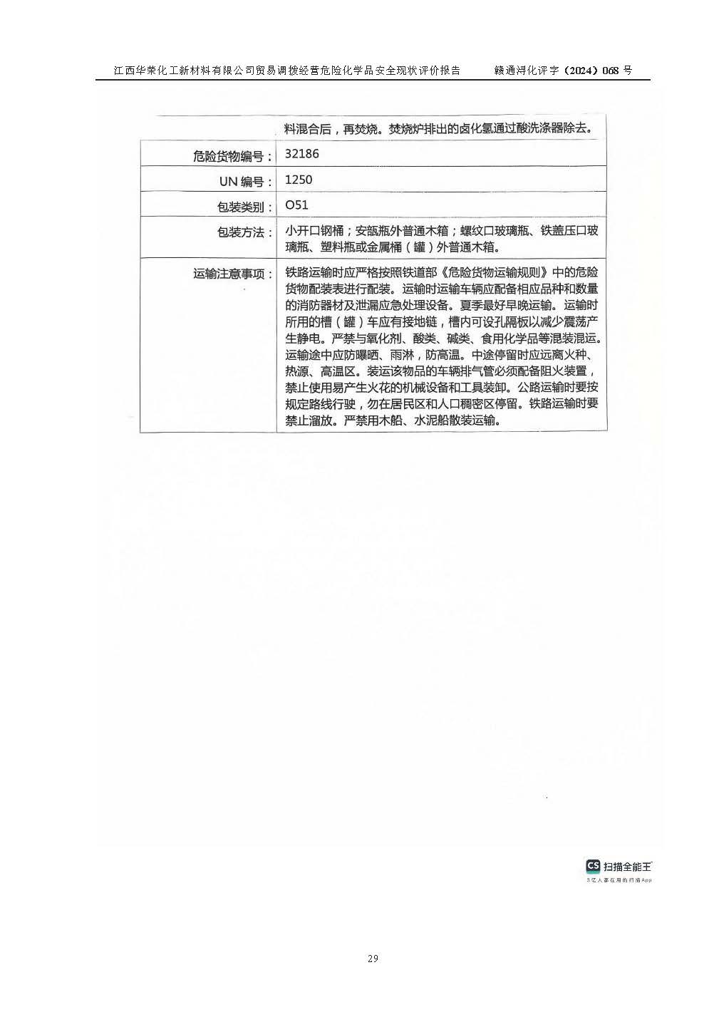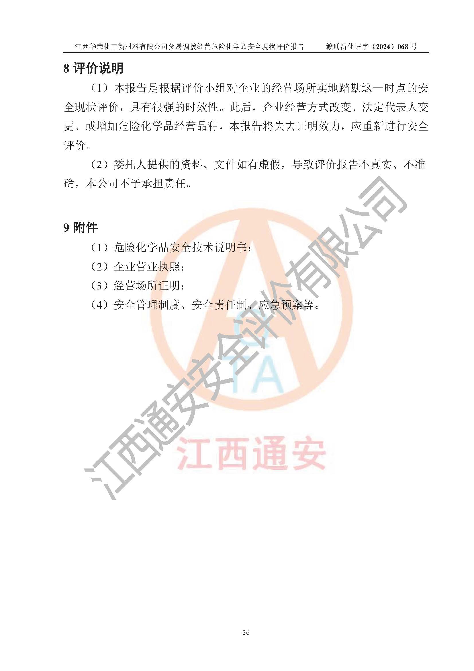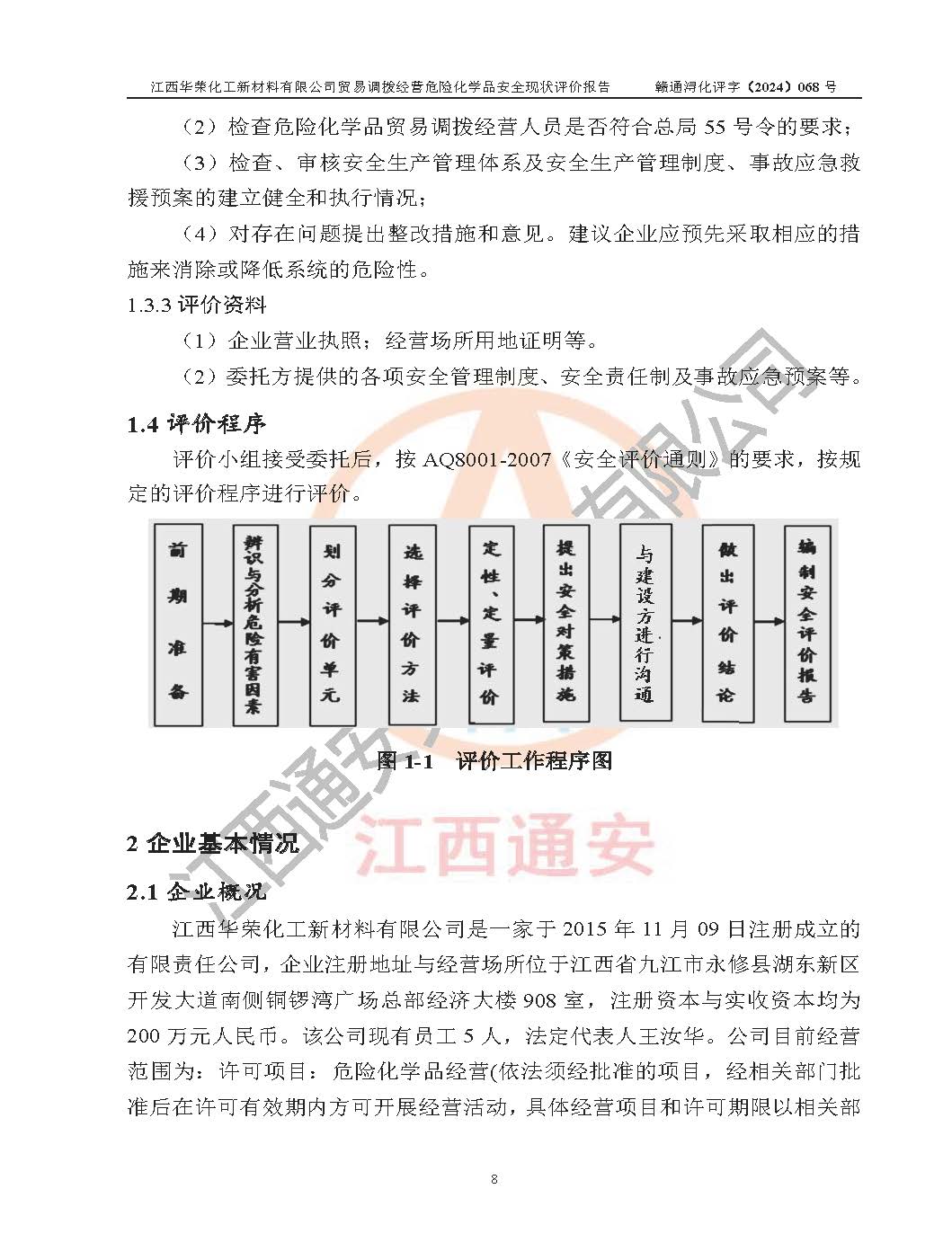 評價結論 | 綜上所述:江西華榮化工新材料有限公司貿易調撥經營危險化學品的安全條件符合**有關法規(guī)、標準、規(guī)范要求,風險可控,具備危險化學品貿易調撥經營的安全條件。 | ||||||