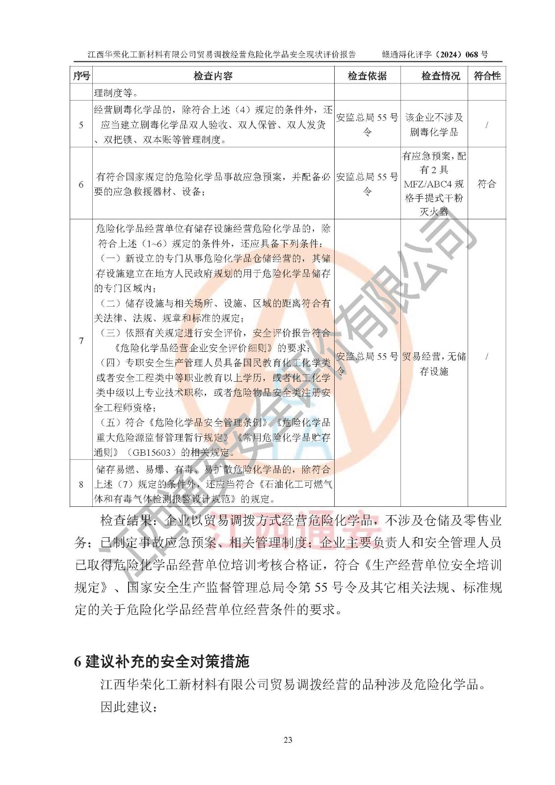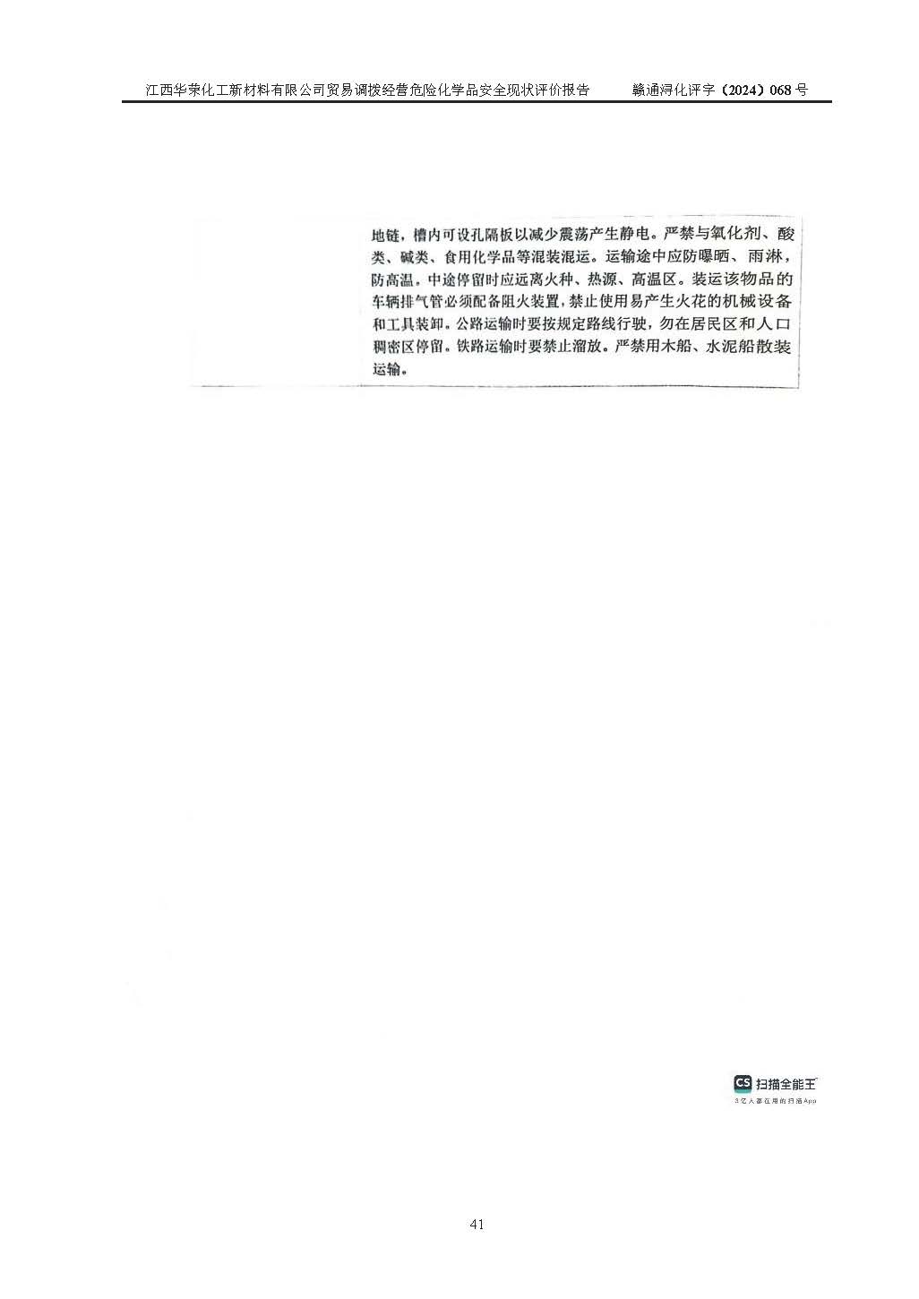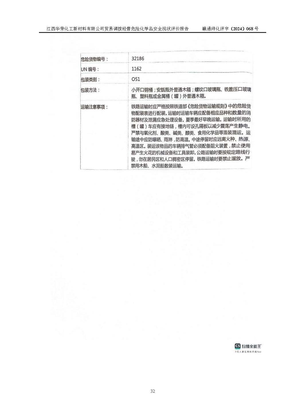 評價結論 | 綜上所述:江西華榮化工新材料有限公司貿易調撥經營危險化學品的安全條件符合**有關法規(guī)、標準、規(guī)范要求,風險可控,具備危險化學品貿易調撥經營的安全條件。 | ||||||