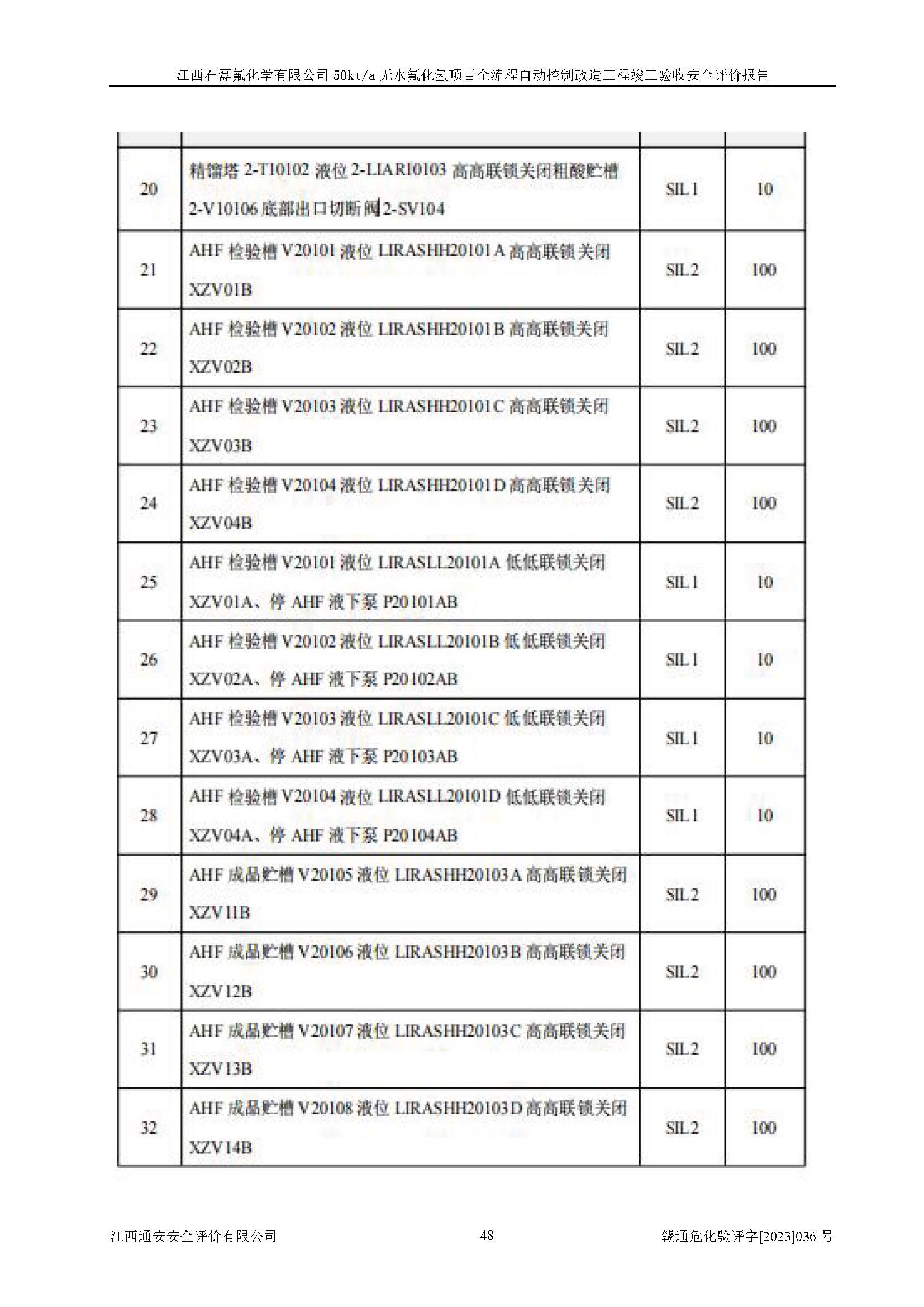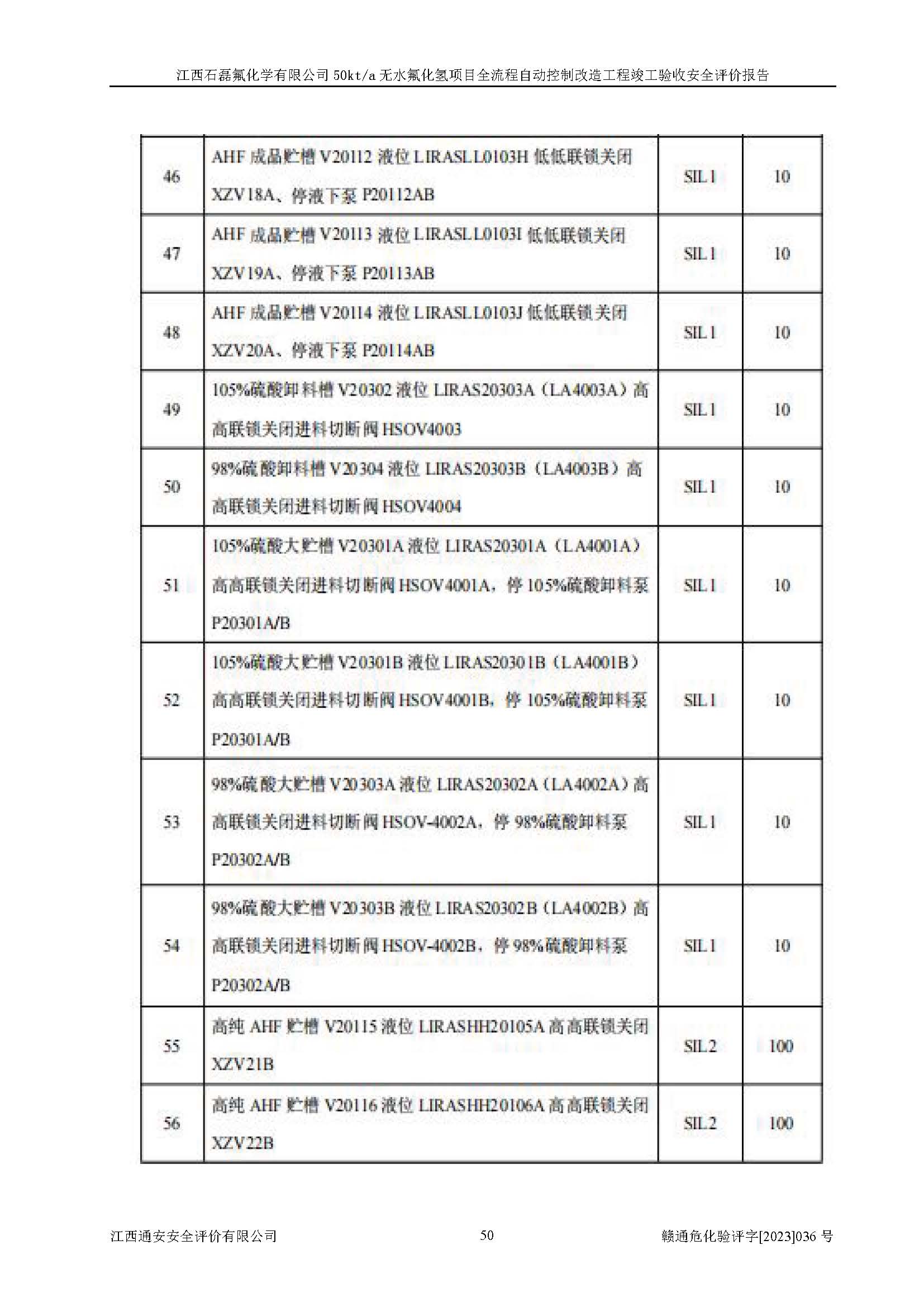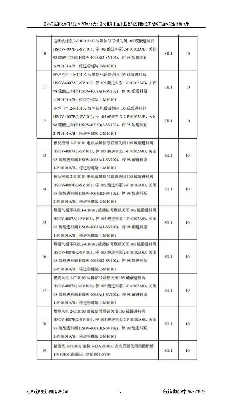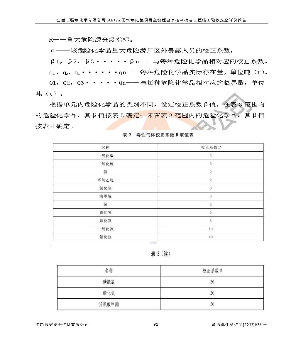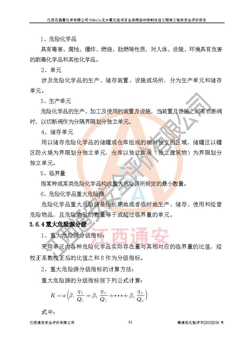 根據(jù)江西石磊氟化學(xué)有限公司提供的技術(shù)資料,通過(guò)現(xiàn)場(chǎng)檢查以及對(duì)主要危險(xiǎn)有害因素分析,以及采用定性、定量評(píng)價(jià)法進(jìn)行評(píng)價(jià)和分析,依據(jù)**相關(guān)法規(guī)標(biāo)準(zhǔn),得出評(píng)價(jià)結(jié)論。 1、該工程涉及的危險(xiǎn)化學(xué)品有:氟化氫、氫氟酸、硫酸、發(fā)煙硫酸、氟硅酸、煤氣、柴油(柴油發(fā)電機(jī)用)。 2、該工程中存在的主要危險(xiǎn)有:火災(zāi)、爆炸、中毒窒息、灼燙、觸電、機(jī)械傷害、高處墜落、起重傷害、凍傷、淹溺等。其中火災(zāi)爆炸、中毒和窒息是*主要的危險(xiǎn)因素。 3、該工程涉及的各種化學(xué)品中,硫酸屬于第三類易制毒危險(xiǎn)化學(xué)品,不涉及易制爆化學(xué)品。 4、本項(xiàng)目所涉及的原輔材料及產(chǎn)品、中間產(chǎn)品、副產(chǎn)品中,氟化氫、氫氟酸、CO(存在于發(fā)生爐煤氣中)屬于重點(diǎn)監(jiān)管的危險(xiǎn)化學(xué)品。不涉及特別管控危險(xiǎn)化學(xué)品。 5、該工程項(xiàng)目涉及的氟化氫、CO(存在于發(fā)生爐煤氣中)屬于高毒物品。 6、本項(xiàng)目煤焦油的危險(xiǎn)性類別包括致癌性,類別1A,根據(jù)《職業(yè)性接觸毒物危害程度分級(jí)》(GBZ 230-2010)的規(guī)定:屬于明確人類致癌物的,直接列為極度危害。因此本項(xiàng)目煤焦油為極度危害介質(zhì)。 7、該公司201AHF儲(chǔ)罐區(qū)儲(chǔ)存單元構(gòu)成**危險(xiǎn)化學(xué)品重大危險(xiǎn)源,202有水酸生產(chǎn)裝置區(qū)生產(chǎn)單元構(gòu)成四級(jí)危險(xiǎn)化學(xué)品重大危險(xiǎn)源 8、根據(jù)《**安全監(jiān)管總局關(guān)于公布首批重點(diǎn)監(jiān)管的危險(xiǎn)化工工藝目錄的通知》(安監(jiān)總管三〔2009〕116號(hào))和《**安全監(jiān)管總局關(guān)于公布第二批重點(diǎn)監(jiān)管危險(xiǎn)化工工藝目錄和調(diào)整首批重點(diǎn)監(jiān)管危險(xiǎn)化工工藝中部分典型工藝的通知》(安監(jiān)總管三〔2013〕3號(hào))進(jìn)行危險(xiǎn)工藝辨識(shí):該工程無(wú)水氟化氫(AHF)生產(chǎn)裝置生產(chǎn)過(guò)程涉及的氟化工藝為重點(diǎn)監(jiān)管的危險(xiǎn)化工工藝。 9、江西石磊氟化學(xué)有限公司50kt/a無(wú)水氟化氫項(xiàng)目自動(dòng)控制技術(shù)改造工程的設(shè)計(jì)、安裝施工和調(diào)試單位的資質(zhì)均符合要求。 10、江西石磊氟化學(xué)有限公司50kt/a無(wú)水氟化氫項(xiàng)目全流程自動(dòng)控制改造設(shè)計(jì)方案中提出的控制措施已得到落實(shí),企業(yè)控制系統(tǒng)設(shè)置情況與設(shè)計(jì)方案一致,設(shè)計(jì)、施工和調(diào)試單位由有**相應(yīng)資質(zhì)的自控系統(tǒng)施工單位進(jìn)行施工,并對(duì)自動(dòng)控制系統(tǒng)調(diào)試合格,出具了竣工圖,安全設(shè)施及安全管理符合**及有關(guān)部門(mén)關(guān)于安全生產(chǎn)法律、法規(guī)、標(biāo)準(zhǔn)的要求,安全風(fēng)險(xiǎn)程度是可以接受的,安全風(fēng)險(xiǎn)可控,滿足《江西省應(yīng)急管理廳關(guān)于印發(fā)<江西省化工企業(yè)自動(dòng)化提升實(shí)施方案>(試行)的通知》(贛應(yīng)急字[2021]190號(hào))的要求,具備全流程自動(dòng)控制改造工程竣工驗(yàn)收條件。 |