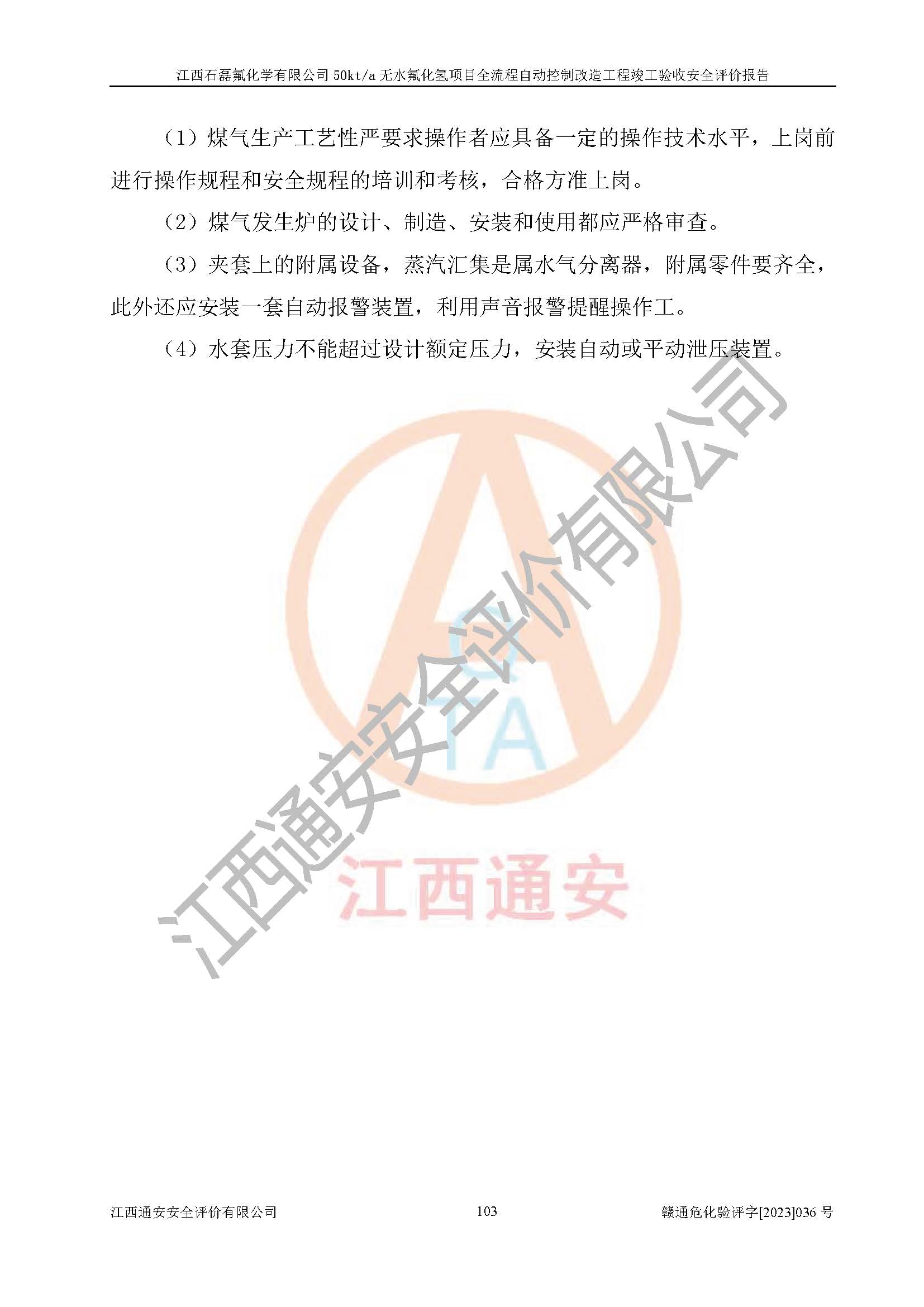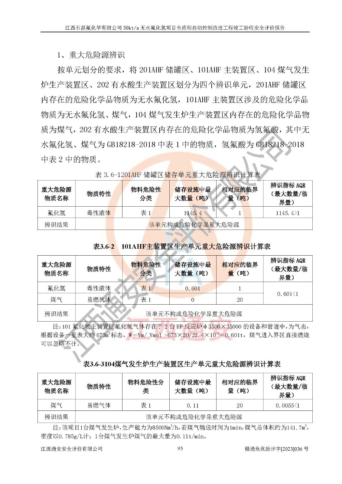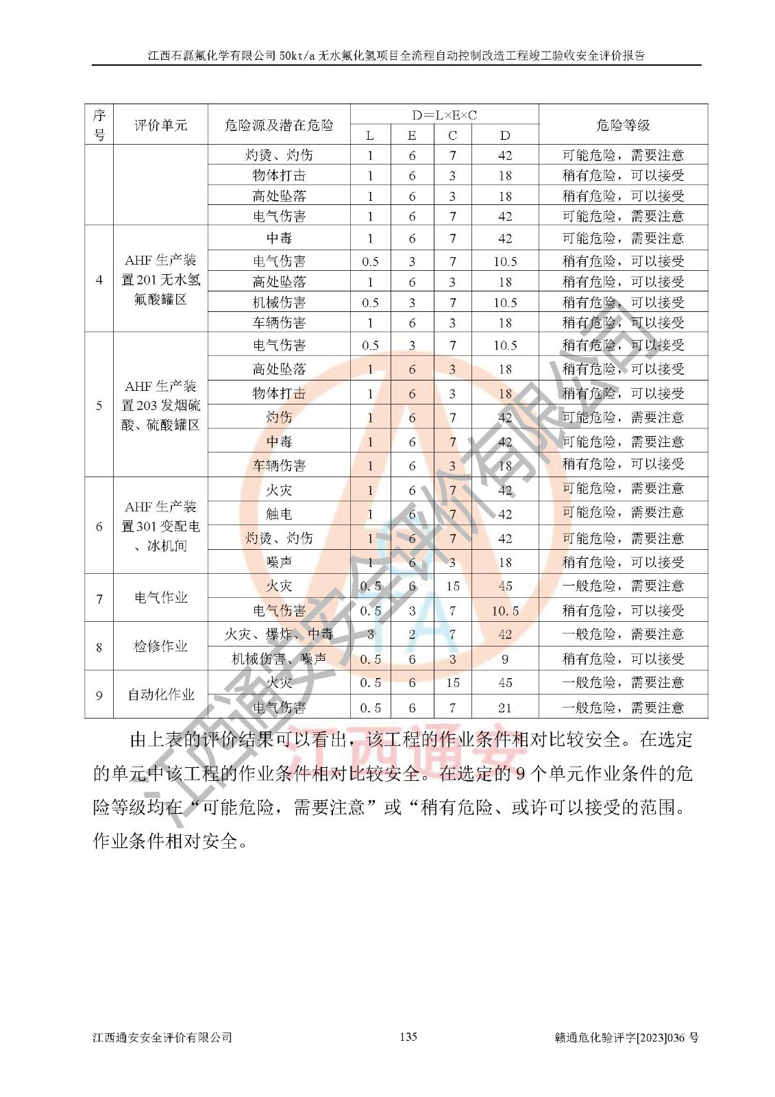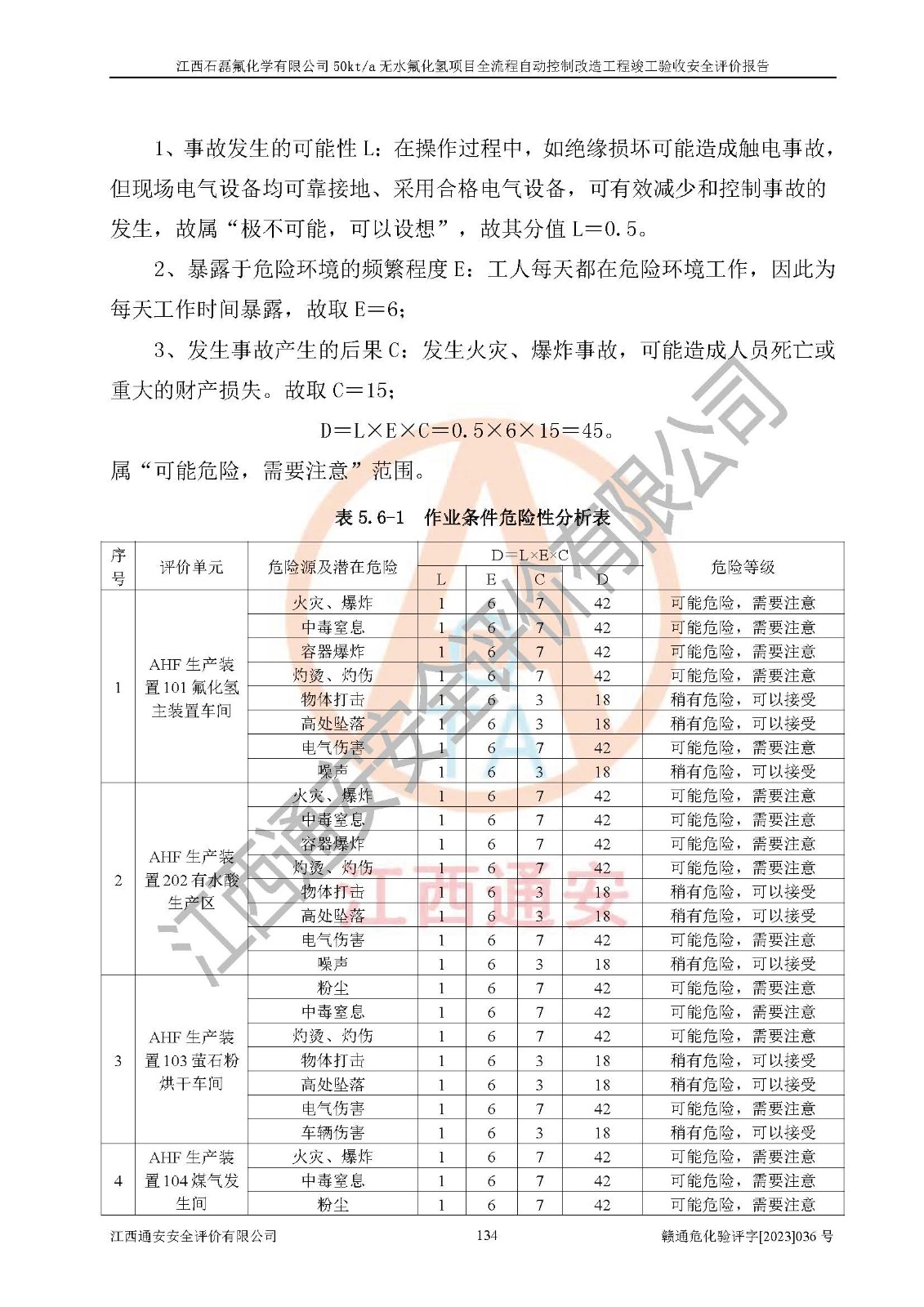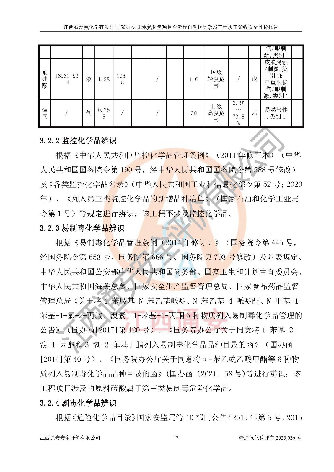 根據(jù)江西石磊氟化學(xué)有限公司提供的技術(shù)資料,通過(guò)現(xiàn)場(chǎng)檢查以及對(duì)主要危險(xiǎn)有害因素分析,以及采用定性、定量評(píng)價(jià)法進(jìn)行評(píng)價(jià)和分析,依據(jù)**相關(guān)法規(guī)標(biāo)準(zhǔn),得出評(píng)價(jià)結(jié)論。 1、該工程涉及的危險(xiǎn)化學(xué)品有:氟化氫、氫氟酸、硫酸、發(fā)煙硫酸、氟硅酸、煤氣、柴油(柴油發(fā)電機(jī)用)。 2、該工程中存在的主要危險(xiǎn)有:火災(zāi)、爆炸、中毒窒息、灼燙、觸電、機(jī)械傷害、高處墜落、起重傷害、凍傷、淹溺等。其中火災(zāi)爆炸、中毒和窒息是*主要的危險(xiǎn)因素。 3、該工程涉及的各種化學(xué)品中,硫酸屬于第三類易制毒危險(xiǎn)化學(xué)品,不涉及易制爆化學(xué)品。 4、本項(xiàng)目所涉及的原輔材料及產(chǎn)品、中間產(chǎn)品、副產(chǎn)品中,氟化氫、氫氟酸、CO(存在于發(fā)生爐煤氣中)屬于重點(diǎn)監(jiān)管的危險(xiǎn)化學(xué)品。不涉及特別管控危險(xiǎn)化學(xué)品。 5、該工程項(xiàng)目涉及的氟化氫、CO(存在于發(fā)生爐煤氣中)屬于高毒物品。 6、本項(xiàng)目煤焦油的危險(xiǎn)性類別包括致癌性,類別1A,根據(jù)《職業(yè)性接觸毒物危害程度分級(jí)》(GBZ 230-2010)的規(guī)定:屬于明確人類致癌物的,直接列為極度危害。因此本項(xiàng)目煤焦油為極度危害介質(zhì)。 7、該公司201AHF儲(chǔ)罐區(qū)儲(chǔ)存單元構(gòu)成**危險(xiǎn)化學(xué)品重大危險(xiǎn)源,202有水酸生產(chǎn)裝置區(qū)生產(chǎn)單元構(gòu)成四級(jí)危險(xiǎn)化學(xué)品重大危險(xiǎn)源 8、根據(jù)《**安全監(jiān)管總局關(guān)于公布首批重點(diǎn)監(jiān)管的危險(xiǎn)化工工藝目錄的通知》(安監(jiān)總管三〔2009〕116號(hào))和《**安全監(jiān)管總局關(guān)于公布第二批重點(diǎn)監(jiān)管危險(xiǎn)化工工藝目錄和調(diào)整首批重點(diǎn)監(jiān)管危險(xiǎn)化工工藝中部分典型工藝的通知》(安監(jiān)總管三〔2013〕3號(hào))進(jìn)行危險(xiǎn)工藝辨識(shí):該工程無(wú)水氟化氫(AHF)生產(chǎn)裝置生產(chǎn)過(guò)程涉及的氟化工藝為重點(diǎn)監(jiān)管的危險(xiǎn)化工工藝。 9、江西石磊氟化學(xué)有限公司50kt/a無(wú)水氟化氫項(xiàng)目自動(dòng)控制技術(shù)改造工程的設(shè)計(jì)、安裝施工和調(diào)試單位的資質(zhì)均符合要求。 10、江西石磊氟化學(xué)有限公司50kt/a無(wú)水氟化氫項(xiàng)目全流程自動(dòng)控制改造設(shè)計(jì)方案中提出的控制措施已得到落實(shí),企業(yè)控制系統(tǒng)設(shè)置情況與設(shè)計(jì)方案一致,設(shè)計(jì)、施工和調(diào)試單位由有**相應(yīng)資質(zhì)的自控系統(tǒng)施工單位進(jìn)行施工,并對(duì)自動(dòng)控制系統(tǒng)調(diào)試合格,出具了竣工圖,安全設(shè)施及安全管理符合**及有關(guān)部門(mén)關(guān)于安全生產(chǎn)法律、法規(guī)、標(biāo)準(zhǔn)的要求,安全風(fēng)險(xiǎn)程度是可以接受的,安全風(fēng)險(xiǎn)可控,滿足《江西省應(yīng)急管理廳關(guān)于印發(fā)<江西省化工企業(yè)自動(dòng)化提升實(shí)施方案>(試行)的通知》(贛應(yīng)急字[2021]190號(hào))的要求,具備全流程自動(dòng)控制改造工程竣工驗(yàn)收條件。 |