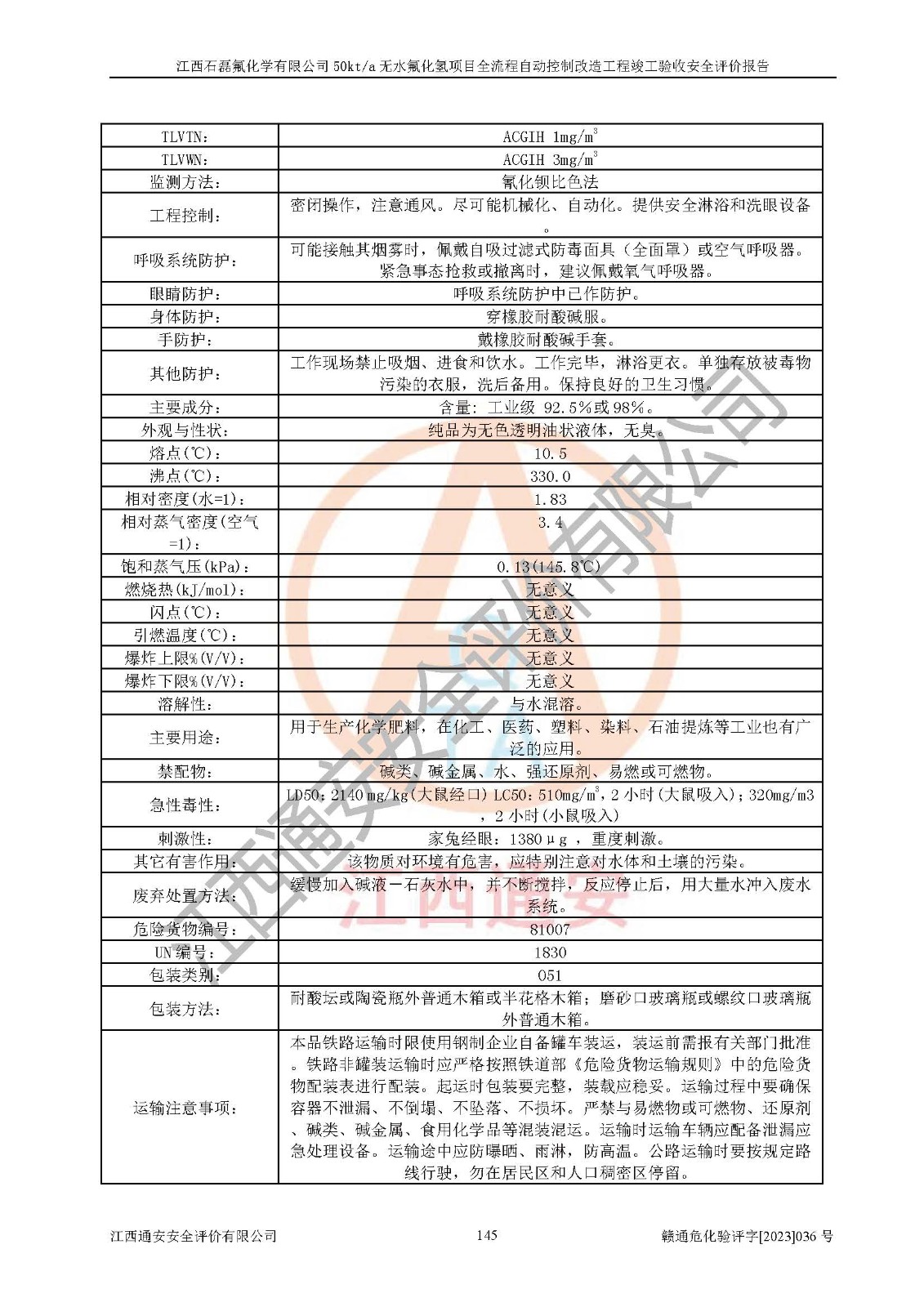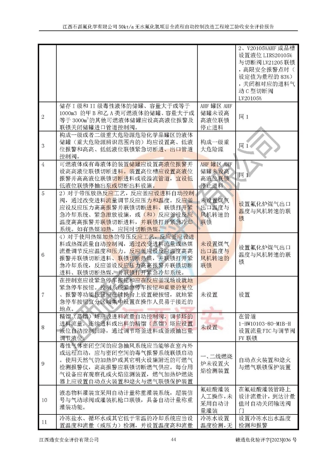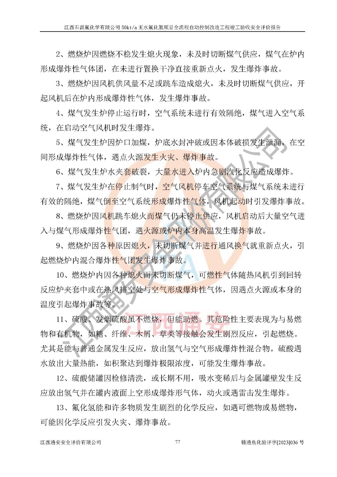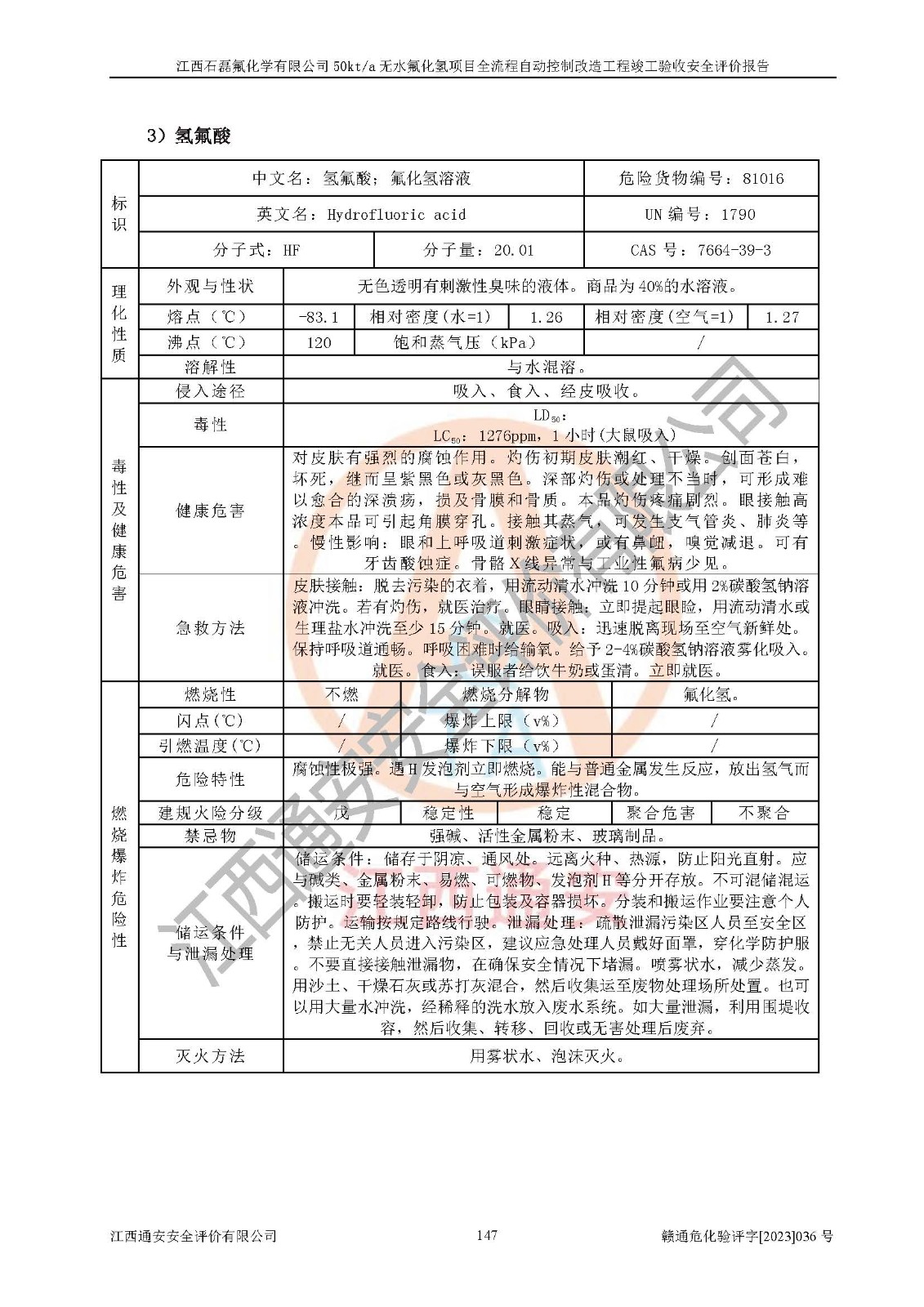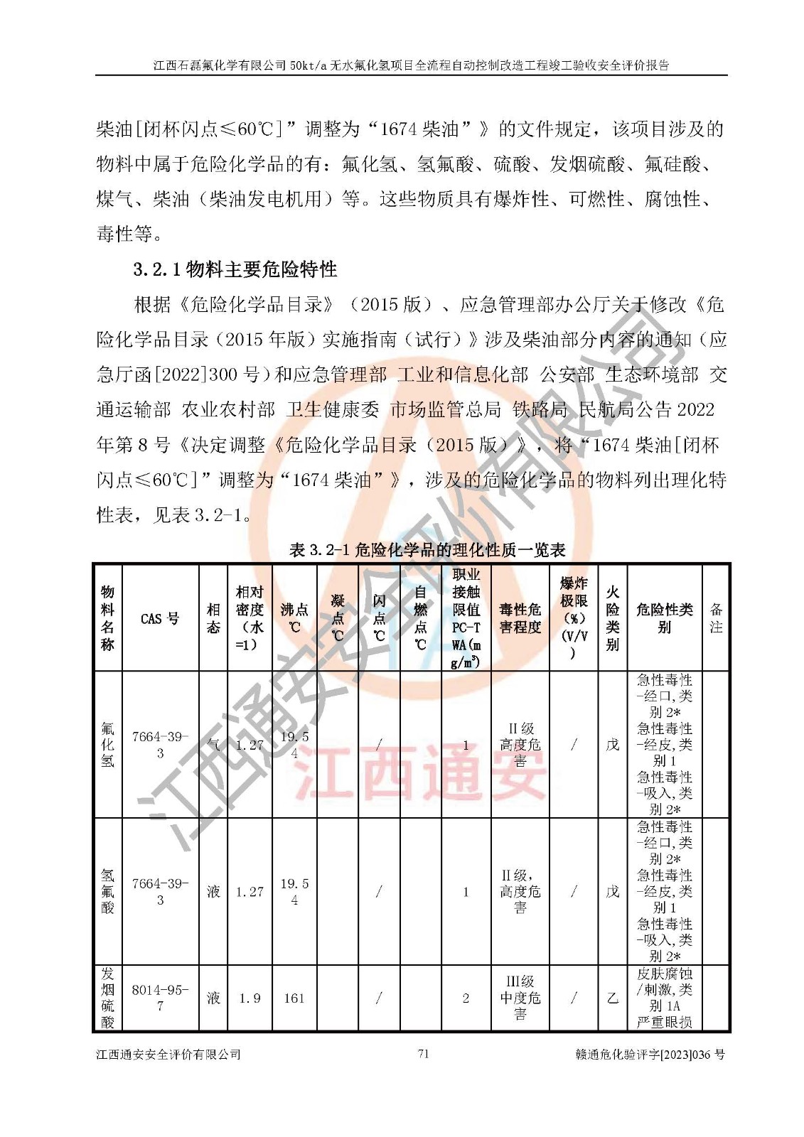 根據(jù)江西石磊氟化學(xué)有限公司提供的技術(shù)資料,通過(guò)現(xiàn)場(chǎng)檢查以及對(duì)主要危險(xiǎn)有害因素分析,以及采用定性、定量評(píng)價(jià)法進(jìn)行評(píng)價(jià)和分析,依據(jù)**相關(guān)法規(guī)標(biāo)準(zhǔn),得出評(píng)價(jià)結(jié)論。 1、該工程涉及的危險(xiǎn)化學(xué)品有:氟化氫、氫氟酸、硫酸、發(fā)煙硫酸、氟硅酸、煤氣、柴油(柴油發(fā)電機(jī)用)。 2、該工程中存在的主要危險(xiǎn)有:火災(zāi)、爆炸、中毒窒息、灼燙、觸電、機(jī)械傷害、高處墜落、起重傷害、凍傷、淹溺等。其中火災(zāi)爆炸、中毒和窒息是*主要的危險(xiǎn)因素。 3、該工程涉及的各種化學(xué)品中,硫酸屬于第三類易制毒危險(xiǎn)化學(xué)品,不涉及易制爆化學(xué)品。 4、本項(xiàng)目所涉及的原輔材料及產(chǎn)品、中間產(chǎn)品、副產(chǎn)品中,氟化氫、氫氟酸、CO(存在于發(fā)生爐煤氣中)屬于重點(diǎn)監(jiān)管的危險(xiǎn)化學(xué)品。不涉及特別管控危險(xiǎn)化學(xué)品。 5、該工程項(xiàng)目涉及的氟化氫、CO(存在于發(fā)生爐煤氣中)屬于高毒物品。 6、本項(xiàng)目煤焦油的危險(xiǎn)性類別包括致癌性,類別1A,根據(jù)《職業(yè)性接觸毒物危害程度分級(jí)》(GBZ 230-2010)的規(guī)定:屬于明確人類致癌物的,直接列為極度危害。因此本項(xiàng)目煤焦油為極度危害介質(zhì)。 7、該公司201AHF儲(chǔ)罐區(qū)儲(chǔ)存單元構(gòu)成**危險(xiǎn)化學(xué)品重大危險(xiǎn)源,202有水酸生產(chǎn)裝置區(qū)生產(chǎn)單元構(gòu)成四級(jí)危險(xiǎn)化學(xué)品重大危險(xiǎn)源 8、根據(jù)《**安全監(jiān)管總局關(guān)于公布首批重點(diǎn)監(jiān)管的危險(xiǎn)化工工藝目錄的通知》(安監(jiān)總管三〔2009〕116號(hào))和《**安全監(jiān)管總局關(guān)于公布第二批重點(diǎn)監(jiān)管危險(xiǎn)化工工藝目錄和調(diào)整首批重點(diǎn)監(jiān)管危險(xiǎn)化工工藝中部分典型工藝的通知》(安監(jiān)總管三〔2013〕3號(hào))進(jìn)行危險(xiǎn)工藝辨識(shí):該工程無(wú)水氟化氫(AHF)生產(chǎn)裝置生產(chǎn)過(guò)程涉及的氟化工藝為重點(diǎn)監(jiān)管的危險(xiǎn)化工工藝。 9、江西石磊氟化學(xué)有限公司50kt/a無(wú)水氟化氫項(xiàng)目自動(dòng)控制技術(shù)改造工程的設(shè)計(jì)、安裝施工和調(diào)試單位的資質(zhì)均符合要求。 10、江西石磊氟化學(xué)有限公司50kt/a無(wú)水氟化氫項(xiàng)目全流程自動(dòng)控制改造設(shè)計(jì)方案中提出的控制措施已得到落實(shí),企業(yè)控制系統(tǒng)設(shè)置情況與設(shè)計(jì)方案一致,設(shè)計(jì)、施工和調(diào)試單位由有**相應(yīng)資質(zhì)的自控系統(tǒng)施工單位進(jìn)行施工,并對(duì)自動(dòng)控制系統(tǒng)調(diào)試合格,出具了竣工圖,安全設(shè)施及安全管理符合**及有關(guān)部門(mén)關(guān)于安全生產(chǎn)法律、法規(guī)、標(biāo)準(zhǔn)的要求,安全風(fēng)險(xiǎn)程度是可以接受的,安全風(fēng)險(xiǎn)可控,滿足《江西省應(yīng)急管理廳關(guān)于印發(fā)<江西省化工企業(yè)自動(dòng)化提升實(shí)施方案>(試行)的通知》(贛應(yīng)急字[2021]190號(hào))的要求,具備全流程自動(dòng)控制改造工程竣工驗(yàn)收條件。 |
