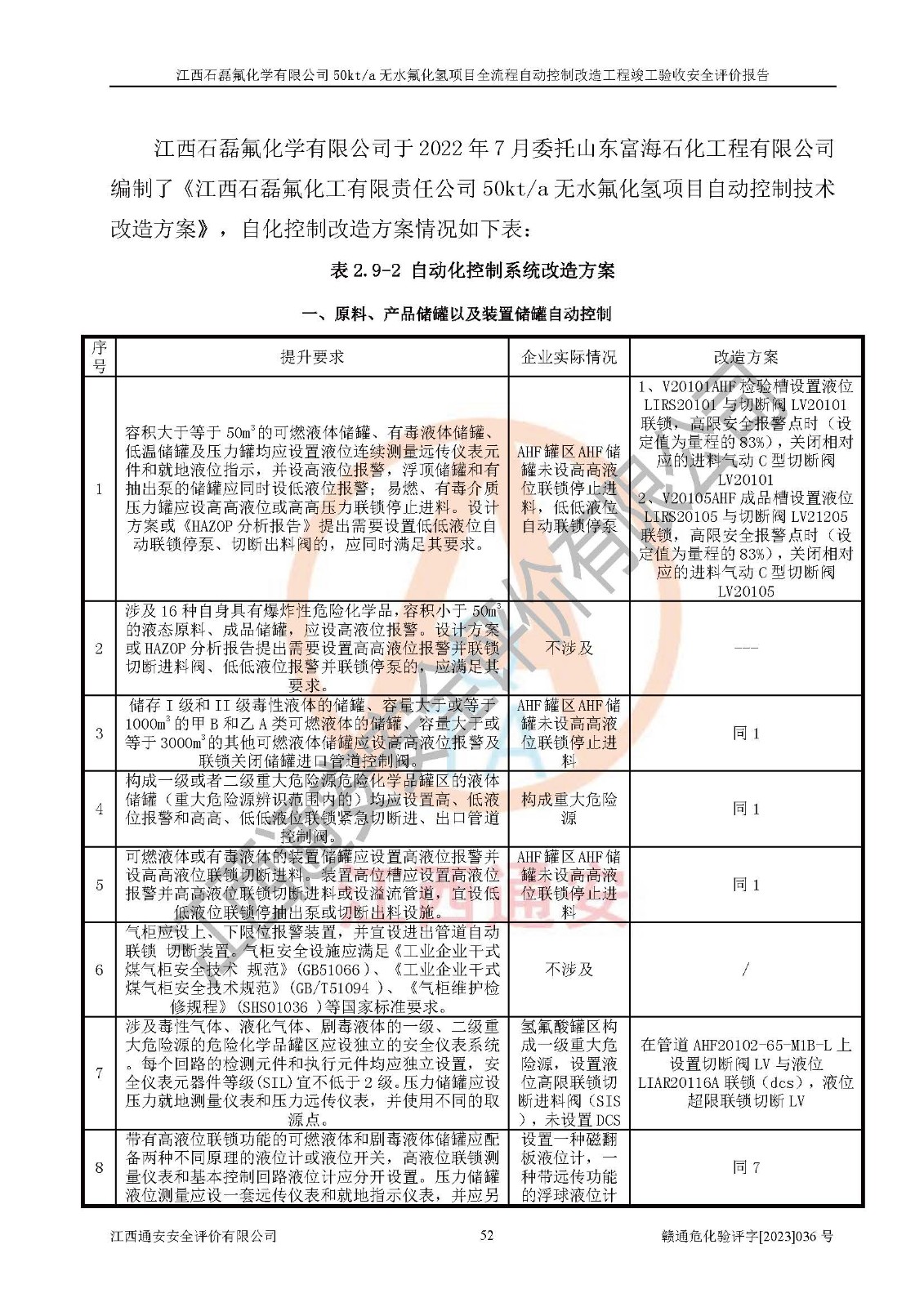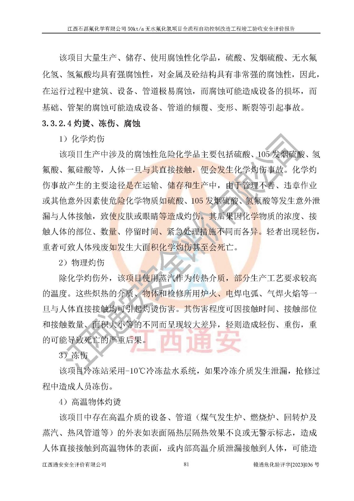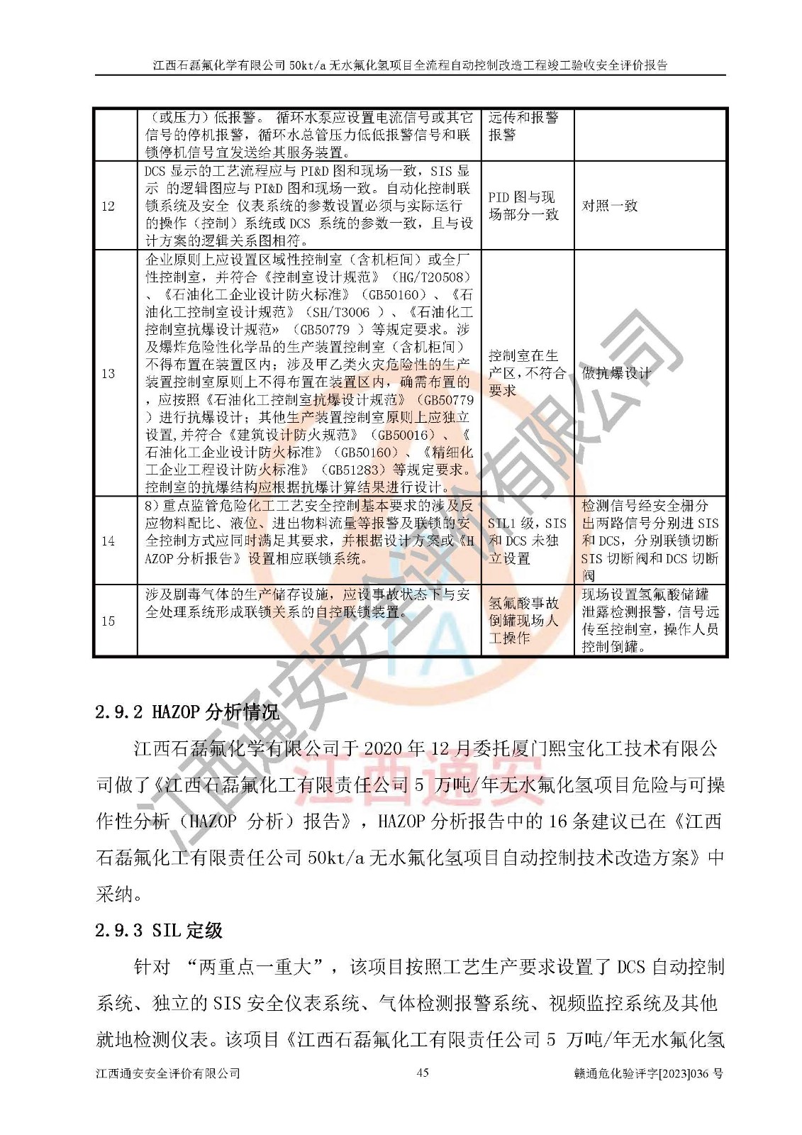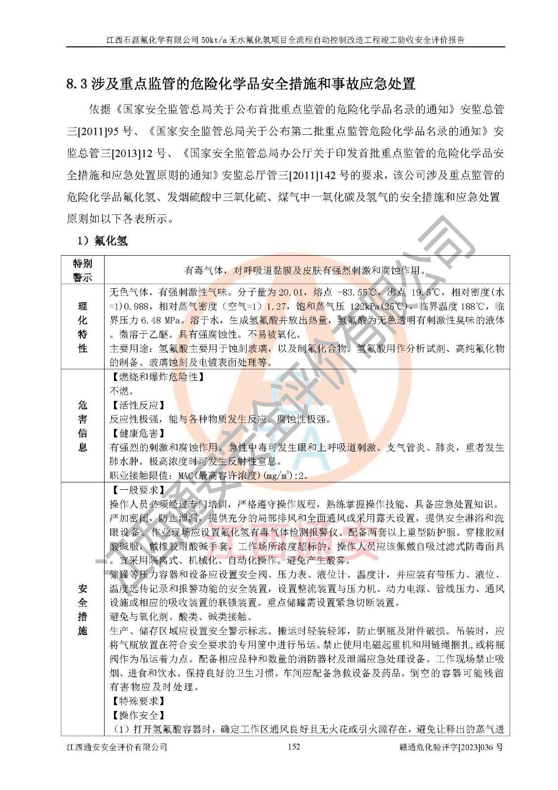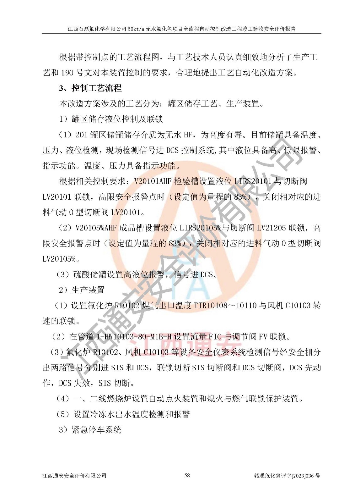 根據(jù)江西石磊氟化學(xué)有限公司提供的技術(shù)資料,通過(guò)現(xiàn)場(chǎng)檢查以及對(duì)主要危險(xiǎn)有害因素分析,以及采用定性、定量評(píng)價(jià)法進(jìn)行評(píng)價(jià)和分析,依據(jù)**相關(guān)法規(guī)標(biāo)準(zhǔn),得出評(píng)價(jià)結(jié)論。 1、該工程涉及的危險(xiǎn)化學(xué)品有:氟化氫、氫氟酸、硫酸、發(fā)煙硫酸、氟硅酸、煤氣、柴油(柴油發(fā)電機(jī)用)。 2、該工程中存在的主要危險(xiǎn)有:火災(zāi)、爆炸、中毒窒息、灼燙、觸電、機(jī)械傷害、高處墜落、起重傷害、凍傷、淹溺等。其中火災(zāi)爆炸、中毒和窒息是*主要的危險(xiǎn)因素。 3、該工程涉及的各種化學(xué)品中,硫酸屬于第三類易制毒危險(xiǎn)化學(xué)品,不涉及易制爆化學(xué)品。 4、本項(xiàng)目所涉及的原輔材料及產(chǎn)品、中間產(chǎn)品、副產(chǎn)品中,氟化氫、氫氟酸、CO(存在于發(fā)生爐煤氣中)屬于重點(diǎn)監(jiān)管的危險(xiǎn)化學(xué)品。不涉及特別管控危險(xiǎn)化學(xué)品。 5、該工程項(xiàng)目涉及的氟化氫、CO(存在于發(fā)生爐煤氣中)屬于高毒物品。 6、本項(xiàng)目煤焦油的危險(xiǎn)性類別包括致癌性,類別1A,根據(jù)《職業(yè)性接觸毒物危害程度分級(jí)》(GBZ 230-2010)的規(guī)定:屬于明確人類致癌物的,直接列為極度危害。因此本項(xiàng)目煤焦油為極度危害介質(zhì)。 7、該公司201AHF儲(chǔ)罐區(qū)儲(chǔ)存單元構(gòu)成**危險(xiǎn)化學(xué)品重大危險(xiǎn)源,202有水酸生產(chǎn)裝置區(qū)生產(chǎn)單元構(gòu)成四級(jí)危險(xiǎn)化學(xué)品重大危險(xiǎn)源 8、根據(jù)《**安全監(jiān)管總局關(guān)于公布首批重點(diǎn)監(jiān)管的危險(xiǎn)化工工藝目錄的通知》(安監(jiān)總管三〔2009〕116號(hào))和《**安全監(jiān)管總局關(guān)于公布第二批重點(diǎn)監(jiān)管危險(xiǎn)化工工藝目錄和調(diào)整首批重點(diǎn)監(jiān)管危險(xiǎn)化工工藝中部分典型工藝的通知》(安監(jiān)總管三〔2013〕3號(hào))進(jìn)行危險(xiǎn)工藝辨識(shí):該工程無(wú)水氟化氫(AHF)生產(chǎn)裝置生產(chǎn)過(guò)程涉及的氟化工藝為重點(diǎn)監(jiān)管的危險(xiǎn)化工工藝。 9、江西石磊氟化學(xué)有限公司50kt/a無(wú)水氟化氫項(xiàng)目自動(dòng)控制技術(shù)改造工程的設(shè)計(jì)、安裝施工和調(diào)試單位的資質(zhì)均符合要求。 10、江西石磊氟化學(xué)有限公司50kt/a無(wú)水氟化氫項(xiàng)目全流程自動(dòng)控制改造設(shè)計(jì)方案中提出的控制措施已得到落實(shí),企業(yè)控制系統(tǒng)設(shè)置情況與設(shè)計(jì)方案一致,設(shè)計(jì)、施工和調(diào)試單位由有**相應(yīng)資質(zhì)的自控系統(tǒng)施工單位進(jìn)行施工,并對(duì)自動(dòng)控制系統(tǒng)調(diào)試合格,出具了竣工圖,安全設(shè)施及安全管理符合**及有關(guān)部門(mén)關(guān)于安全生產(chǎn)法律、法規(guī)、標(biāo)準(zhǔn)的要求,安全風(fēng)險(xiǎn)程度是可以接受的,安全風(fēng)險(xiǎn)可控,滿足《江西省應(yīng)急管理廳關(guān)于印發(fā)<江西省化工企業(yè)自動(dòng)化提升實(shí)施方案>(試行)的通知》(贛應(yīng)急字[2021]190號(hào))的要求,具備全流程自動(dòng)控制改造工程竣工驗(yàn)收條件。 |