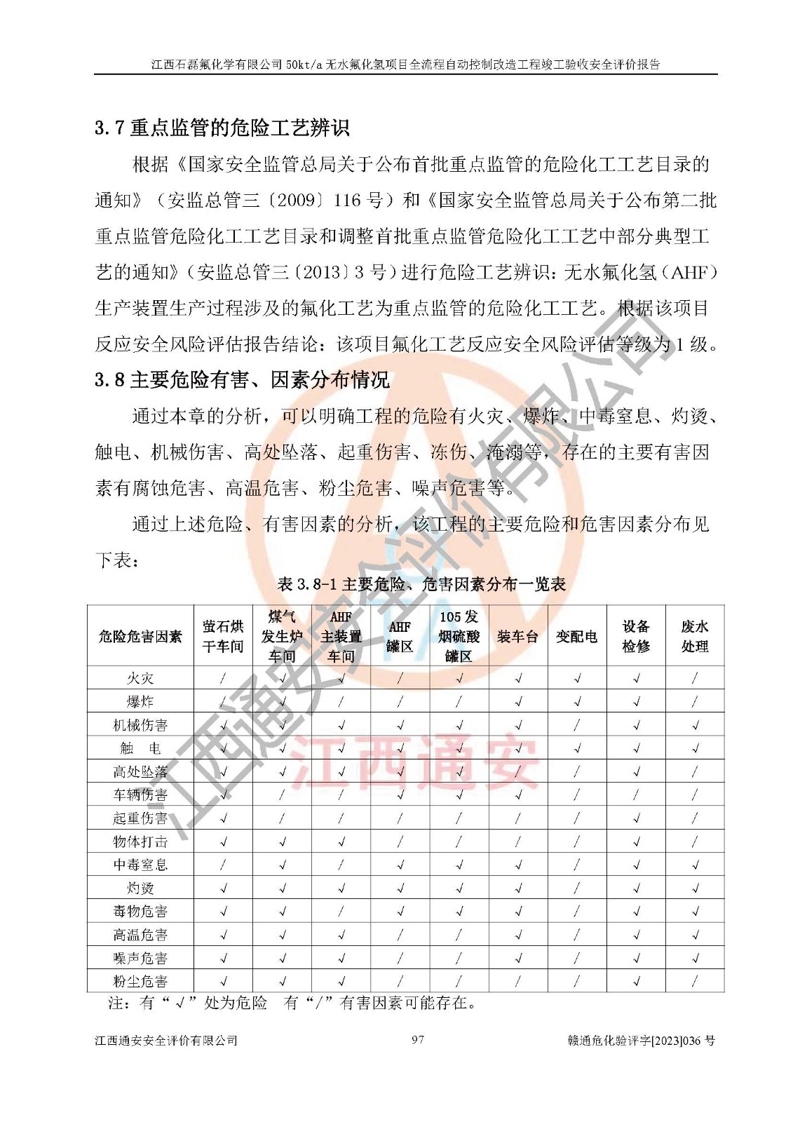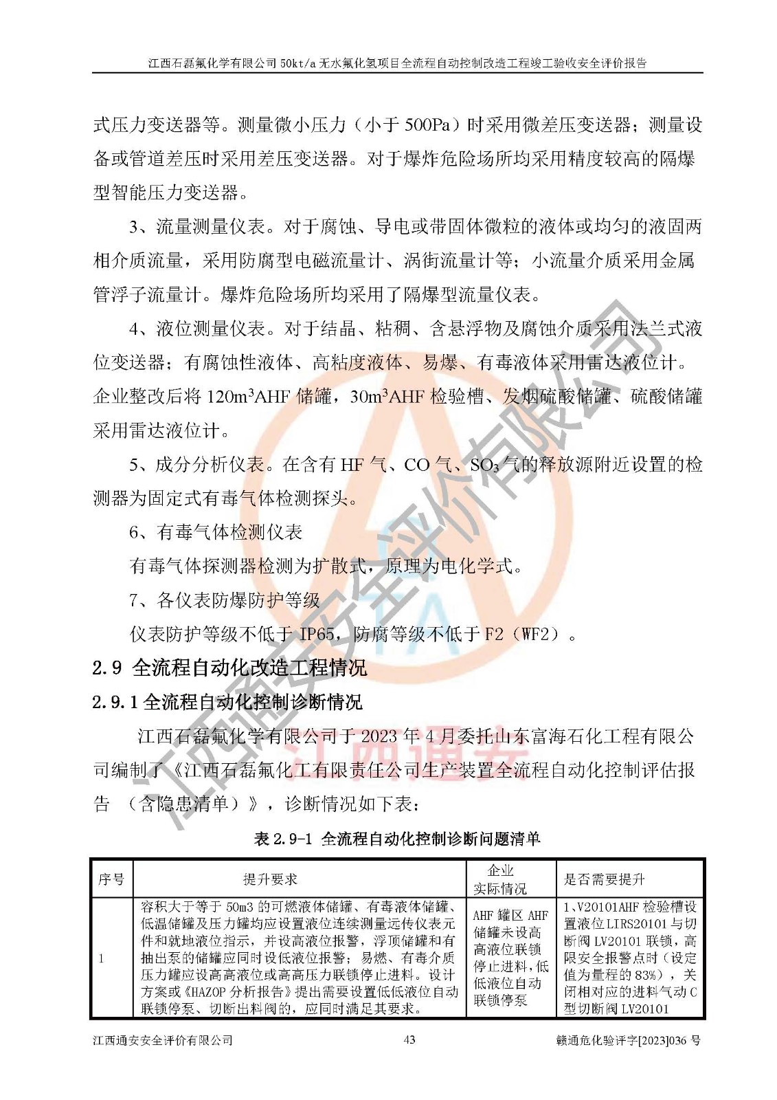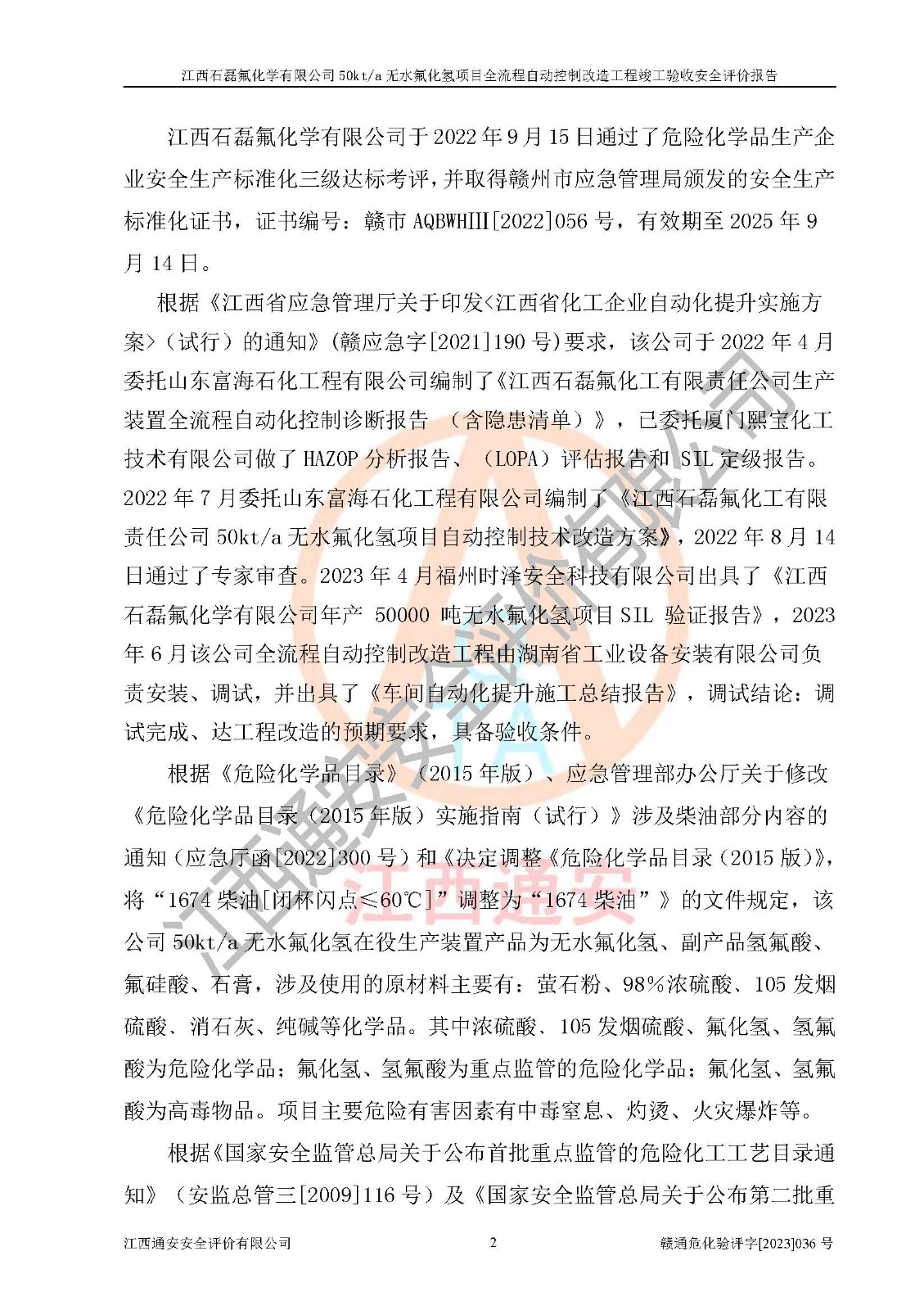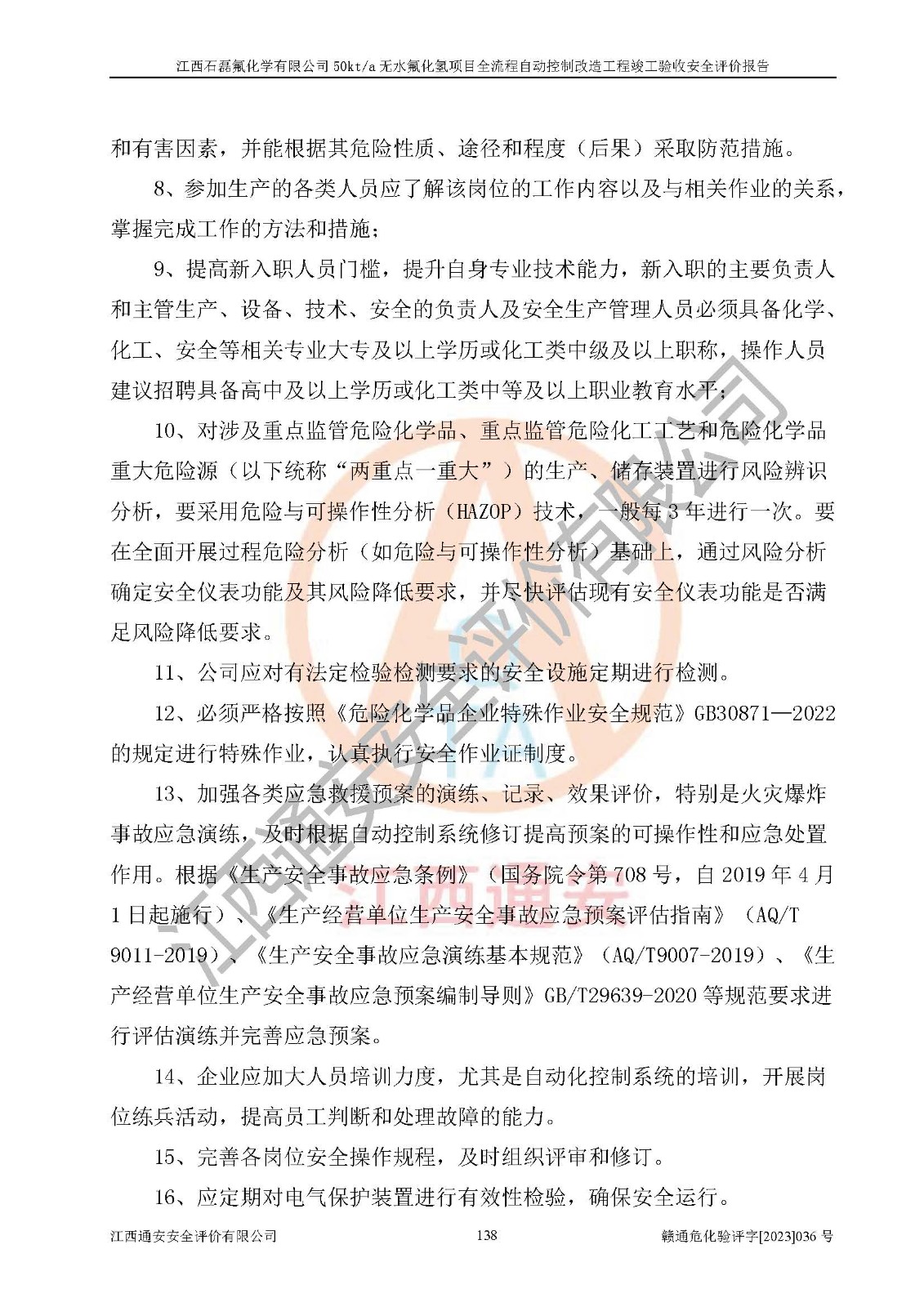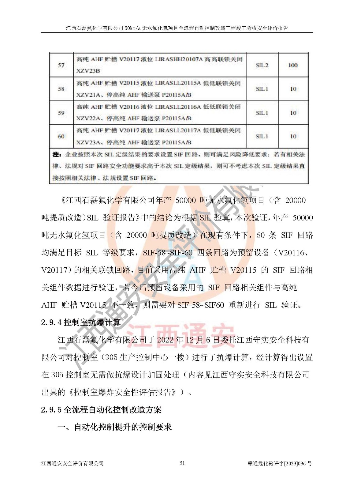 根據(jù)江西石磊氟化學(xué)有限公司提供的技術(shù)資料,通過(guò)現(xiàn)場(chǎng)檢查以及對(duì)主要危險(xiǎn)有害因素分析,以及采用定性、定量評(píng)價(jià)法進(jìn)行評(píng)價(jià)和分析,依據(jù)**相關(guān)法規(guī)標(biāo)準(zhǔn),得出評(píng)價(jià)結(jié)論。 1、該工程涉及的危險(xiǎn)化學(xué)品有:氟化氫、氫氟酸、硫酸、發(fā)煙硫酸、氟硅酸、煤氣、柴油(柴油發(fā)電機(jī)用)。 2、該工程中存在的主要危險(xiǎn)有:火災(zāi)、爆炸、中毒窒息、灼燙、觸電、機(jī)械傷害、高處墜落、起重傷害、凍傷、淹溺等。其中火災(zāi)爆炸、中毒和窒息是*主要的危險(xiǎn)因素。 3、該工程涉及的各種化學(xué)品中,硫酸屬于第三類易制毒危險(xiǎn)化學(xué)品,不涉及易制爆化學(xué)品。 4、本項(xiàng)目所涉及的原輔材料及產(chǎn)品、中間產(chǎn)品、副產(chǎn)品中,氟化氫、氫氟酸、CO(存在于發(fā)生爐煤氣中)屬于重點(diǎn)監(jiān)管的危險(xiǎn)化學(xué)品。不涉及特別管控危險(xiǎn)化學(xué)品。 5、該工程項(xiàng)目涉及的氟化氫、CO(存在于發(fā)生爐煤氣中)屬于高毒物品。 6、本項(xiàng)目煤焦油的危險(xiǎn)性類別包括致癌性,類別1A,根據(jù)《職業(yè)性接觸毒物危害程度分級(jí)》(GBZ 230-2010)的規(guī)定:屬于明確人類致癌物的,直接列為極度危害。因此本項(xiàng)目煤焦油為極度危害介質(zhì)。 7、該公司201AHF儲(chǔ)罐區(qū)儲(chǔ)存單元構(gòu)成**危險(xiǎn)化學(xué)品重大危險(xiǎn)源,202有水酸生產(chǎn)裝置區(qū)生產(chǎn)單元構(gòu)成四級(jí)危險(xiǎn)化學(xué)品重大危險(xiǎn)源 8、根據(jù)《**安全監(jiān)管總局關(guān)于公布首批重點(diǎn)監(jiān)管的危險(xiǎn)化工工藝目錄的通知》(安監(jiān)總管三〔2009〕116號(hào))和《**安全監(jiān)管總局關(guān)于公布第二批重點(diǎn)監(jiān)管危險(xiǎn)化工工藝目錄和調(diào)整首批重點(diǎn)監(jiān)管危險(xiǎn)化工工藝中部分典型工藝的通知》(安監(jiān)總管三〔2013〕3號(hào))進(jìn)行危險(xiǎn)工藝辨識(shí):該工程無(wú)水氟化氫(AHF)生產(chǎn)裝置生產(chǎn)過(guò)程涉及的氟化工藝為重點(diǎn)監(jiān)管的危險(xiǎn)化工工藝。 9、江西石磊氟化學(xué)有限公司50kt/a無(wú)水氟化氫項(xiàng)目自動(dòng)控制技術(shù)改造工程的設(shè)計(jì)、安裝施工和調(diào)試單位的資質(zhì)均符合要求。 10、江西石磊氟化學(xué)有限公司50kt/a無(wú)水氟化氫項(xiàng)目全流程自動(dòng)控制改造設(shè)計(jì)方案中提出的控制措施已得到落實(shí),企業(yè)控制系統(tǒng)設(shè)置情況與設(shè)計(jì)方案一致,設(shè)計(jì)、施工和調(diào)試單位由有**相應(yīng)資質(zhì)的自控系統(tǒng)施工單位進(jìn)行施工,并對(duì)自動(dòng)控制系統(tǒng)調(diào)試合格,出具了竣工圖,安全設(shè)施及安全管理符合**及有關(guān)部門(mén)關(guān)于安全生產(chǎn)法律、法規(guī)、標(biāo)準(zhǔn)的要求,安全風(fēng)險(xiǎn)程度是可以接受的,安全風(fēng)險(xiǎn)可控,滿足《江西省應(yīng)急管理廳關(guān)于印發(fā)<江西省化工企業(yè)自動(dòng)化提升實(shí)施方案>(試行)的通知》(贛應(yīng)急字[2021]190號(hào))的要求,具備全流程自動(dòng)控制改造工程竣工驗(yàn)收條件。 |