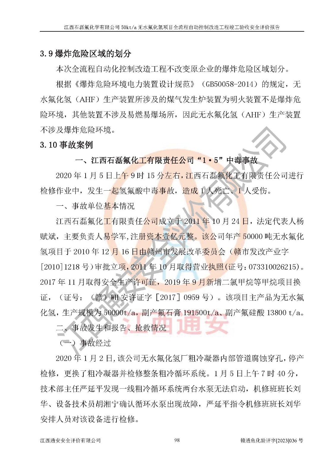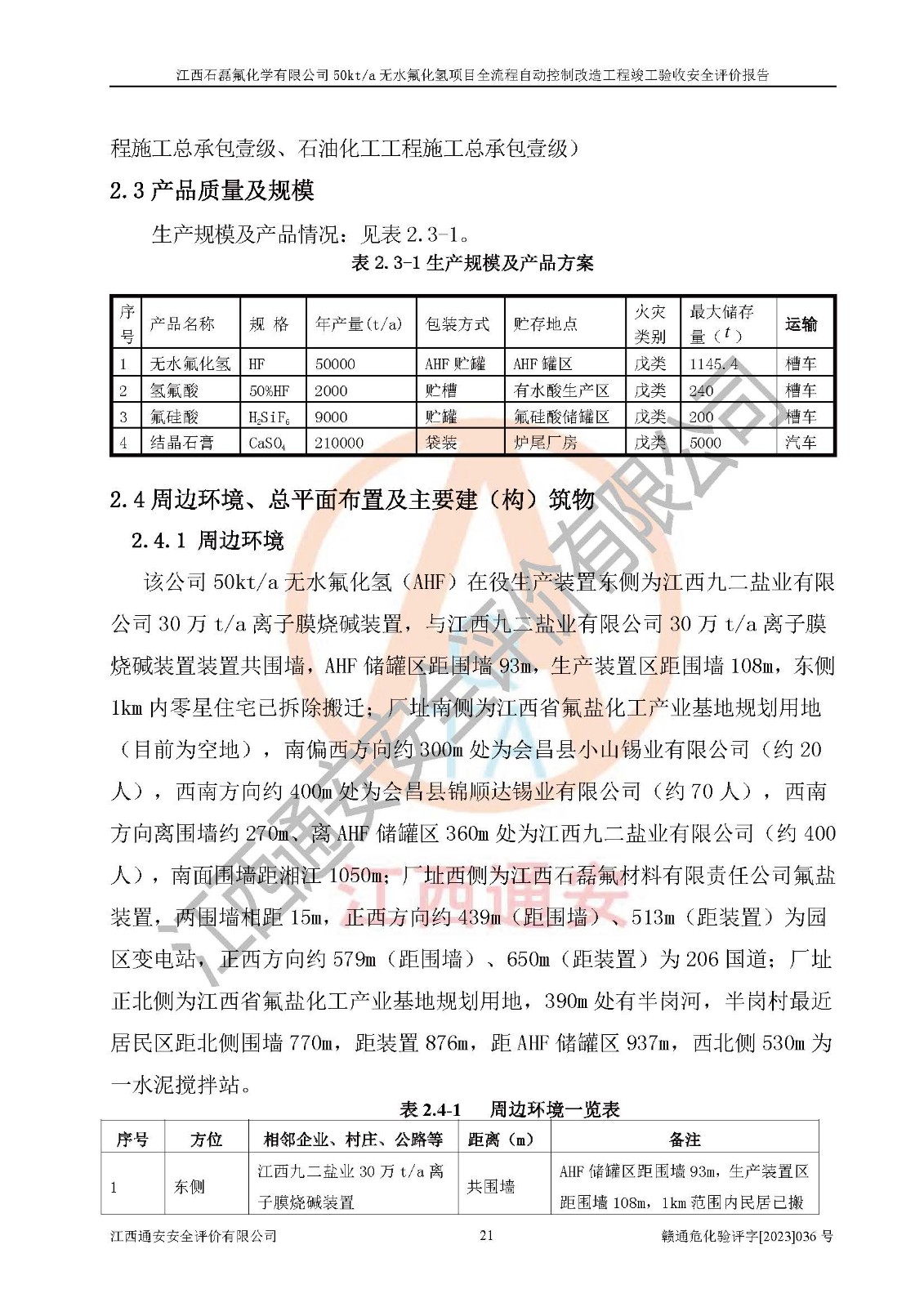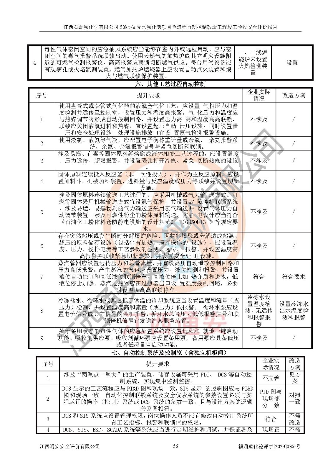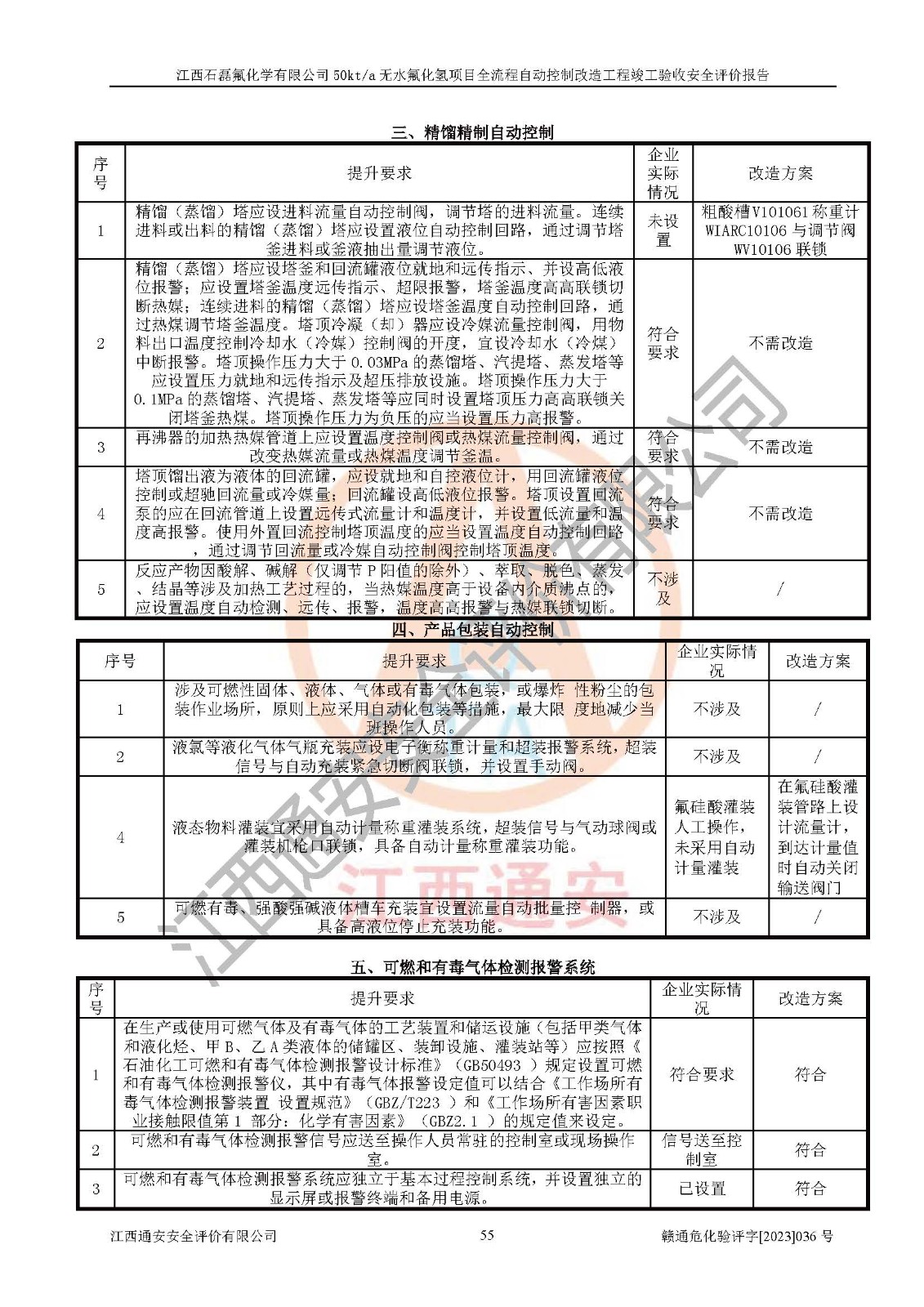 根據(jù)江西石磊氟化學(xué)有限公司提供的技術(shù)資料,通過(guò)現(xiàn)場(chǎng)檢查以及對(duì)主要危險(xiǎn)有害因素分析,以及采用定性、定量評(píng)價(jià)法進(jìn)行評(píng)價(jià)和分析,依據(jù)**相關(guān)法規(guī)標(biāo)準(zhǔn),得出評(píng)價(jià)結(jié)論。 1、該工程涉及的危險(xiǎn)化學(xué)品有:氟化氫、氫氟酸、硫酸、發(fā)煙硫酸、氟硅酸、煤氣、柴油(柴油發(fā)電機(jī)用)。 2、該工程中存在的主要危險(xiǎn)有:火災(zāi)、爆炸、中毒窒息、灼燙、觸電、機(jī)械傷害、高處墜落、起重傷害、凍傷、淹溺等。其中火災(zāi)爆炸、中毒和窒息是*主要的危險(xiǎn)因素。 3、該工程涉及的各種化學(xué)品中,硫酸屬于第三類易制毒危險(xiǎn)化學(xué)品,不涉及易制爆化學(xué)品。 4、本項(xiàng)目所涉及的原輔材料及產(chǎn)品、中間產(chǎn)品、副產(chǎn)品中,氟化氫、氫氟酸、CO(存在于發(fā)生爐煤氣中)屬于重點(diǎn)監(jiān)管的危險(xiǎn)化學(xué)品。不涉及特別管控危險(xiǎn)化學(xué)品。 5、該工程項(xiàng)目涉及的氟化氫、CO(存在于發(fā)生爐煤氣中)屬于高毒物品。 6、本項(xiàng)目煤焦油的危險(xiǎn)性類別包括致癌性,類別1A,根據(jù)《職業(yè)性接觸毒物危害程度分級(jí)》(GBZ 230-2010)的規(guī)定:屬于明確人類致癌物的,直接列為極度危害。因此本項(xiàng)目煤焦油為極度危害介質(zhì)。 7、該公司201AHF儲(chǔ)罐區(qū)儲(chǔ)存單元構(gòu)成**危險(xiǎn)化學(xué)品重大危險(xiǎn)源,202有水酸生產(chǎn)裝置區(qū)生產(chǎn)單元構(gòu)成四級(jí)危險(xiǎn)化學(xué)品重大危險(xiǎn)源 8、根據(jù)《**安全監(jiān)管總局關(guān)于公布首批重點(diǎn)監(jiān)管的危險(xiǎn)化工工藝目錄的通知》(安監(jiān)總管三〔2009〕116號(hào))和《**安全監(jiān)管總局關(guān)于公布第二批重點(diǎn)監(jiān)管危險(xiǎn)化工工藝目錄和調(diào)整首批重點(diǎn)監(jiān)管危險(xiǎn)化工工藝中部分典型工藝的通知》(安監(jiān)總管三〔2013〕3號(hào))進(jìn)行危險(xiǎn)工藝辨識(shí):該工程無(wú)水氟化氫(AHF)生產(chǎn)裝置生產(chǎn)過(guò)程涉及的氟化工藝為重點(diǎn)監(jiān)管的危險(xiǎn)化工工藝。 9、江西石磊氟化學(xué)有限公司50kt/a無(wú)水氟化氫項(xiàng)目自動(dòng)控制技術(shù)改造工程的設(shè)計(jì)、安裝施工和調(diào)試單位的資質(zhì)均符合要求。 10、江西石磊氟化學(xué)有限公司50kt/a無(wú)水氟化氫項(xiàng)目全流程自動(dòng)控制改造設(shè)計(jì)方案中提出的控制措施已得到落實(shí),企業(yè)控制系統(tǒng)設(shè)置情況與設(shè)計(jì)方案一致,設(shè)計(jì)、施工和調(diào)試單位由有**相應(yīng)資質(zhì)的自控系統(tǒng)施工單位進(jìn)行施工,并對(duì)自動(dòng)控制系統(tǒng)調(diào)試合格,出具了竣工圖,安全設(shè)施及安全管理符合**及有關(guān)部門(mén)關(guān)于安全生產(chǎn)法律、法規(guī)、標(biāo)準(zhǔn)的要求,安全風(fēng)險(xiǎn)程度是可以接受的,安全風(fēng)險(xiǎn)可控,滿足《江西省應(yīng)急管理廳關(guān)于印發(fā)<江西省化工企業(yè)自動(dòng)化提升實(shí)施方案>(試行)的通知》(贛應(yīng)急字[2021]190號(hào))的要求,具備全流程自動(dòng)控制改造工程竣工驗(yàn)收條件。 |