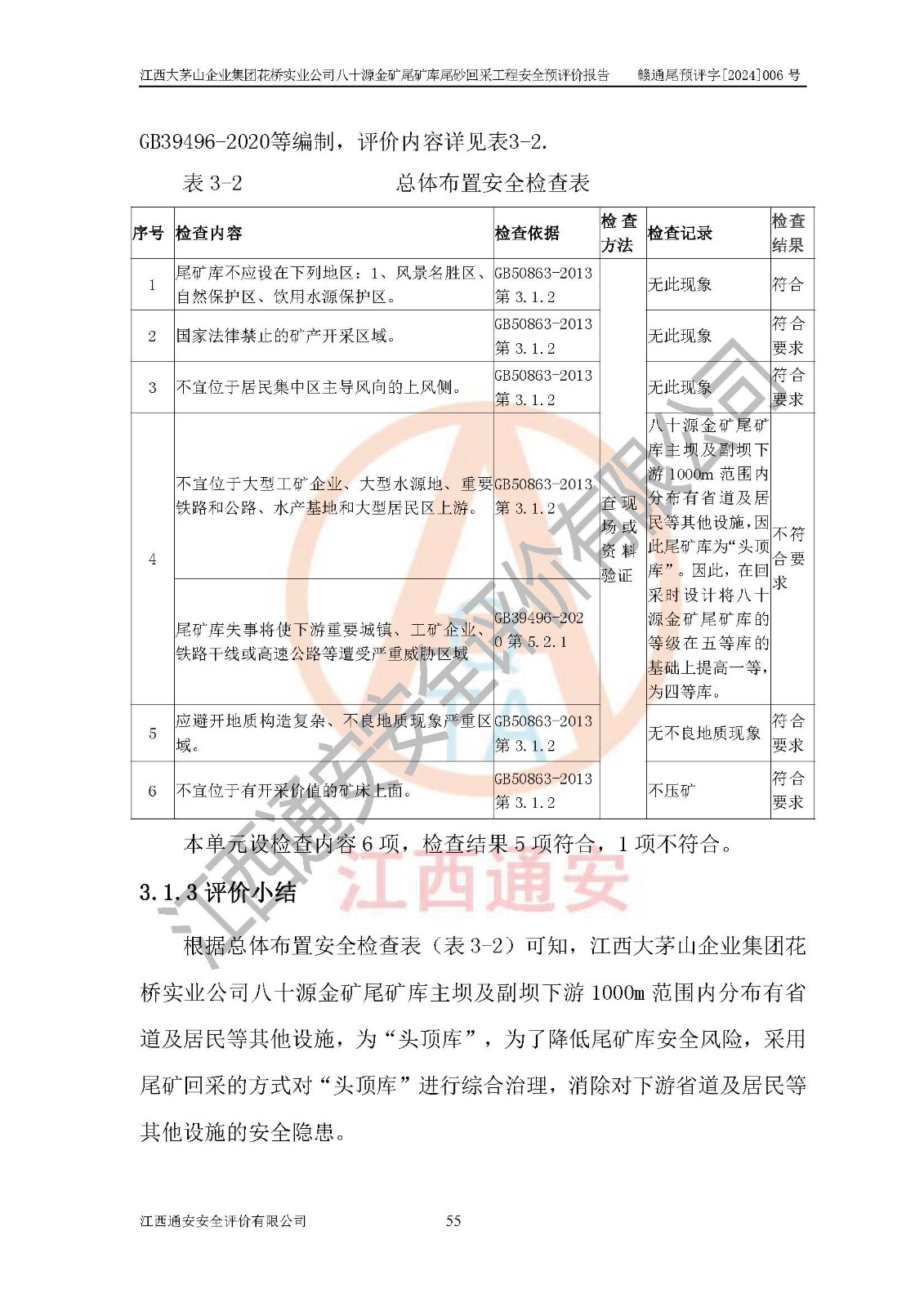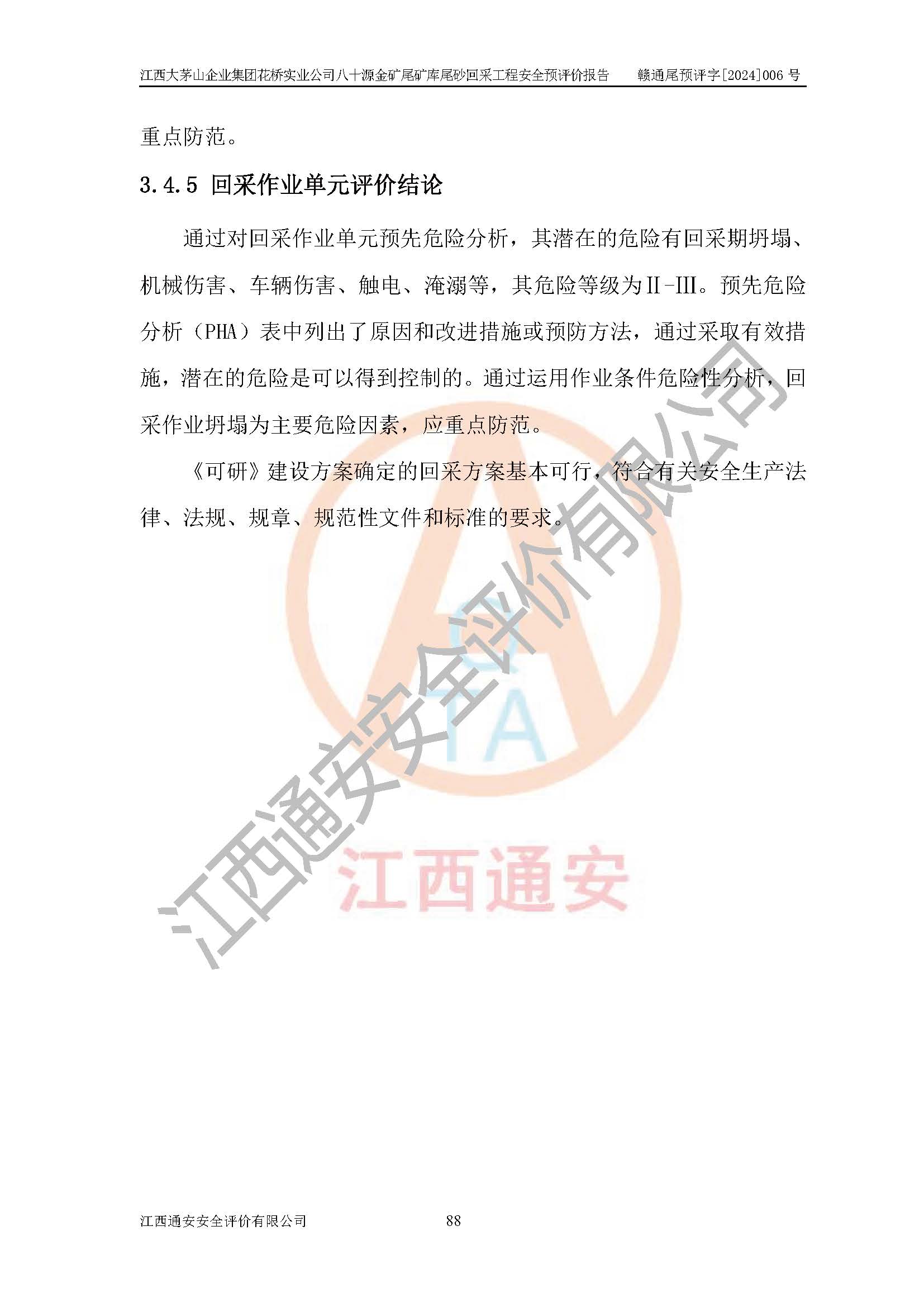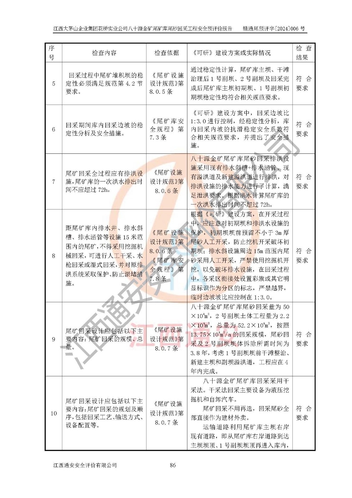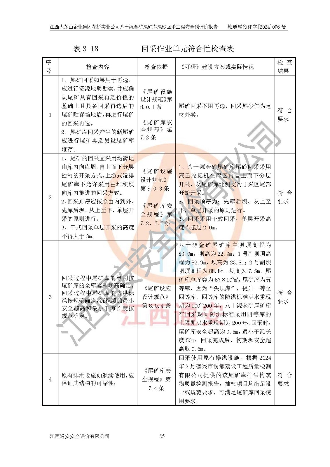 評價結(jié)論 | 建設(shè)單位依據(jù)《可研》建設(shè)方案,結(jié)合本報告提出的安全措施建議,進行江西大茅山企業(yè)集團花橋?qū)崢I(yè)公司八十源金礦尾礦庫尾砂回采工程后續(xù)設(shè)計、施工、生產(chǎn)、管理,則尾礦庫尾砂回采項目危險、有害因素的風險程度可以控制在可承受的范圍之內(nèi),八十源金礦尾礦庫尾砂回采工程安全條件可滿足安全生產(chǎn)需要。 | |||