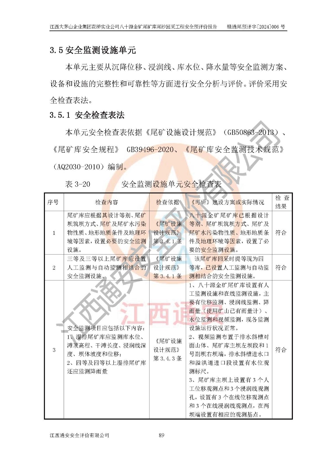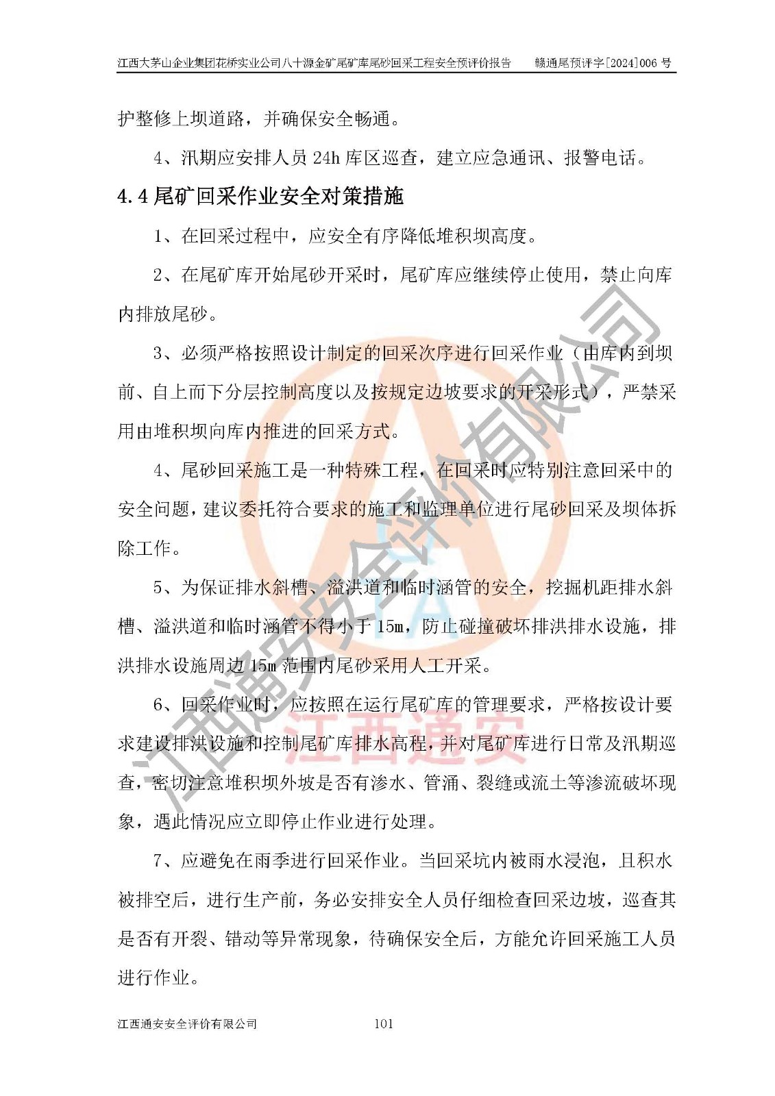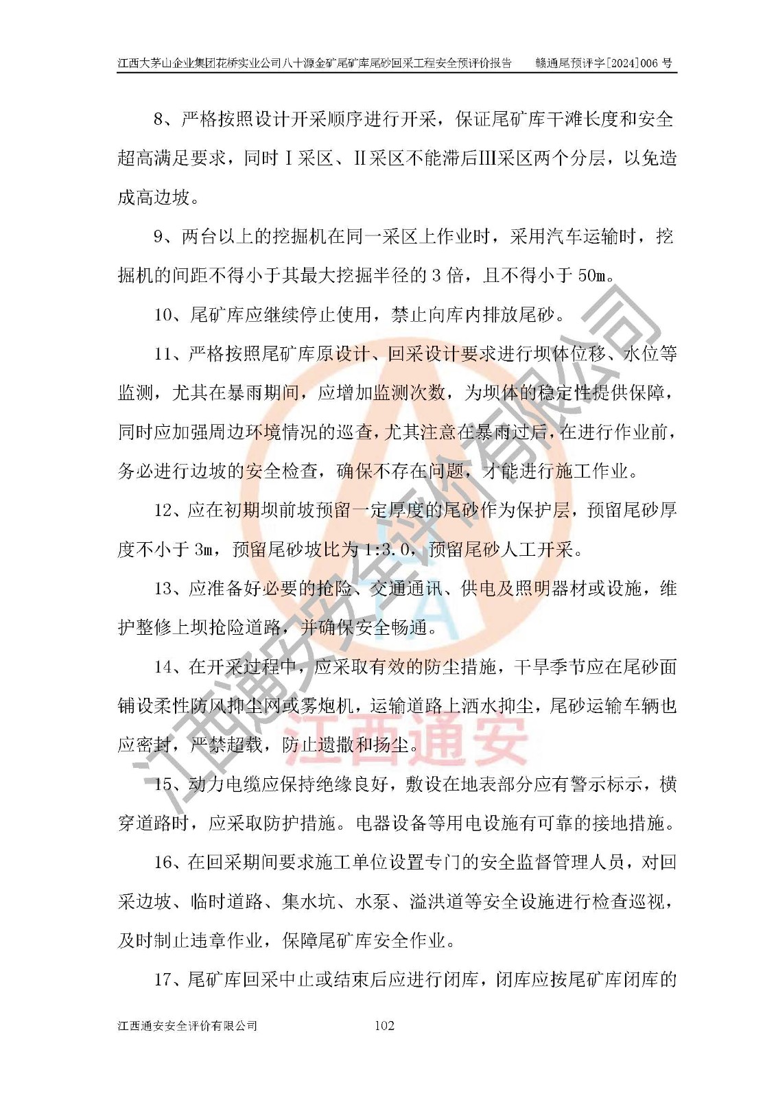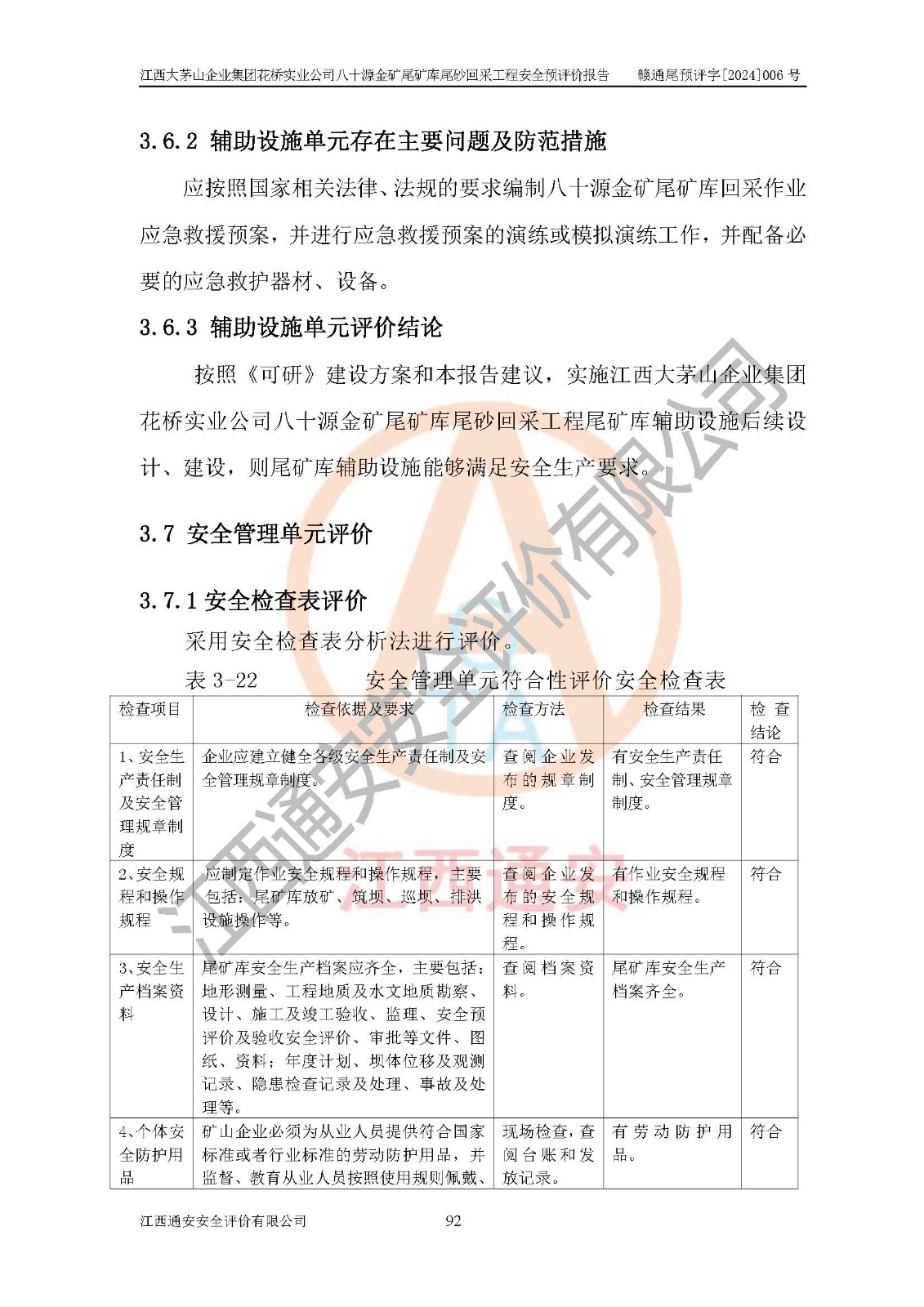 評價結(jié)論 | 建設(shè)單位依據(jù)《可研》建設(shè)方案,結(jié)合本報告提出的安全措施建議,進行江西大茅山企業(yè)集團花橋?qū)崢I(yè)公司八十源金礦尾礦庫尾砂回采工程后續(xù)設(shè)計、施工、生產(chǎn)、管理,則尾礦庫尾砂回采項目危險、有害因素的風險程度可以控制在可承受的范圍之內(nèi),八十源金礦尾礦庫尾砂回采工程安全條件可滿足安全生產(chǎn)需要。 | |||