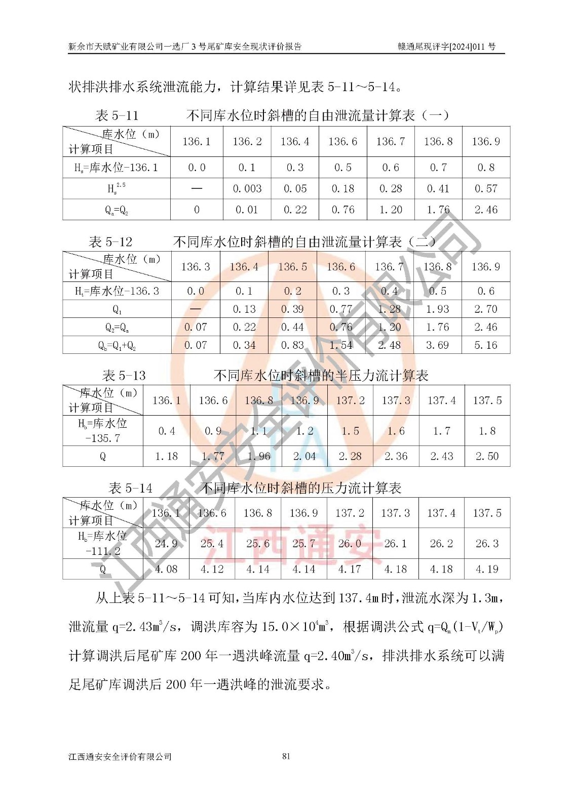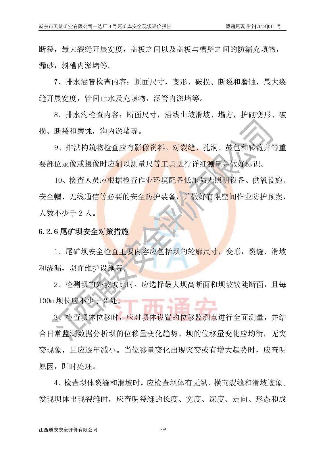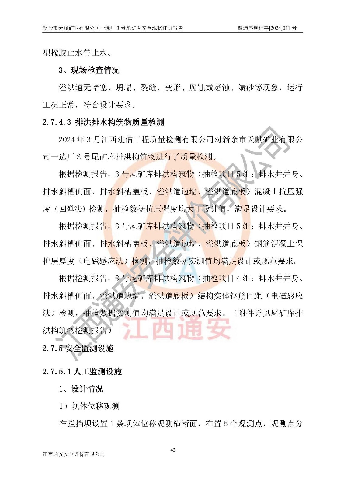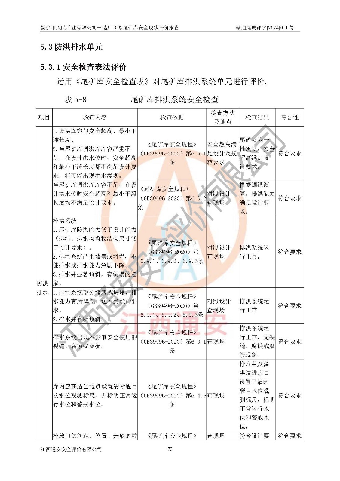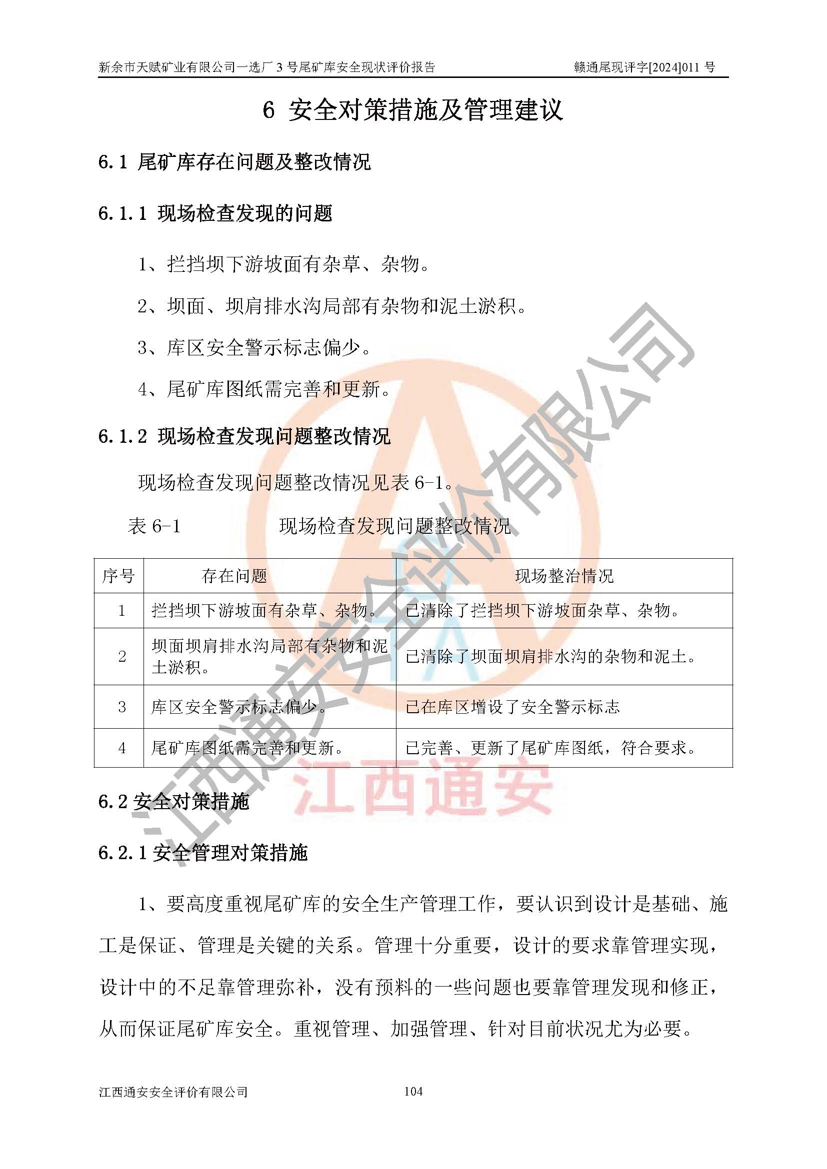 勘察現(xiàn)場發(fā)現(xiàn)的問題及安全對(duì)策措施 | 存在的問題:1、攔擋壩下游坡面有雜草、雜物。2、壩面、壩肩排水溝局部有雜物和泥土淤積。3、庫區(qū)警示標(biāo)志偏少。4、尾礦庫圖紙需完善和更新。 整改措施:1、清除攔擋壩下游坡面雜草、雜物。2、清理壩面、壩肩排水溝的雜物和泥土。3、增設(shè)庫區(qū)警示標(biāo)志。4、尾礦庫圖紙需完善和更新。 | |||