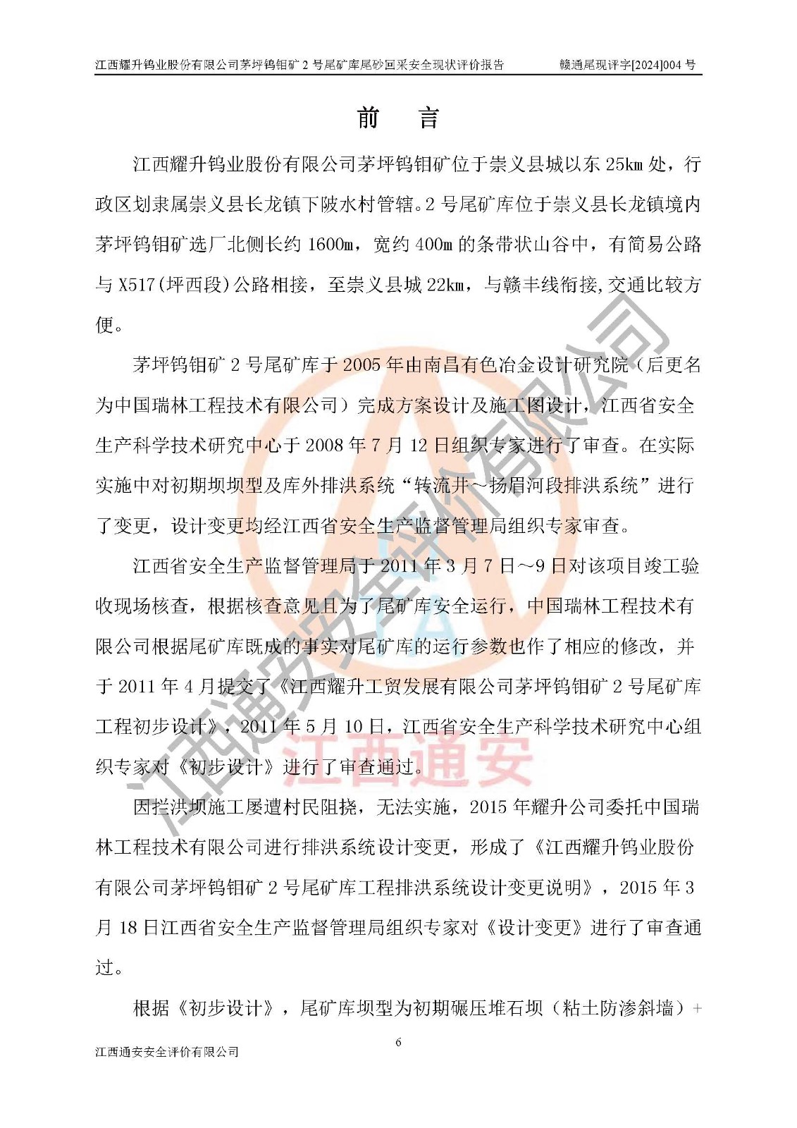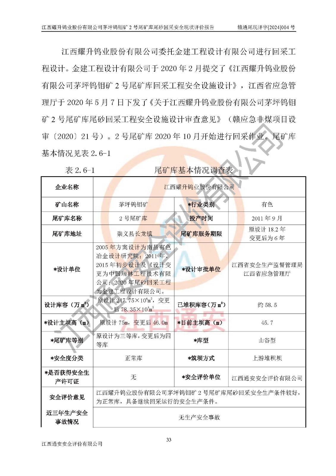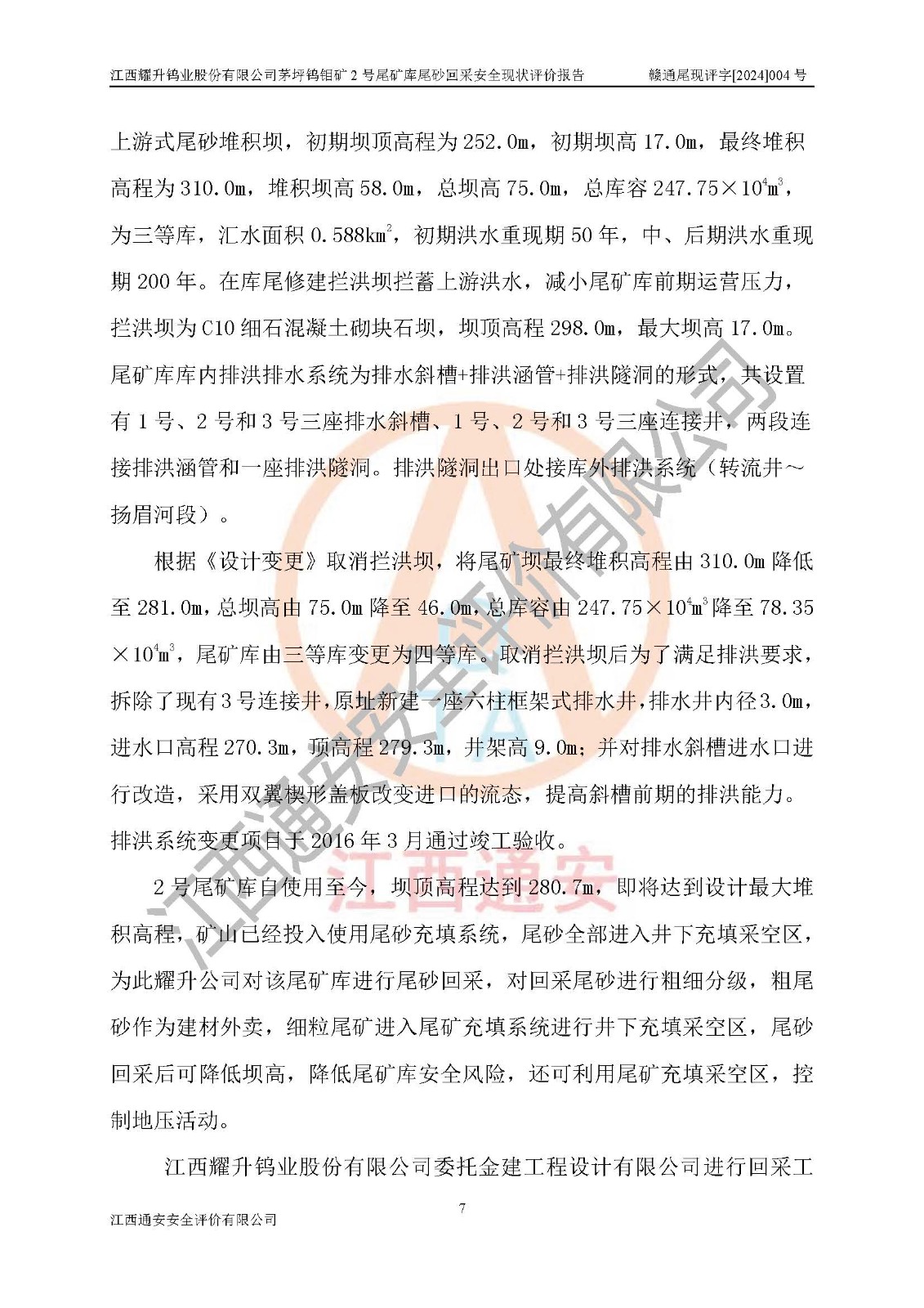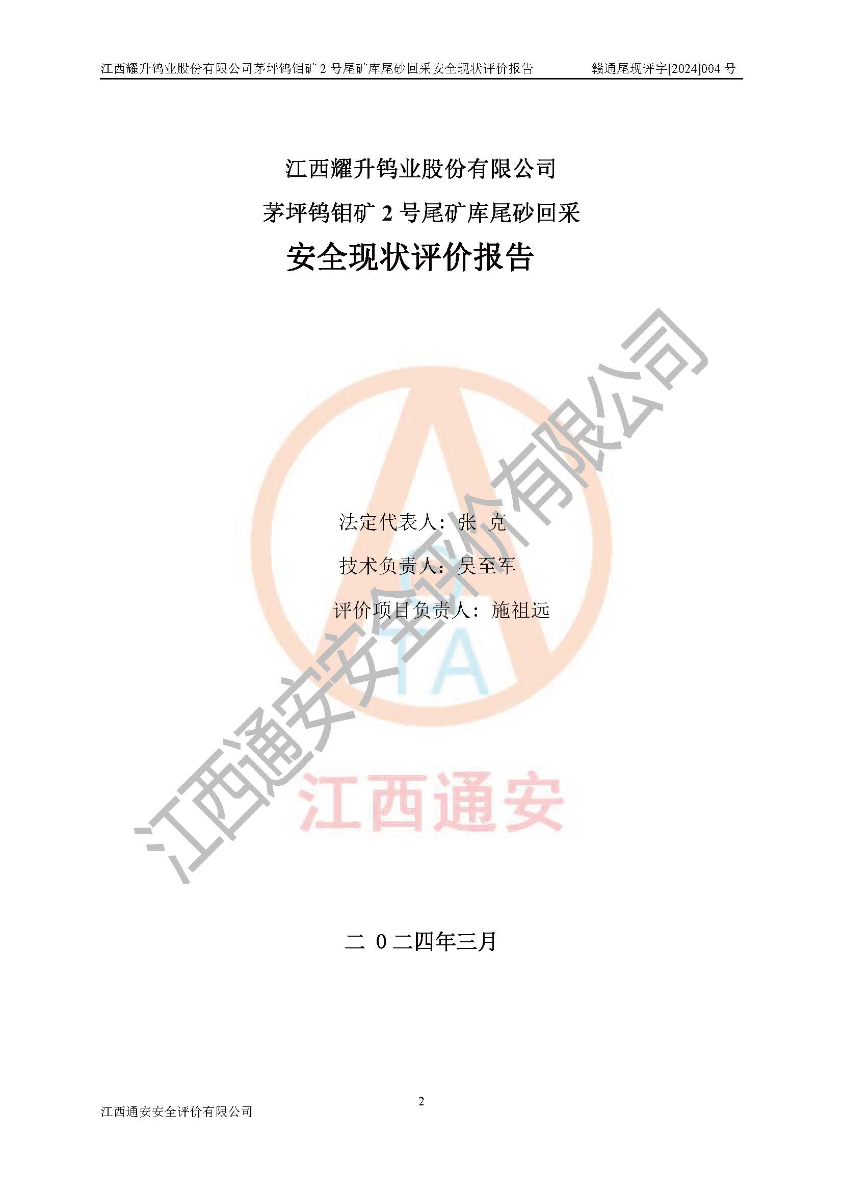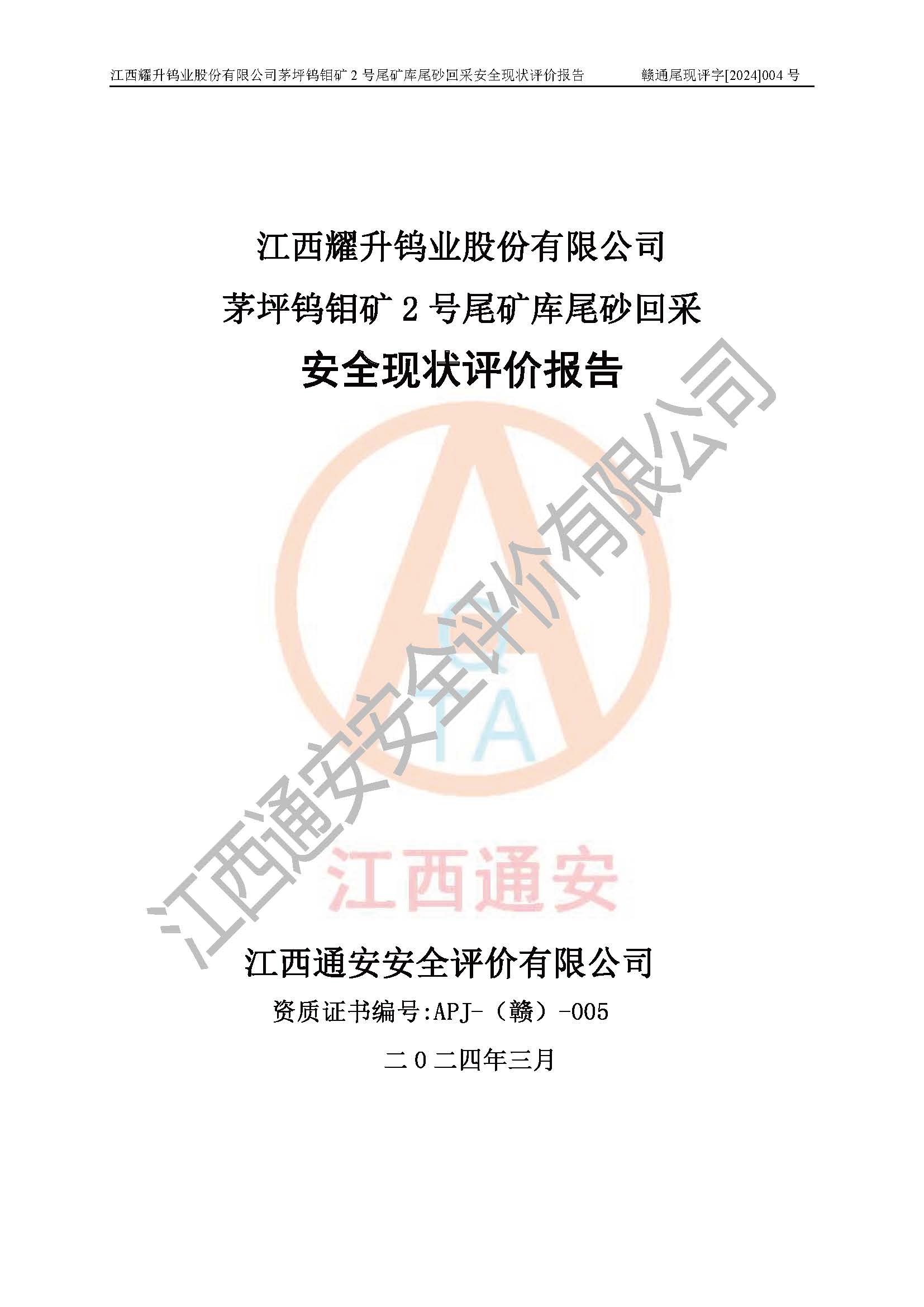 評價報告名稱 | 江西耀升鎢業(yè)股份有限公司茅坪鎢鉬礦2號尾礦庫尾砂回采安全現(xiàn)狀評價報告 | |||